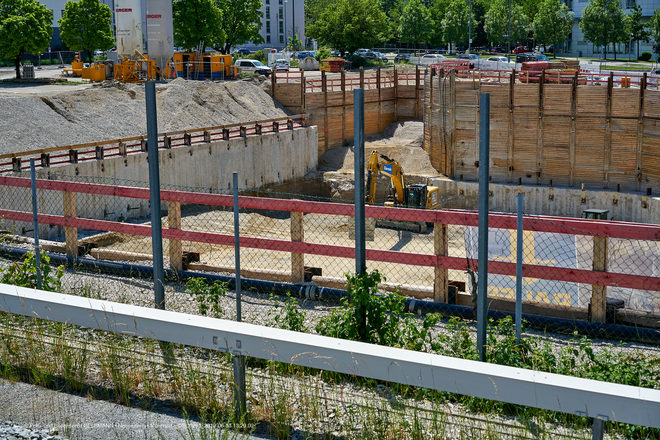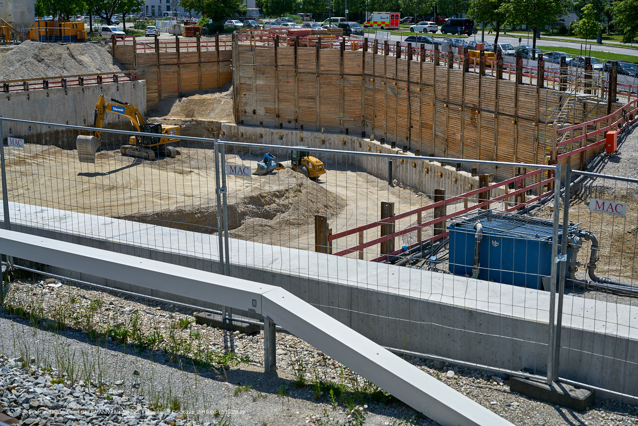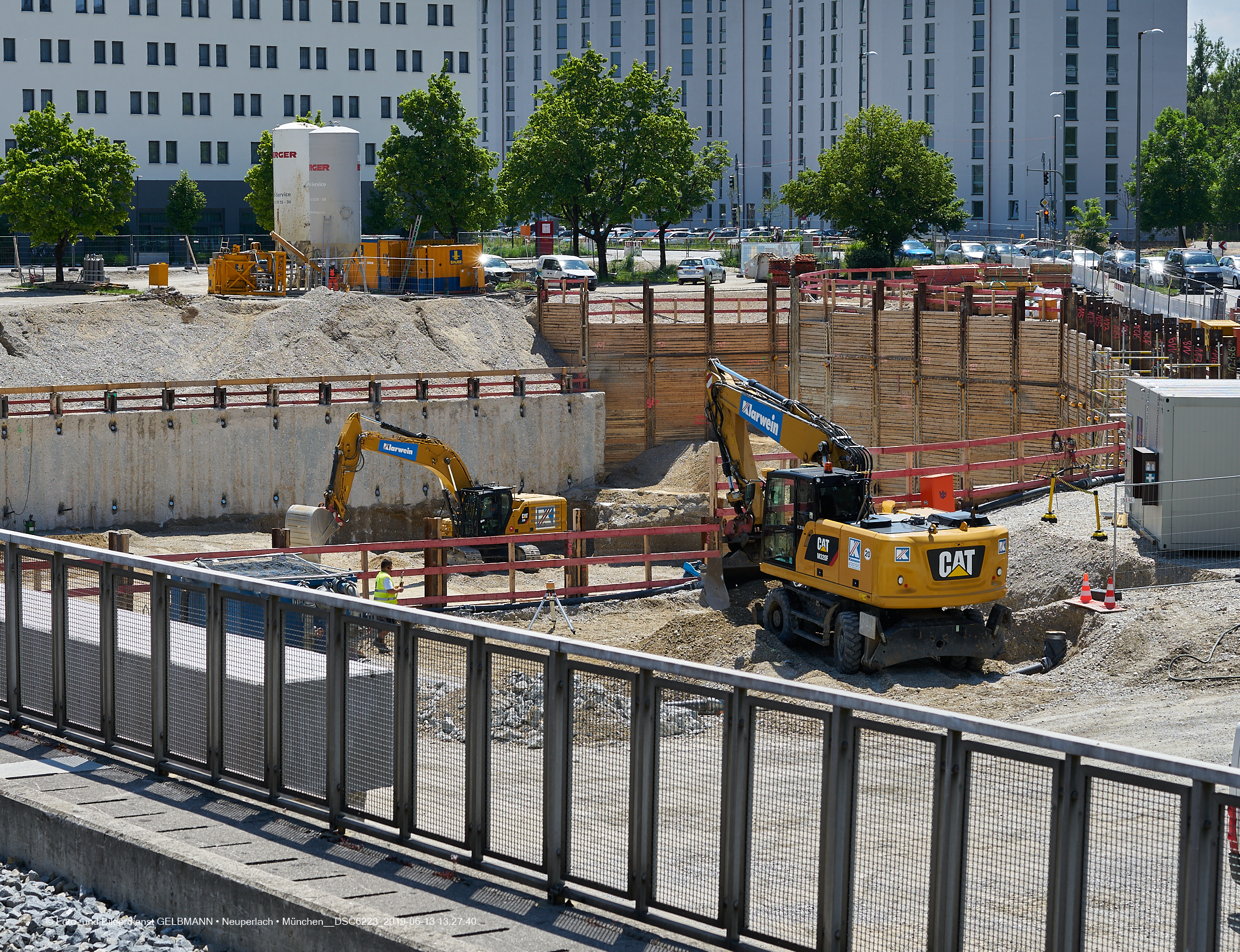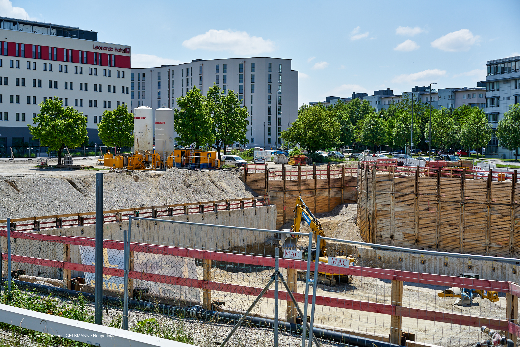 Boardinghouse in Neuperlach Süd: „Zuhause auf Zeit“ Auf dem ehemaligen P&R-Parkplatz an der Carl-Wery-Straße, im Hintergrund ist die Wohnanlage Cal-Wery-Straße zu sehen, direkt an der U- und S-Bahnstation Neuperlach Süd, entsteht ein 17-geschossiges, WOW, echtes(!) Hochhaus, das Boardinghouse. Die aktuelle Historie dieser Baustelle, seit Baubeginn im November 2018, ist hier zu sehen. Besonders eindrucksvoll sind sie Spundwände zur S-Bahn-Gleisanlage. Beindruckende Fotos von der Baugrube habe ich vom S-Bahnsteig Neuperlach- Süd geschossen. Allerdings ist dazu ein Fahrschein oder Bahnsteigkarte der MGV zwingend notwendig. Vielleicht war es ein Zufall oder man hat es auf Siemensmitarbeiter abgesehen, zweimal schon wurde ich beim Verlassen des Bahnsteges kontrolliert. Eine Strafzahlung von 60.- wären mir, trotz aller Liebe zu dieser Baustelle, zu hoch.