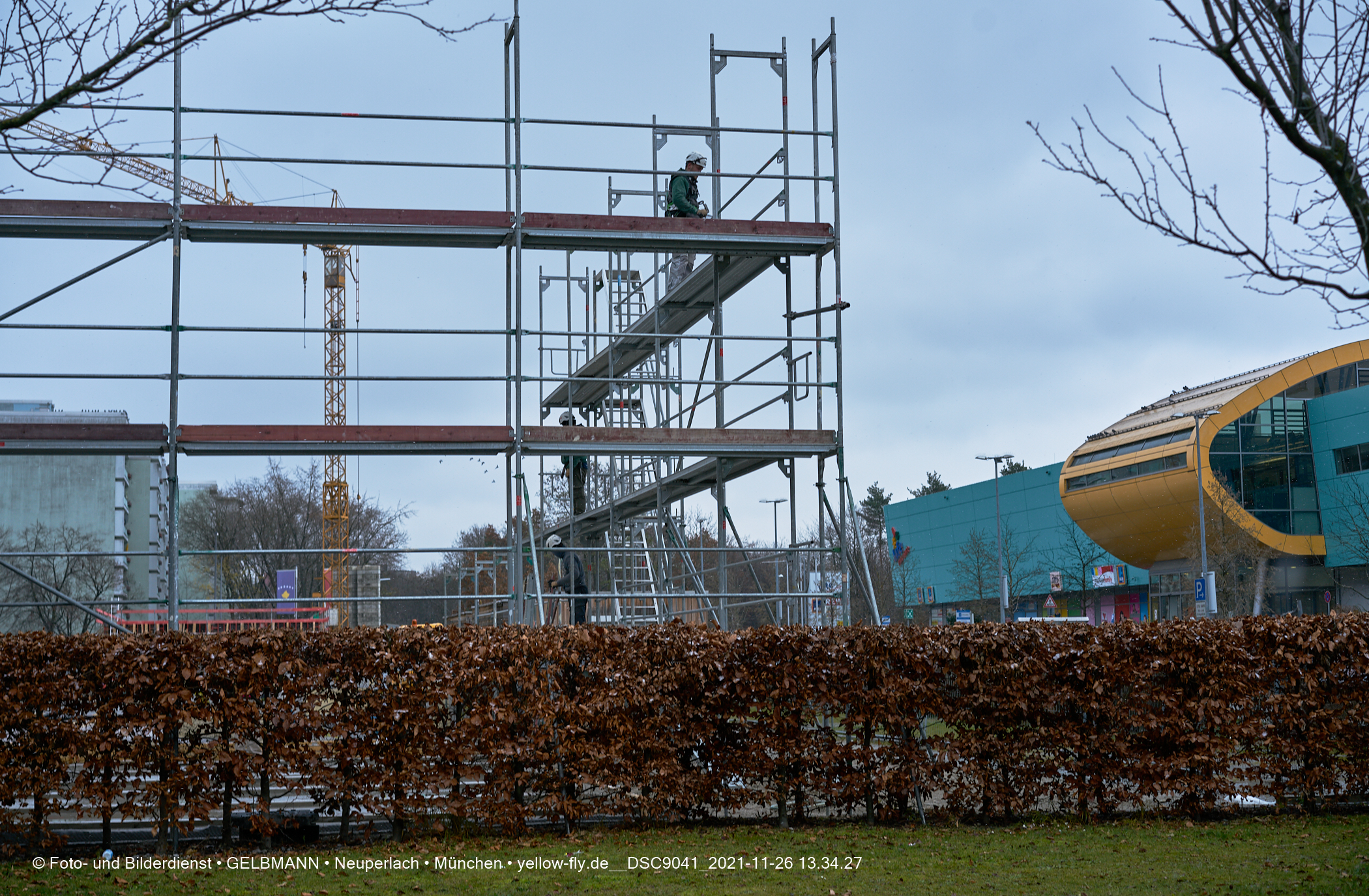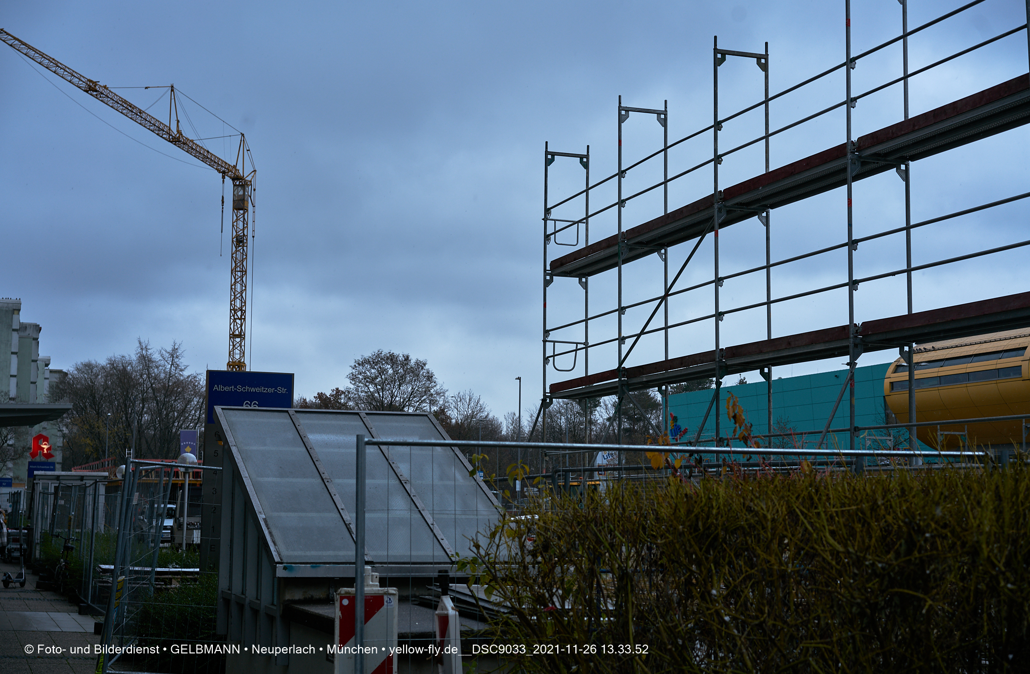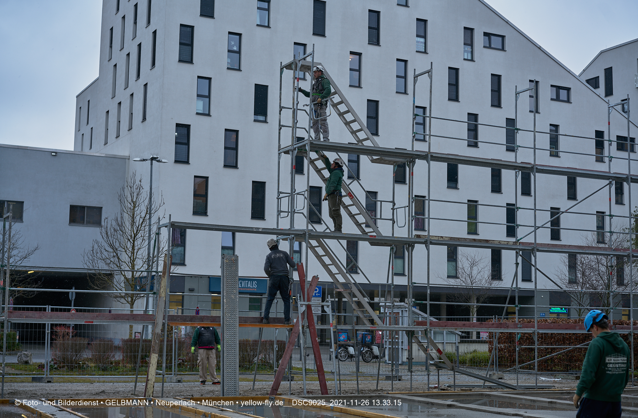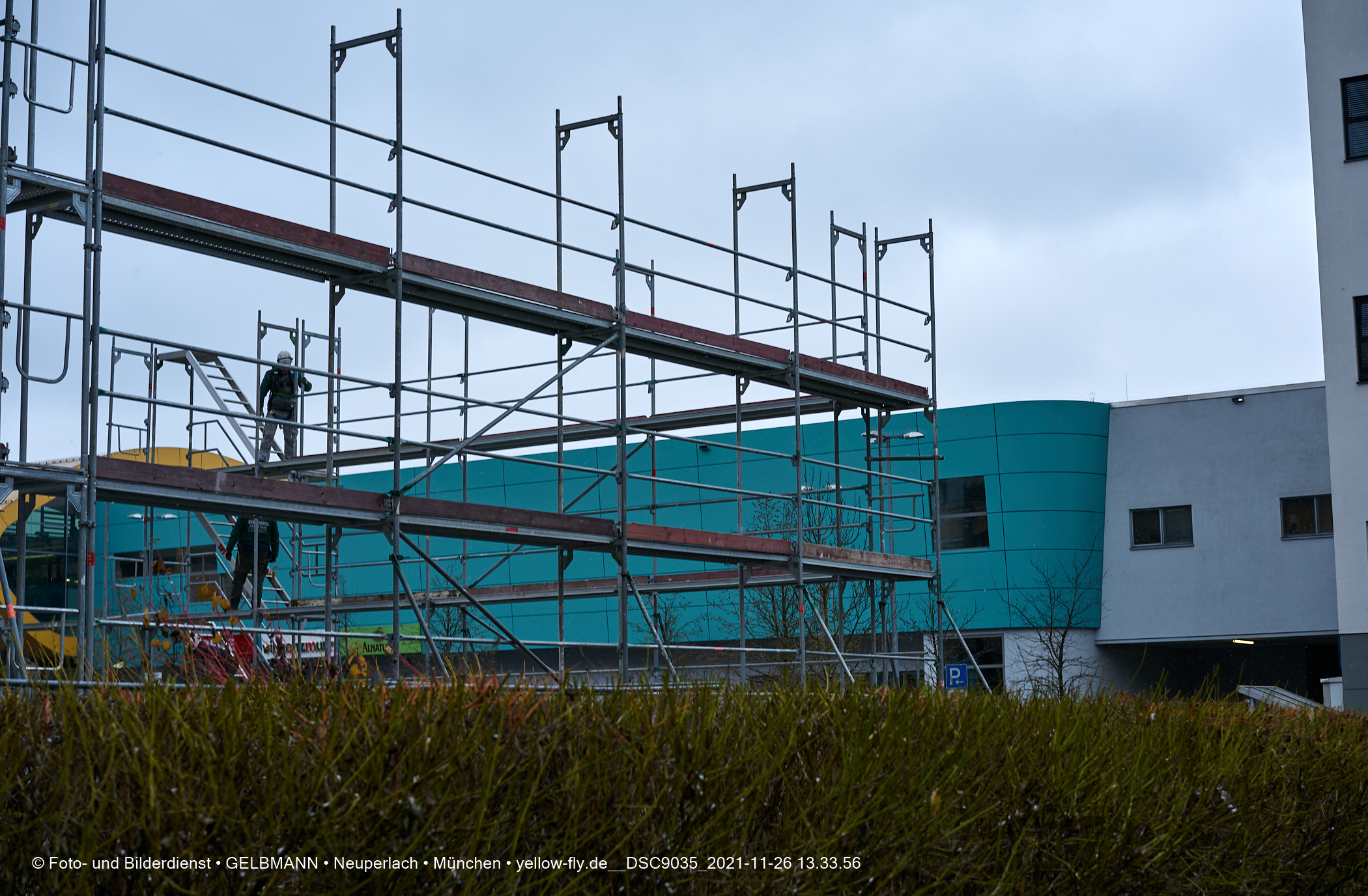Ein großes Gerüst wird um die Baustelle zur Montessori Schule in Neuperlach aufgebaut. Auf der Seite zu Straße hin, sind schon die ersten Gebäudeteile zu erkennen. Am westlichen Ende wird gerade einhohes Gerüst aufgestellt.