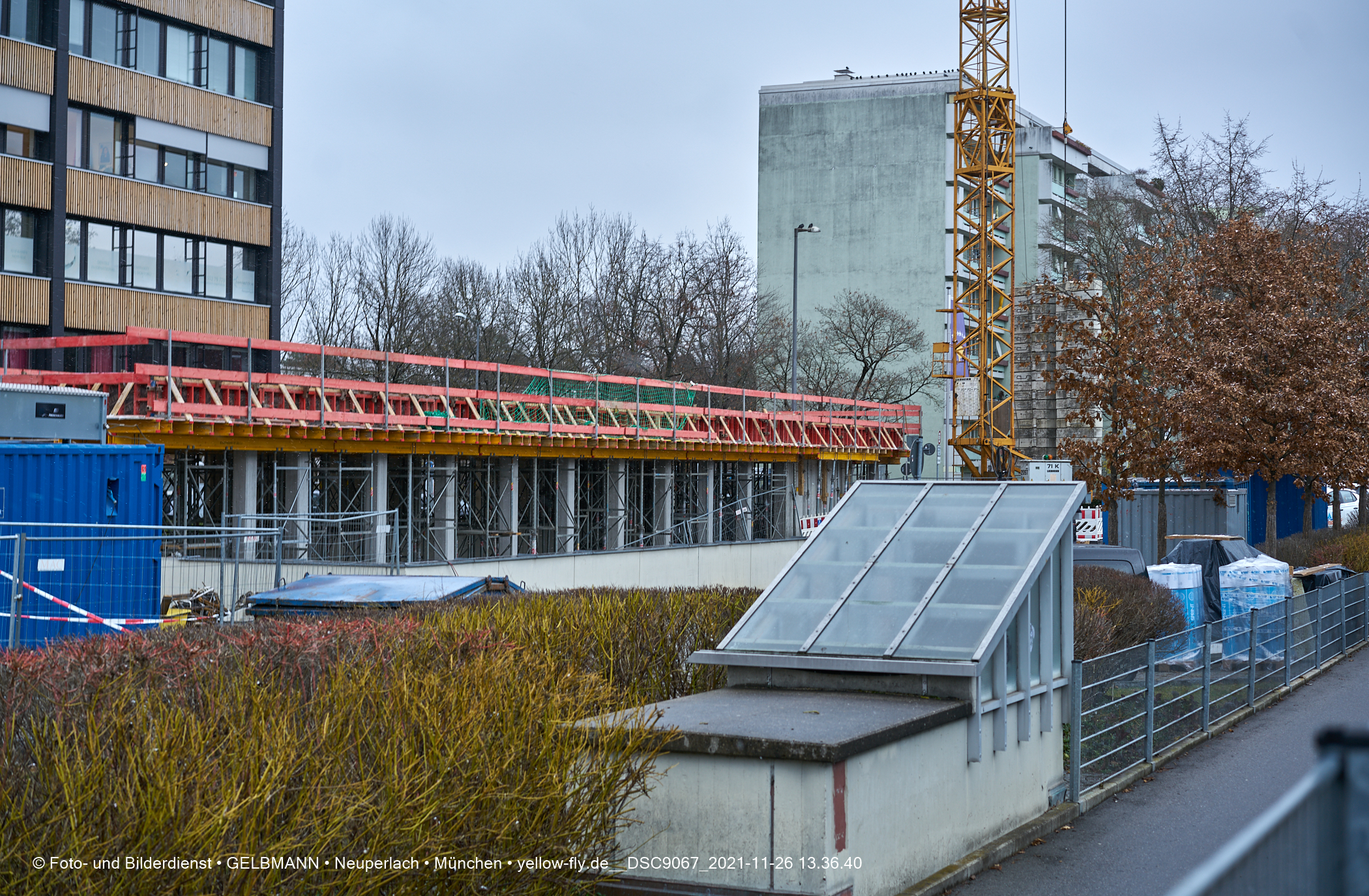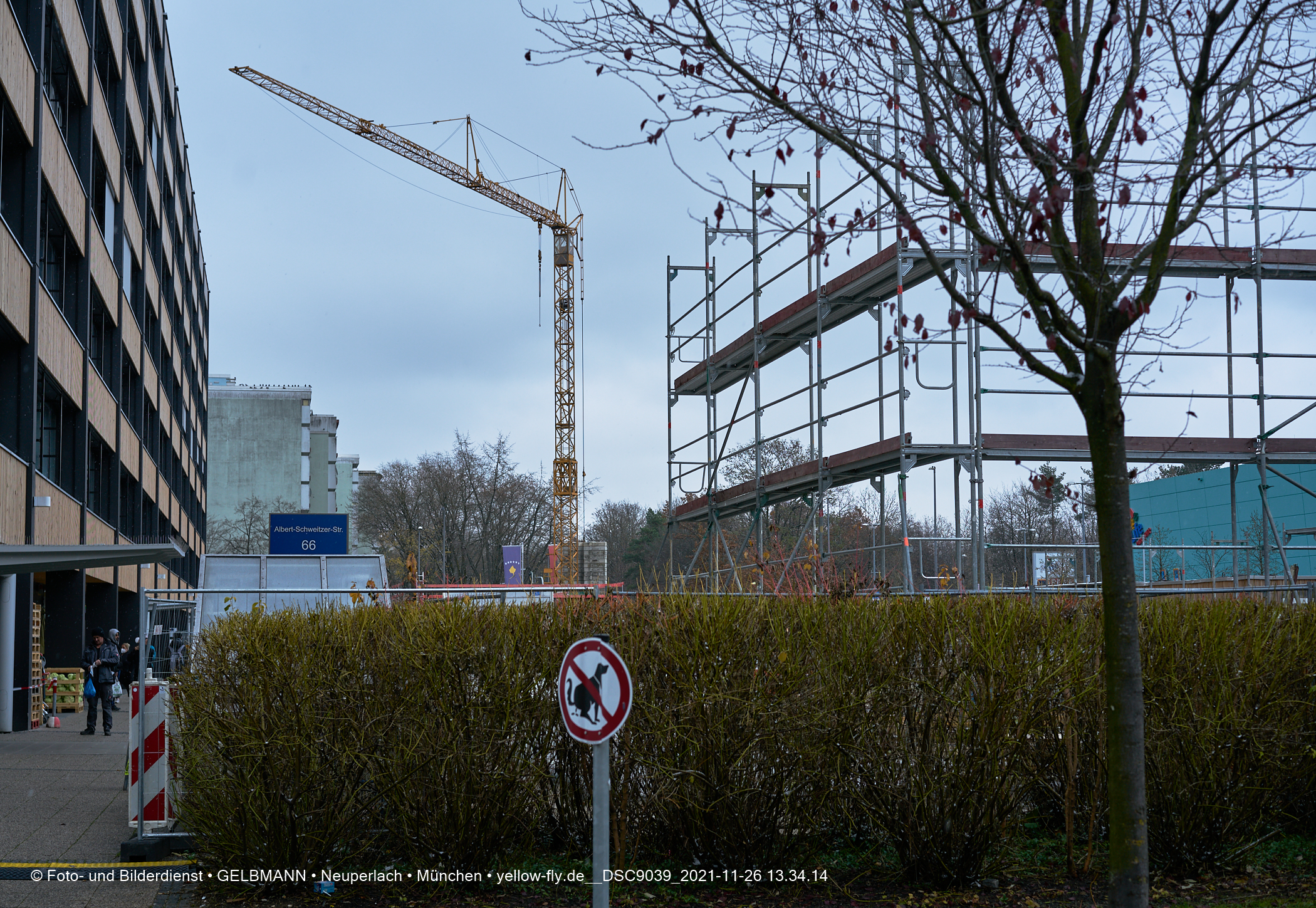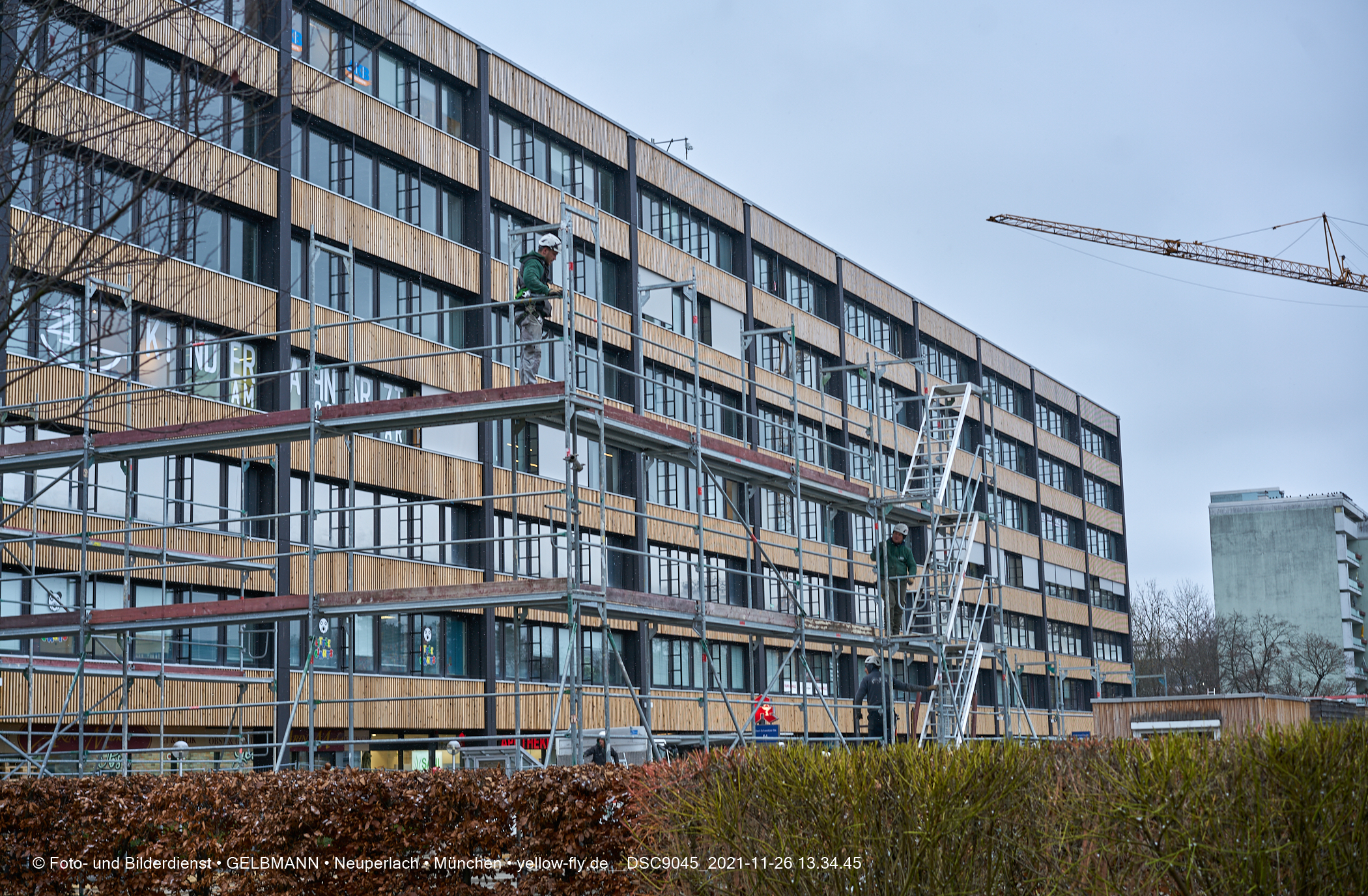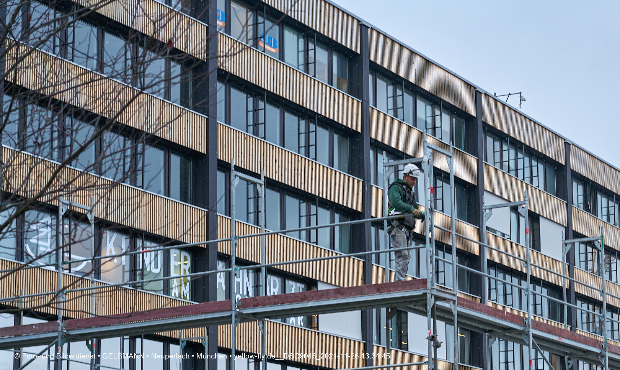 Ein großes Gerüst wird um die Baustelle zur Montessori Schule in Neuperlach aufgebaut. Auf der Seite zu Straße hin, sind schon die ersten Gebäudeteile zu erkennen. Am westlichen Ende wird gerade einhohes Gerüst aufgestellt.