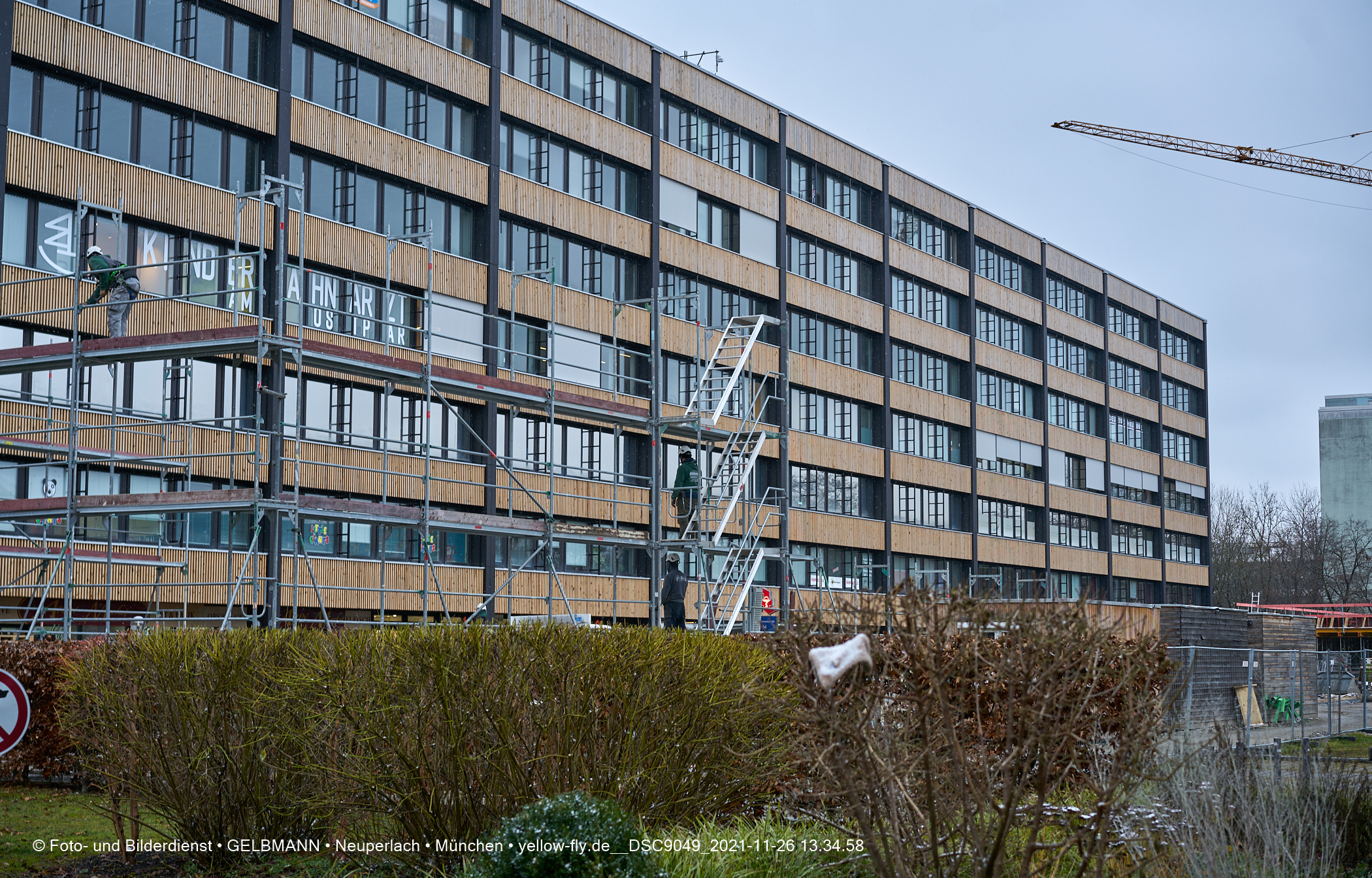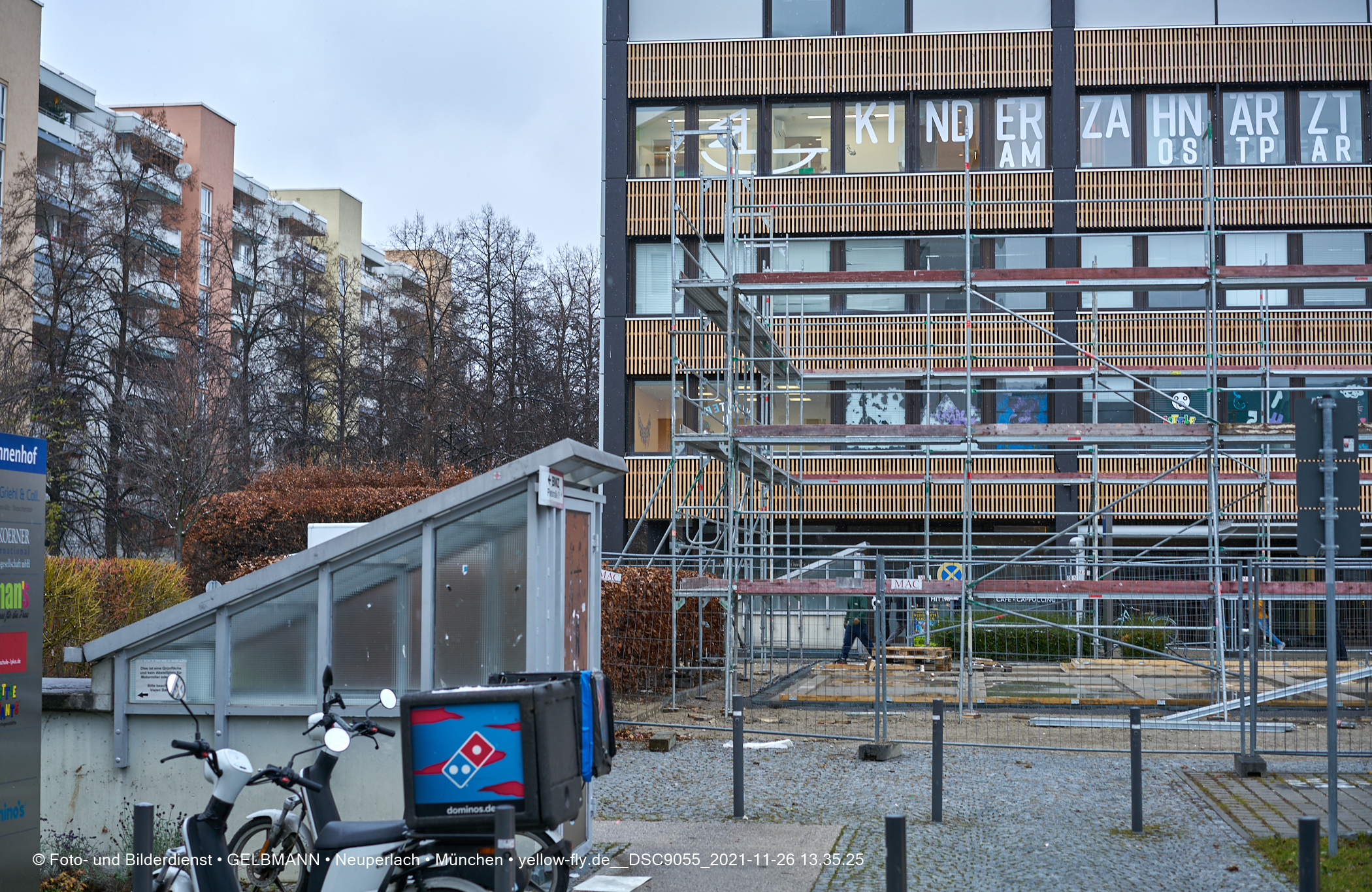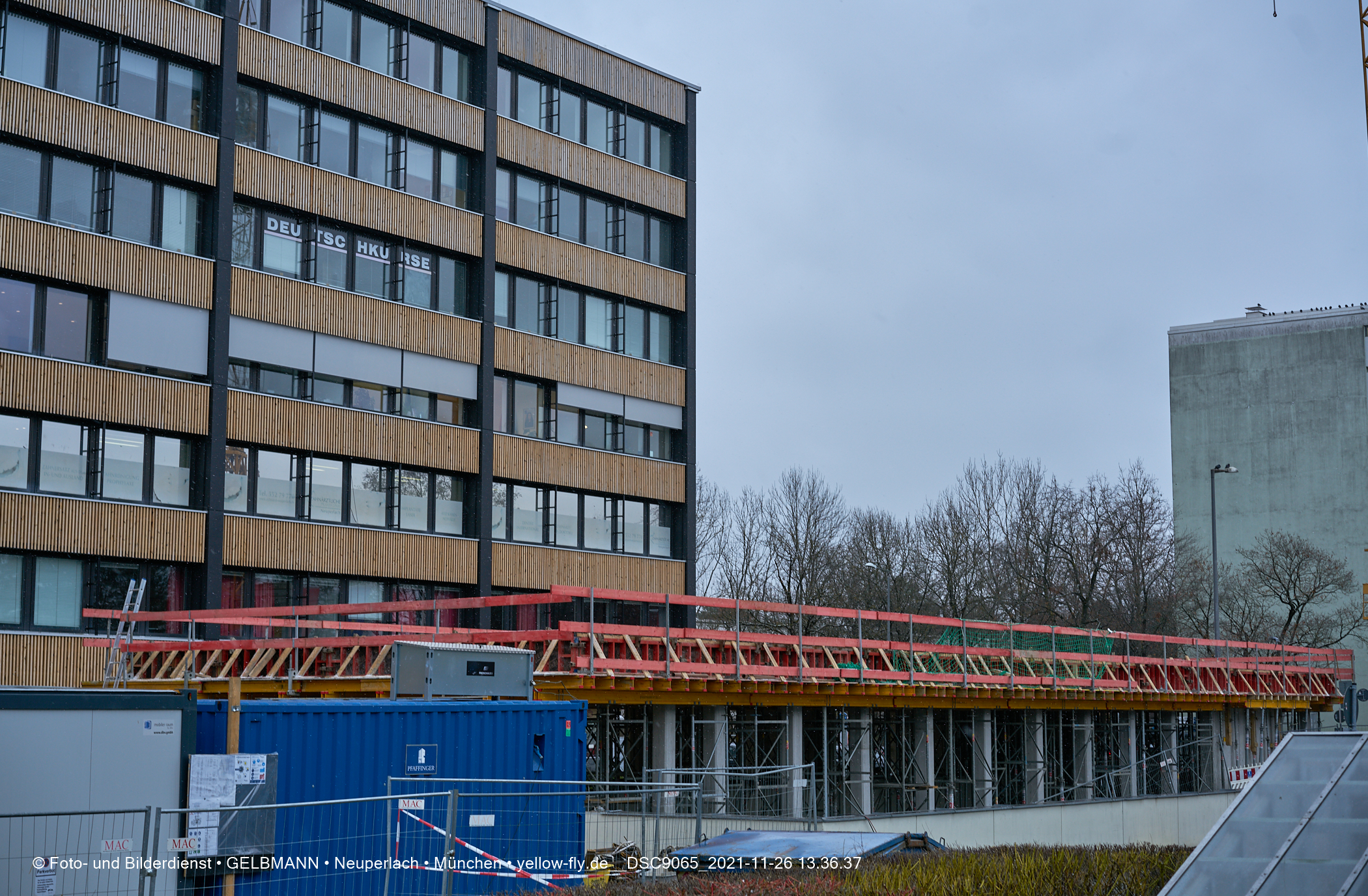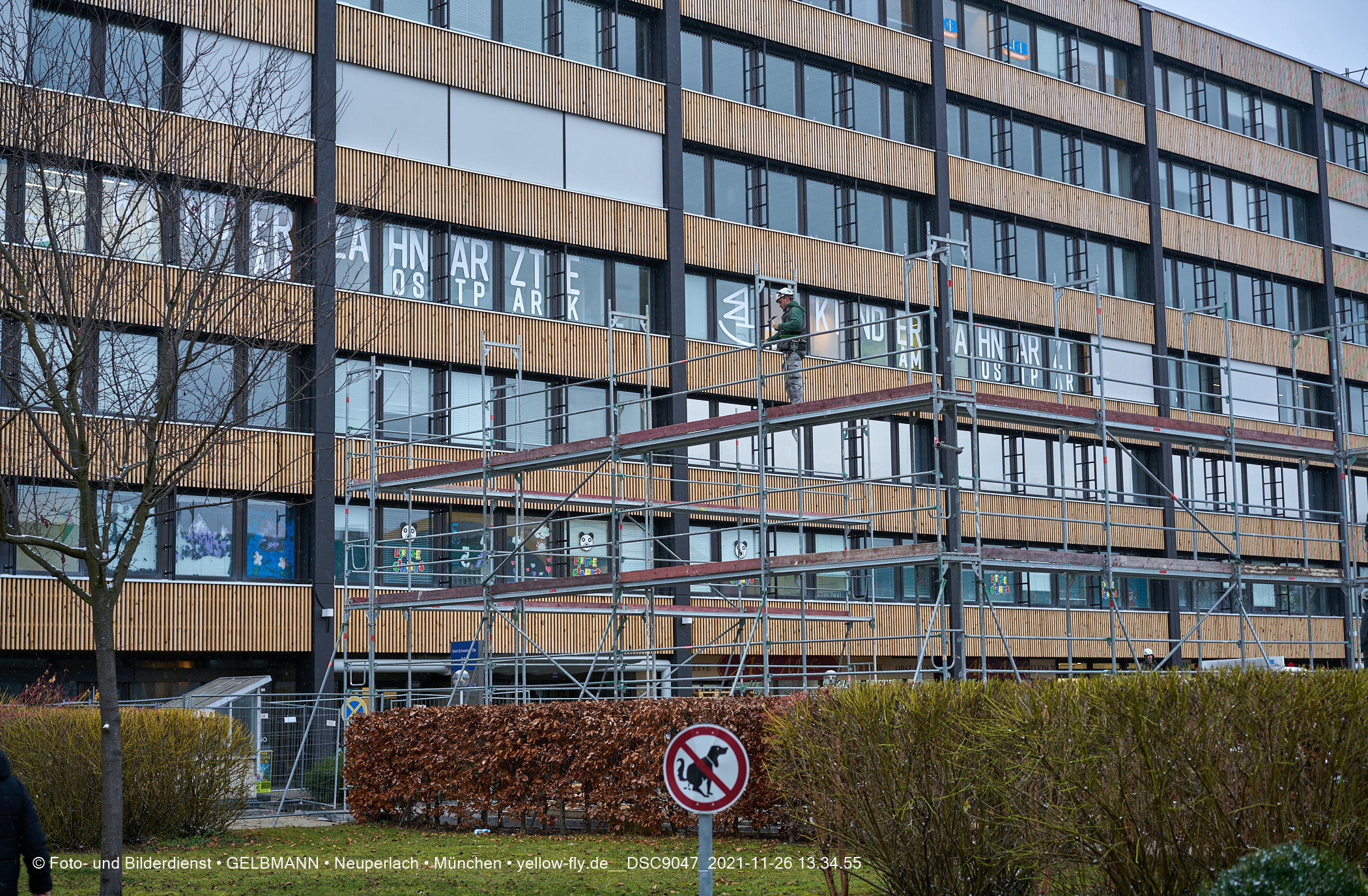 Ein großes Gerüst wird um die Baustelle zur Montessori Schule in Neuperlach aufgebaut. Auf der Seite zu Straße hin, sind schon die ersten Gebäudeteile zu erkennen. Am westlichen Ende wird gerade einhohes Gerüst aufgestellt.