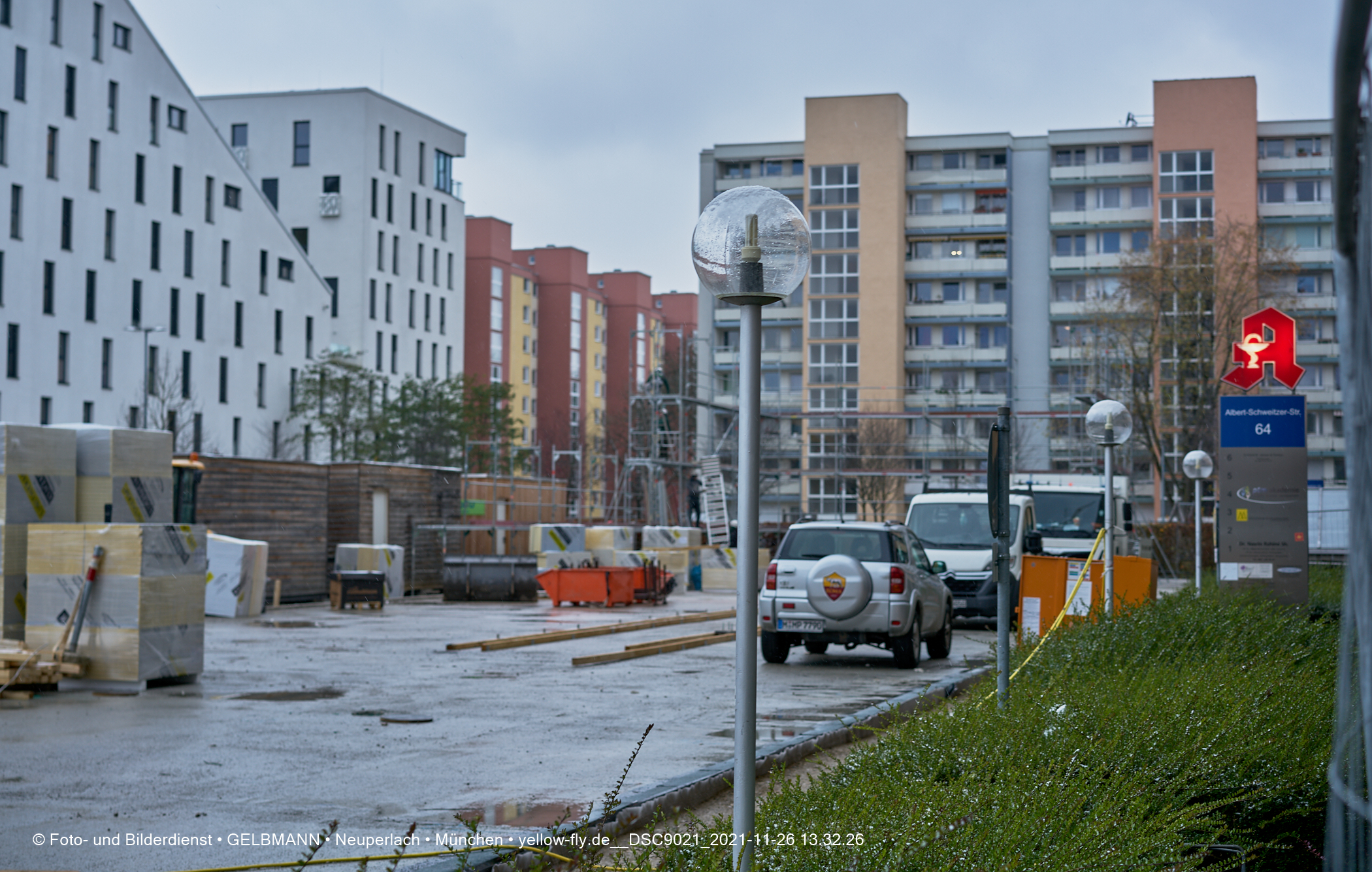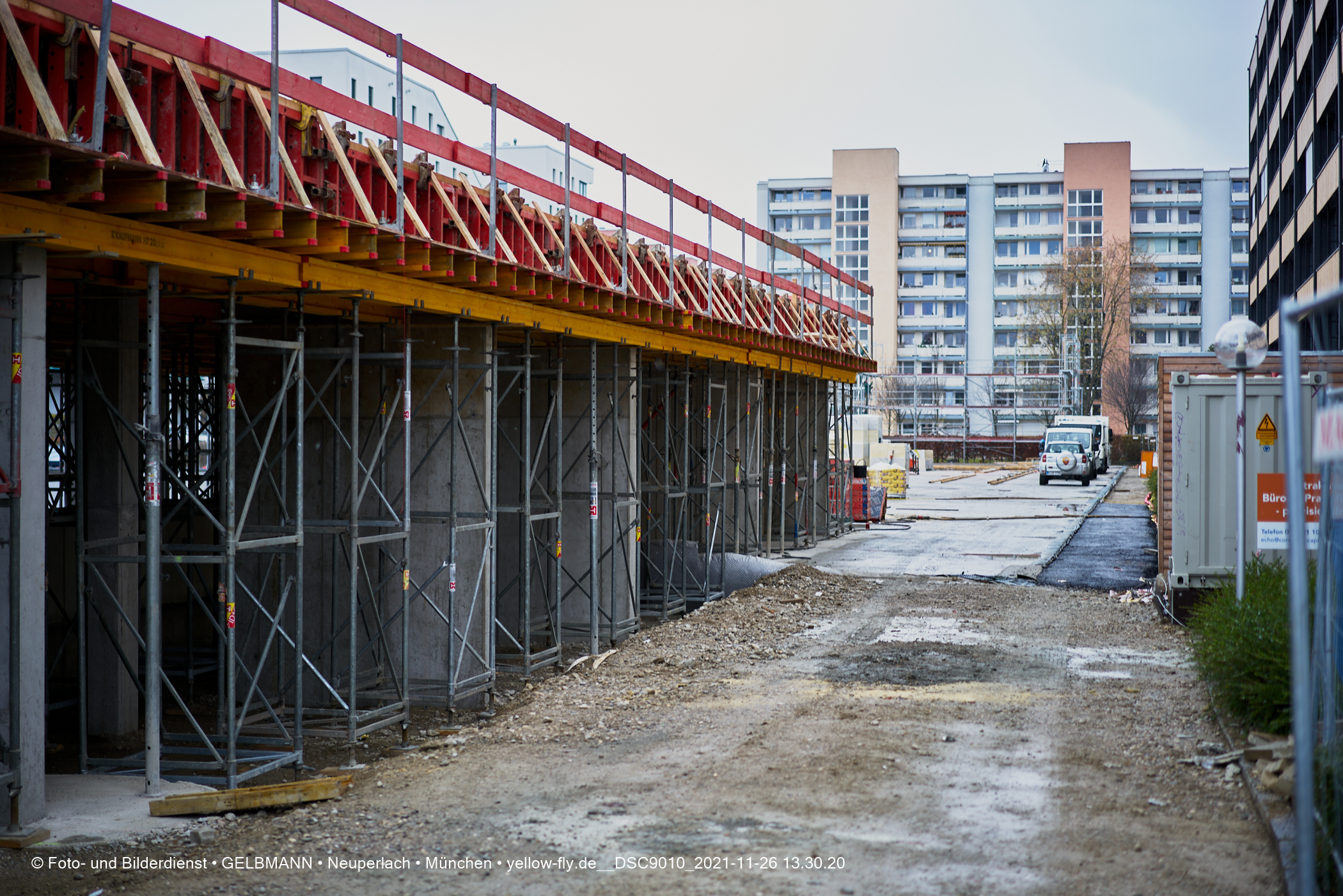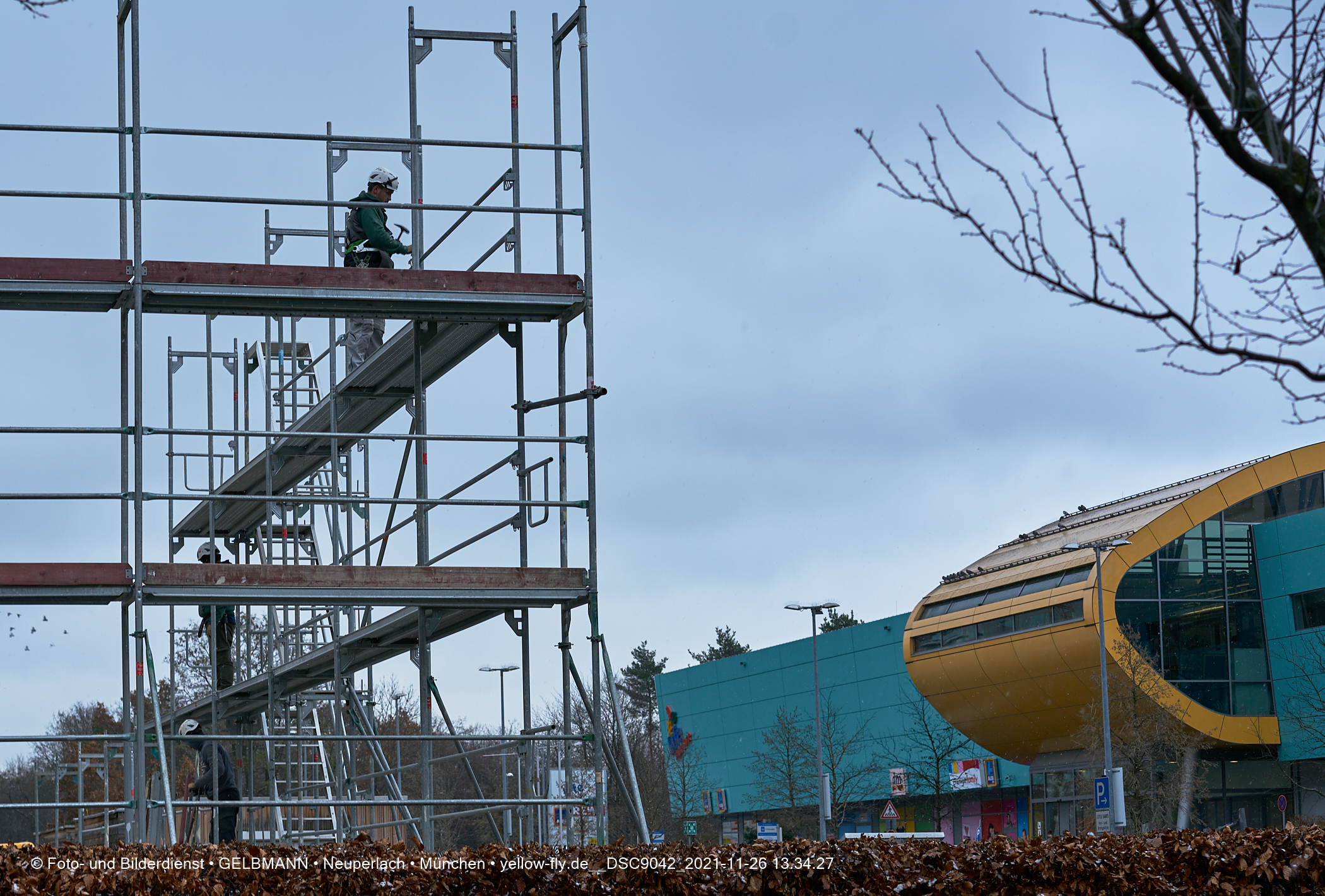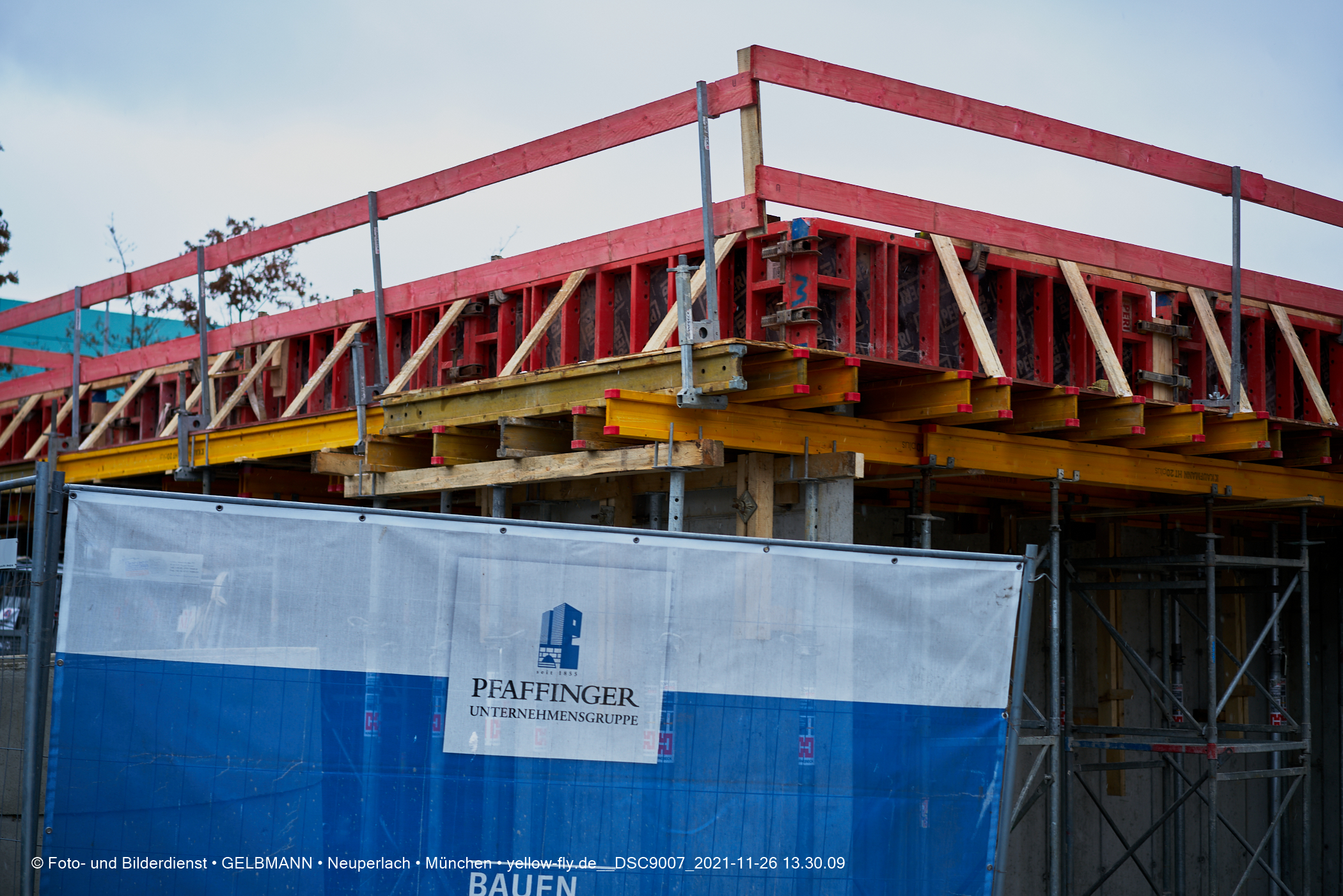 Ein großes Gerüst wird um die Baustelle zur Montessori Schule in Neuperlach aufgebaut. Auf der Seite zu Straße hin, sind schon die ersten Gebäudeteile zu erkennen. Am westlichen Ende wird gerade einhohes Gerüst aufgestellt.