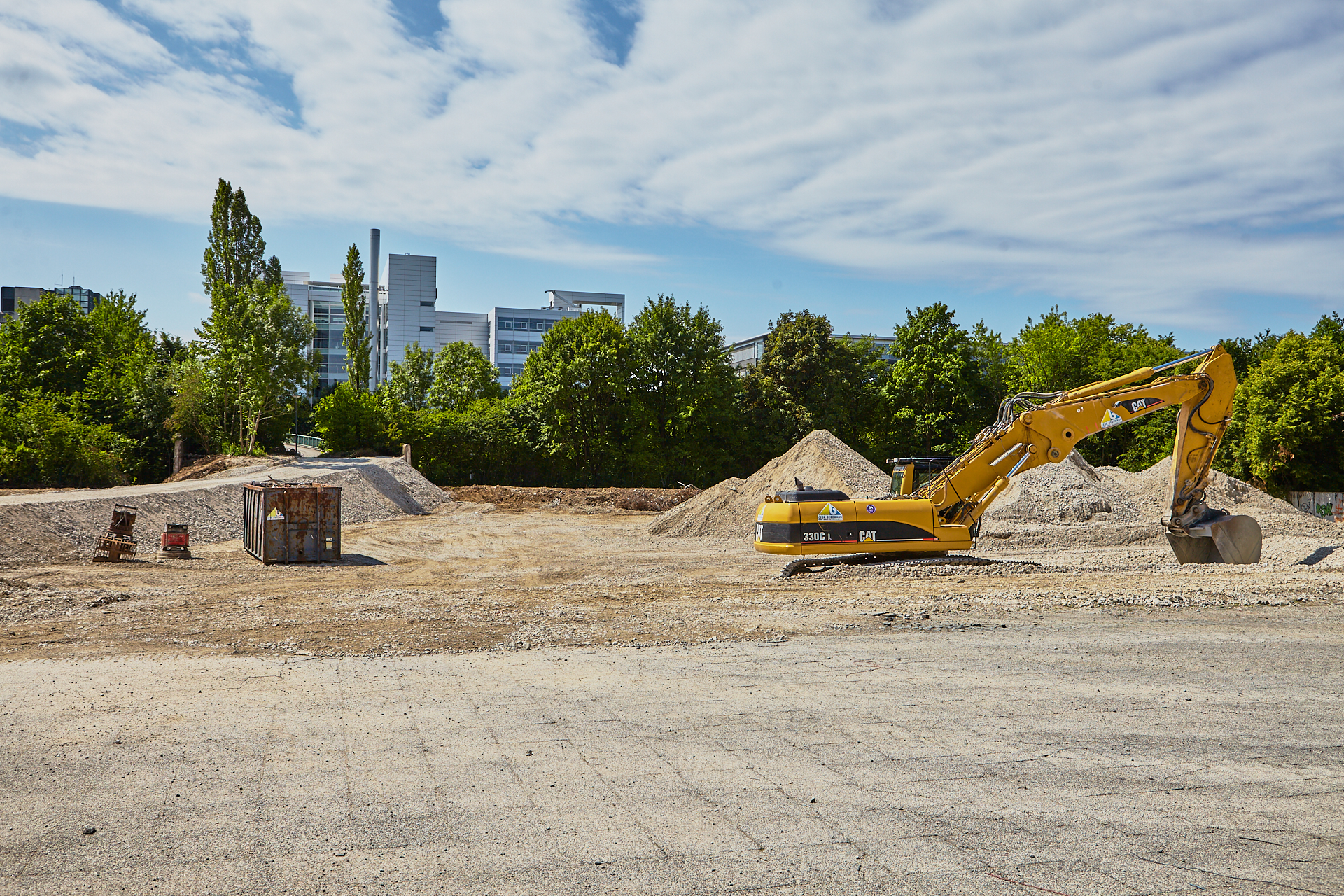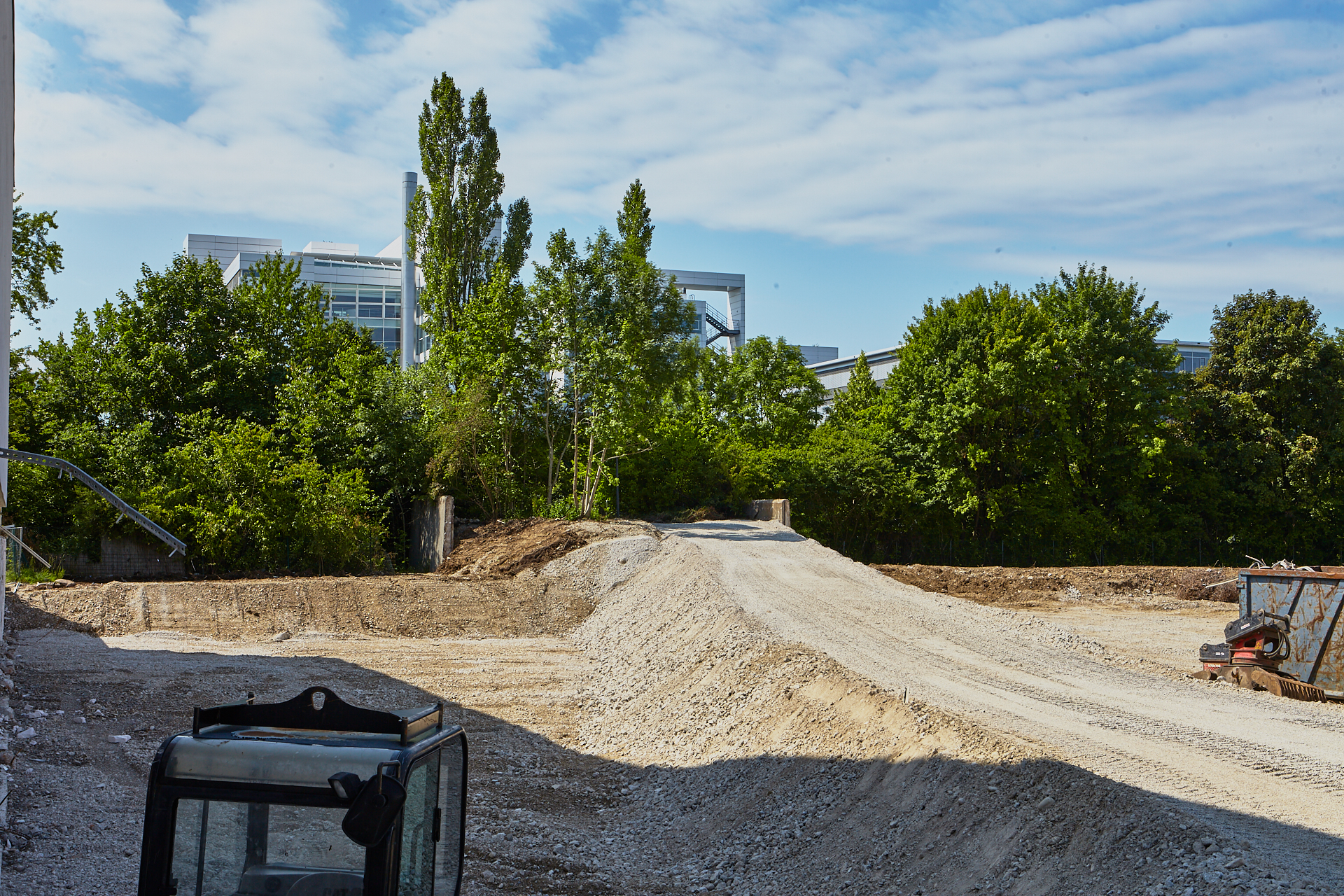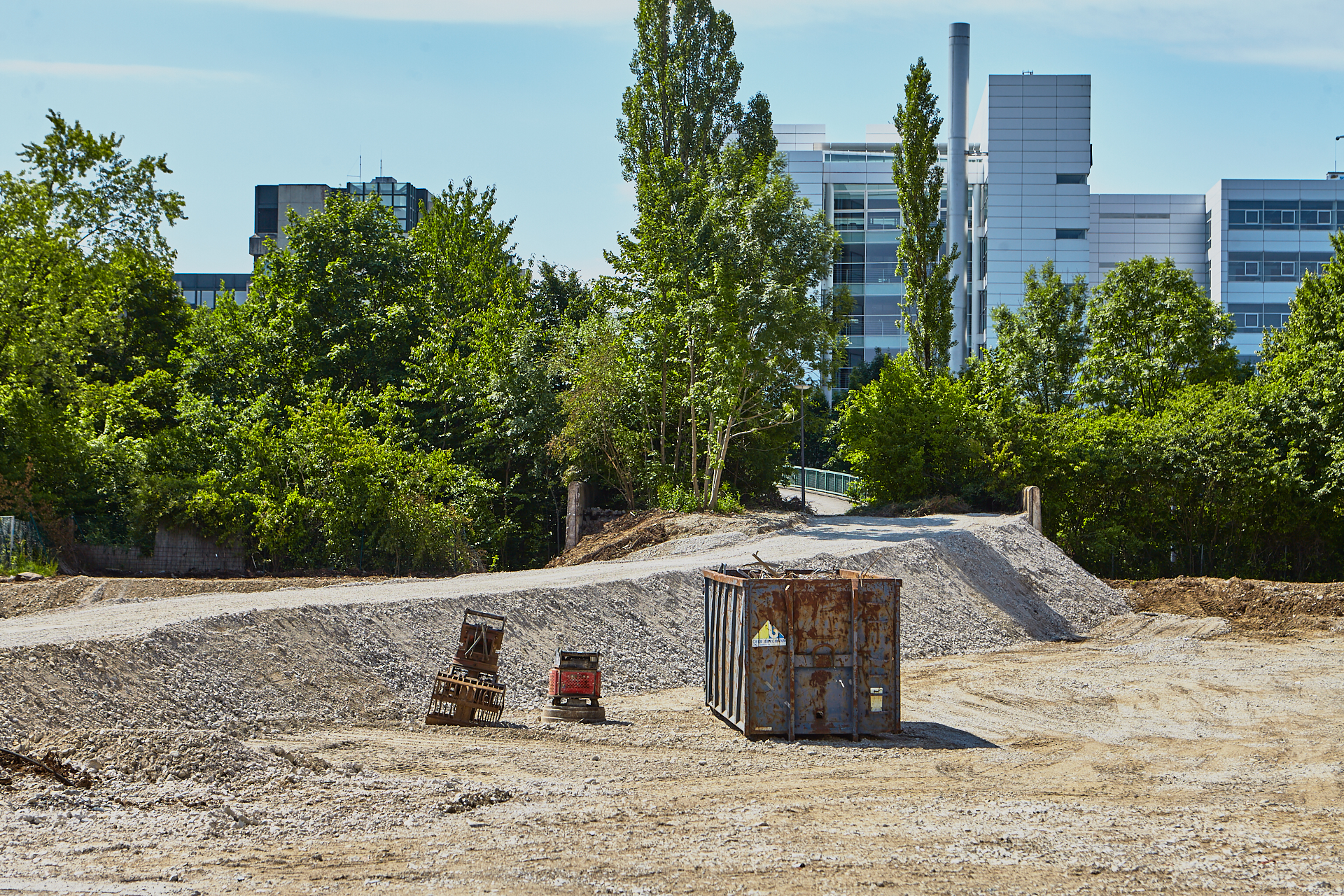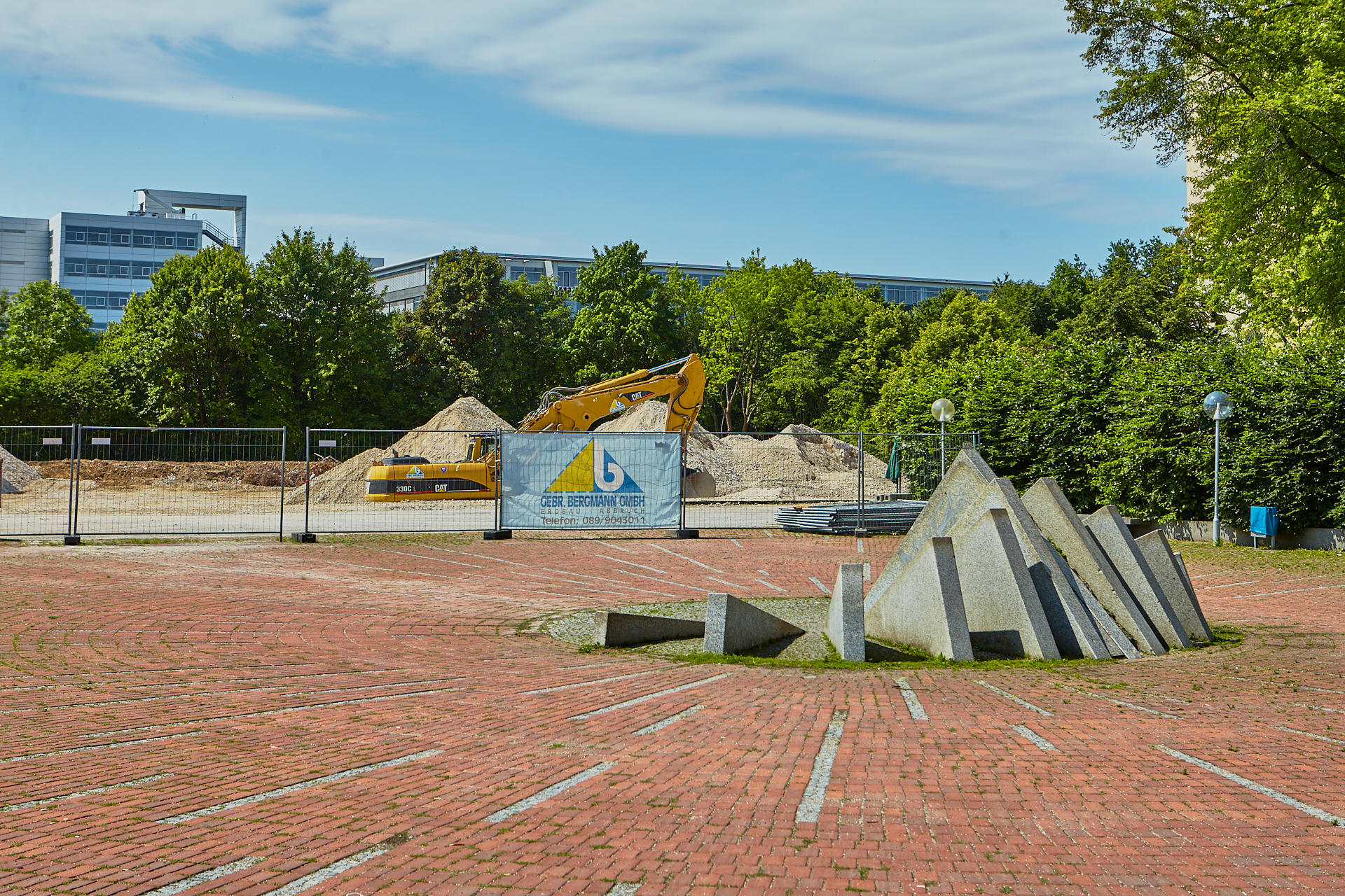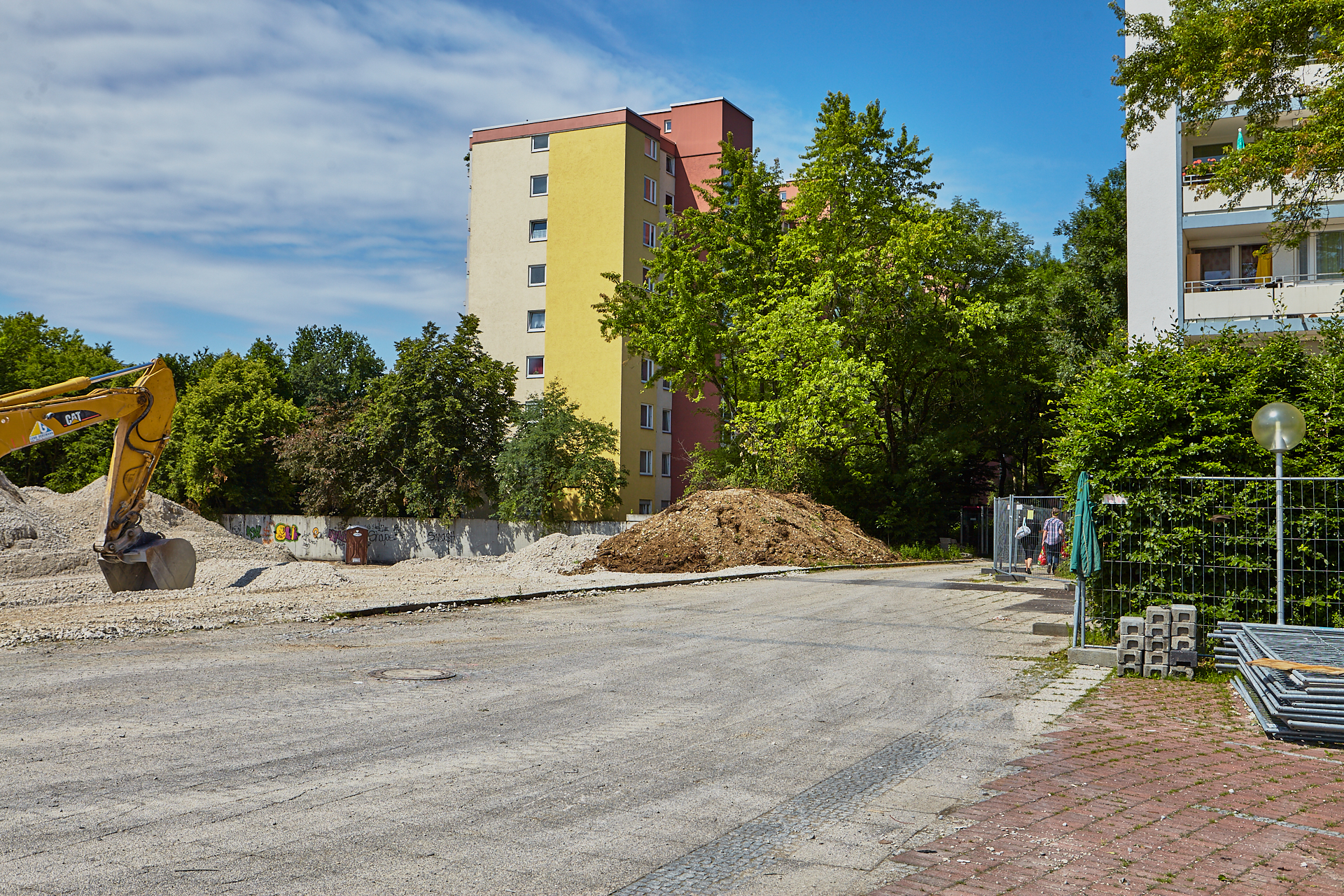 Das Plettzentrum im Sommer 2012. Auf einem Teil des Plettzentrums sind die Gehwegplatten entfernt worden. Ein Schotterweg wurde angelegt, um von der Brücke über die Ständlerstraße ins Plettzentrum zu kommen, führt quer über den Bauplatz gebaut.