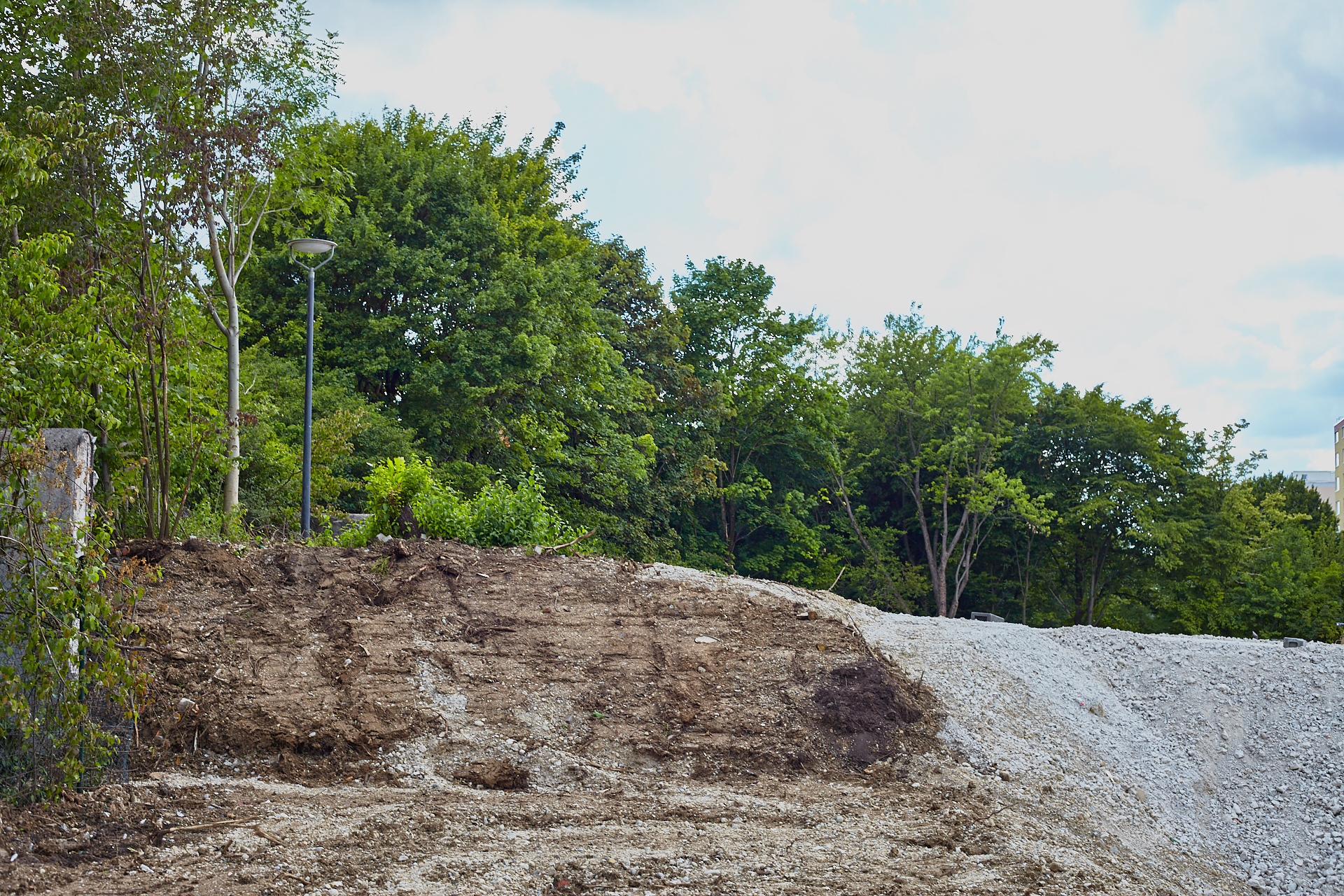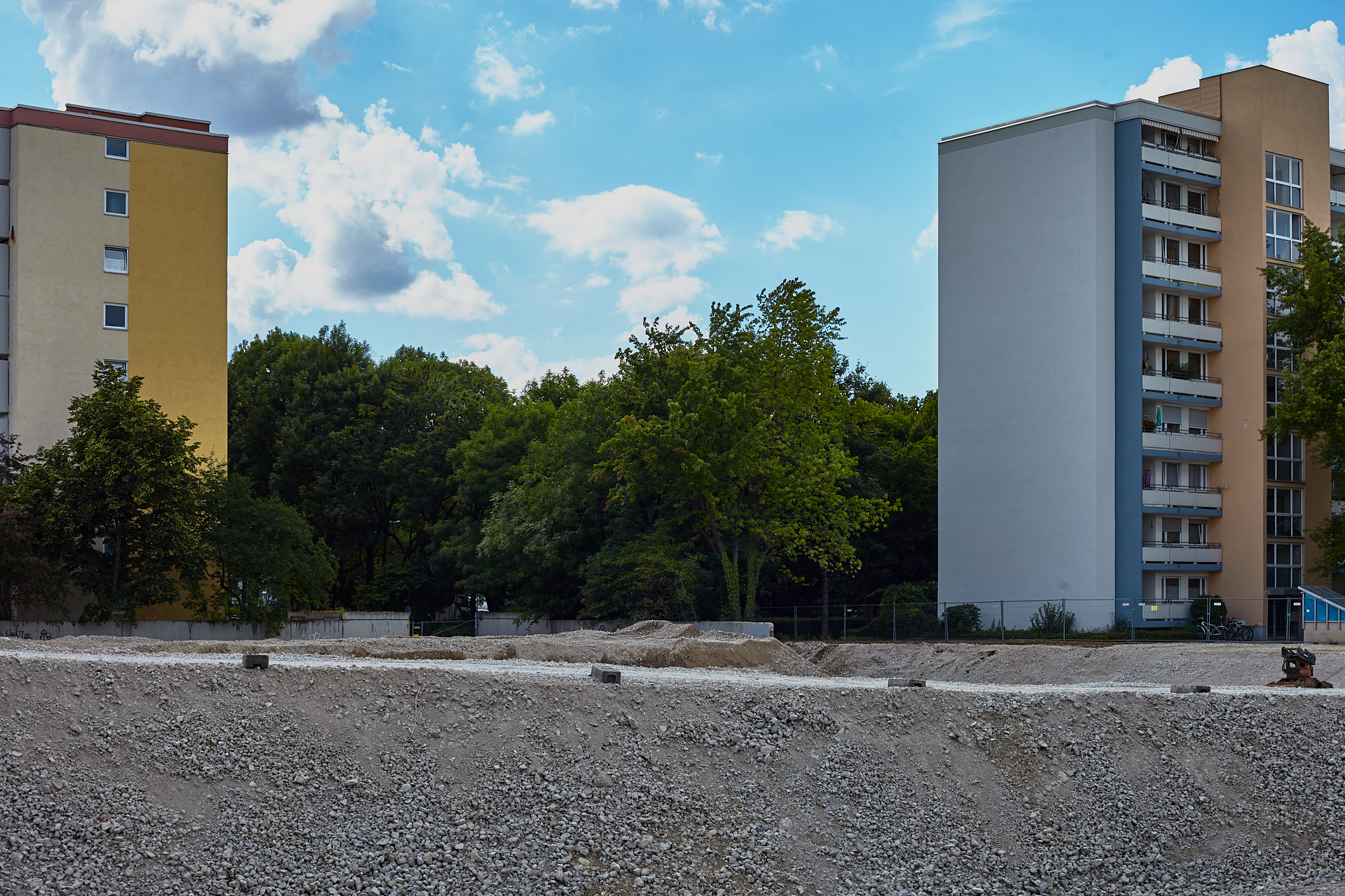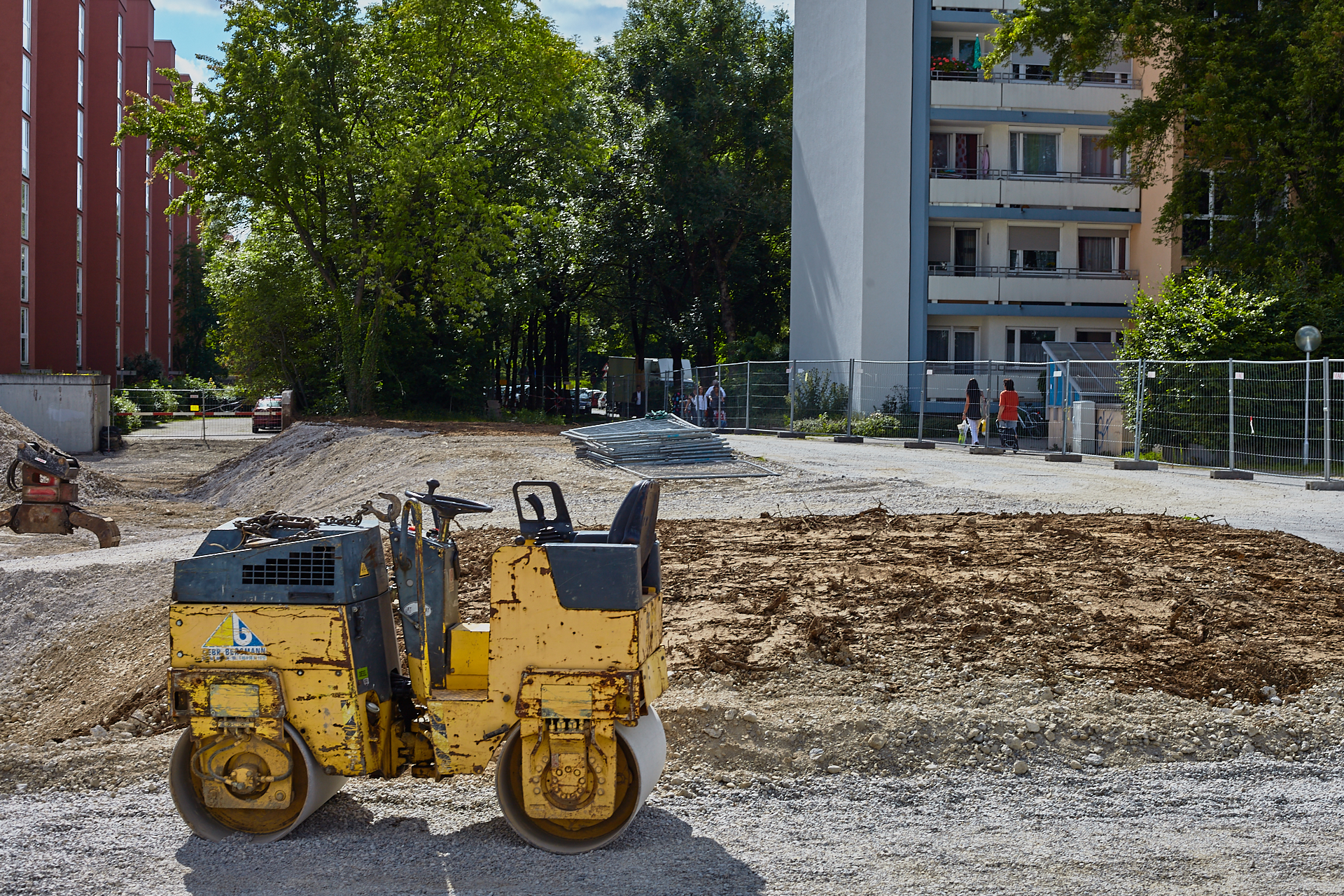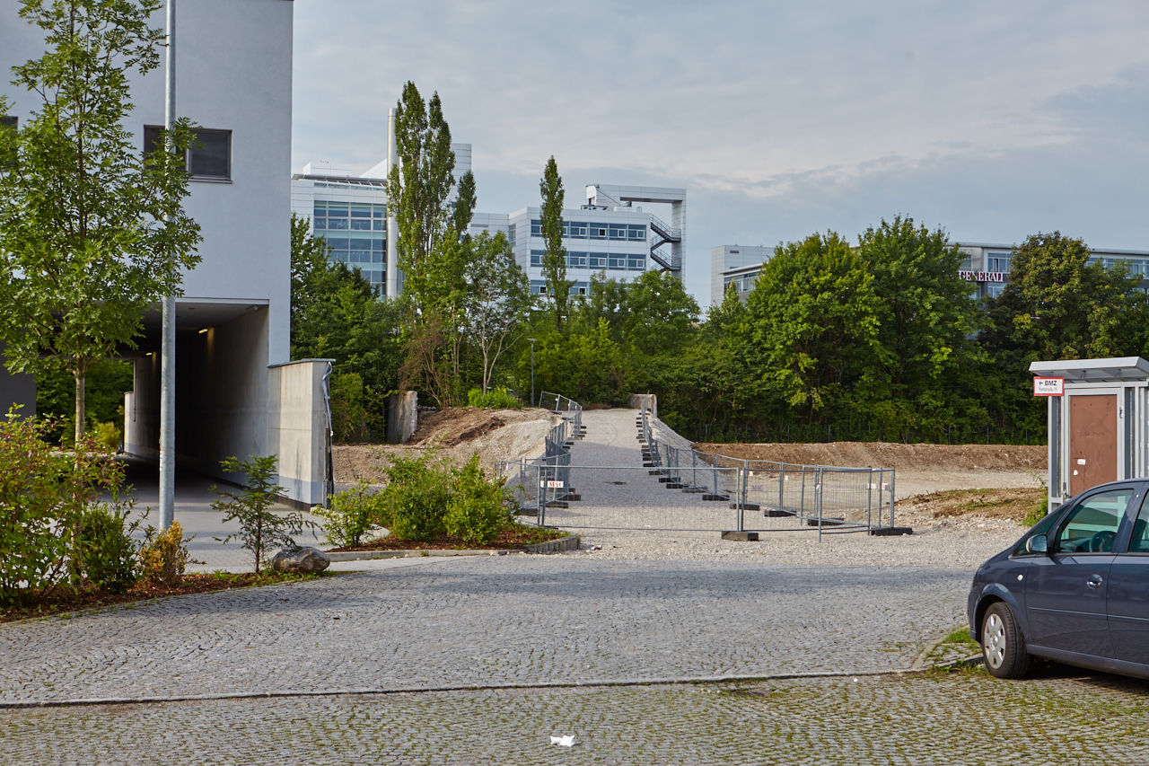 Das Plettzentrum im Sommer 2012. Auf einem Teil des Plettzentrums sind die Gehwegplatten entfernt worden. Ein Schotterweg wurde angelegt, um von der Brücke über die Ständlerstraße ins Plettzentrum zu kommen, führt quer über den Bauplatz gebaut.