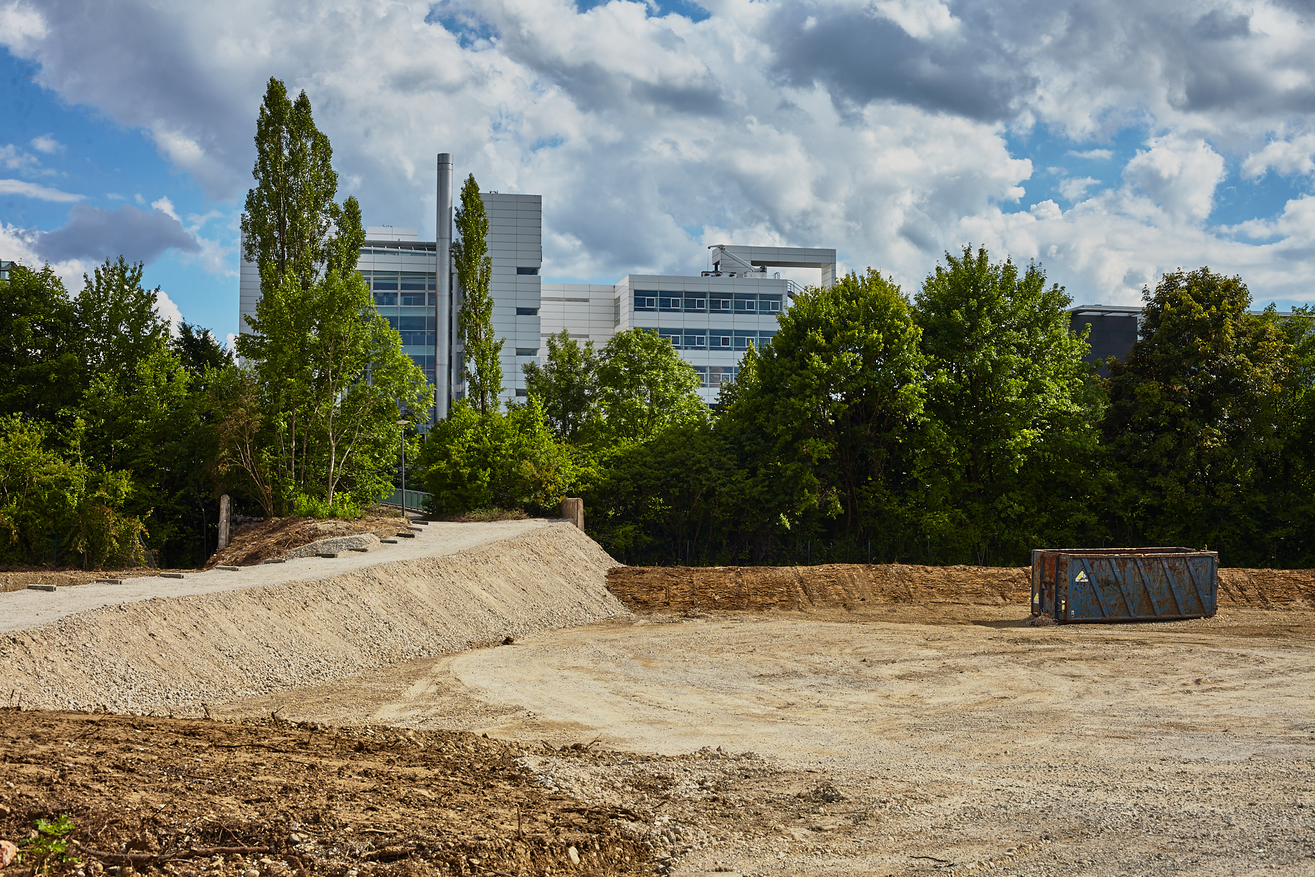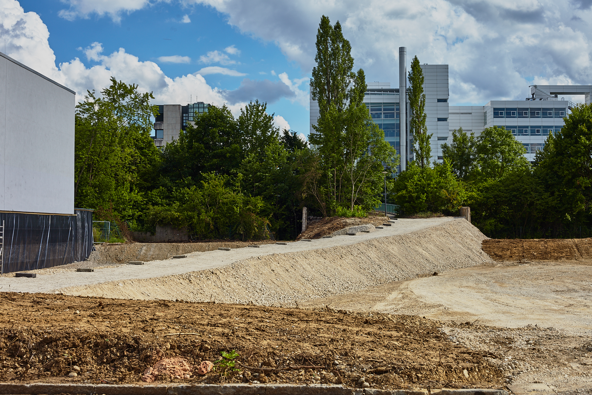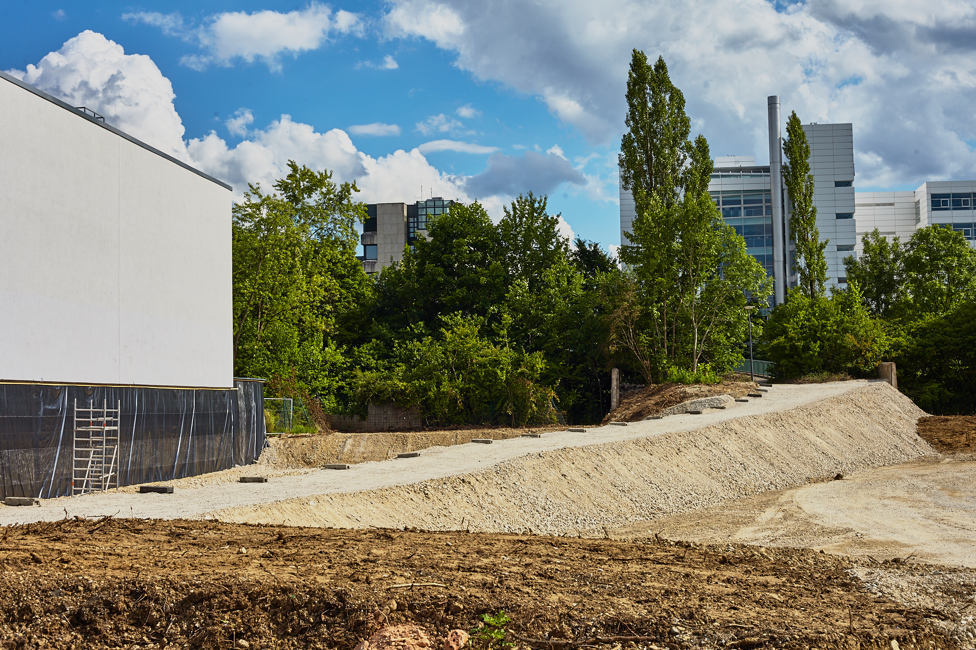 Das Plettzentrum im Sommer 2012. Auf einem Teil des Plettzentrums sind die Gehwegplatten entfernt worden. Ein Schotterweg wurde angelegt, um von der Brücke über die Ständlerstraße ins Plettzentrum zu kommen, führt quer über den Bauplatz gebaut.