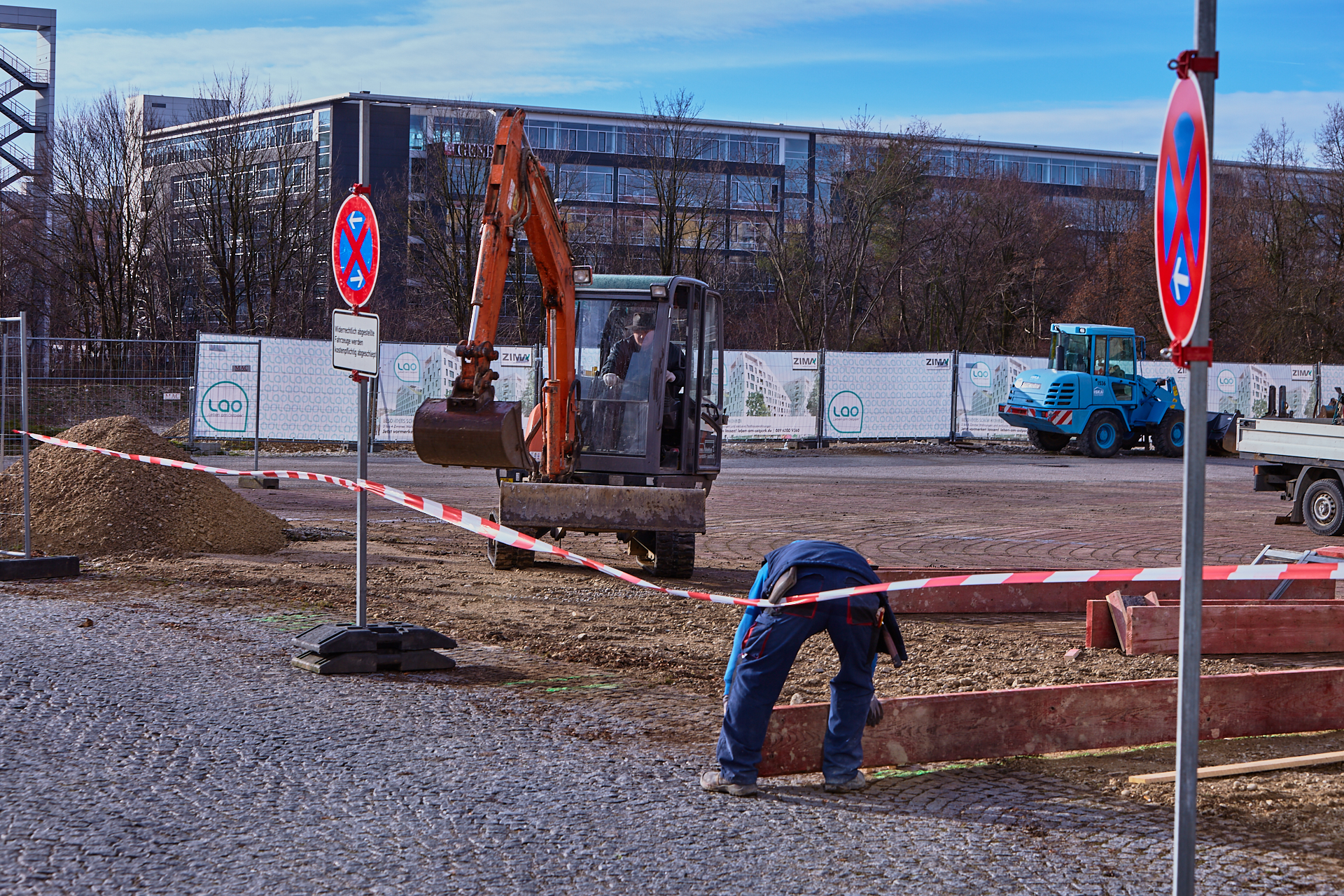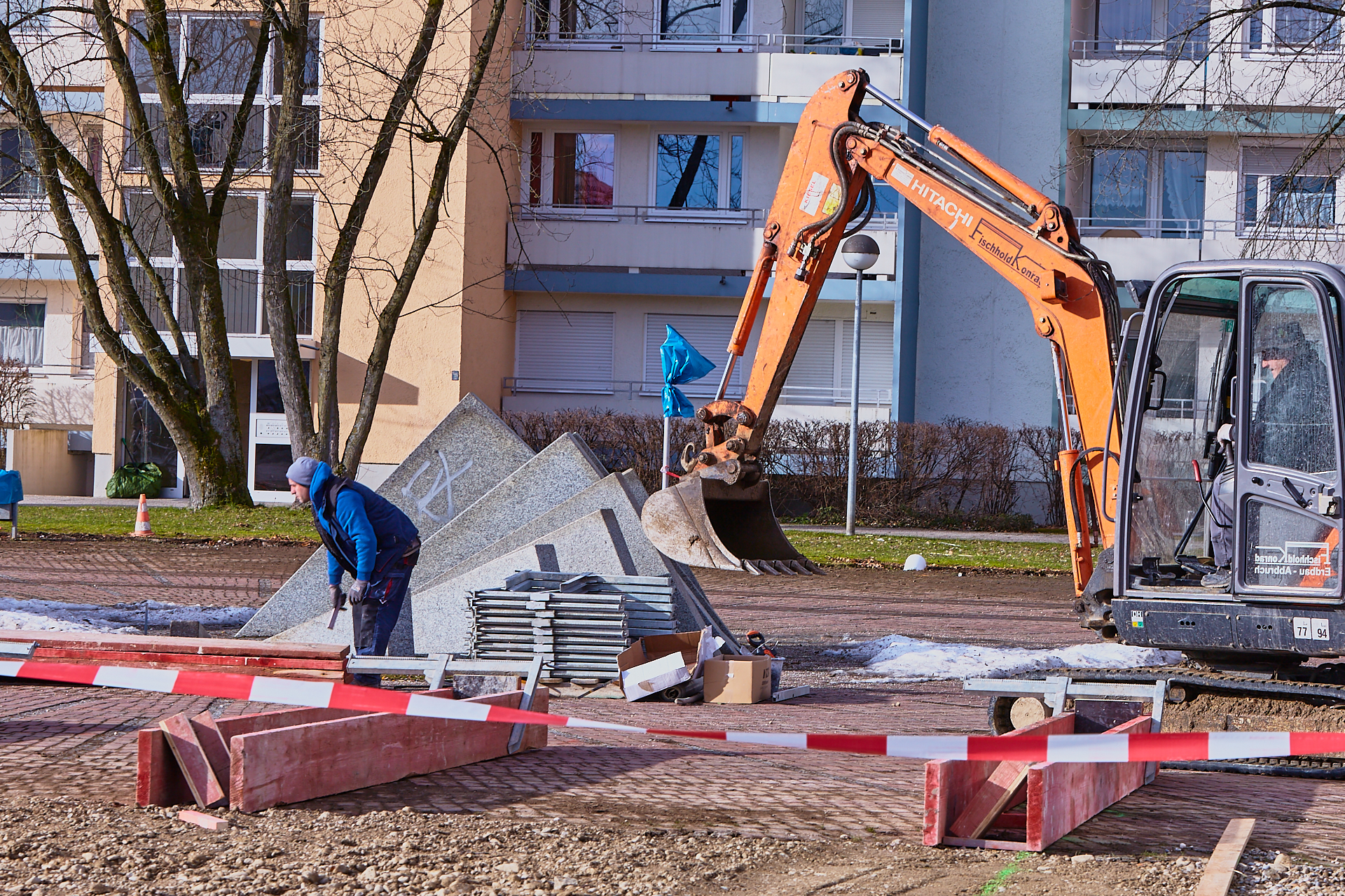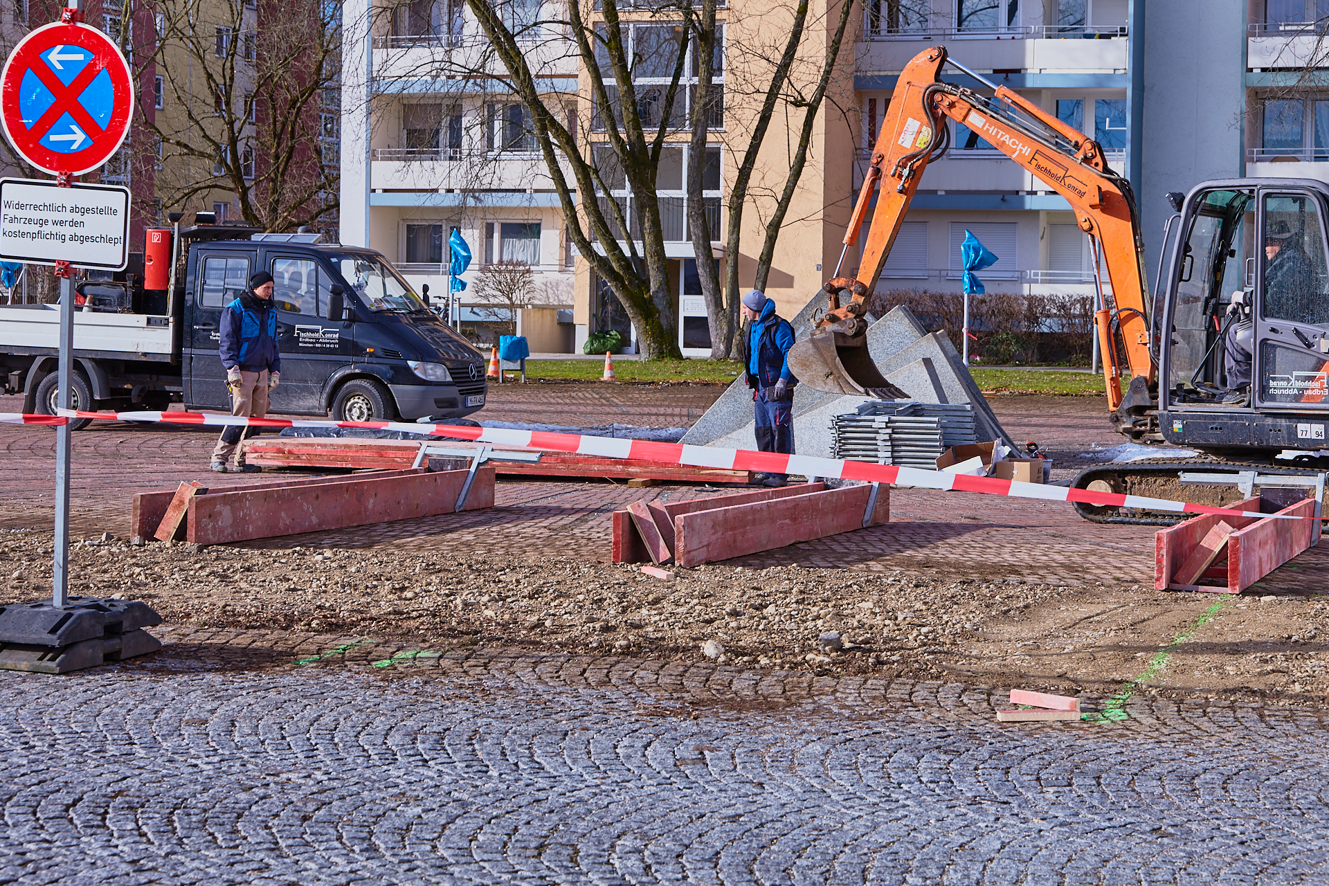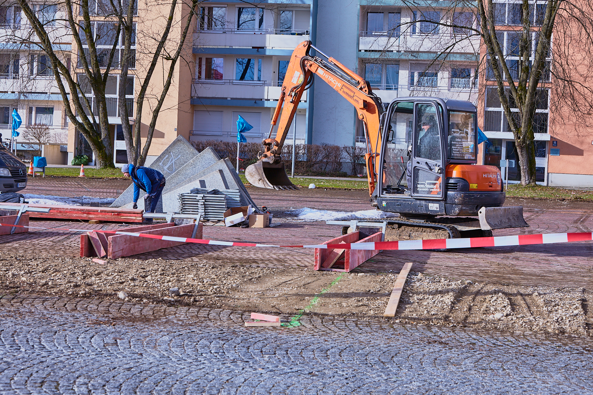Winter im Plettzentrum. Die Bauarbeiten run um unsere Sonnenuhr haben begonnen. Pflastersteine werden aufgerissen und Markierungen in den Boden geschlagen. Eine Schotterweg führt über die Bausetelle zum LAO-Haus in unser schönes Plettzentrum. Eine riesige kahle Fläche zeigt die Größe des zukünftigen LAO-Hasuses. Der Weg über die Brücke an der Ständlerstraße ist seit einigen Tagen gesperrt. Der Platz vor der Baustelle ist noch im Originalzustand und die Sonnenuhr zeigt keine Zeit mehr an.