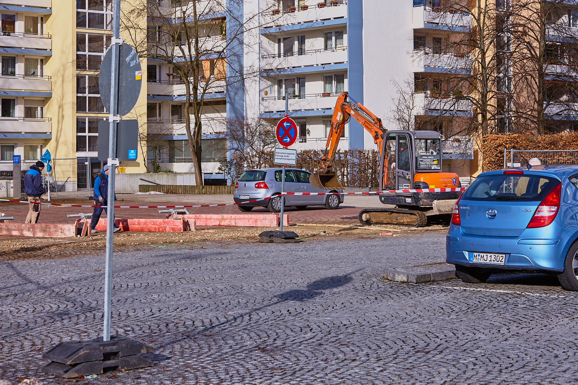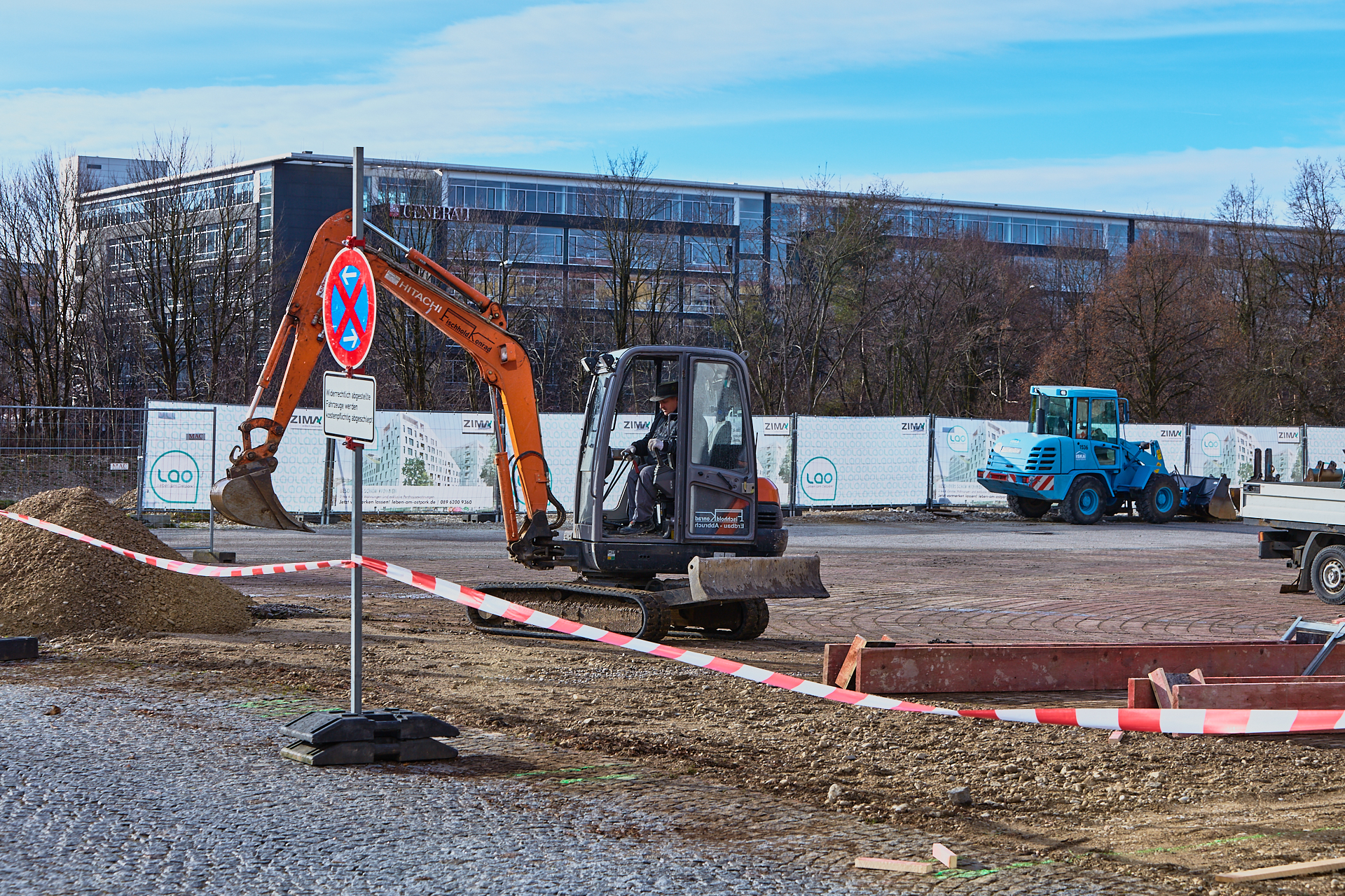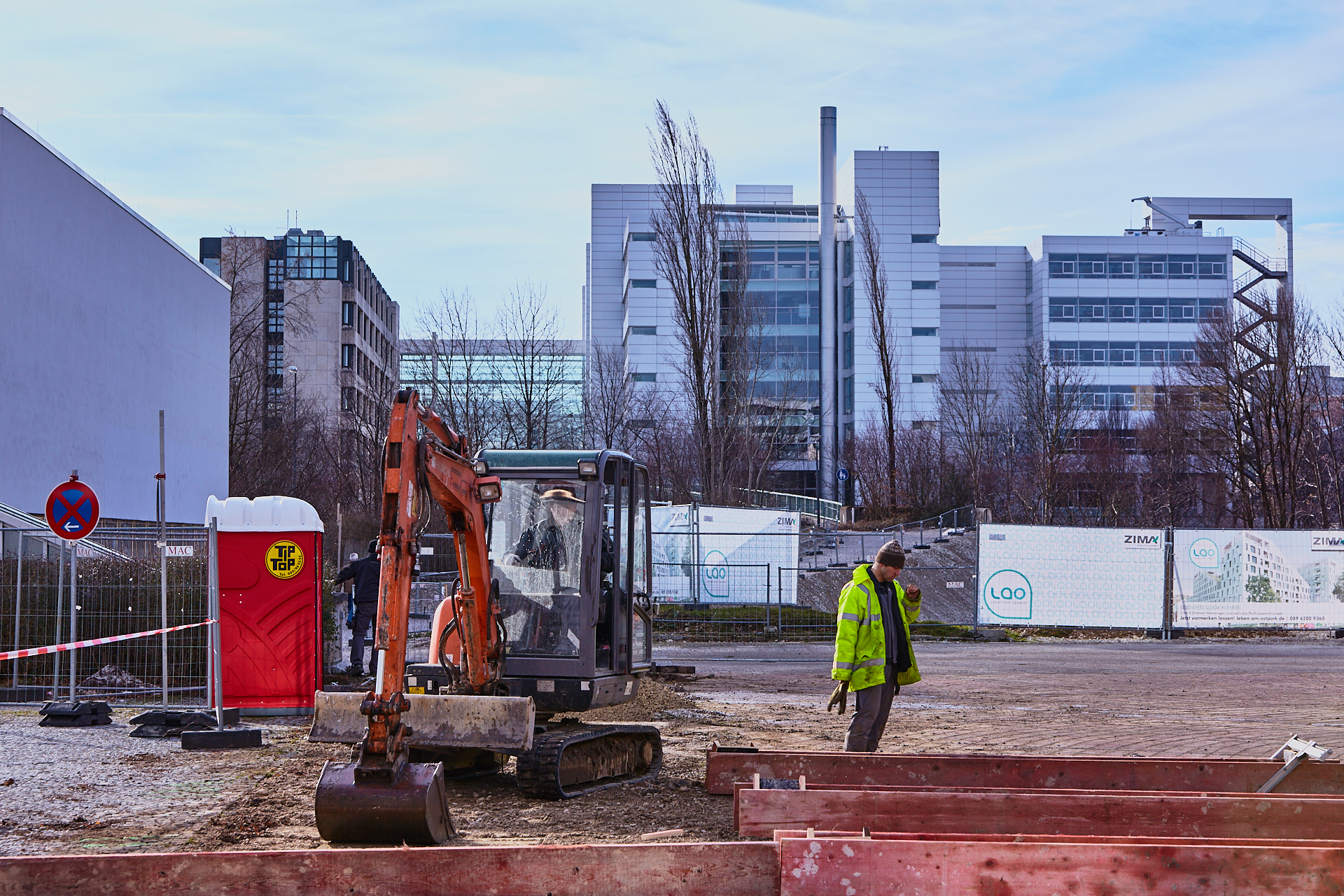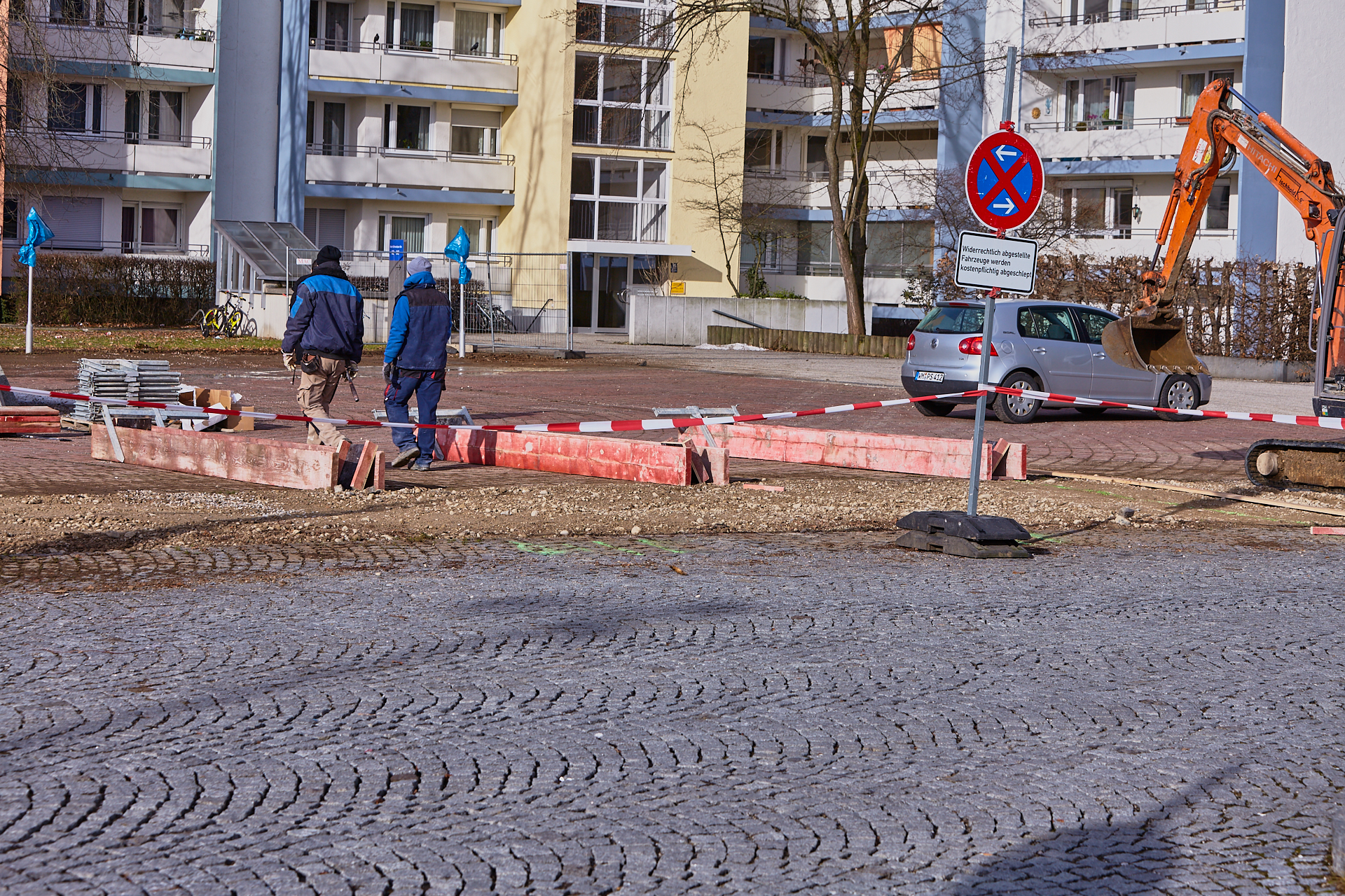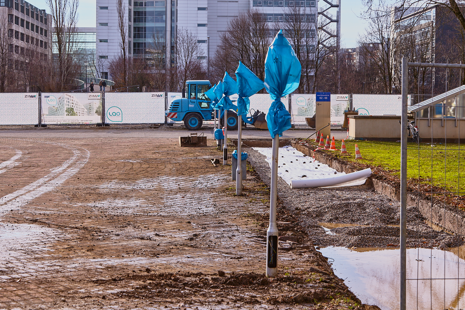 Winter im Plettzentrum. Die Bauarbeiten run um unsere Sonnenuhr haben begonnen. Pflastersteine werden aufgerissen und Markierungen in den Boden geschlagen. Eine Schotterweg führt über die Bausetelle zum LAO-Haus in unser schönes Plettzentrum. Eine riesige kahle Fläche zeigt die Größe des zukünftigen LAO-Hasuses. Der Weg über die Brücke an der Ständlerstraße ist seit einigen Tagen gesperrt. Der Platz vor der Baustelle ist noch im Originalzustand und die Sonnenuhr zeigt keine Zeit mehr an.