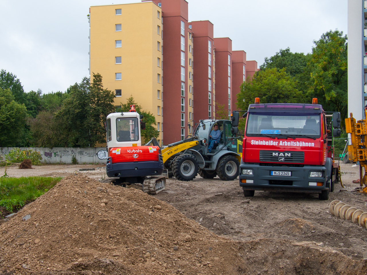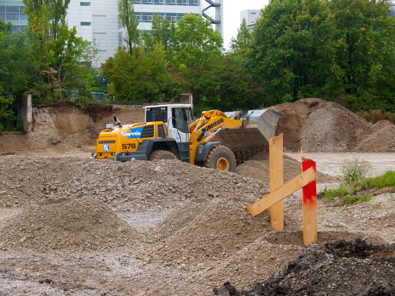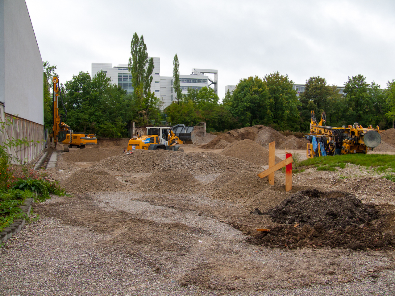 DIE VORBEREITUNGEN FÜR DEN AUSHUB DER BAUGRUBE BEGINNEN. MIT GROSSEN BOHRMASCHINEN WERDEN LÖCHER FÜR DIE SPUNDWÄNDE GEBOHRT.