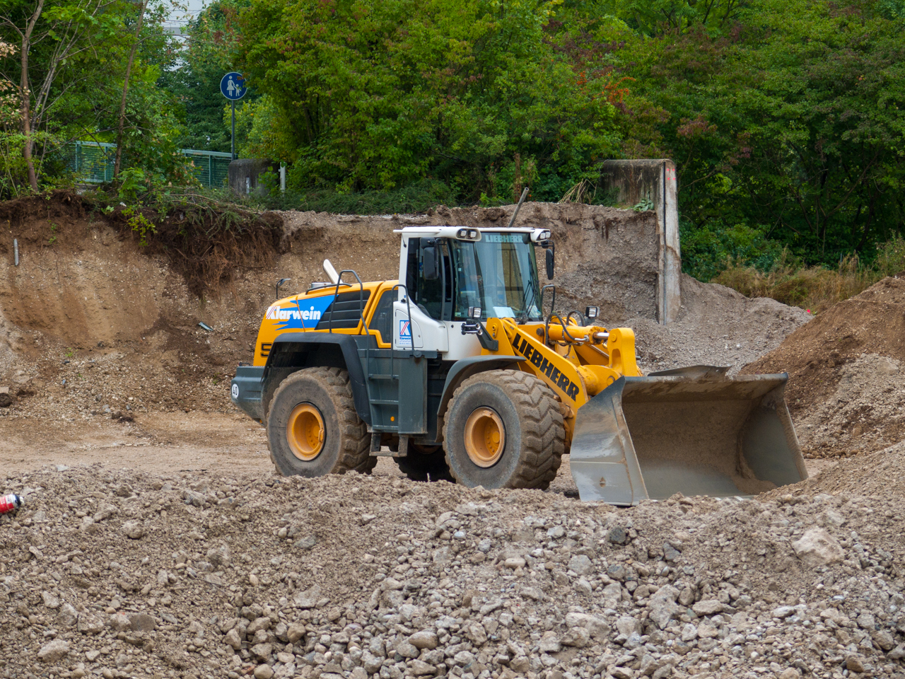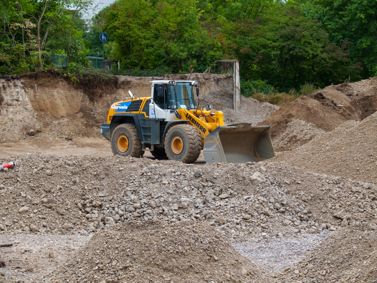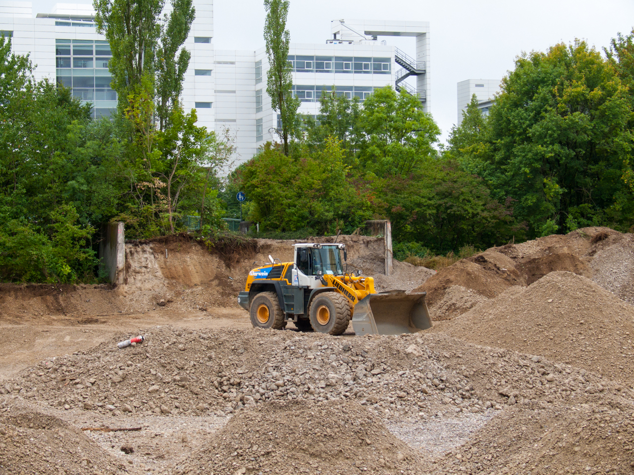 DIE VORBEREITUNGEN FÜR DEN AUSHUB DER BAUGRUBE BEGINNEN. MIT GROSSEN BOHRMASCHINEN WERDEN LÖCHER FÜR DIE SPUNDWÄNDE GEBOHRT.