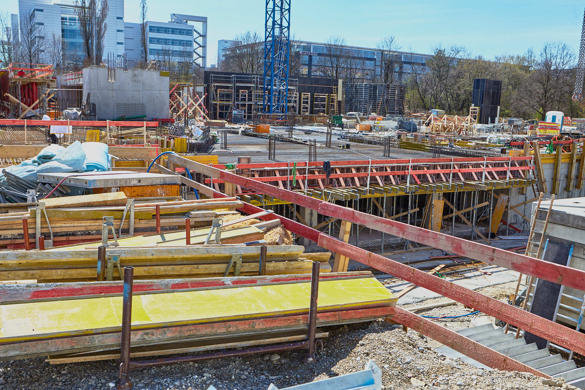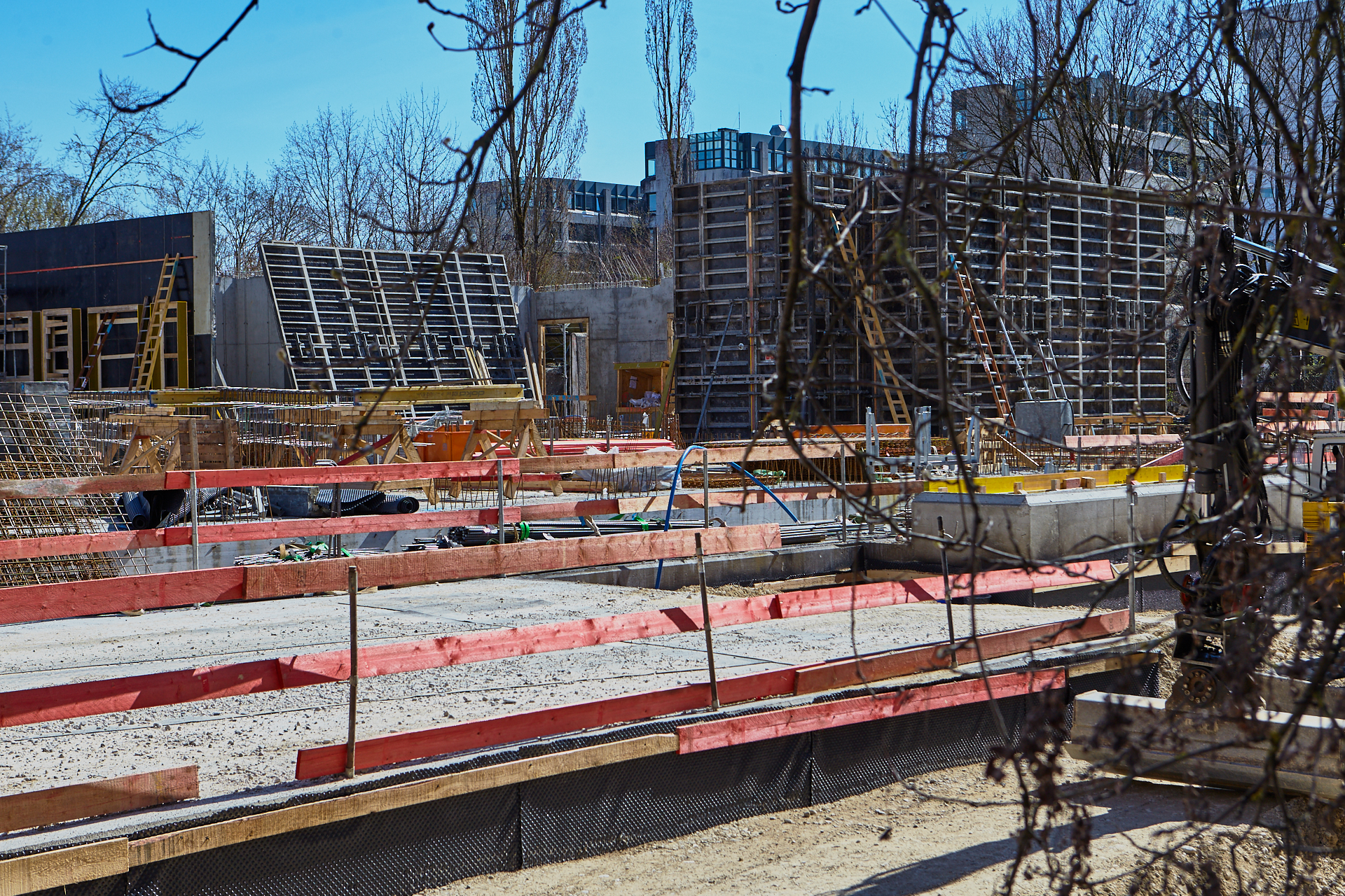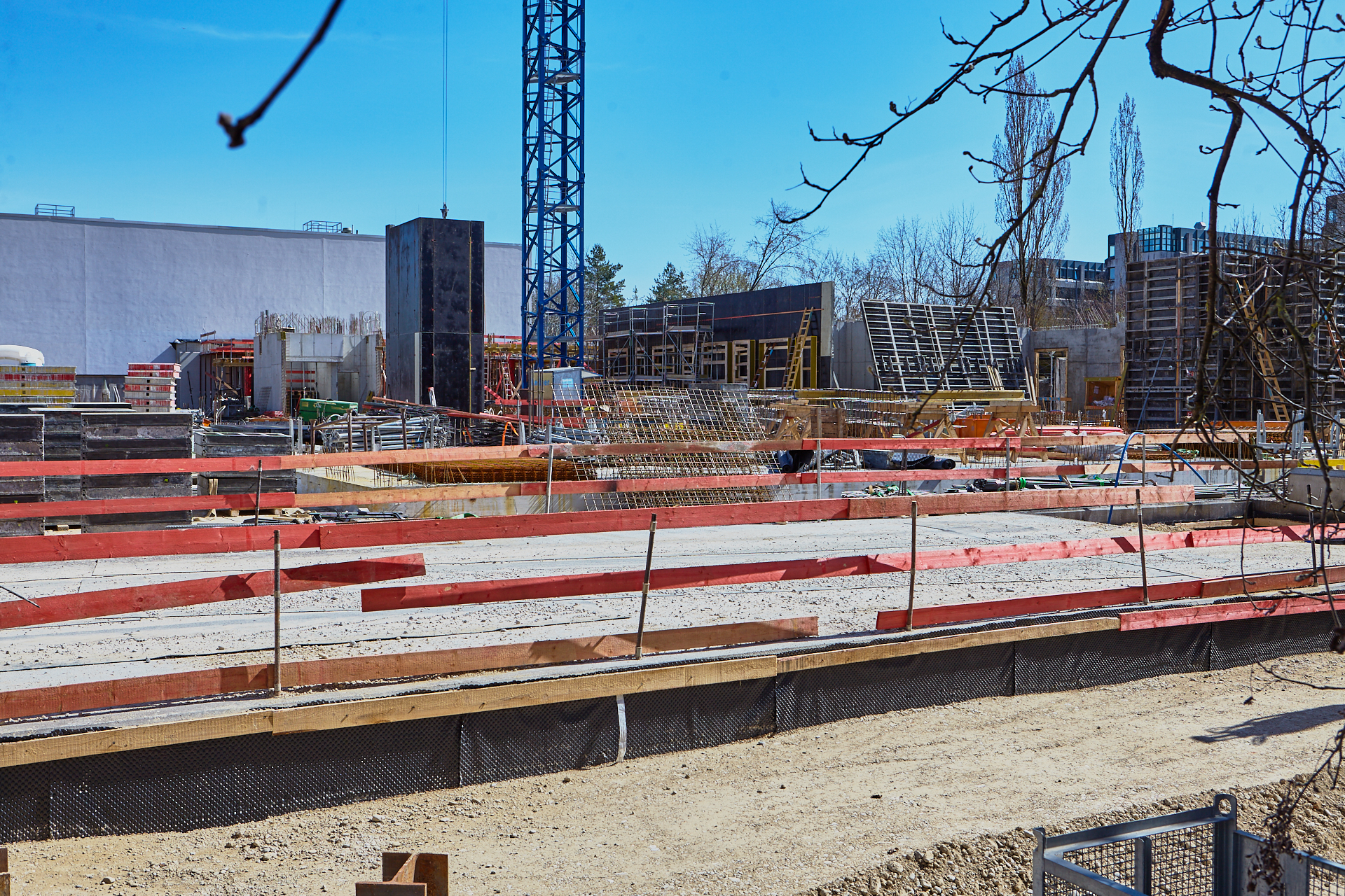 Der Keller und das Erdgeschoß des neuen LAO-Hauses werden gerade bearbeitet. Die Baustelle zum neuen LAO-HAUS, Leben am Ostpark, mit moderner Architektur und urbaner Gestaltung. Langsam wachsen die Wände am zukünftigen Wohn- und Geschäftsgebäude LAO-HAUS.