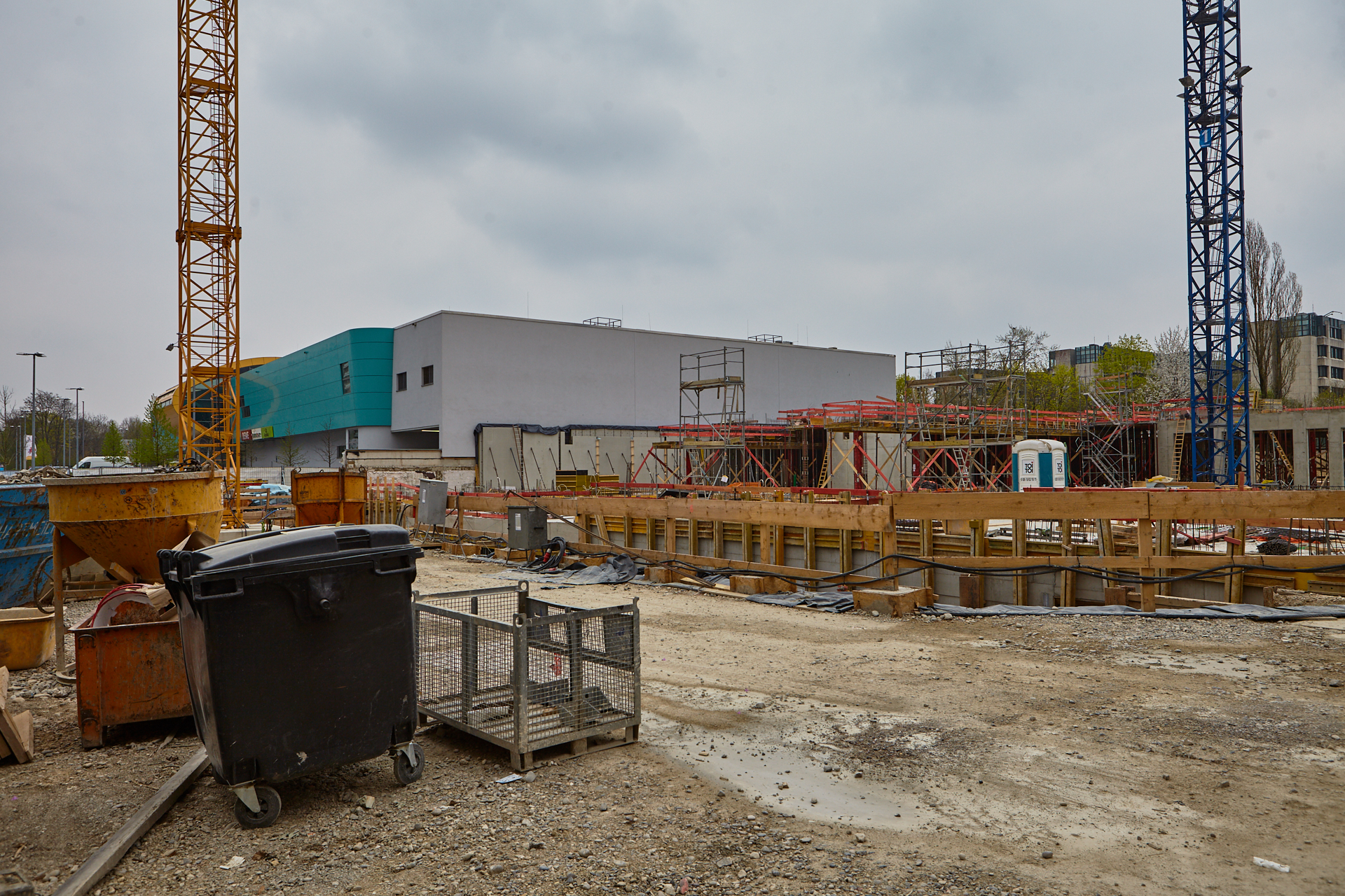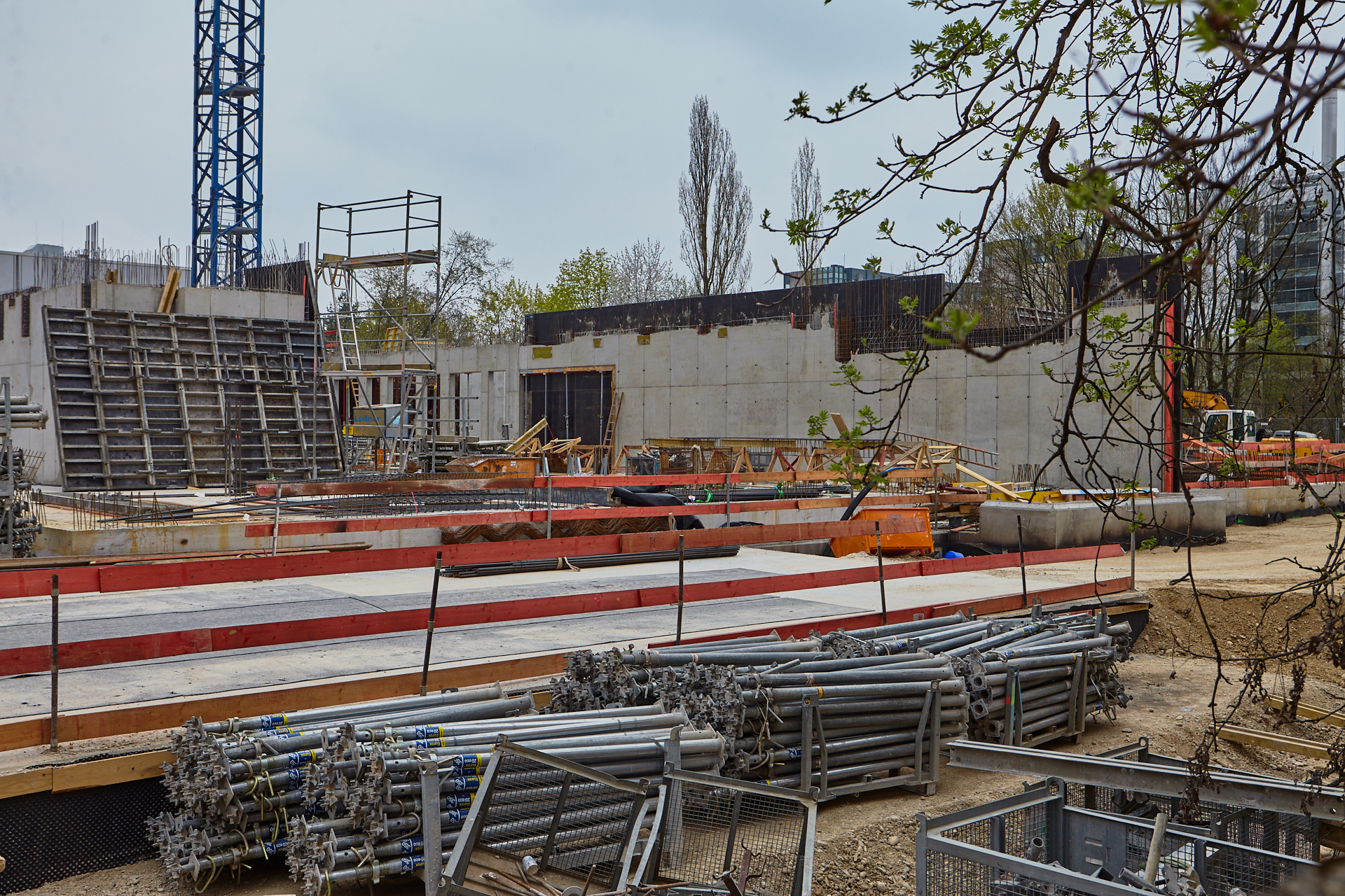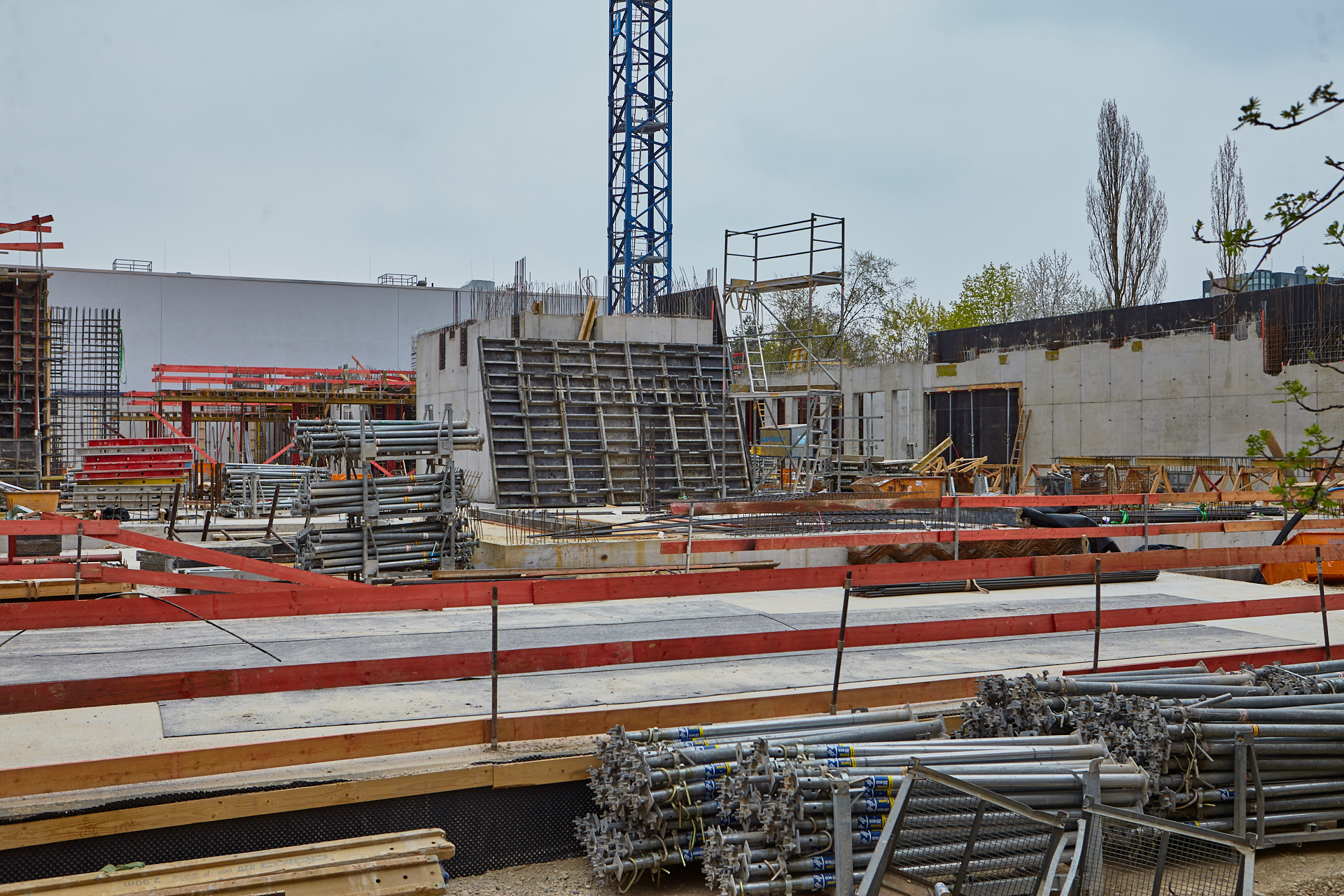 Der Keller und das Erdgeschoß des neuen LAO-Hauses werden gerade bearbeitet. Die Baustelle zum neuen LAO-HAUS, Leben am Ostpark, mit moderner Architektur und urbaner Gestaltung. Langsam wachsen die Wände am zukünftigen Wohn- und Geschäftsgebäude LAO-HAUS.