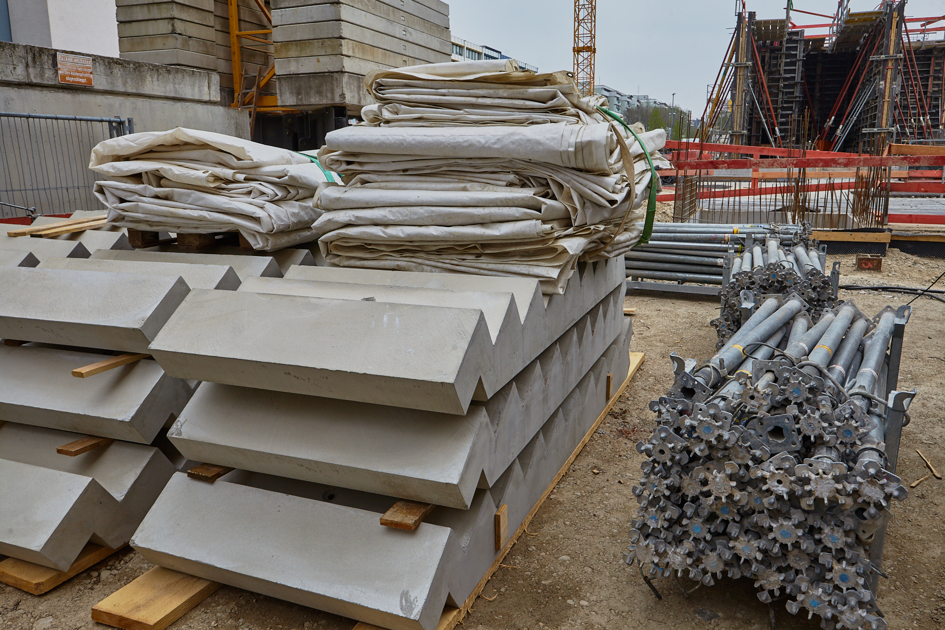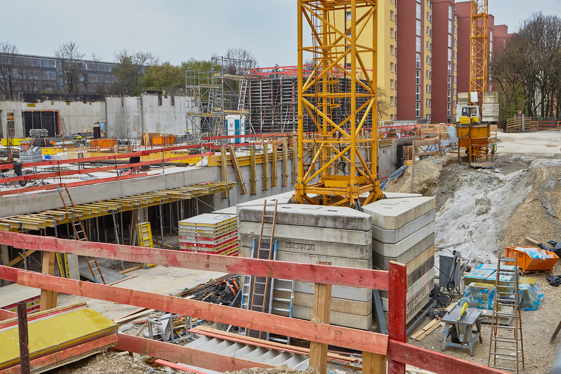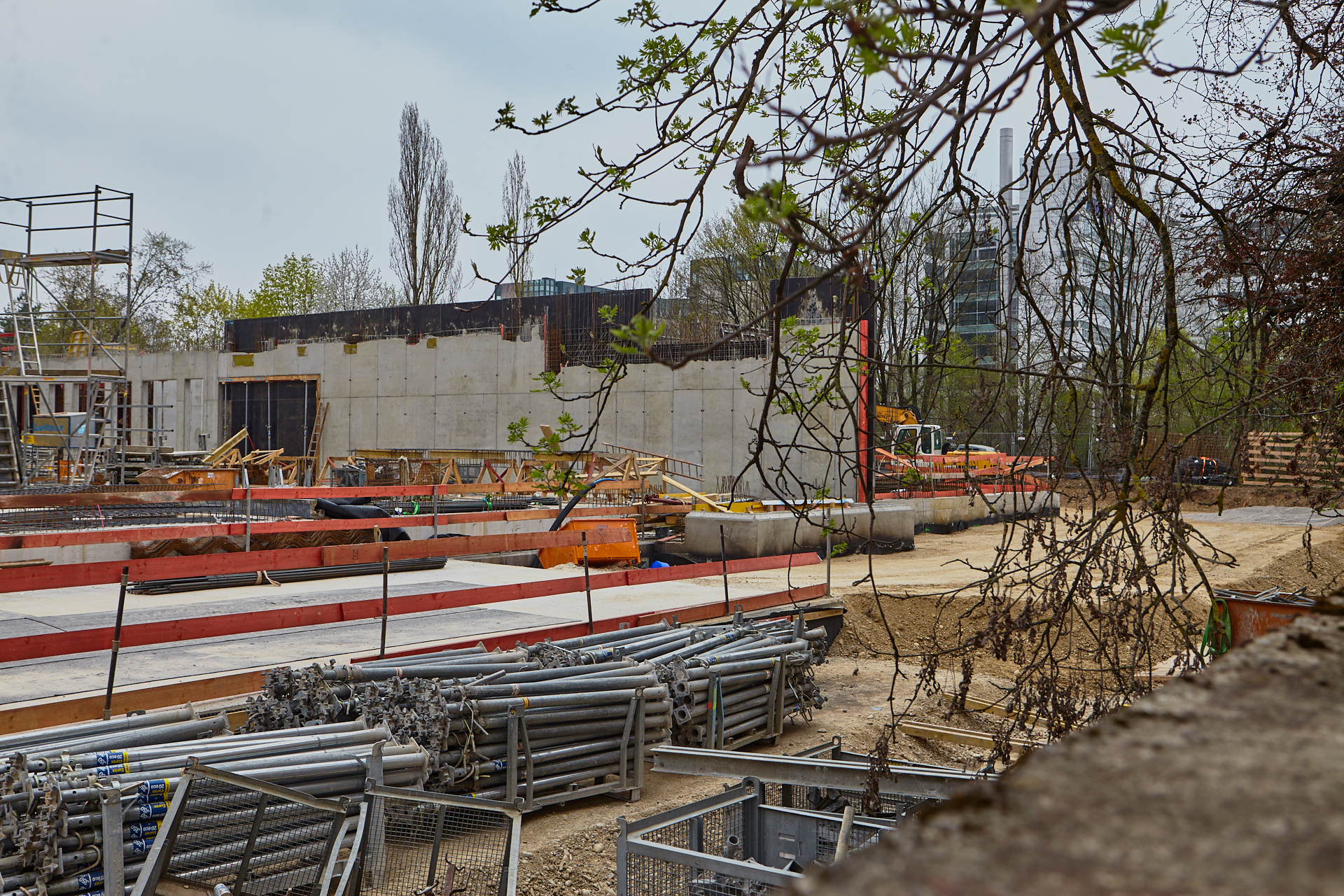 Der Keller und das Erdgeschoß des neuen LAO-Hauses werden gerade bearbeitet. Die Baustelle zum neuen LAO-HAUS, Leben am Ostpark, mit moderner Architektur und urbaner Gestaltung. Langsam wachsen die Wände am zukünftigen Wohn- und Geschäftsgebäude LAO-HAUS.