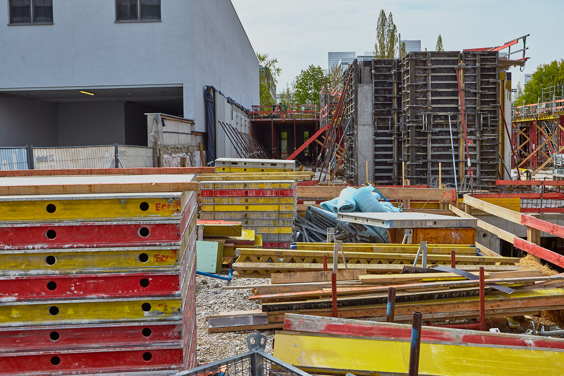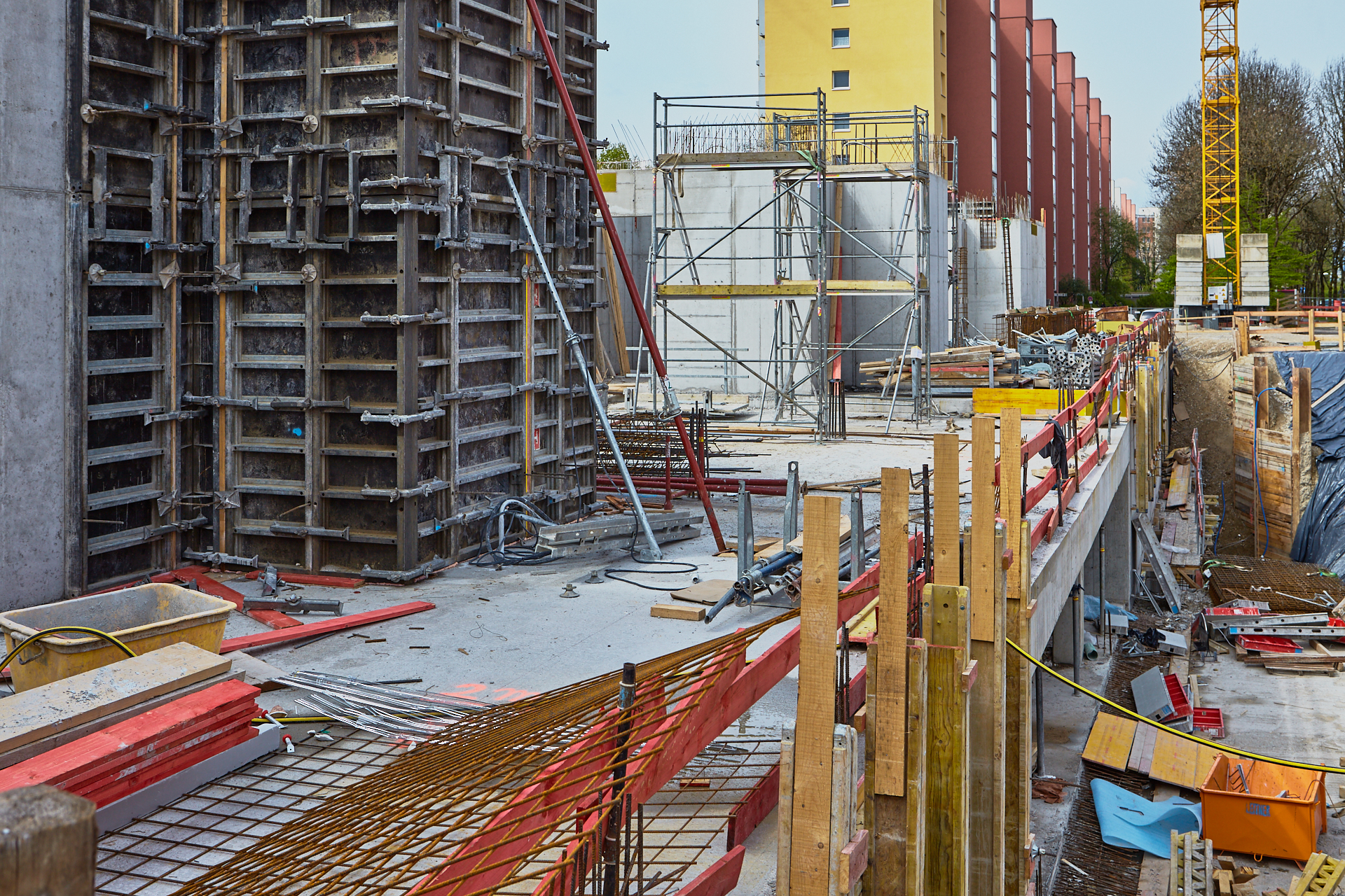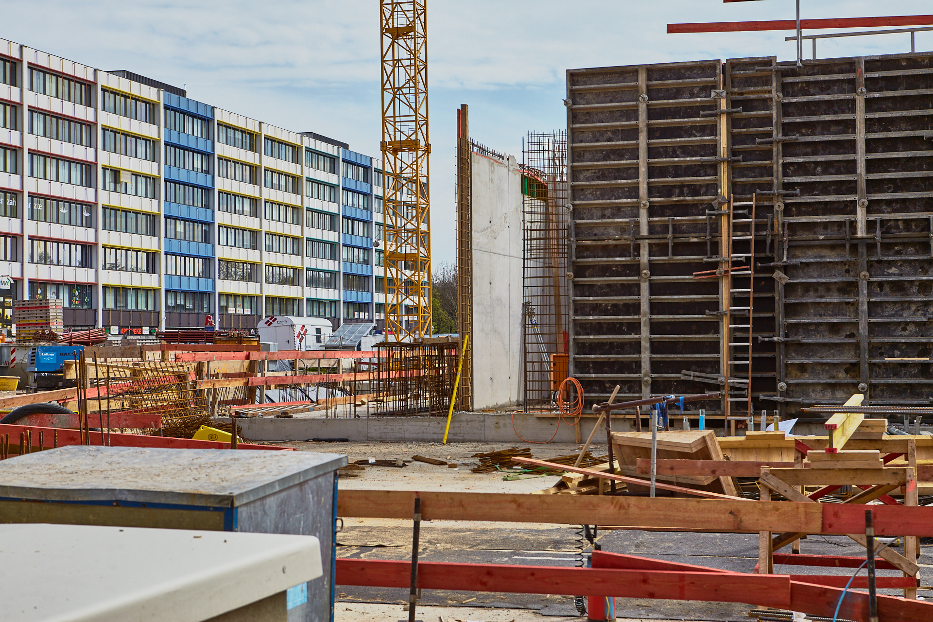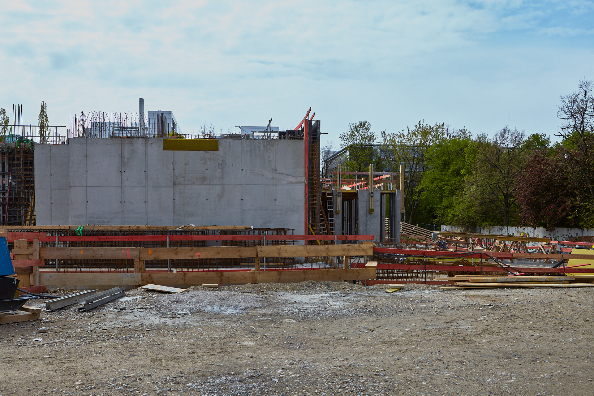 Der Keller und das Erdgeschoß des neuen LAO-Hauses werden gerade bearbeitet. Die Baustelle zum neuen LAO-HAUS, Leben am Ostpark, mit moderner Architektur und urbaner Gestaltung. Langsam wachsen die Wände am zukünftigen Wohn- und Geschäftsgebäude LAO-HAUS.