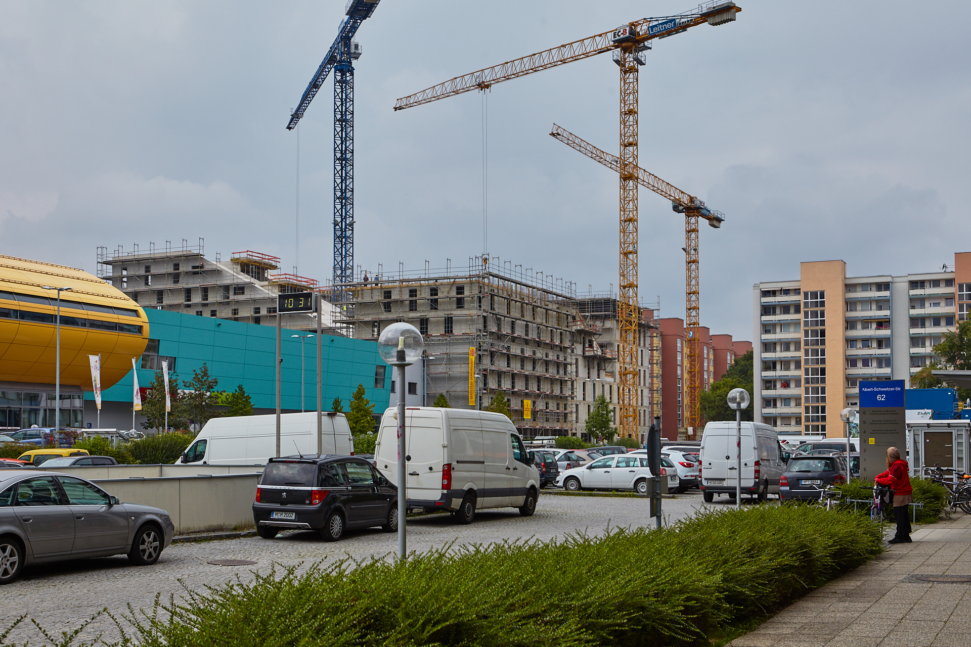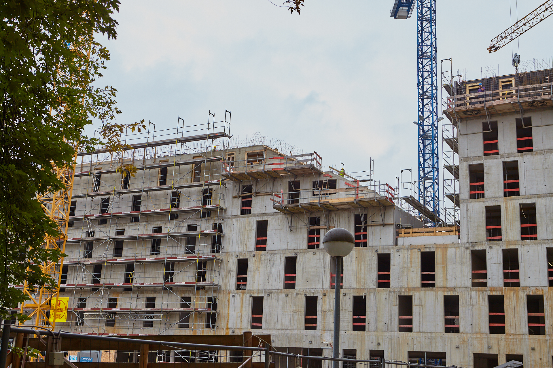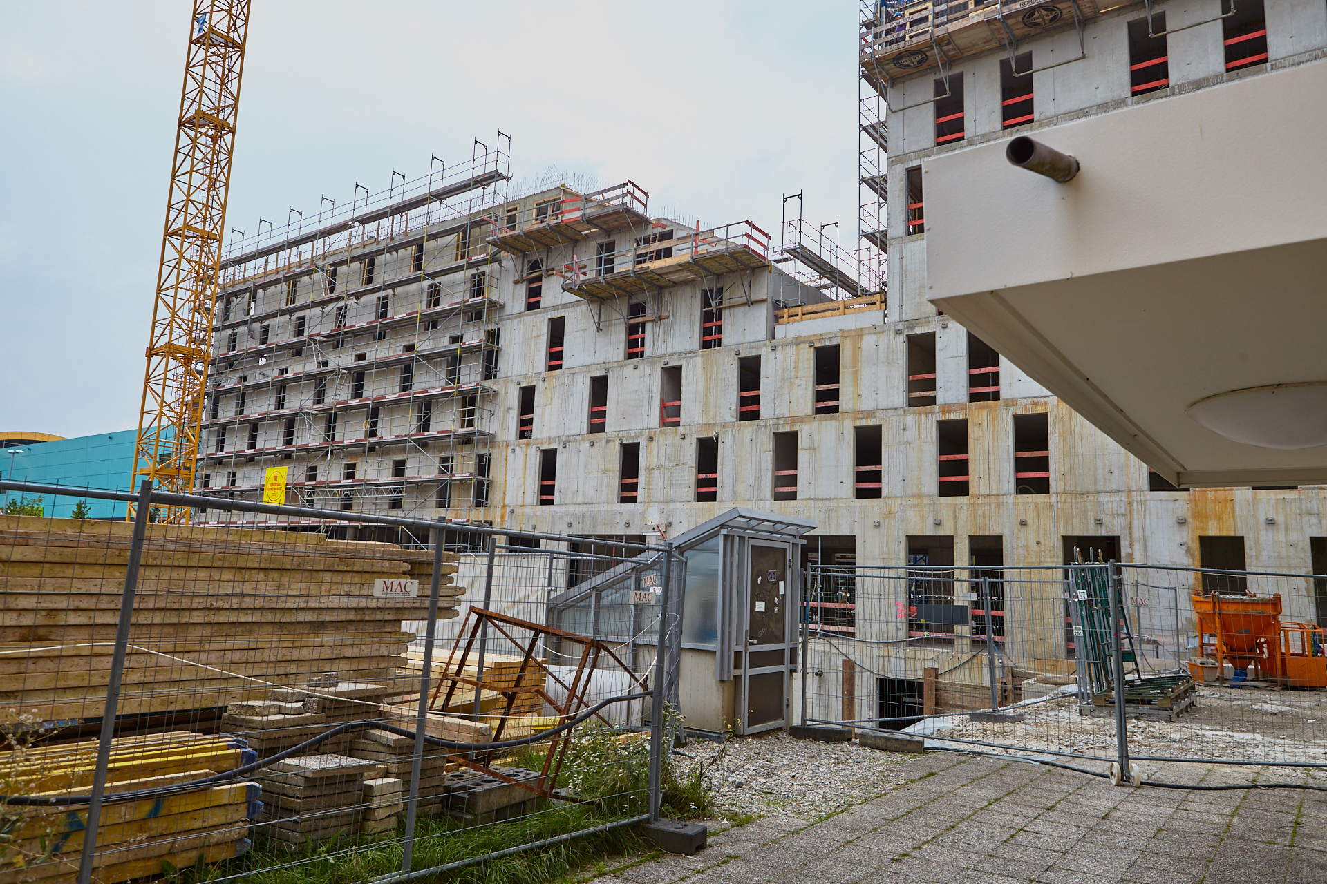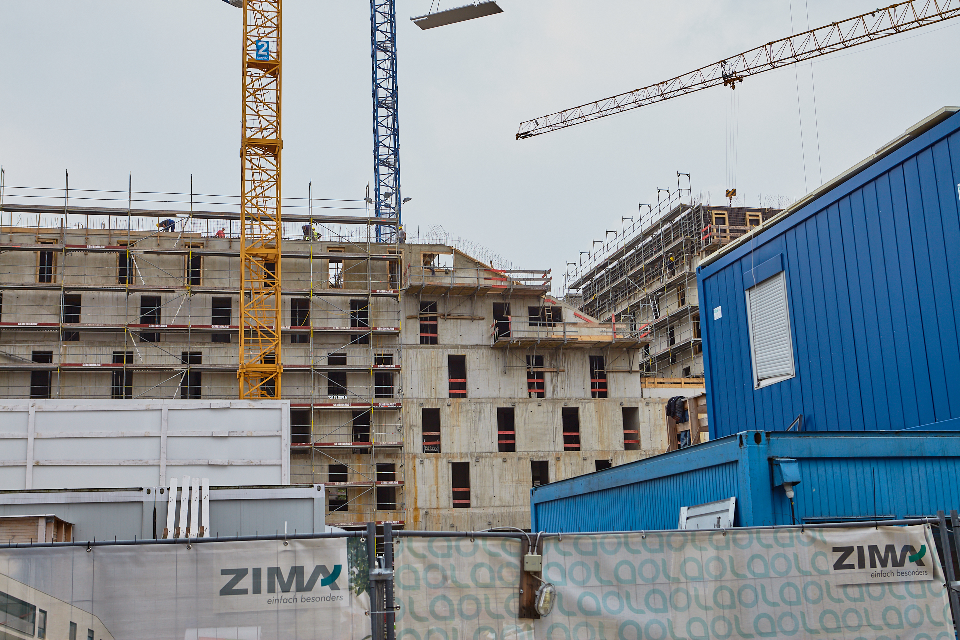 Der Rohbau an einigen der vier "Türmen" ist noch nicht abgeschlossen. Hier gehen die BAuarbeiten weiter. Die Bausetelle LAO-HAUS zeigt immer mehr, wie das fertige Gebäude aussehen wird.