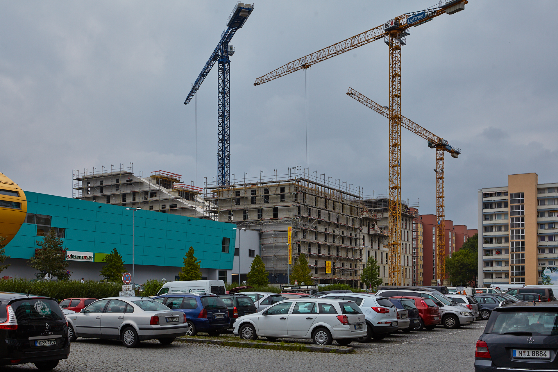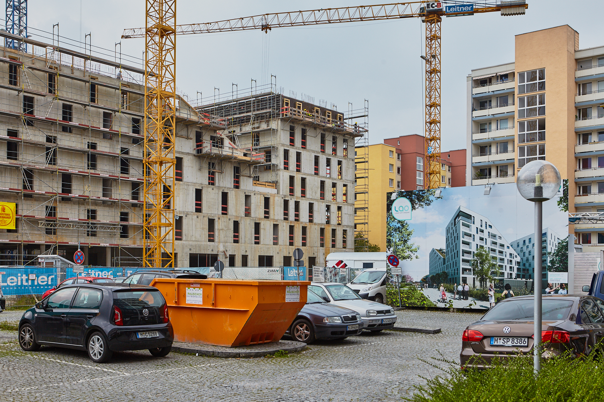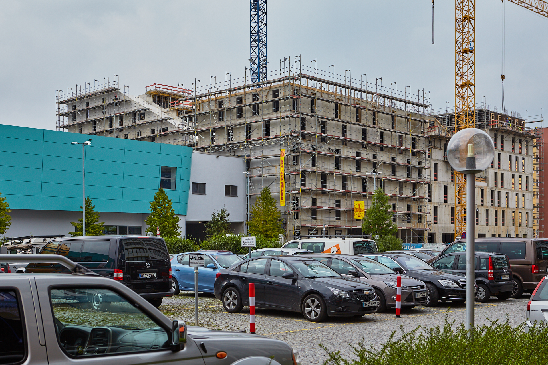 Der Rohbau an einigen der vier "Türmen" ist noch nicht abgeschlossen. Hier gehen die BAuarbeiten weiter. Die Bausetelle LAO-HAUS zeigt immer mehr, wie das fertige Gebäude aussehen wird.