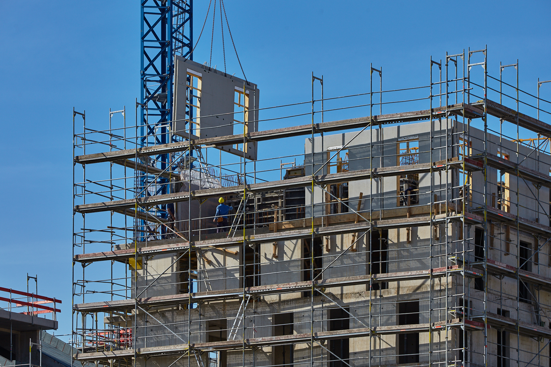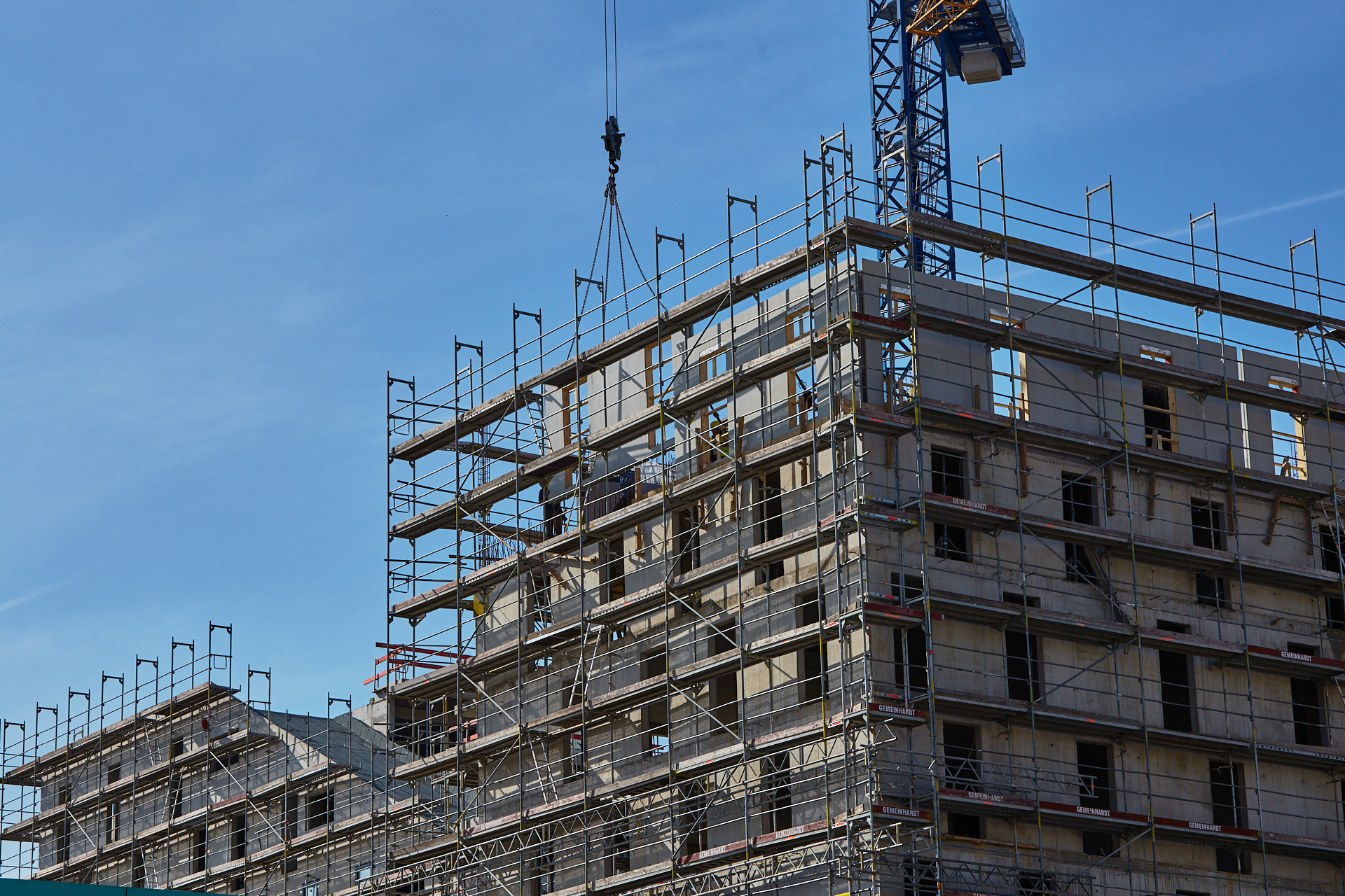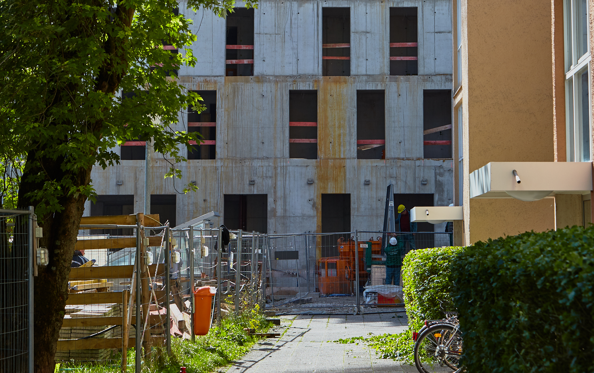 Der Rohbau an einigen der vier "Türmen" ist noch nicht abgeschlossen. Hier gehen die BAuarbeiten weiter. Die Bausetelle LAO-HAUS zeigt immer mehr, wie das fertige Gebäude aussehen wird.