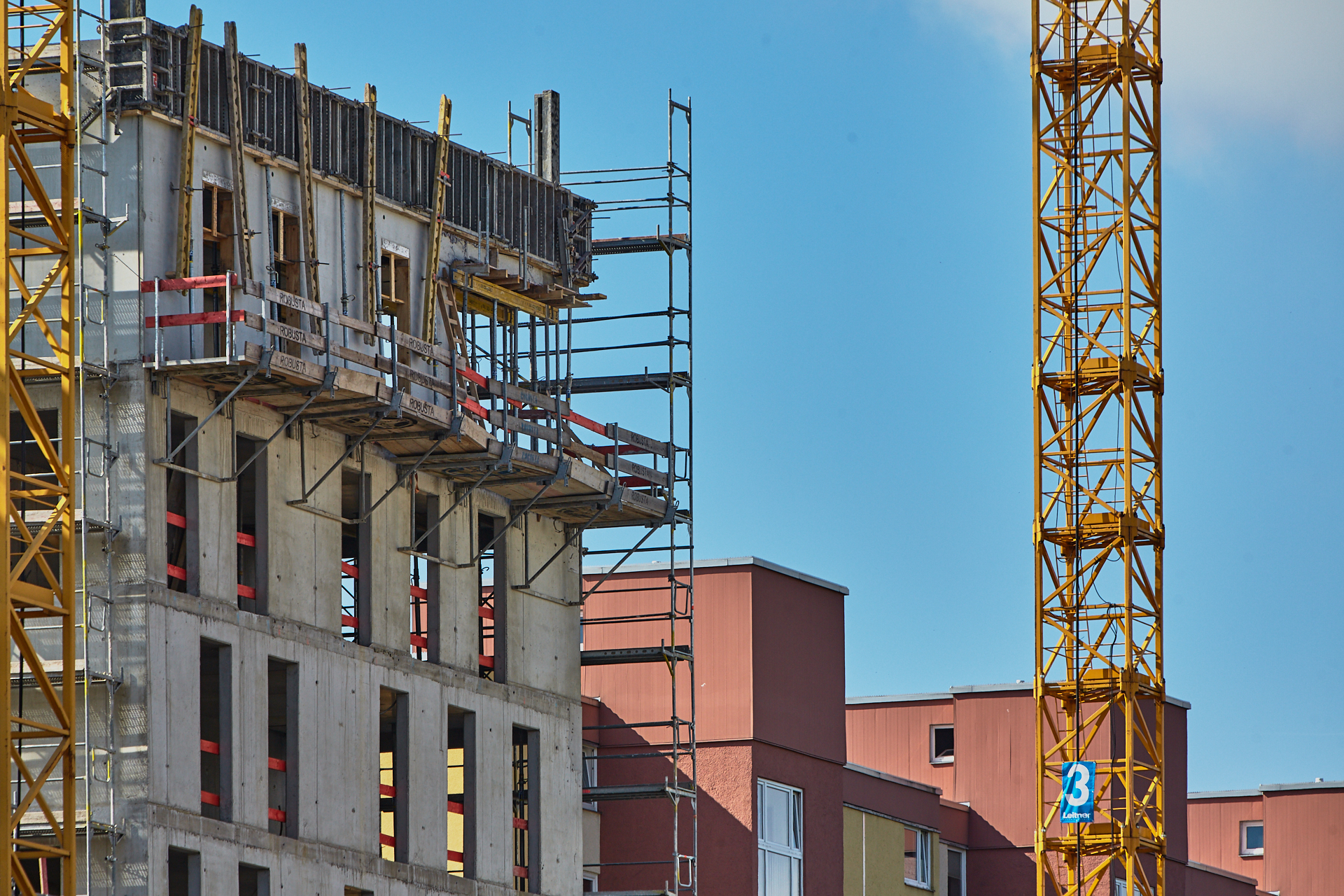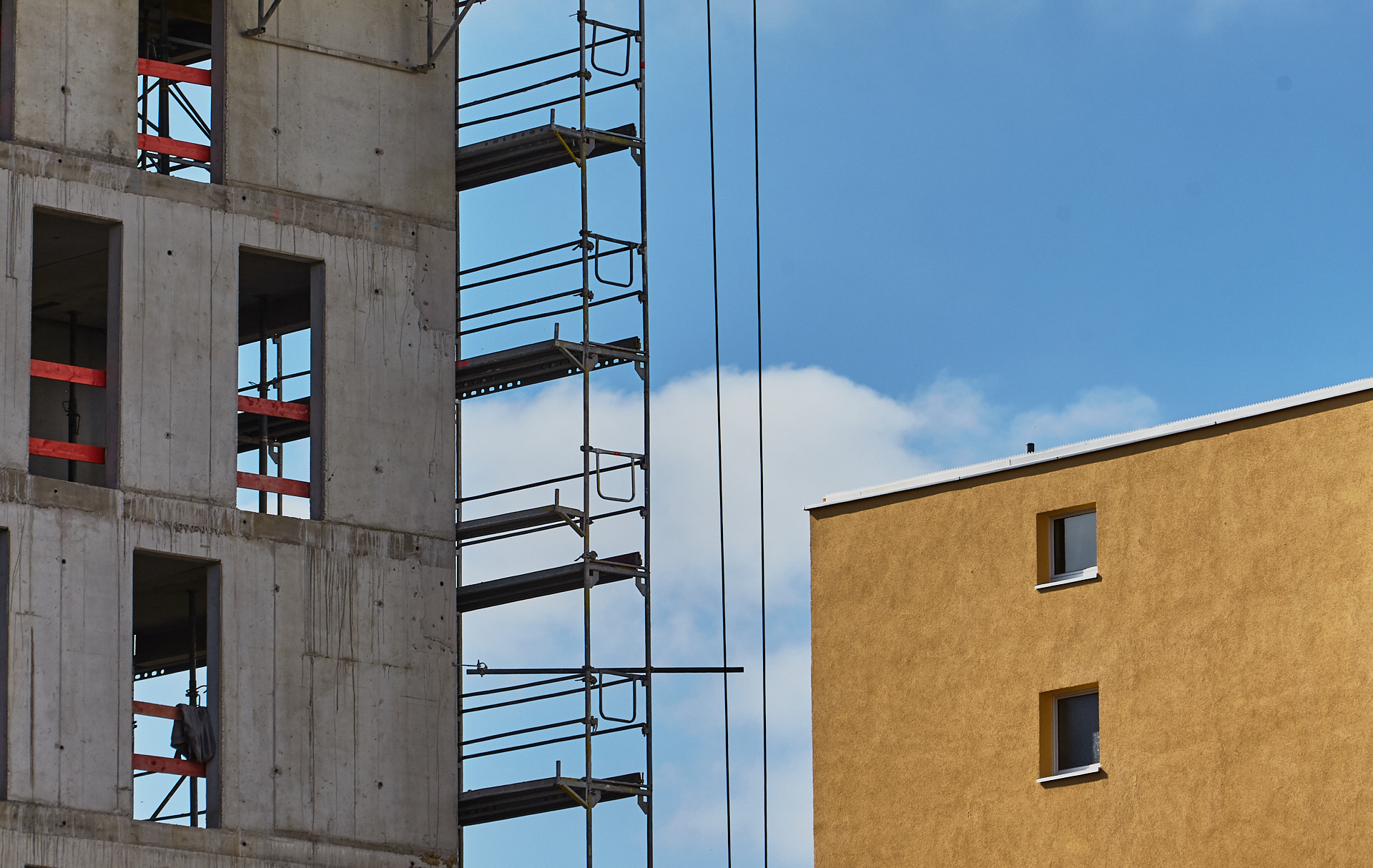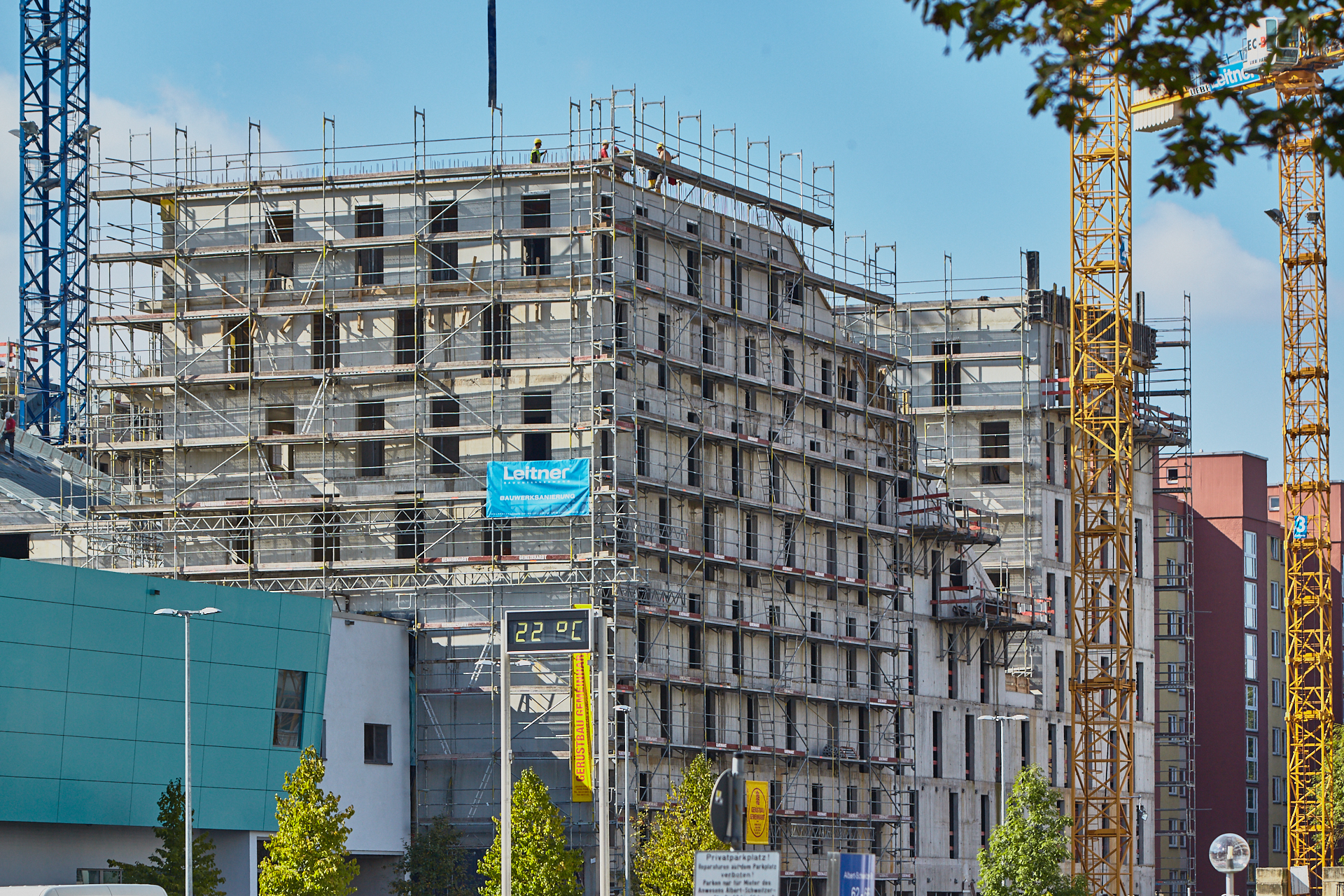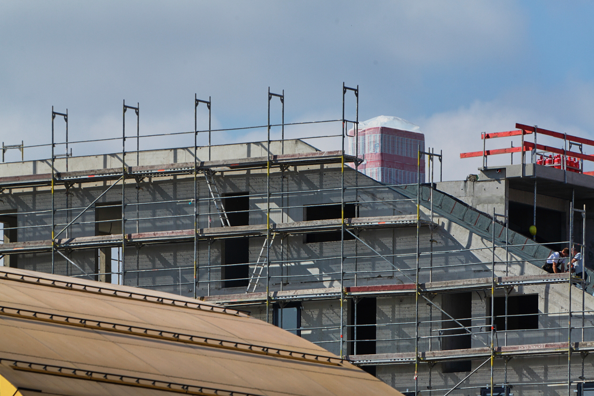 Teilweise ist die Baustelle am LAO-Haus mit einem Gerüst ummantelt. Die anderen Teile sind noch im Rohbau.