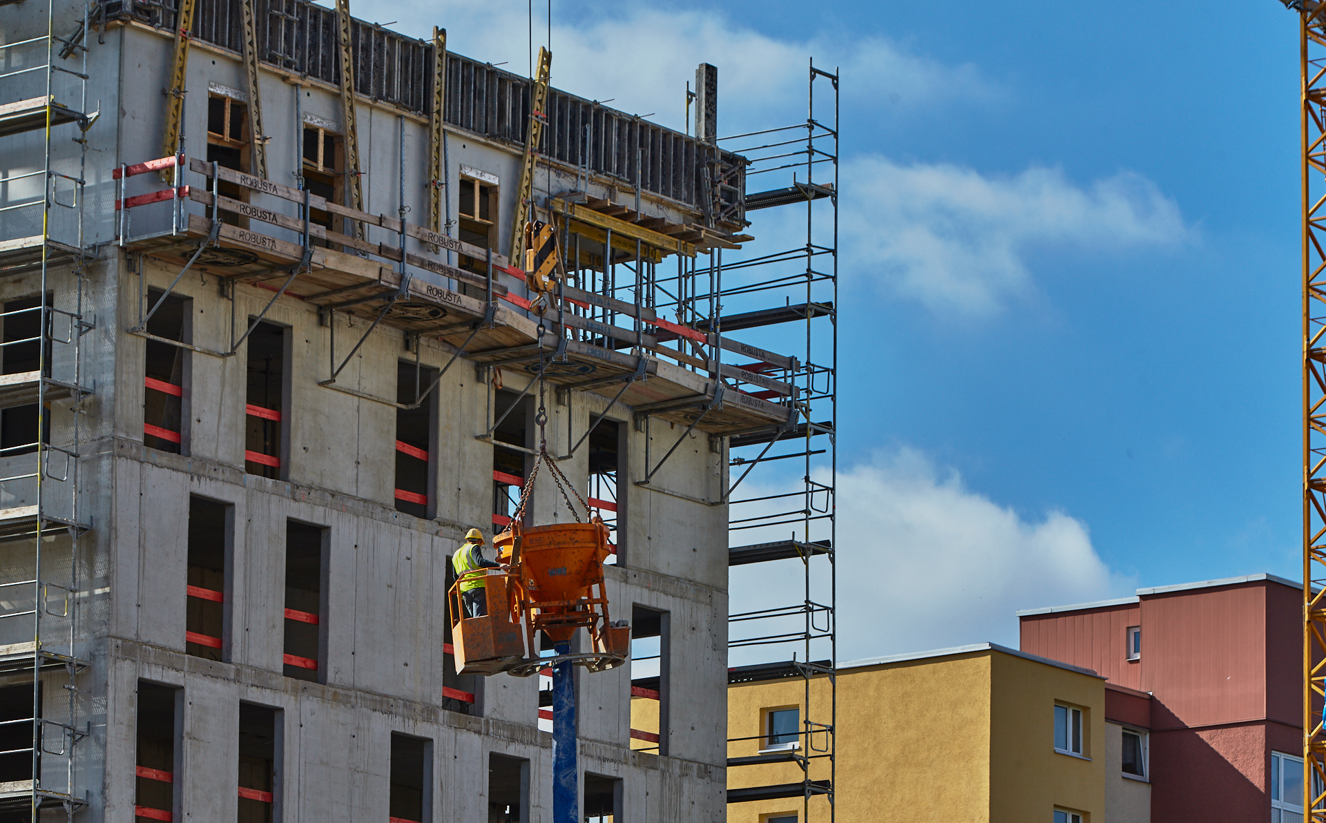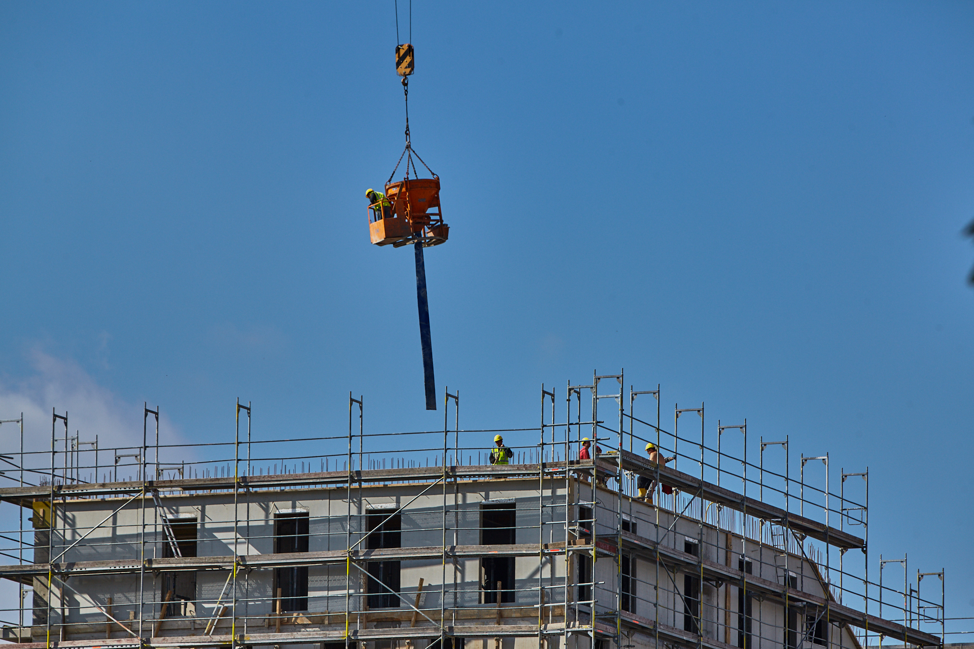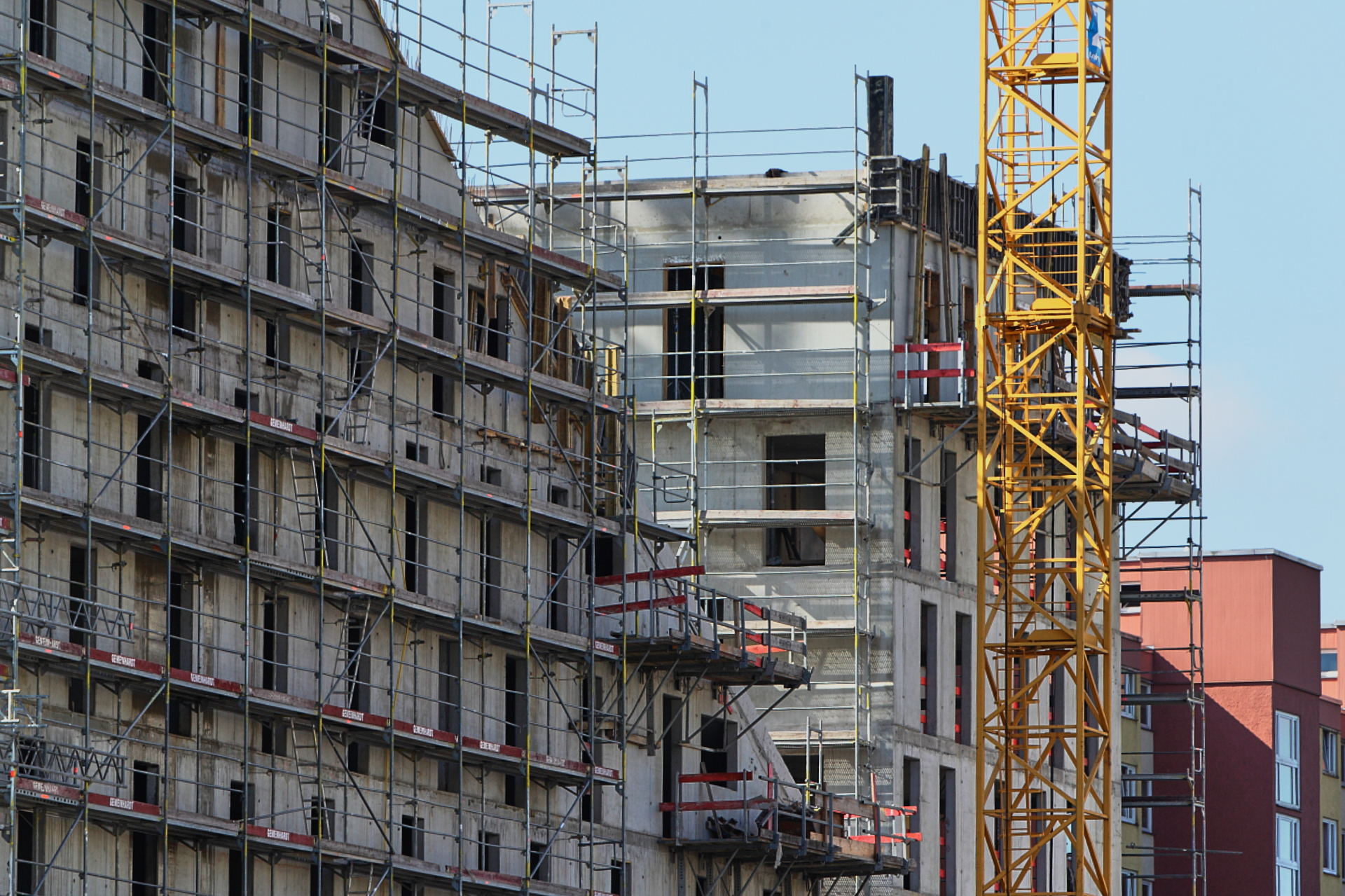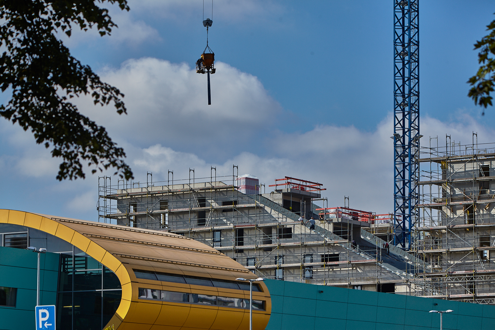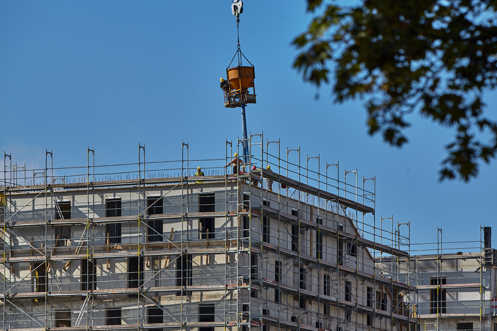 Teilweise ist die Baustelle am LAO-Haus mit einem Gerüst ummantelt. Die anderen Teile sind noch im Rohbau.