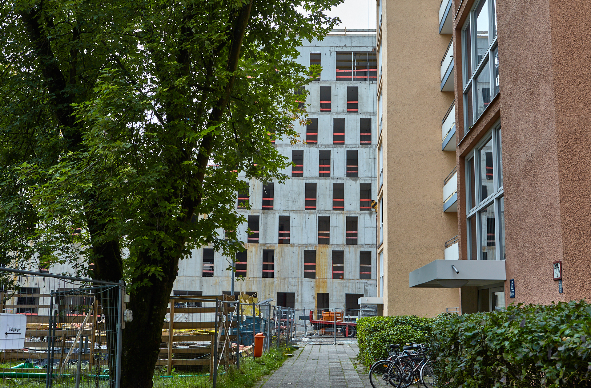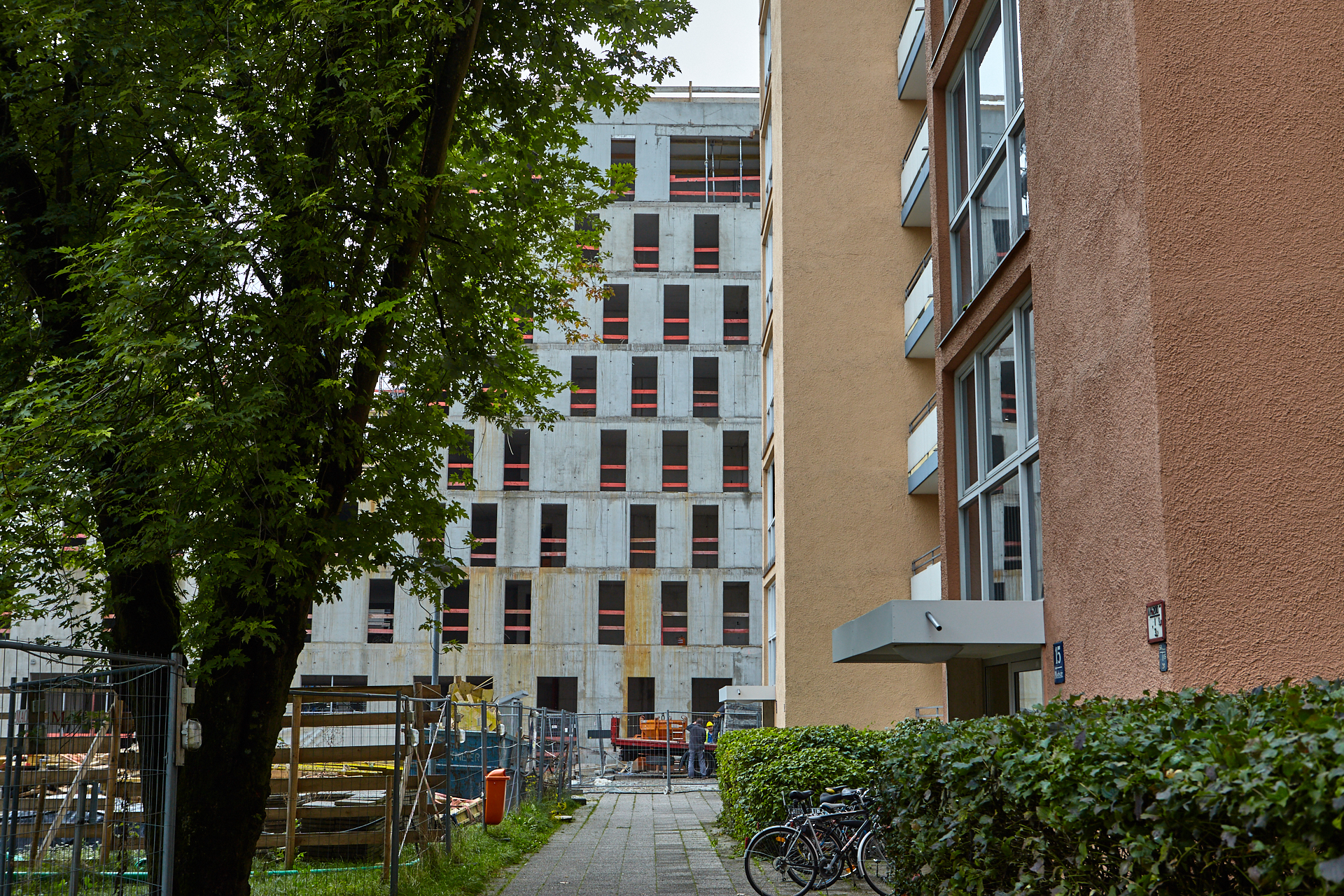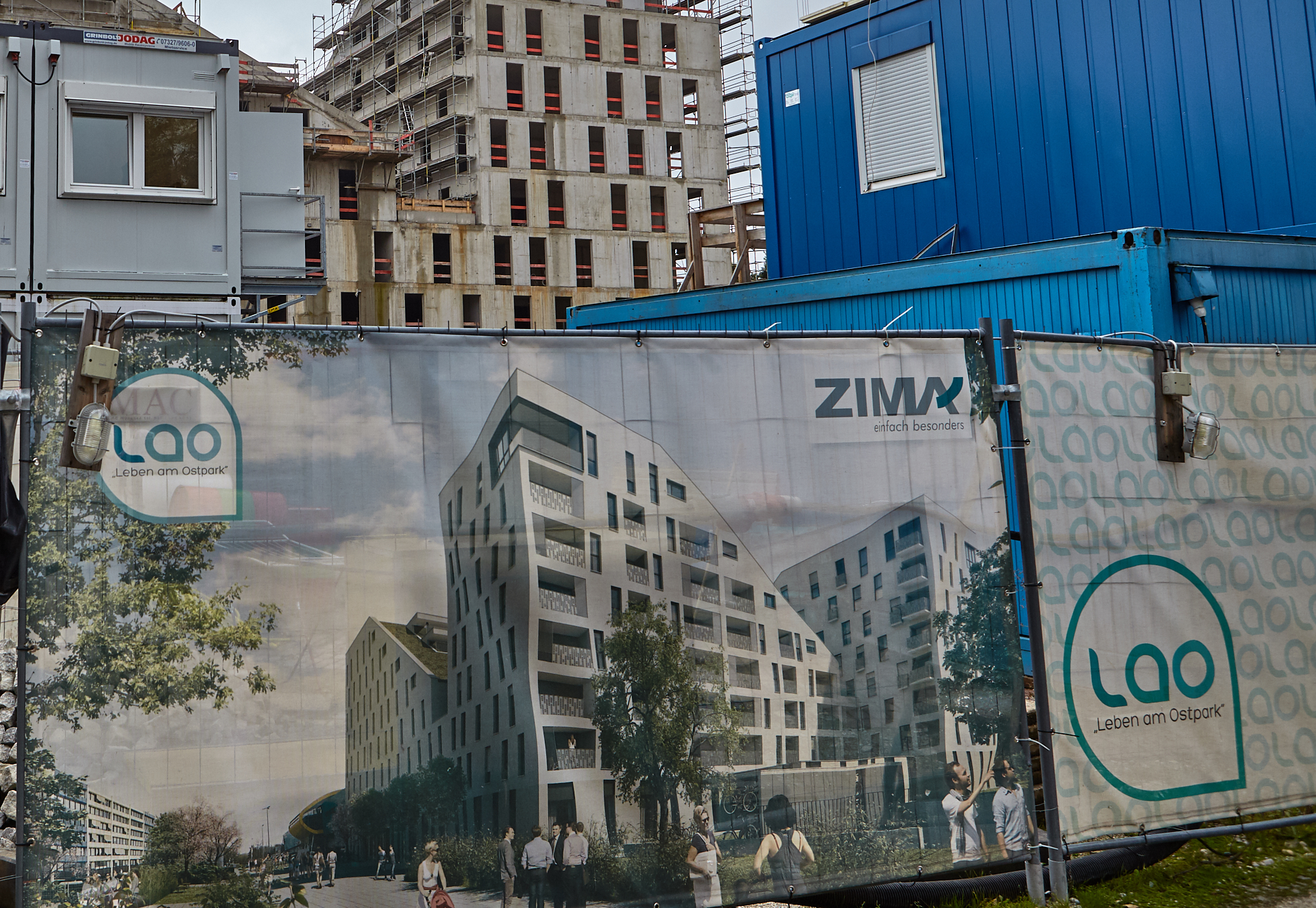 Teilweise ist die Baustelle am LAO-Haus mit einem Gerüst ummantelt. Die anderen Teile sind noch im Rohbau. Die Bauarbeiten gehen auf volle Touren weiter