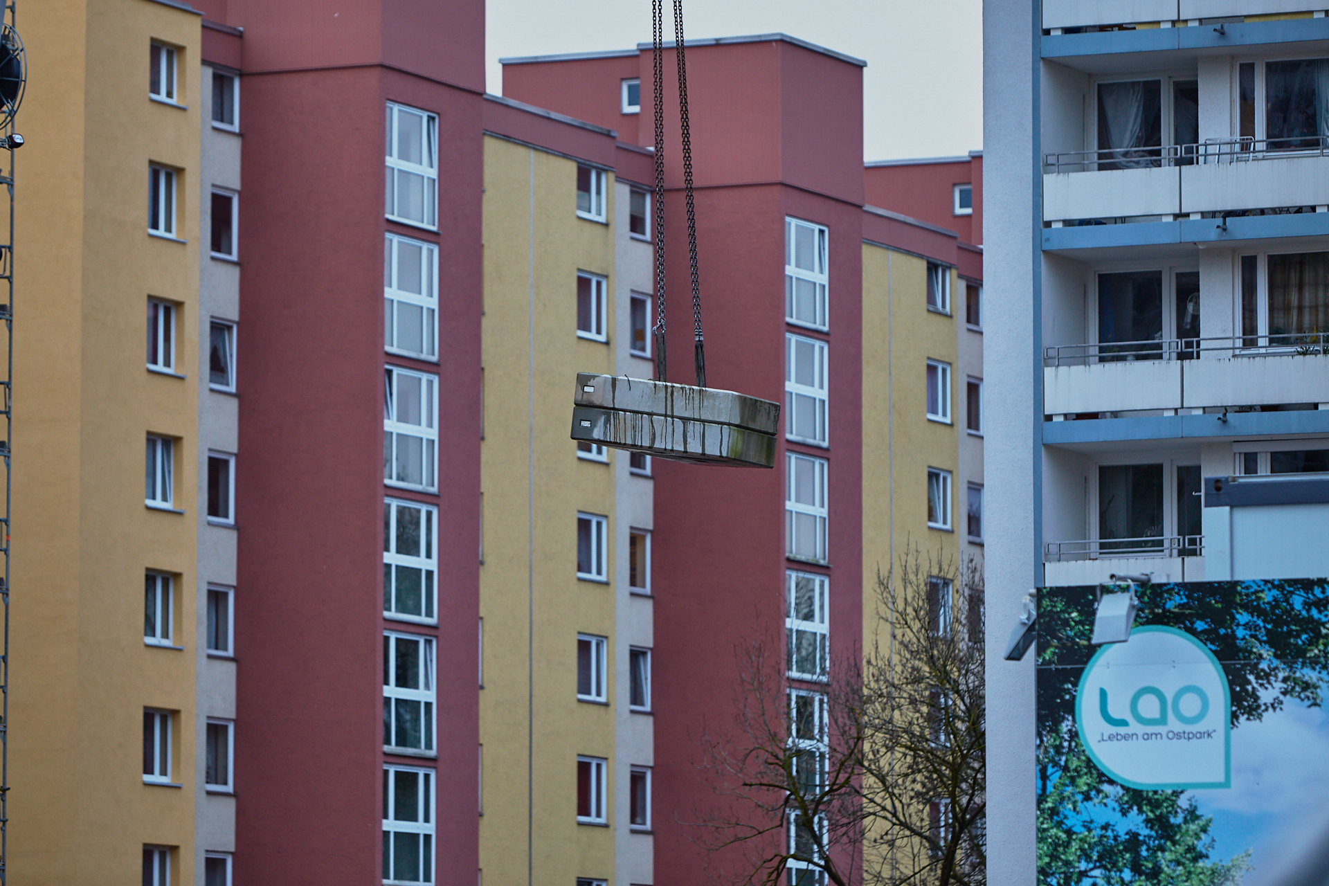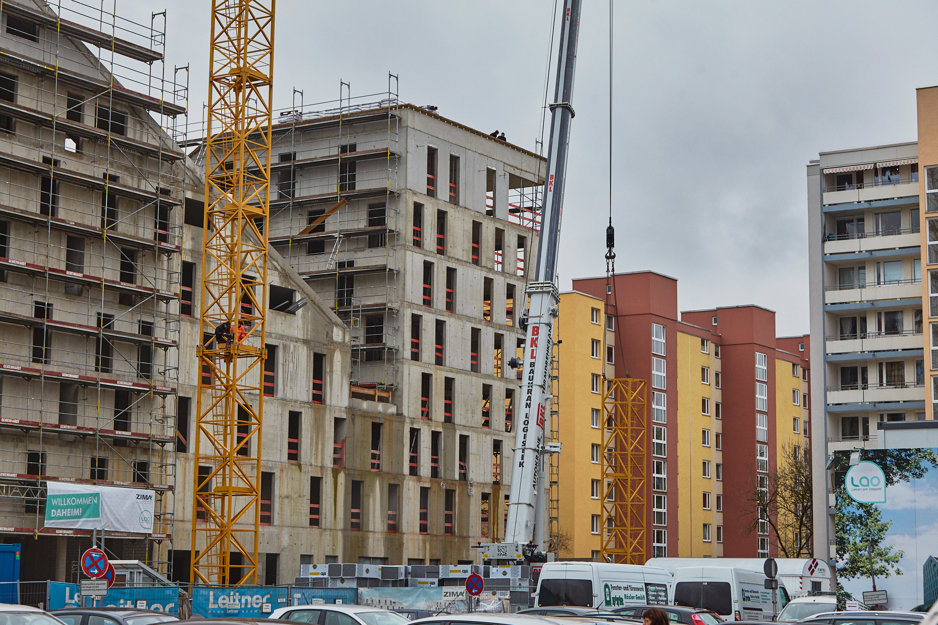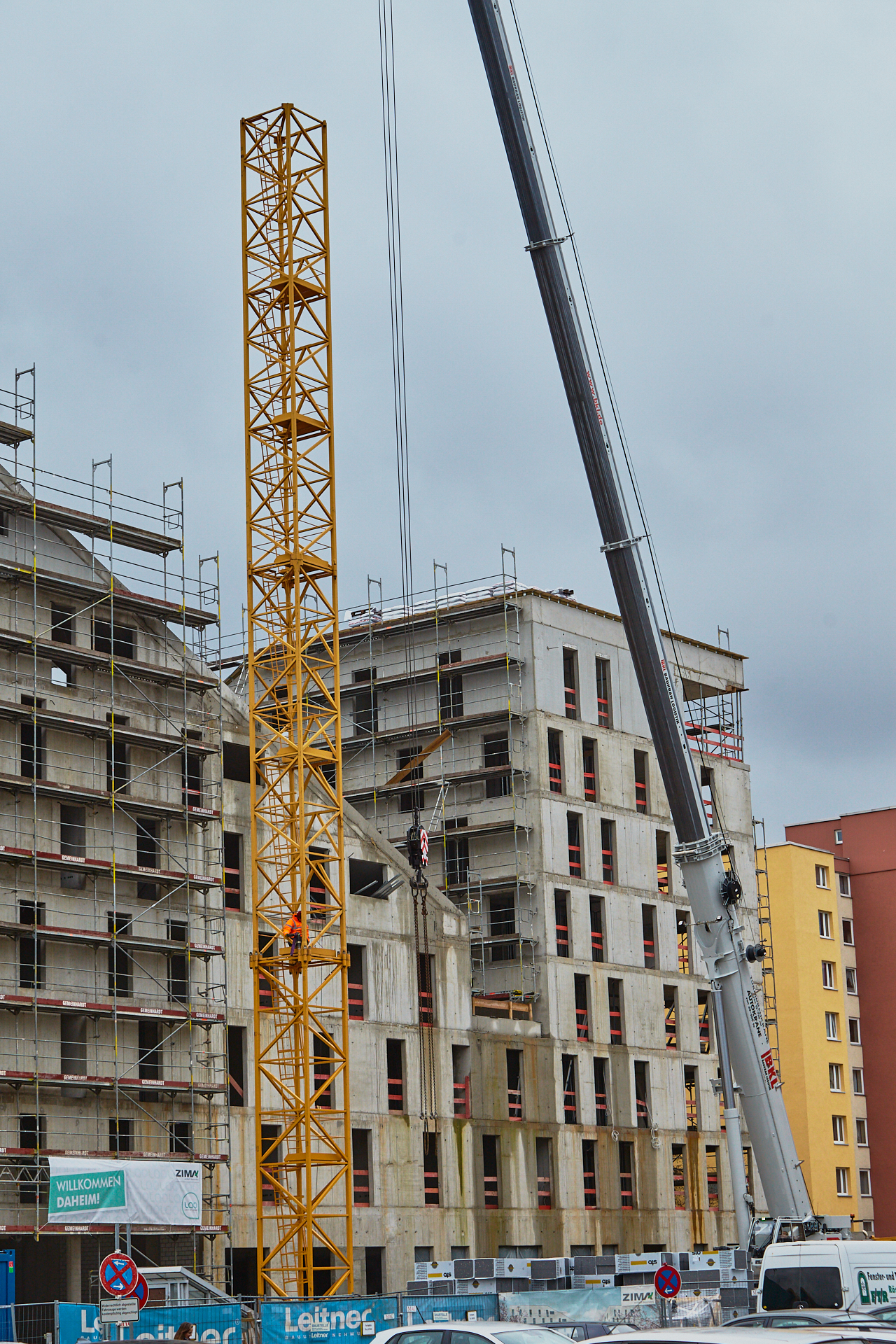 Heute wird der zweite Kran an der Baustelle LAO-HAUS abgebaut. Ein Zeichen, dass eine Bauphase zu Ende geht. Die Baustelle am LAO-Haus ist immer noch mit einem Gerüst ummantelt. Die Außenwände werden mit dicken Isoliermatten gegen Kälte gedämmt. Die Bauarbeiten gehen auf volle Touren weiter