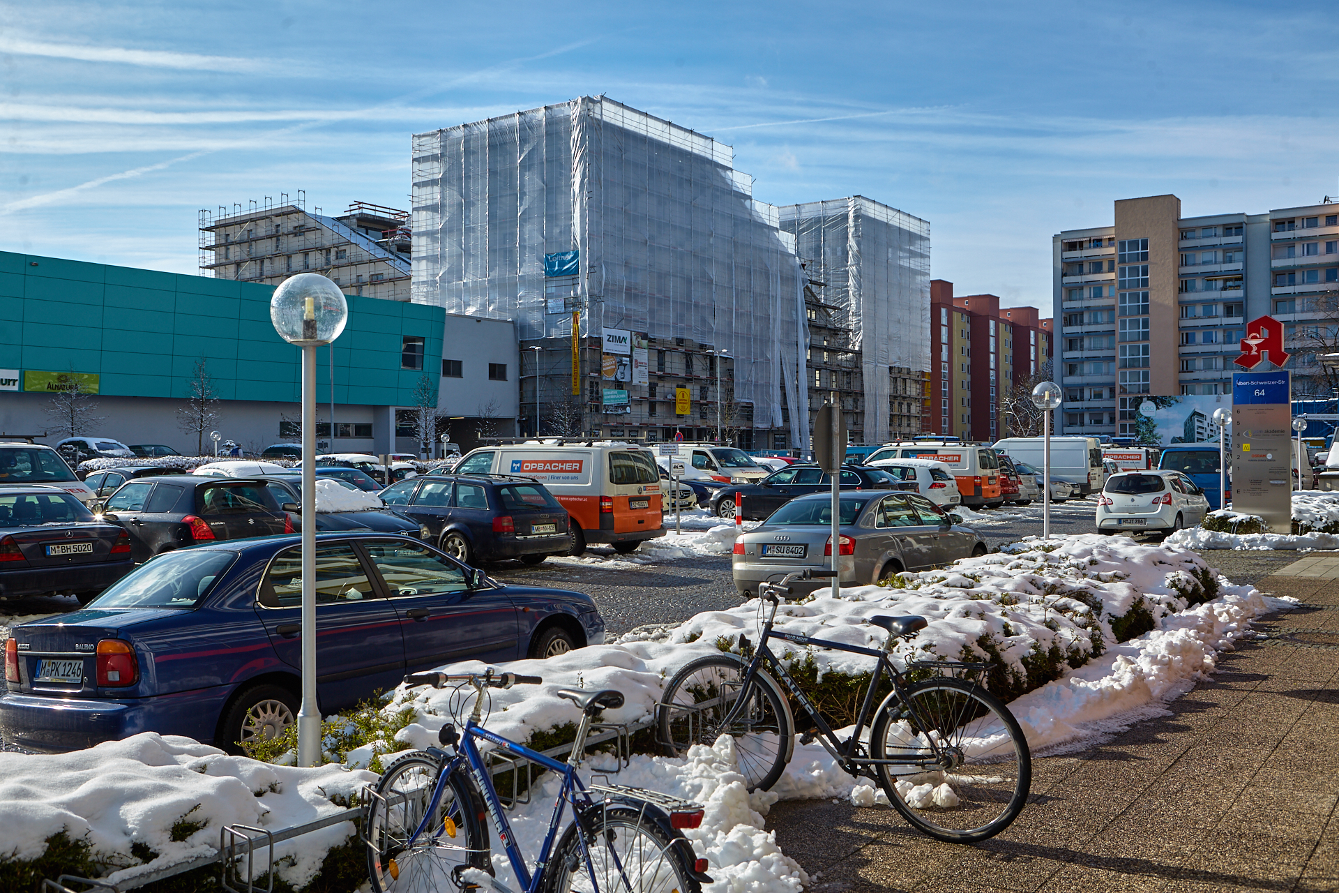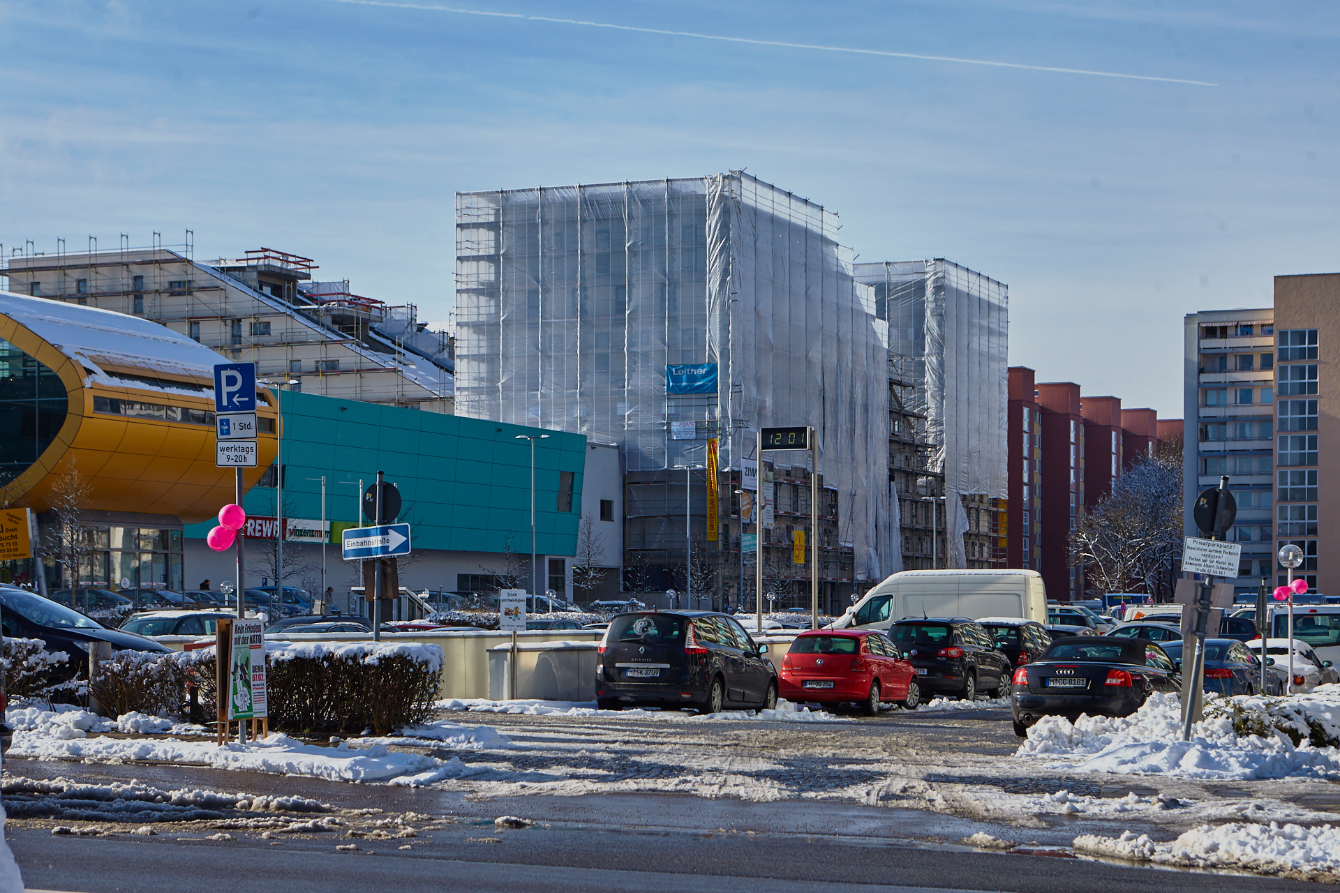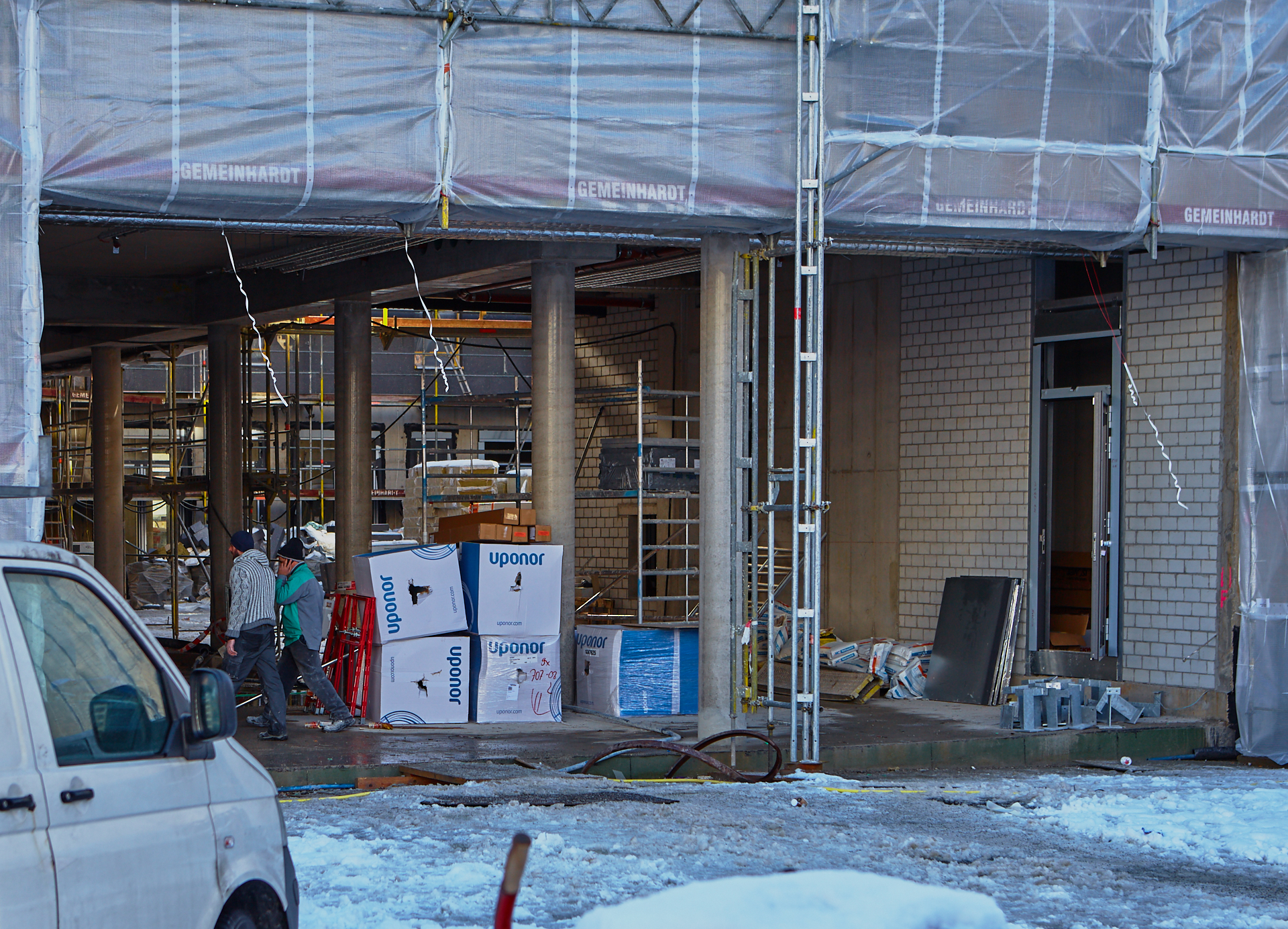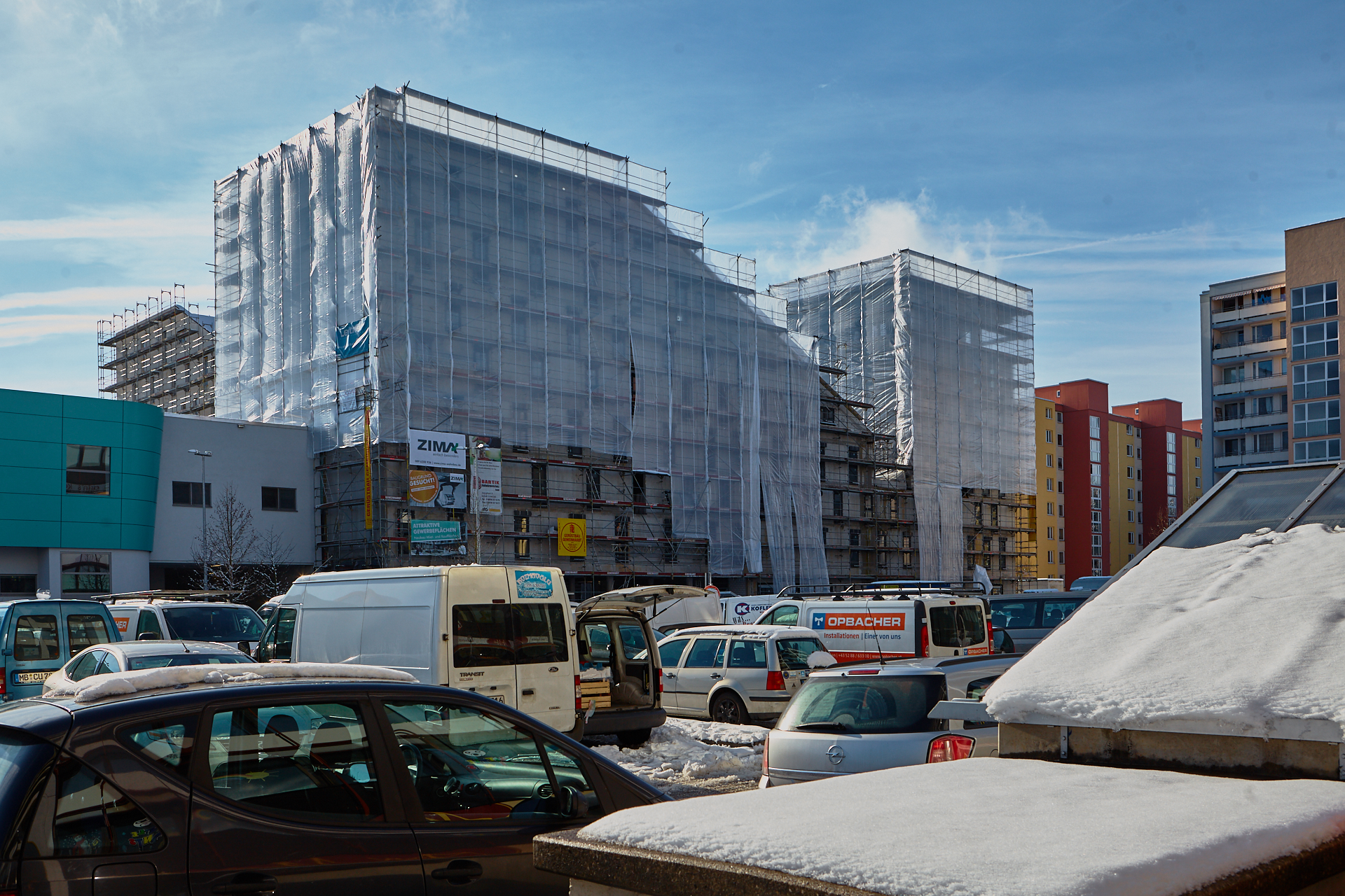 Die Baustelle am LAO-Haus ist immer noch mit Planen verhüllt. Hinter der Plan und im Inneren gehen die Arbeiten zugig voran. Die Bauarbeiten gehen auf volle Touren weiter