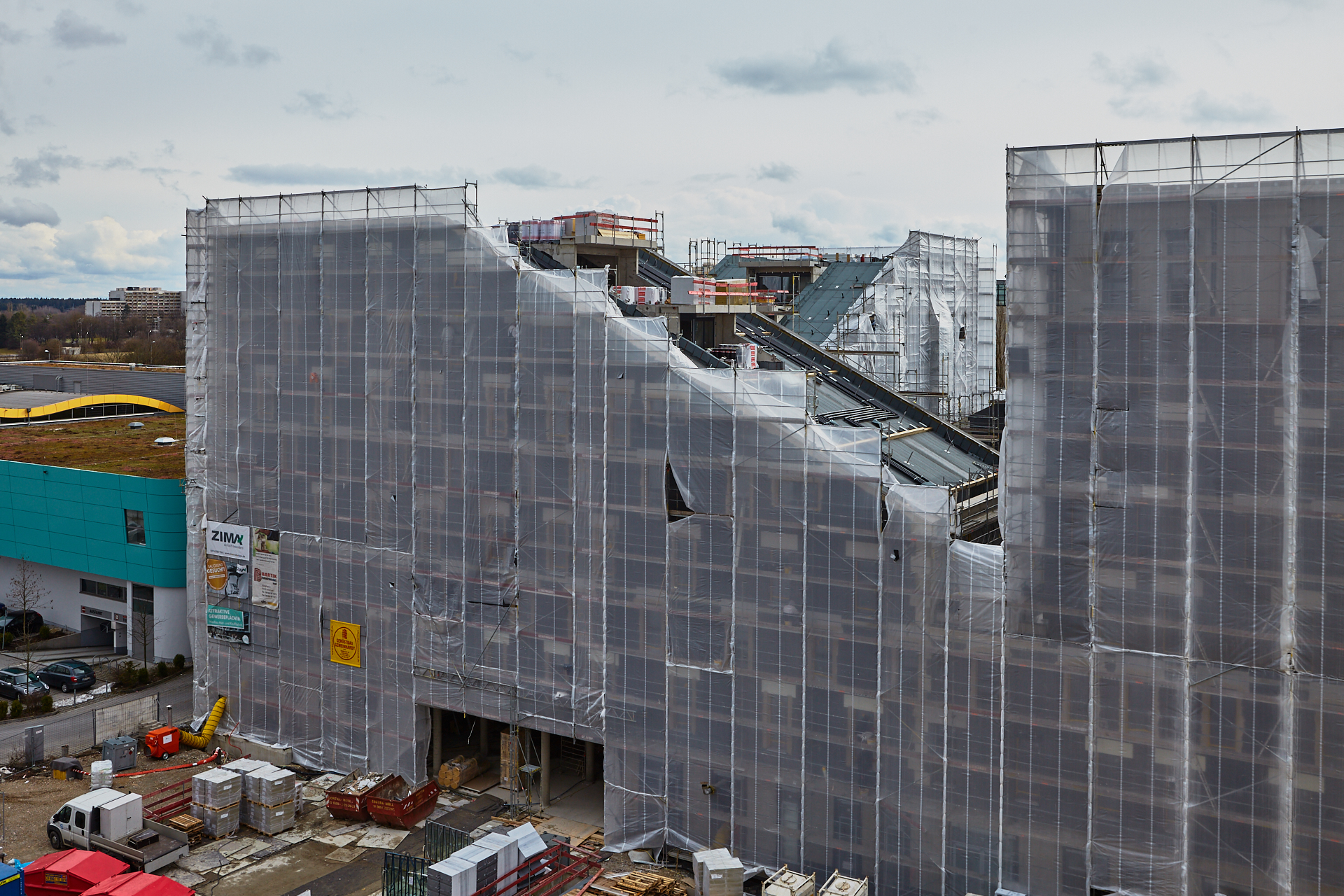 Die Baustelle am LAO-Haus ist immer noch mit Planen verhüllt. Hinter der Plan und im Inneren gehen die Arbeiten zugig voran. Vom Nachbarhaus aus, sieht man deutlich, wie die vier "Türme" des LAO-Hauses zuenenander stehen.,