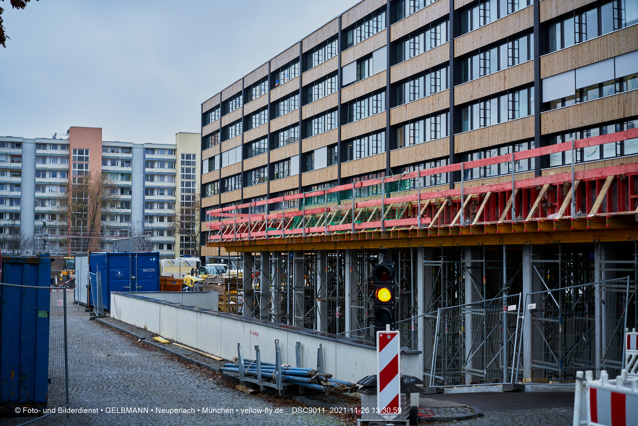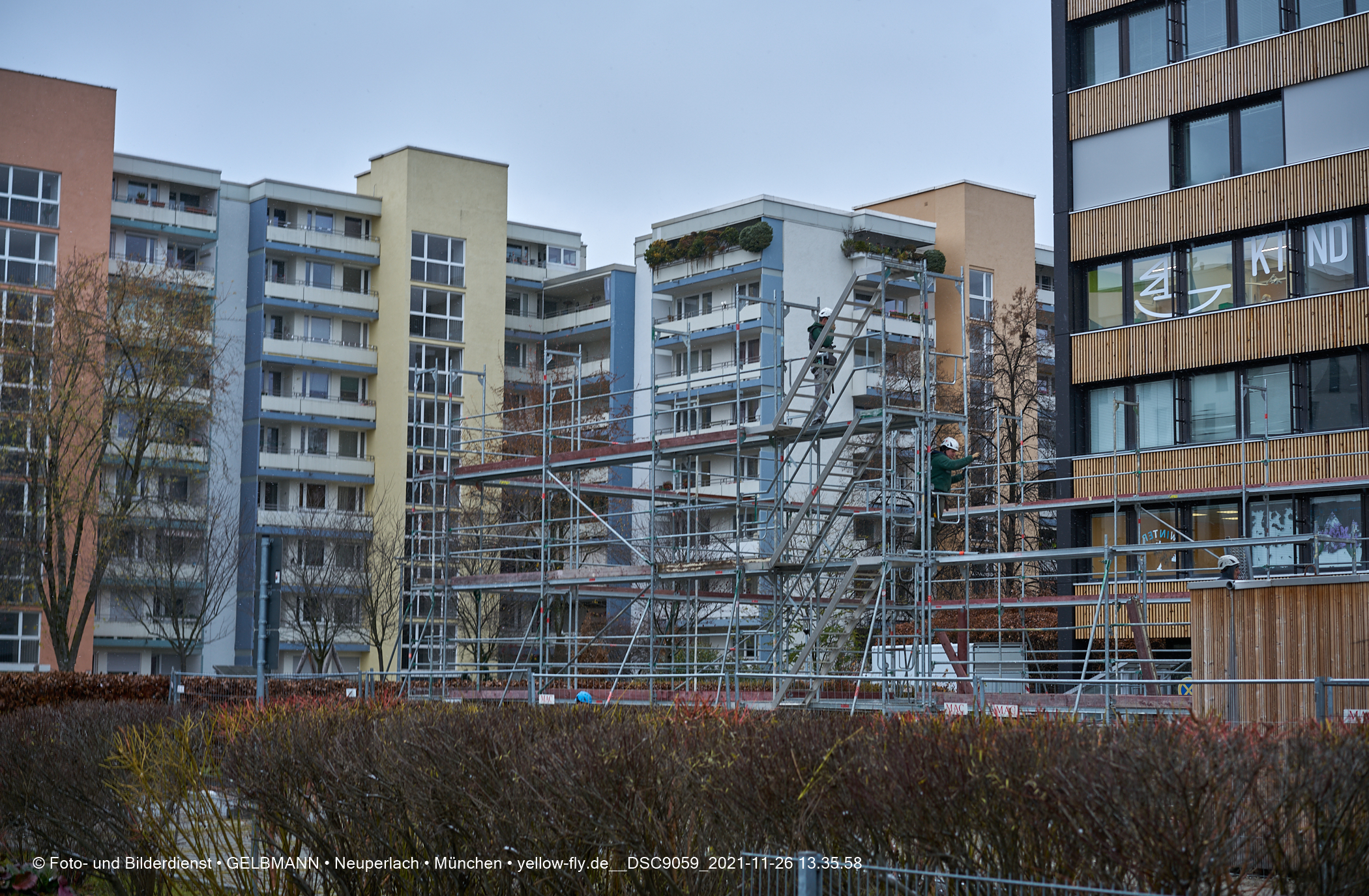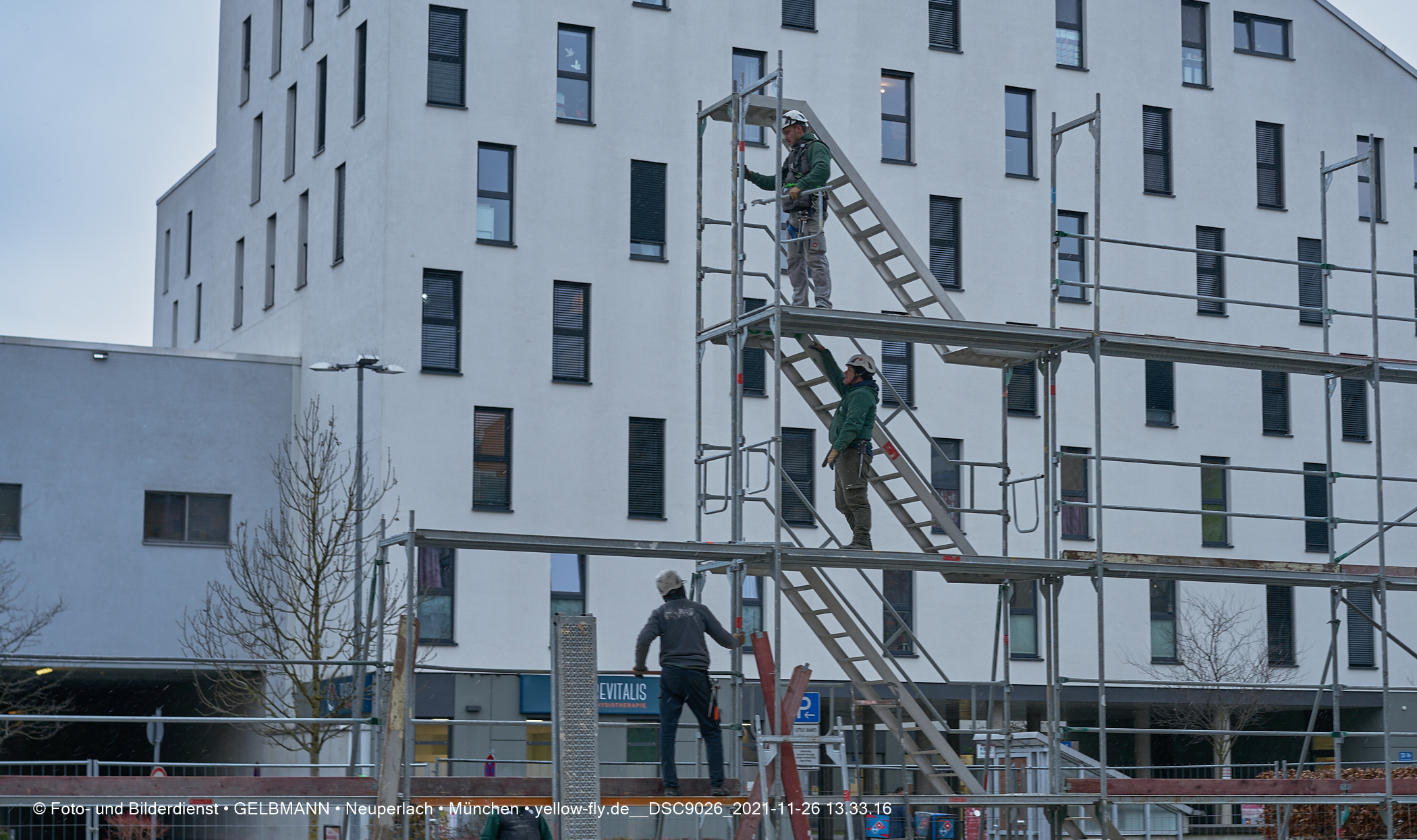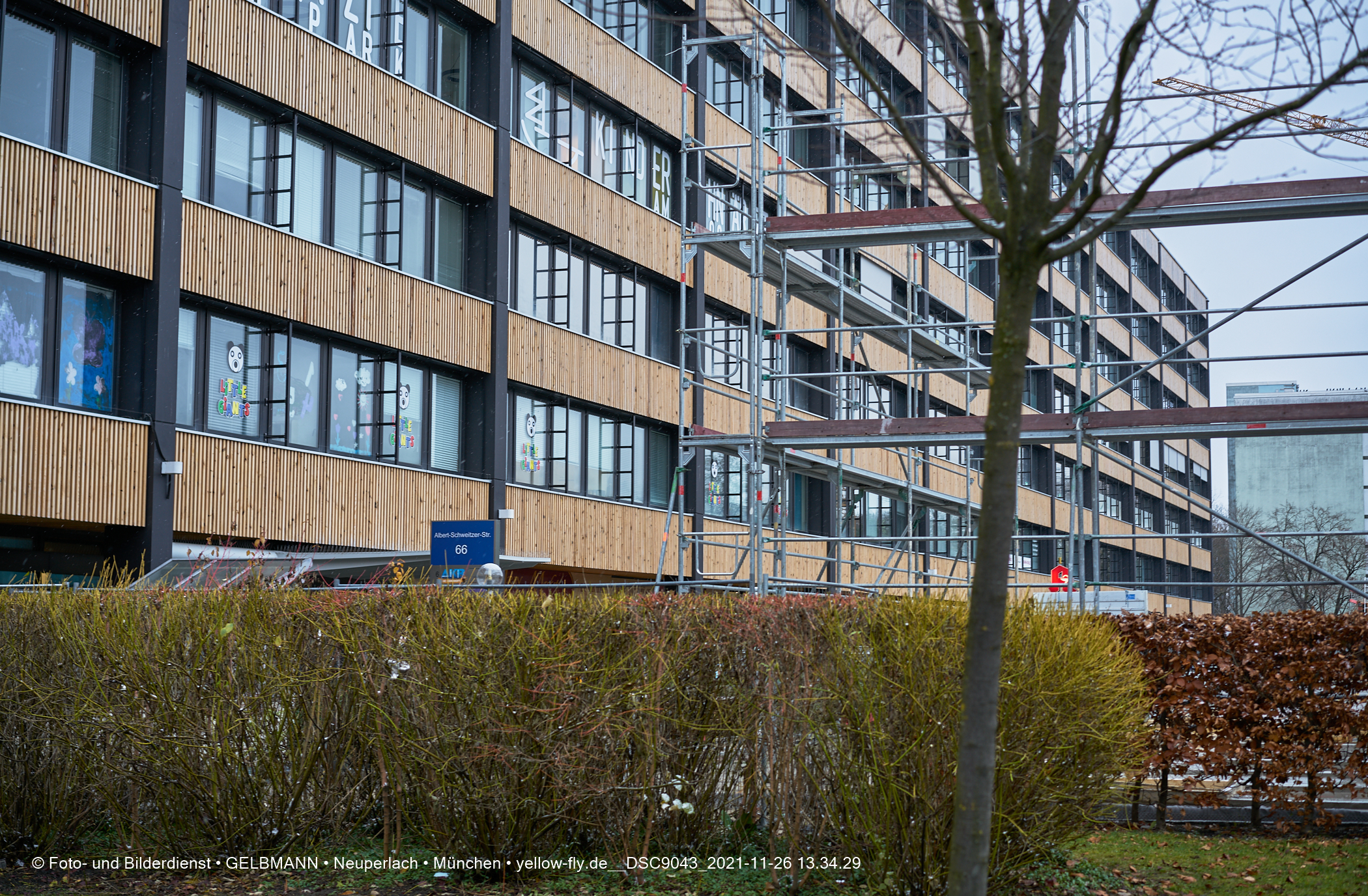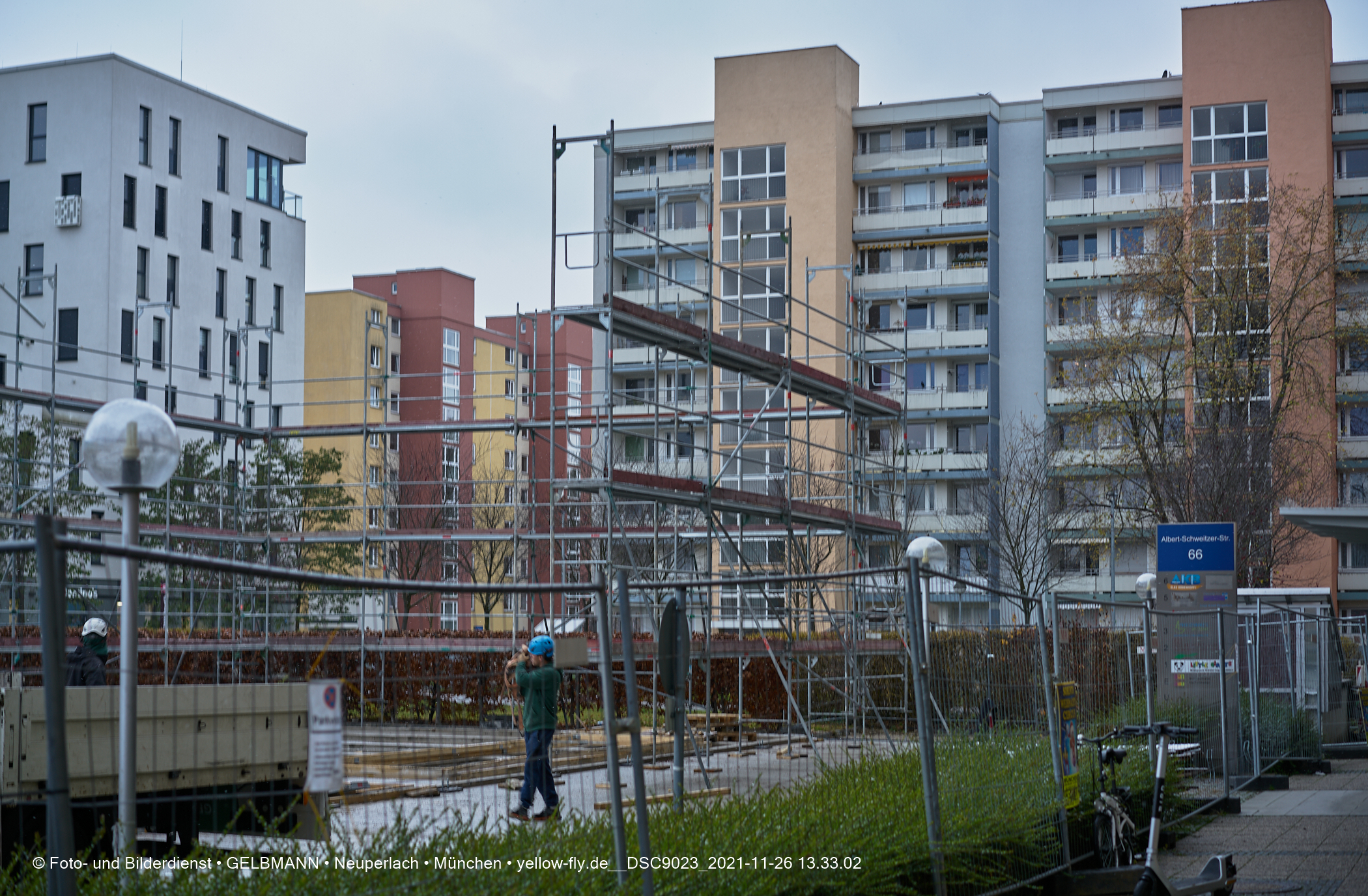 Ein großes Gerüst wird um die Baustelle zur Montessori Schule in Neuperlach aufgebaut. Auf der Seite zu Straße hin, sind schon die ersten Gebäudeteile zu erkennen. Am westlichen Ende wird gerade einhohes Gerüst aufgestellt.