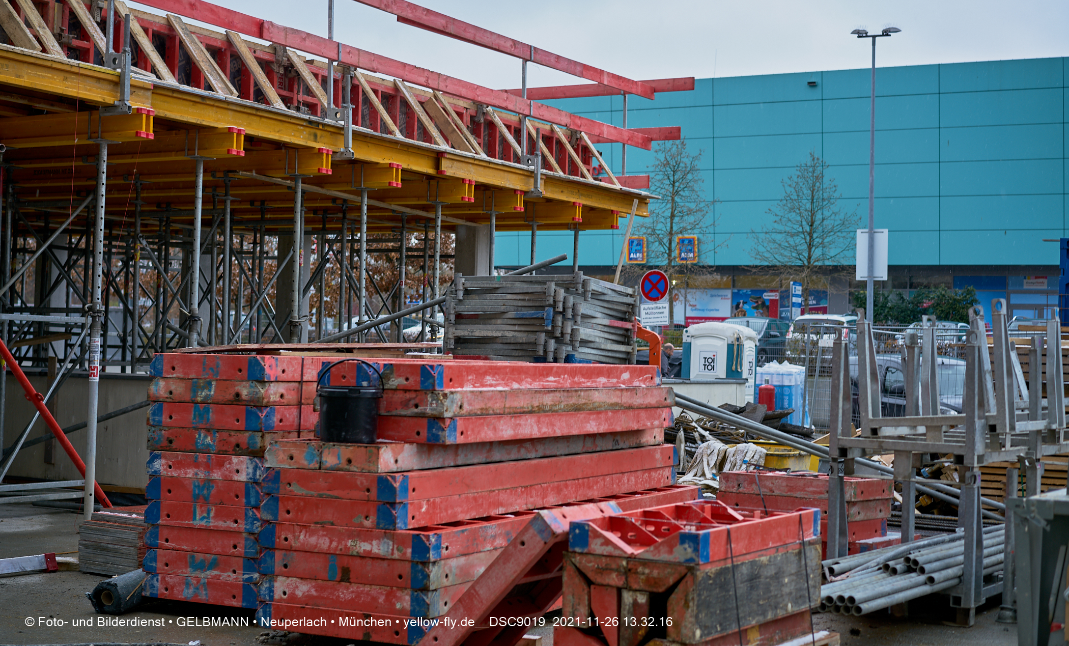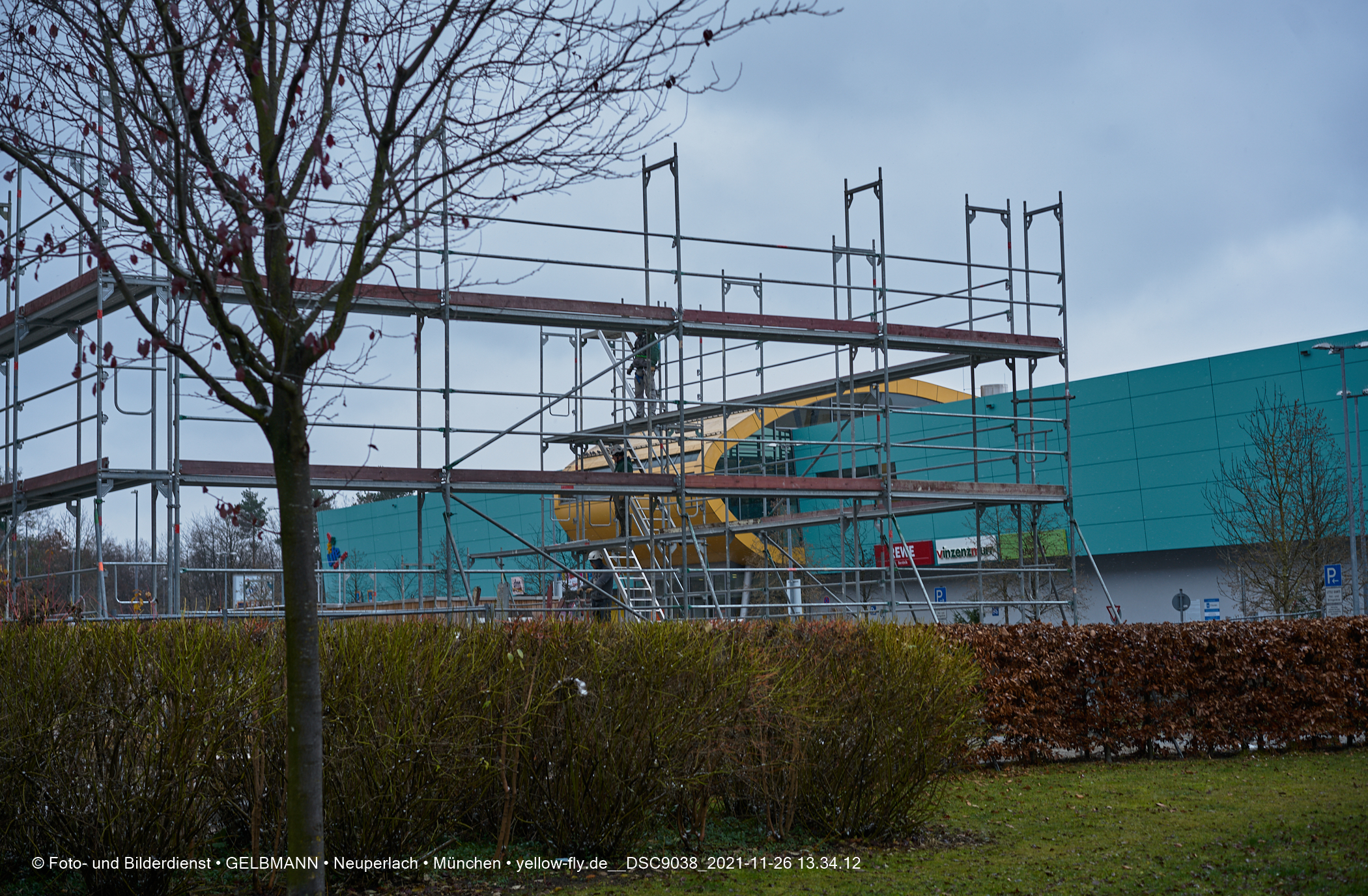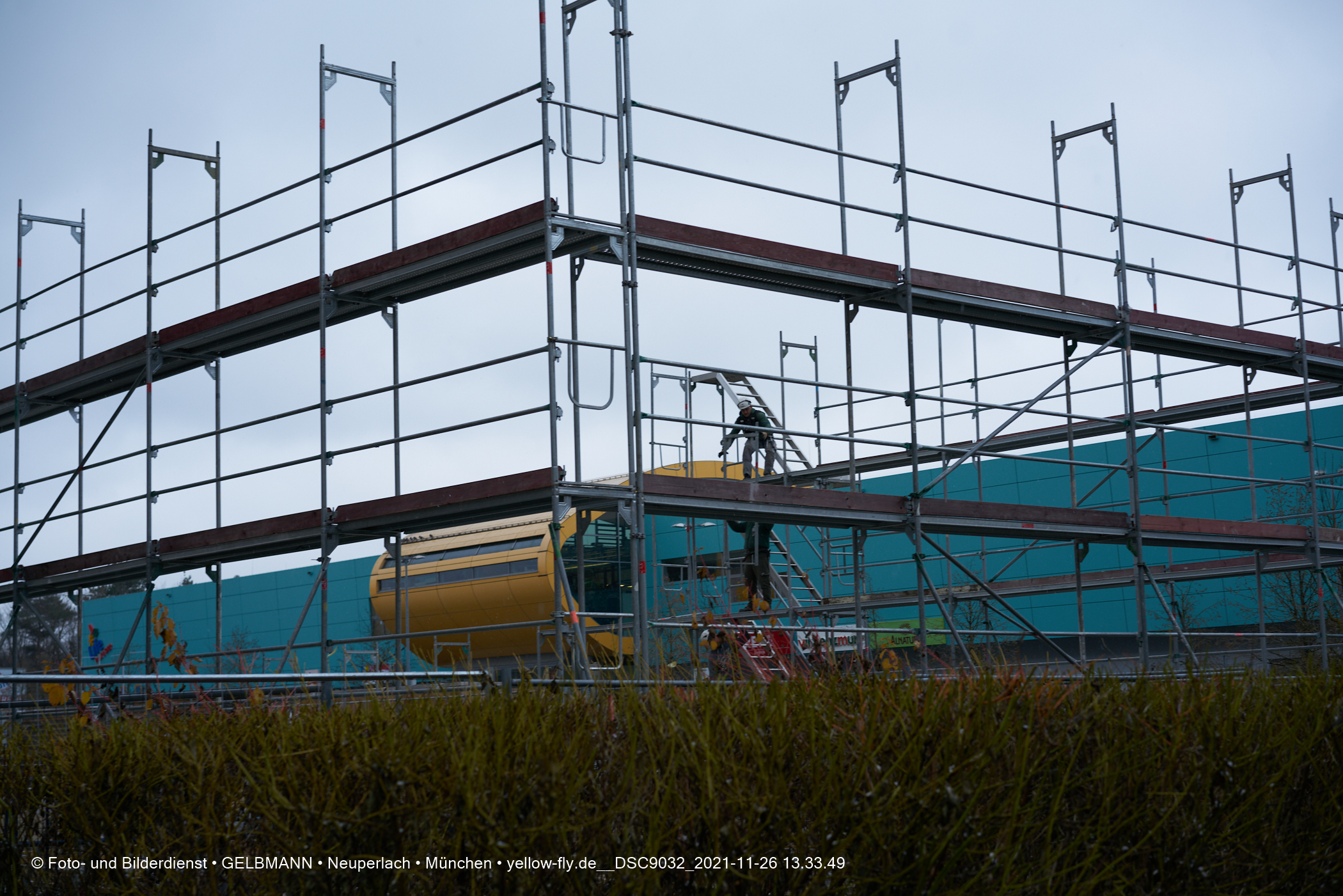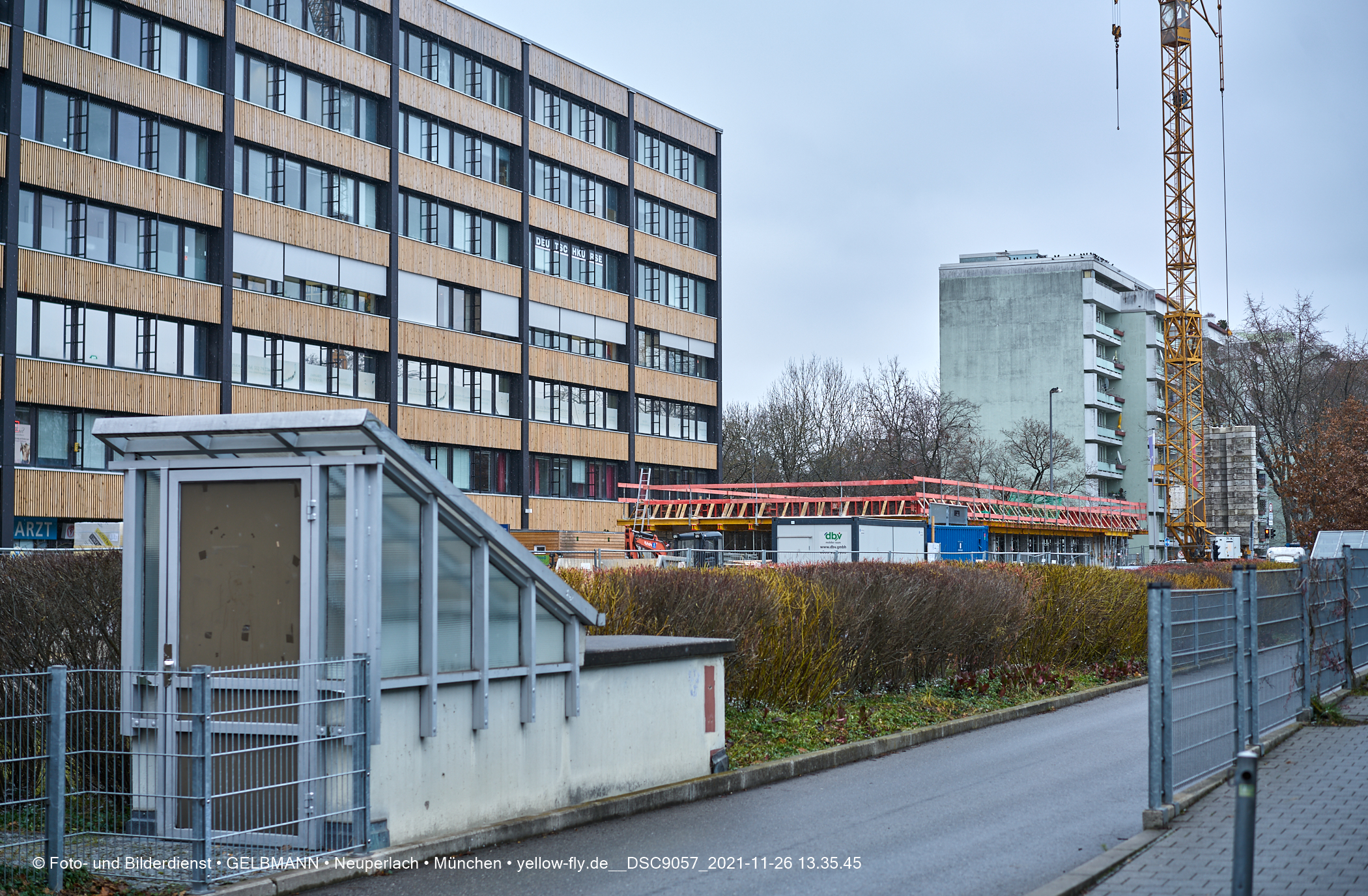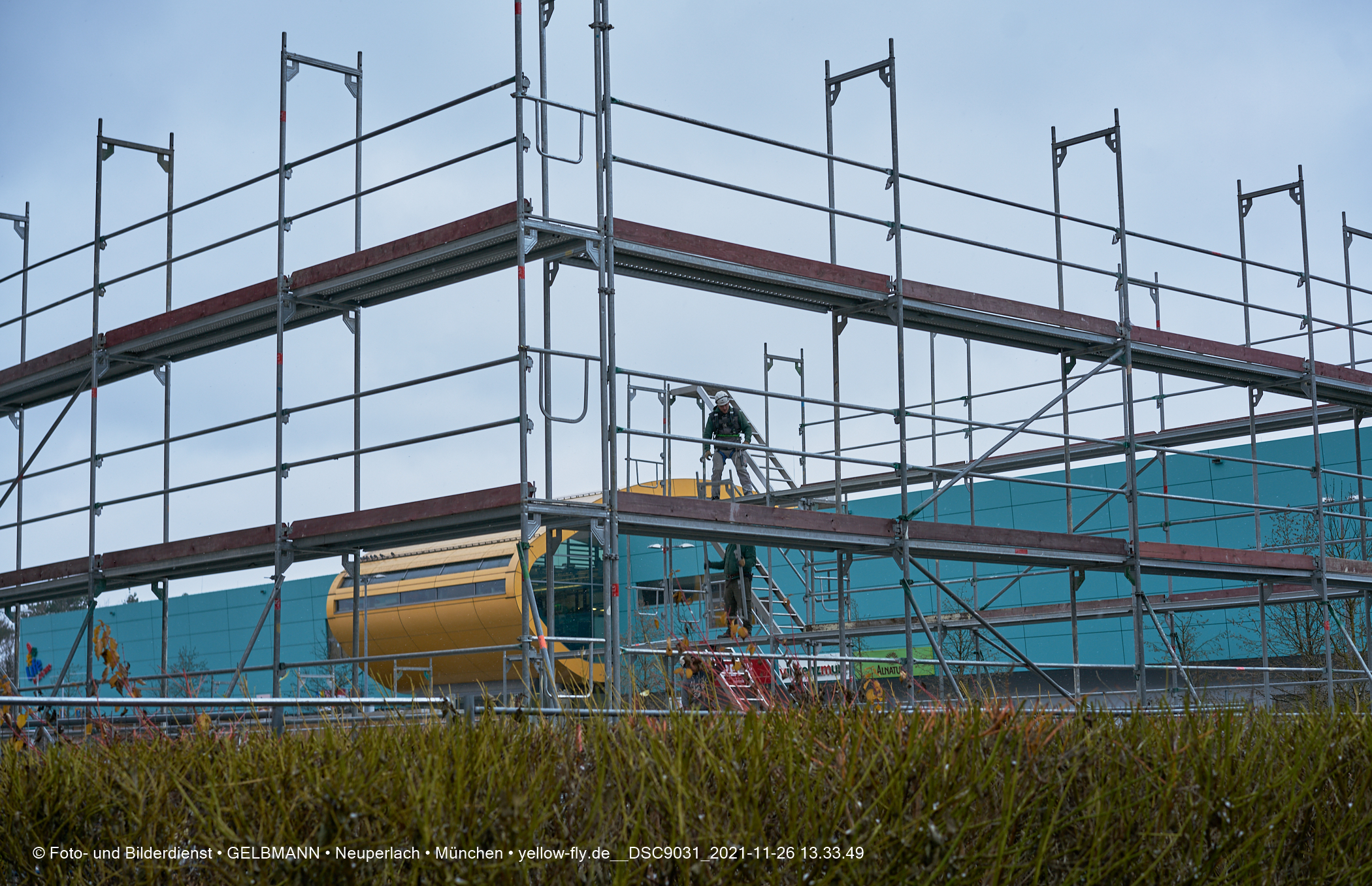 Ein großes Gerüst wird um die Baustelle zur Montessori Schule in Neuperlach aufgebaut. Auf der Seite zu Straße hin, sind schon die ersten Gebäudeteile zu erkennen. Am westlichen Ende wird gerade einhohes Gerüst aufgestellt.