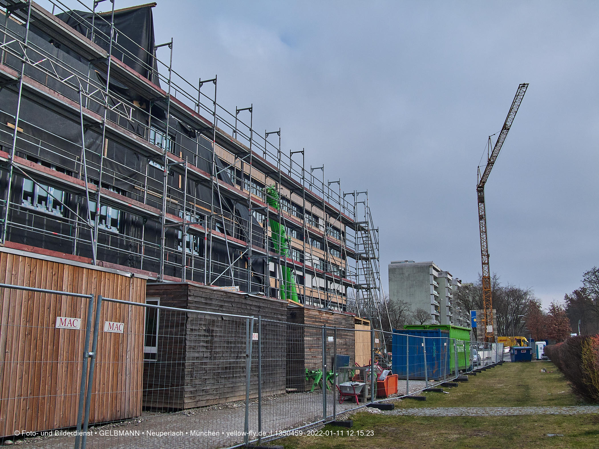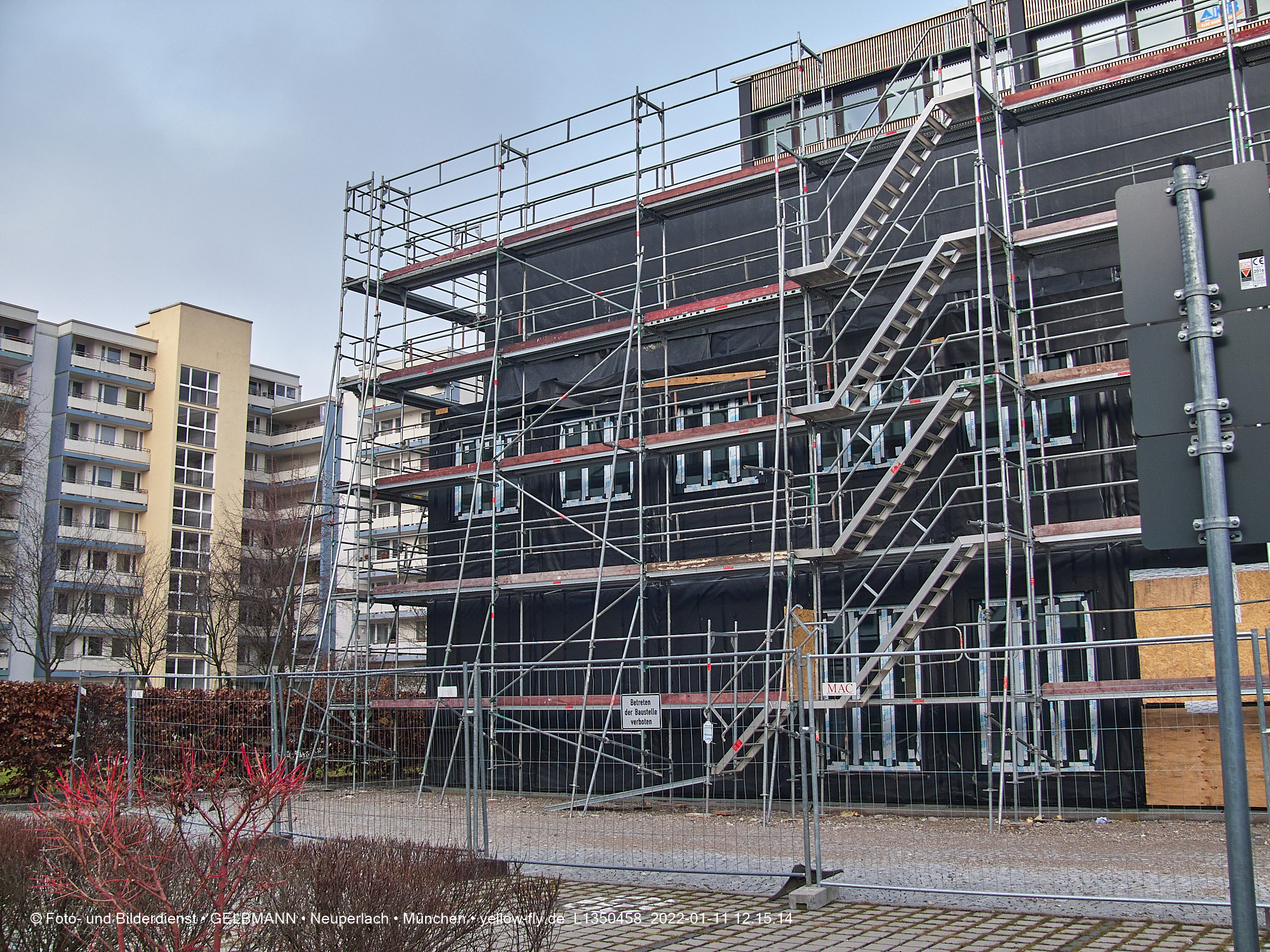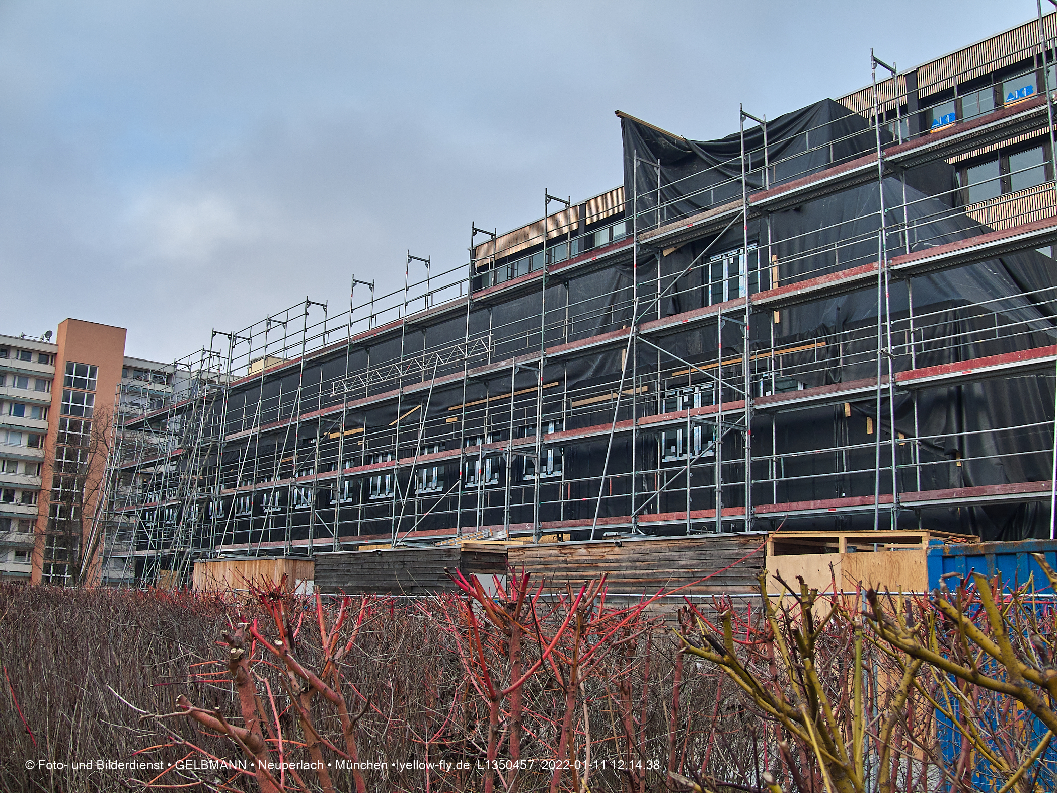 Die Holzteile unserer neuen Montessori Schule in Neuperlach sind noch mit einer schwarzen Plane verhüllt. Auch heute haben mich Passanten beim Fotografieren angesprochen. Eine Mutter wollte von mir wissen, ob ihr Kind, das unter einem Asperger Syndrom leidet, auch auf diese moderne Schule gehen kann. Diese Frage konnte ich ihr leider nicht beantworten. Ich weiß nur, dass Erwachsene mit dieser Krankheit sich in unserer realen Welt sehr schwertun und vermutlich in einem Heim besser aufgehoben wären. Das konnte die arme Mutter zwar nicht befriedigen, aber wir haben uns dennoch nett unterhalten.