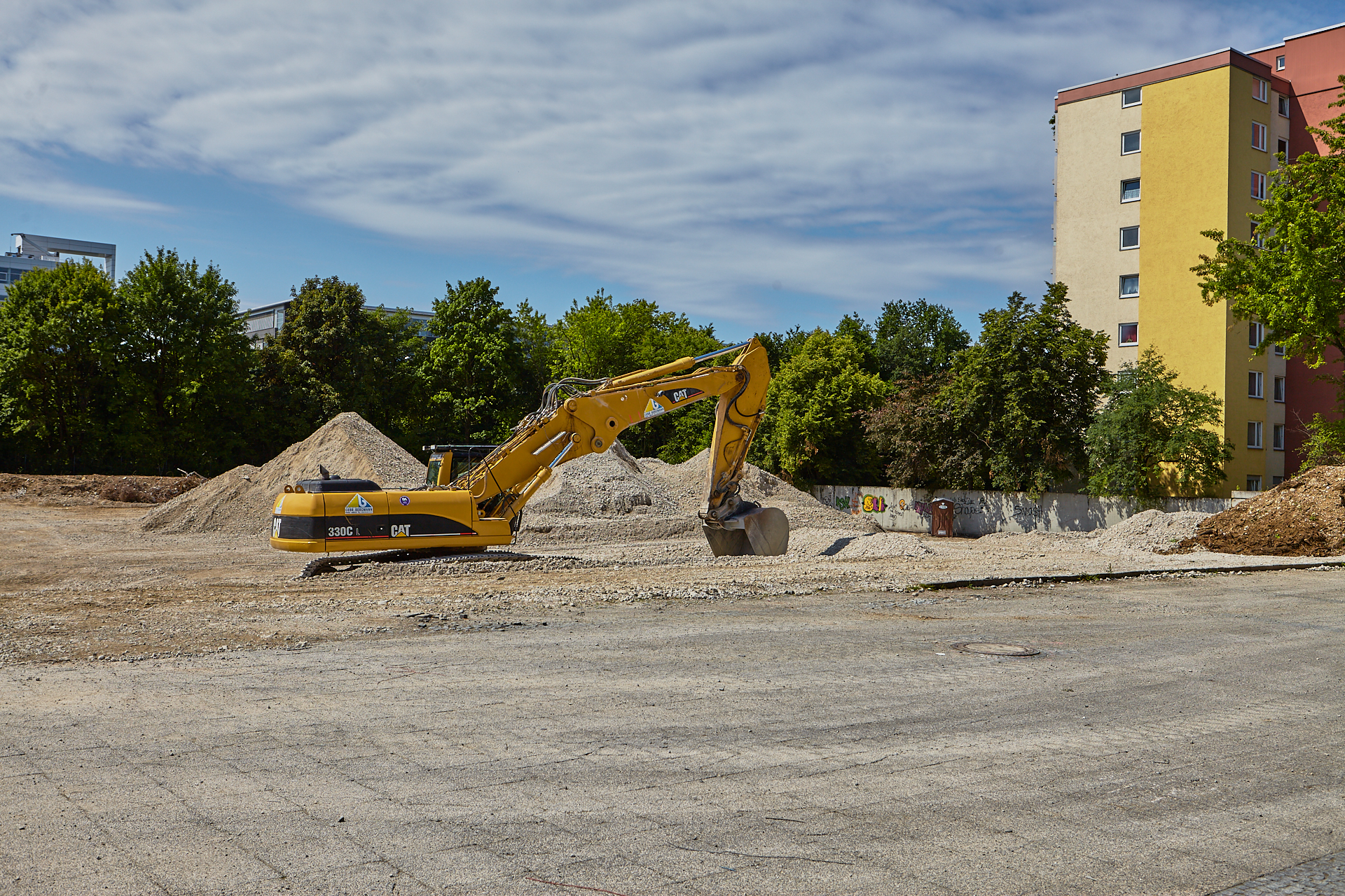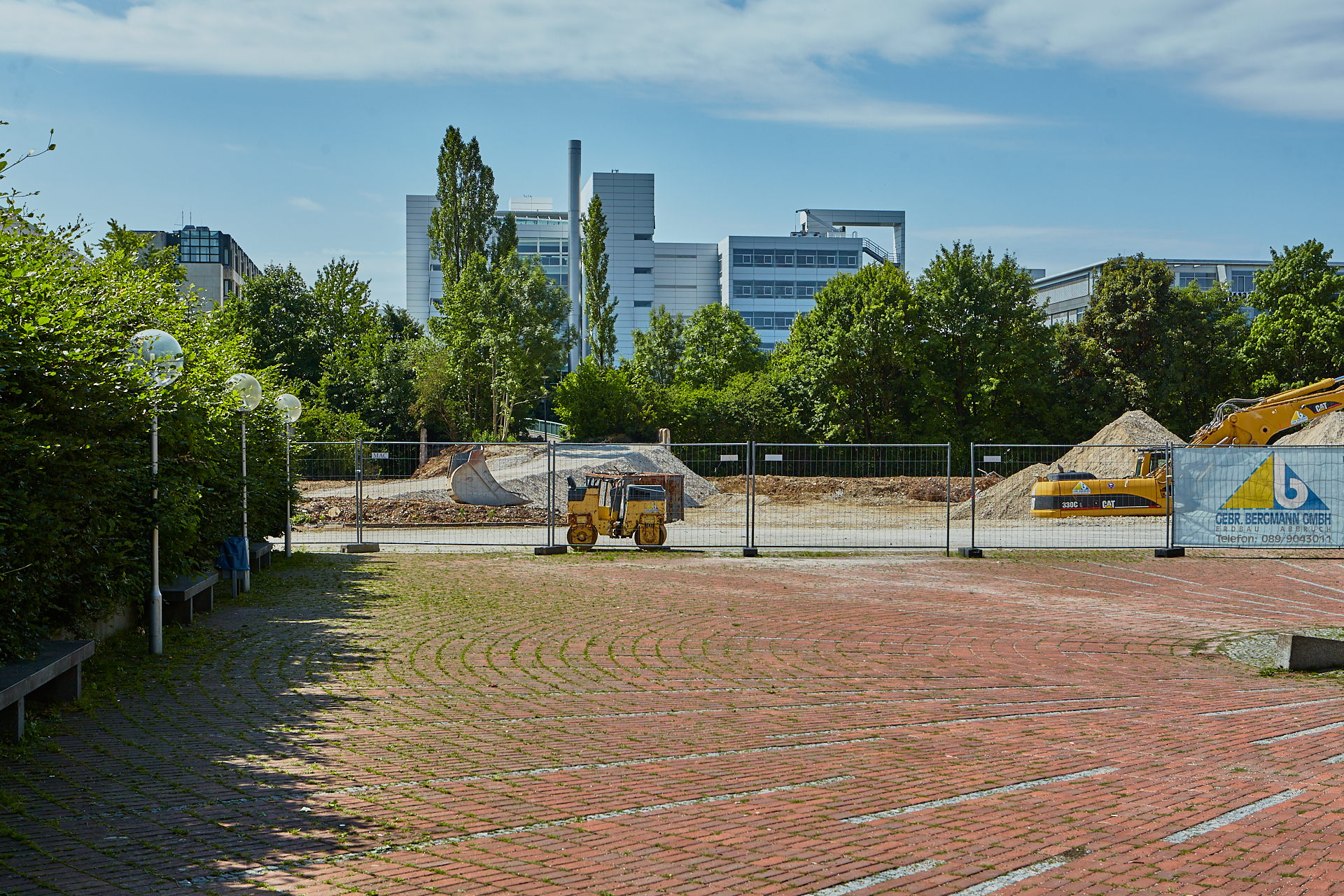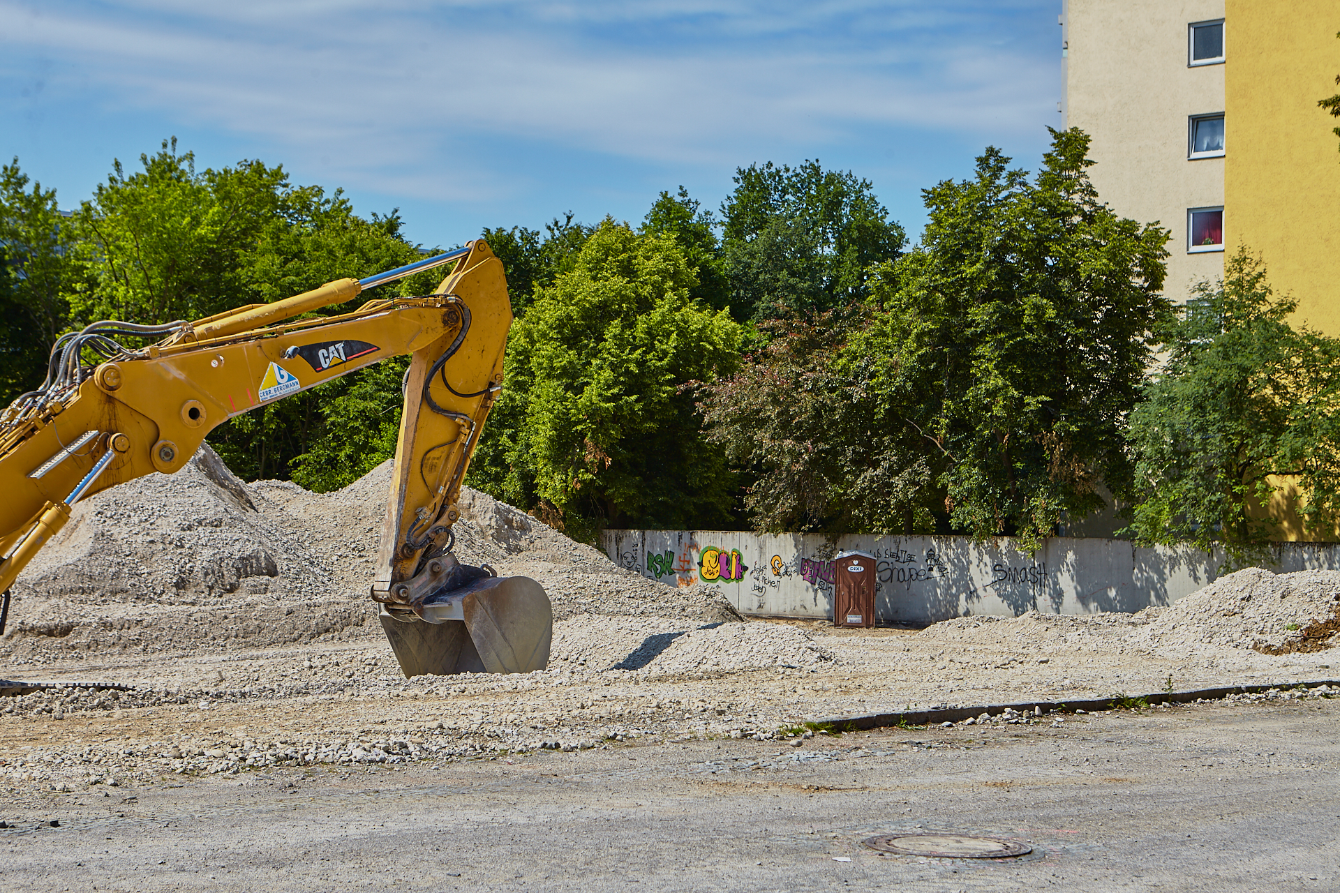 Das Plettzentrum im Sommer 2012. Auf einem Teil des Plettzentrums sind die Gehwegplatten entfernt worden. Ein Schotterweg wurde angelegt, um von der Brücke über die Ständlerstraße ins Plettzentrum zu kommen, führt quer über den Bauplatz gebaut.