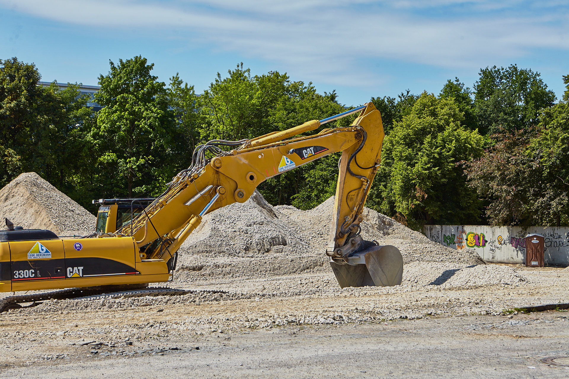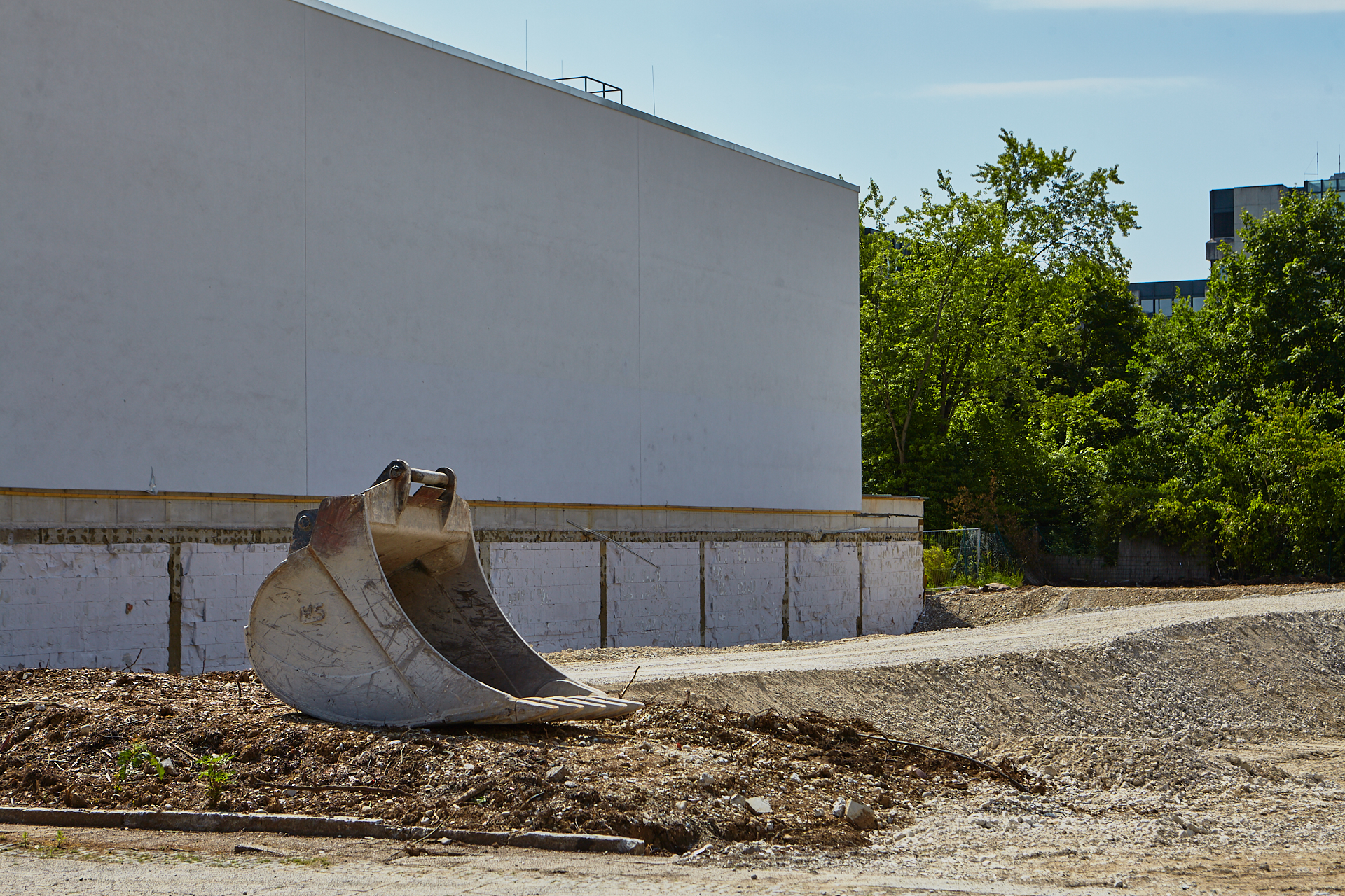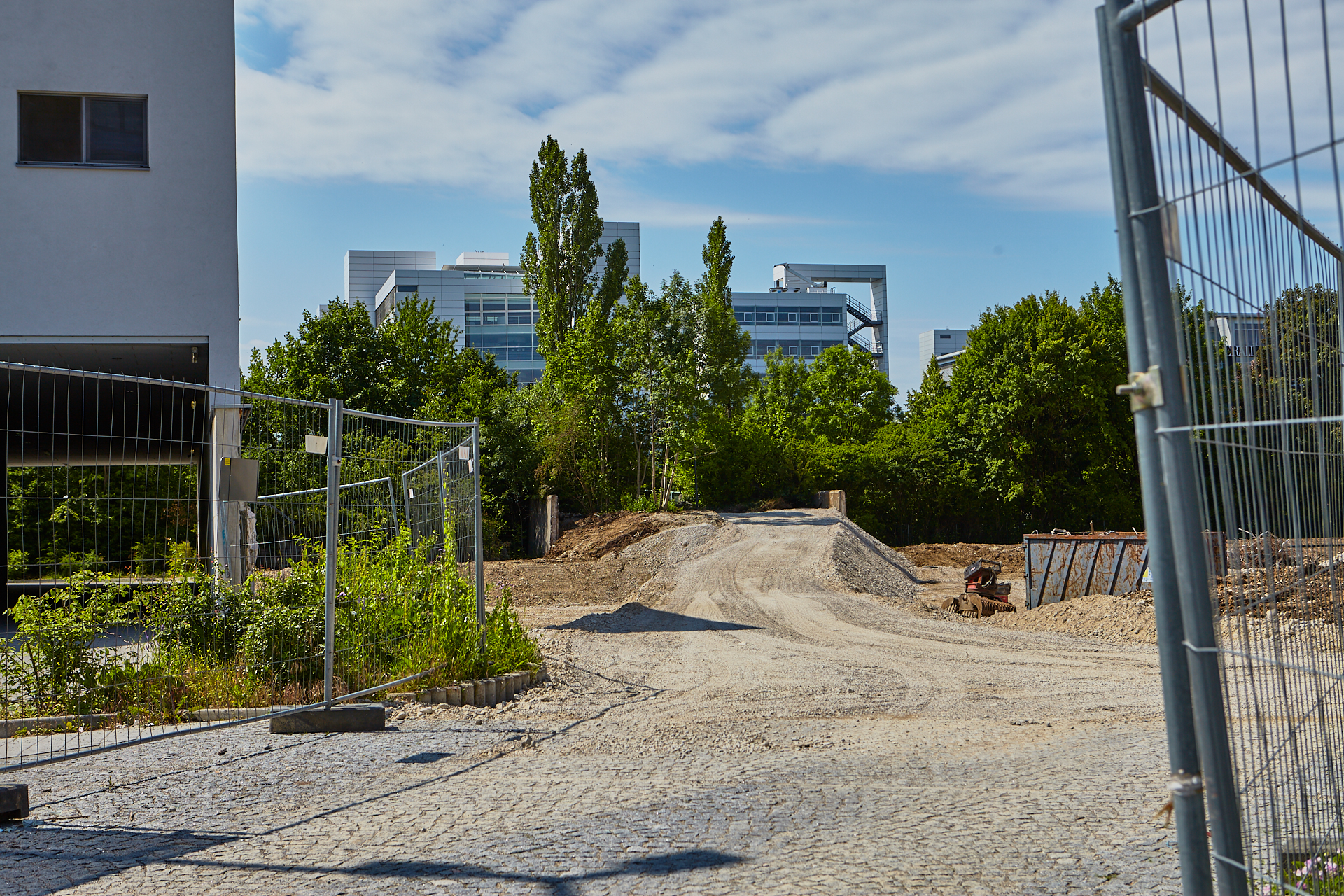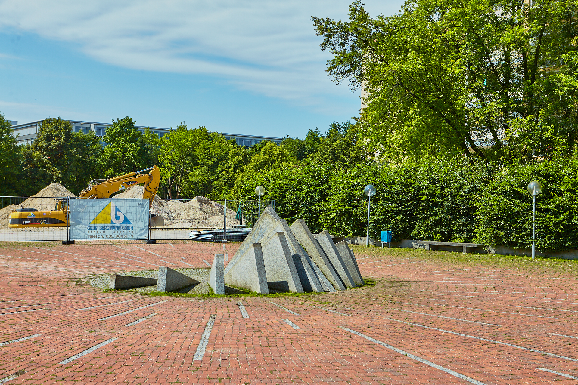 Das Plettzentrum im Sommer 2012. Auf einem Teil des Plettzentrums sind die Gehwegplatten entfernt worden. Ein Schotterweg wurde angelegt, um von der Brücke über die Ständlerstraße ins Plettzentrum zu kommen, führt quer über den Bauplatz gebaut.