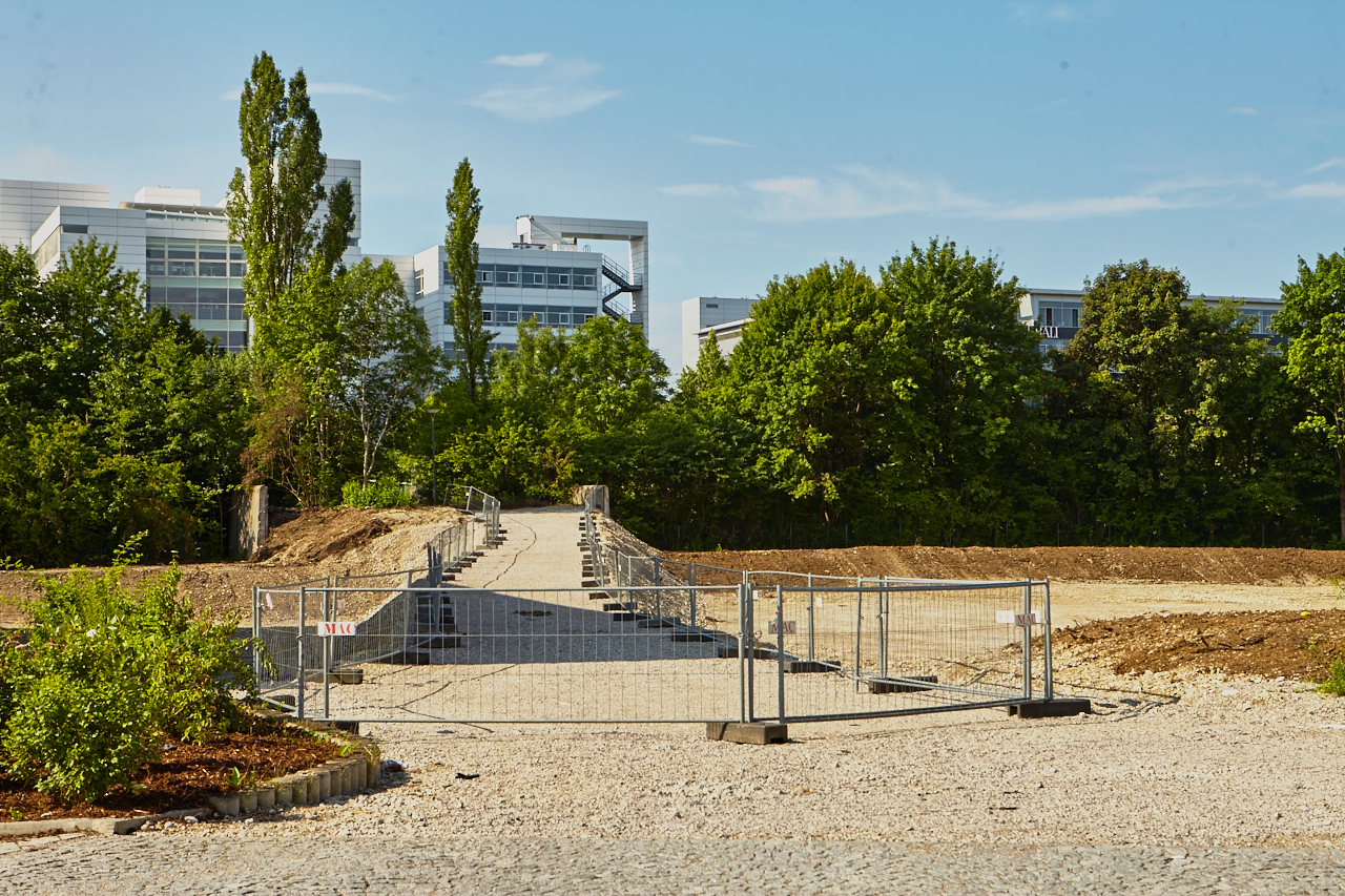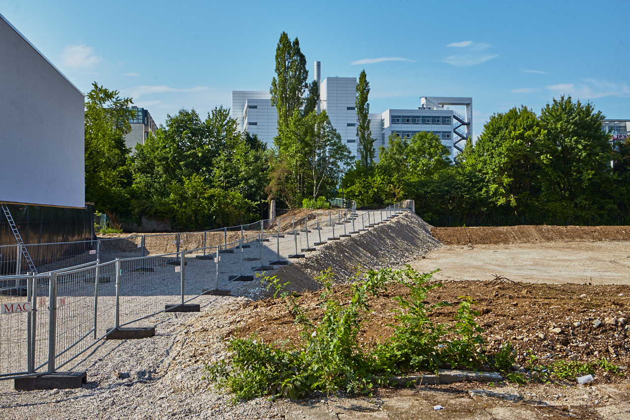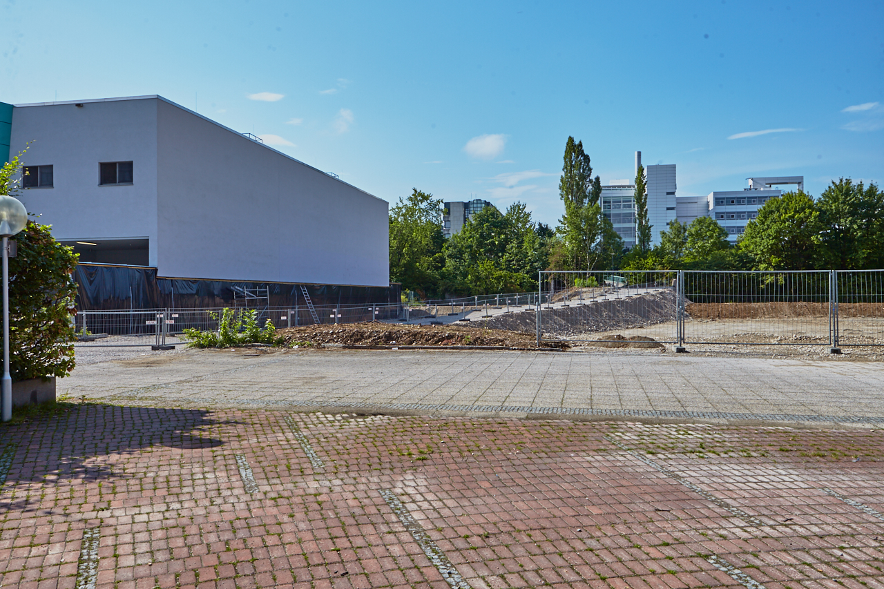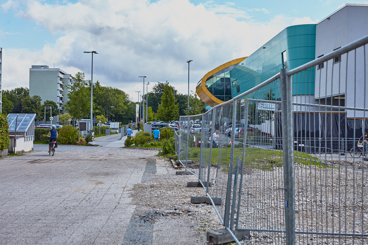 Das Plettzentrum im Sommer 2012. Auf einem Teil des Plettzentrums sind die Gehwegplatten entfernt worden. Ein Schotterweg wurde angelegt, um von der Brücke über die Ständlerstraße ins Plettzentrum zu kommen, führt quer über den Bauplatz gebaut.