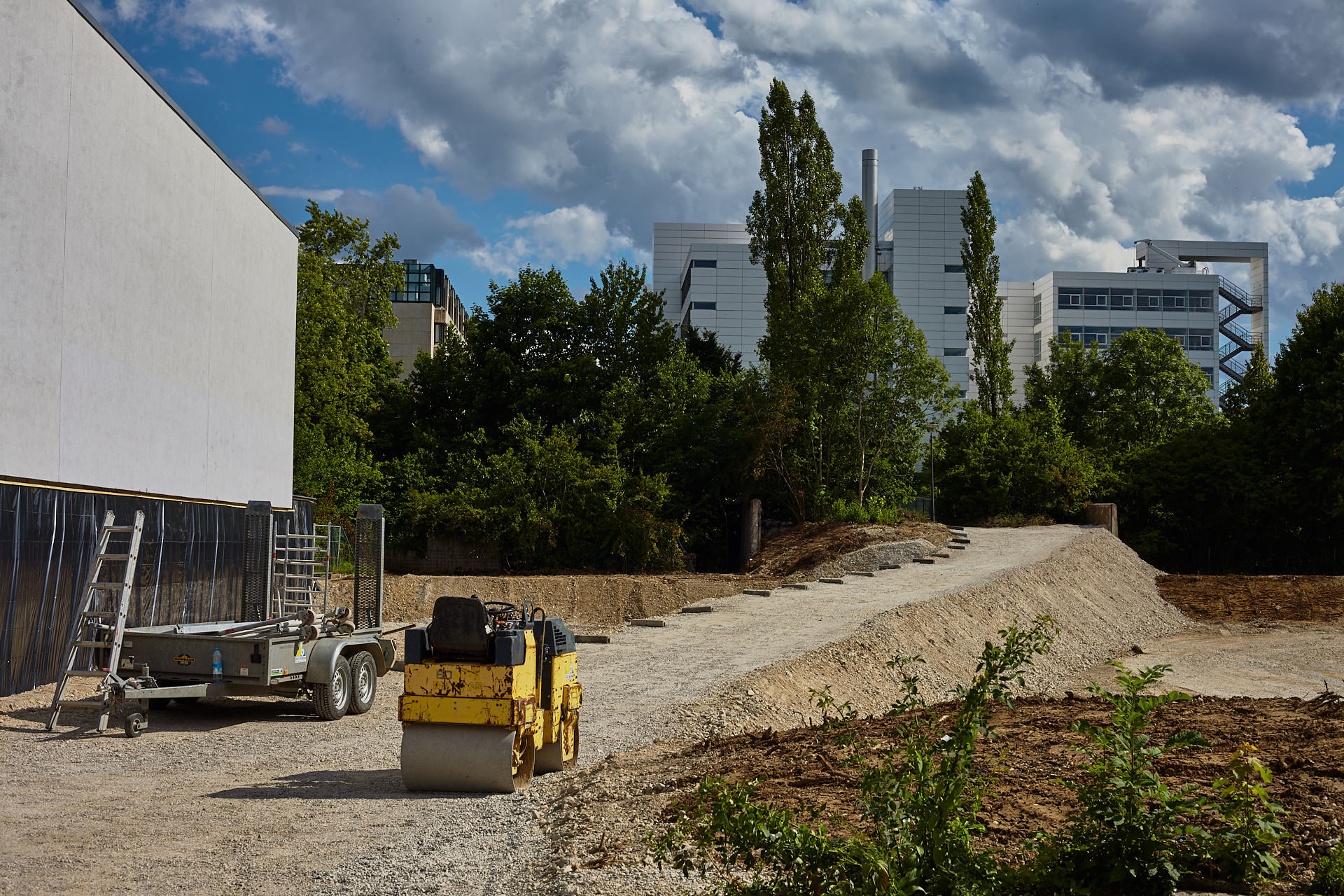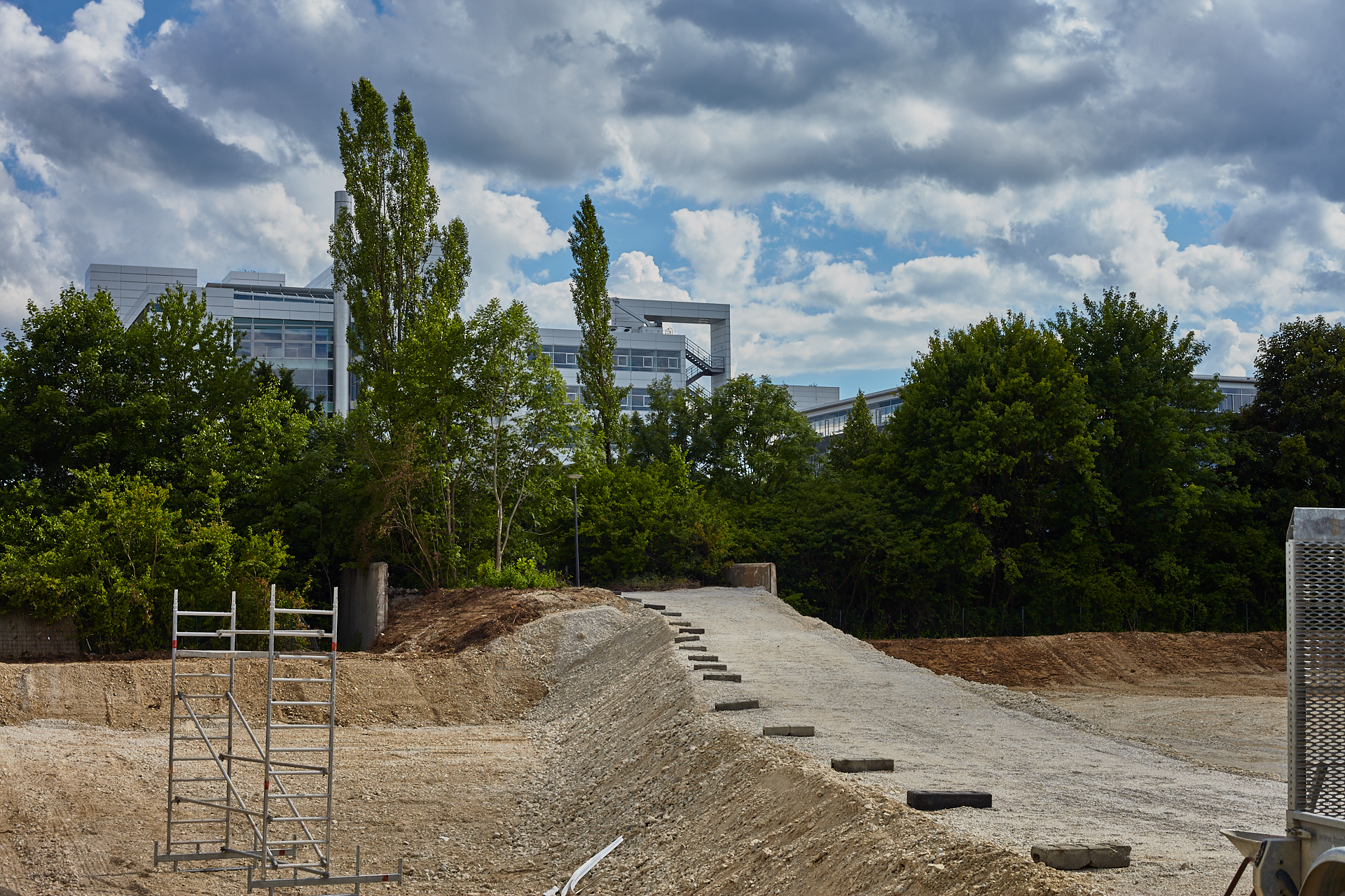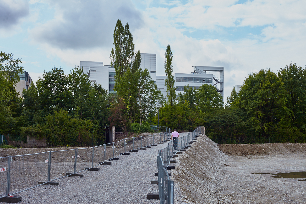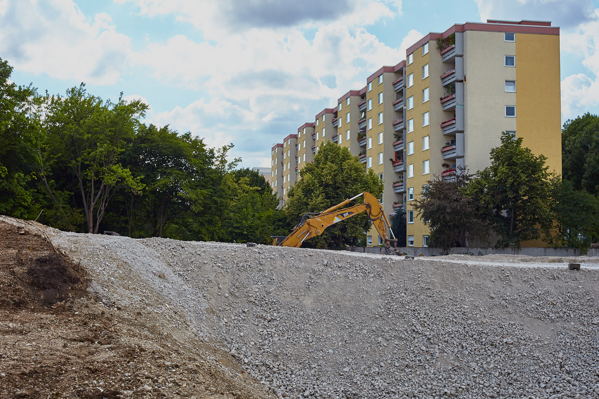 Das Plettzentrum im Sommer 2012. Auf einem Teil des Plettzentrums sind die Gehwegplatten entfernt worden. Ein Schotterweg wurde angelegt, um von der Brücke über die Ständlerstraße ins Plettzentrum zu kommen, führt quer über den Bauplatz gebaut.