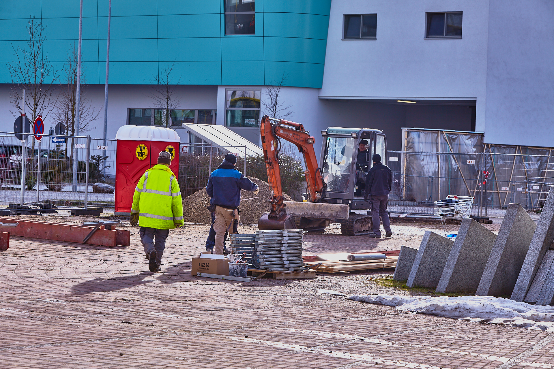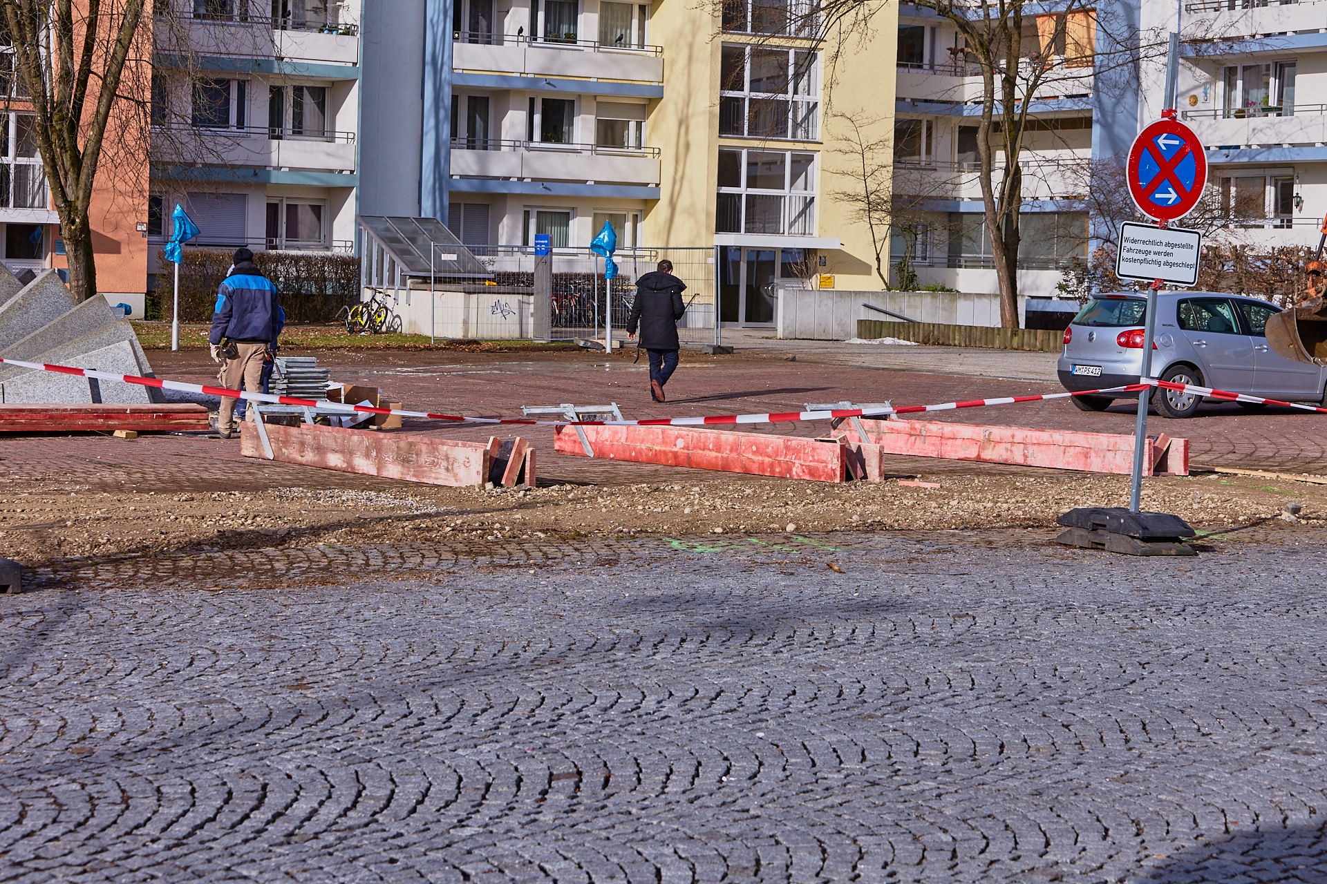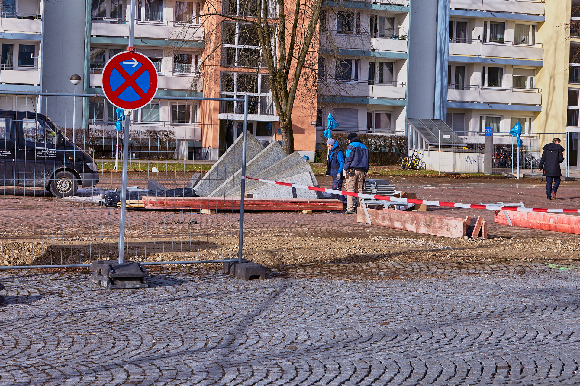 Winter im Plettzentrum. Die Bauarbeiten run um unsere Sonnenuhr haben begonnen. Pflastersteine werden aufgerissen und Markierungen in den Boden geschlagen. Eine Schotterweg führt über die Bausetelle zum LAO-Haus in unser schönes Plettzentrum. Eine riesige kahle Fläche zeigt die Größe des zukünftigen LAO-Hasuses. Der Weg über die Brücke an der Ständlerstraße ist seit einigen Tagen gesperrt. Der Platz vor der Baustelle ist noch im Originalzustand und die Sonnenuhr zeigt keine Zeit mehr an.