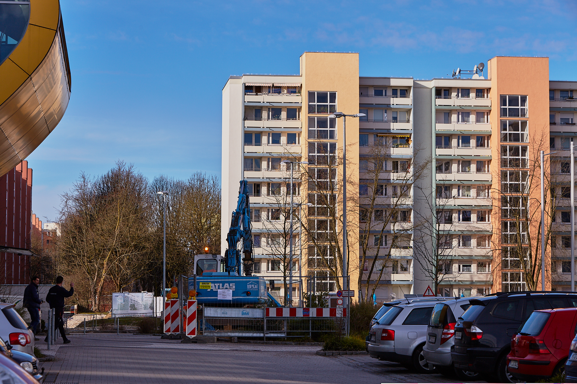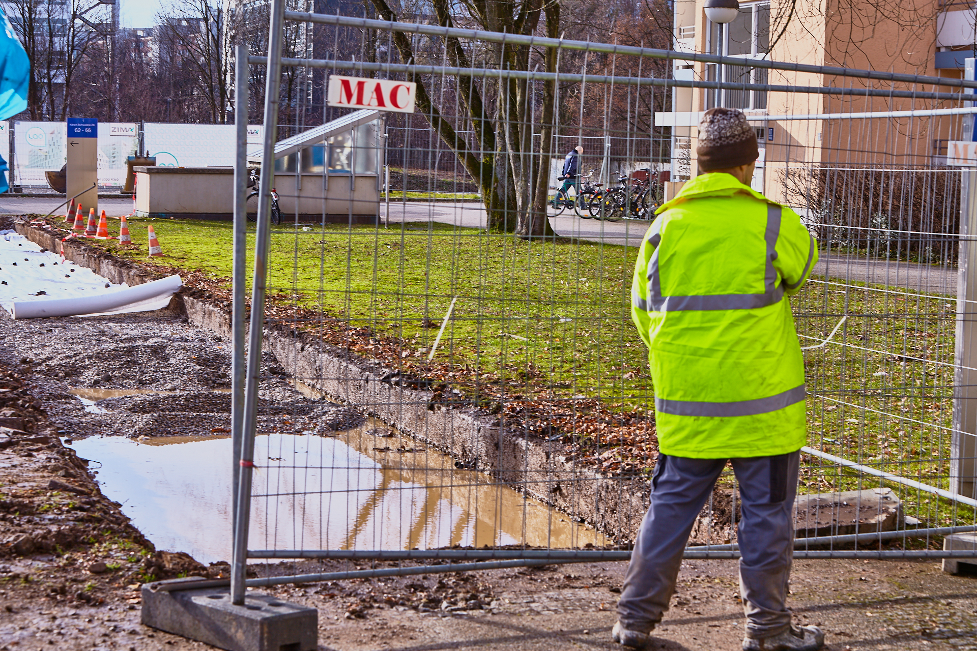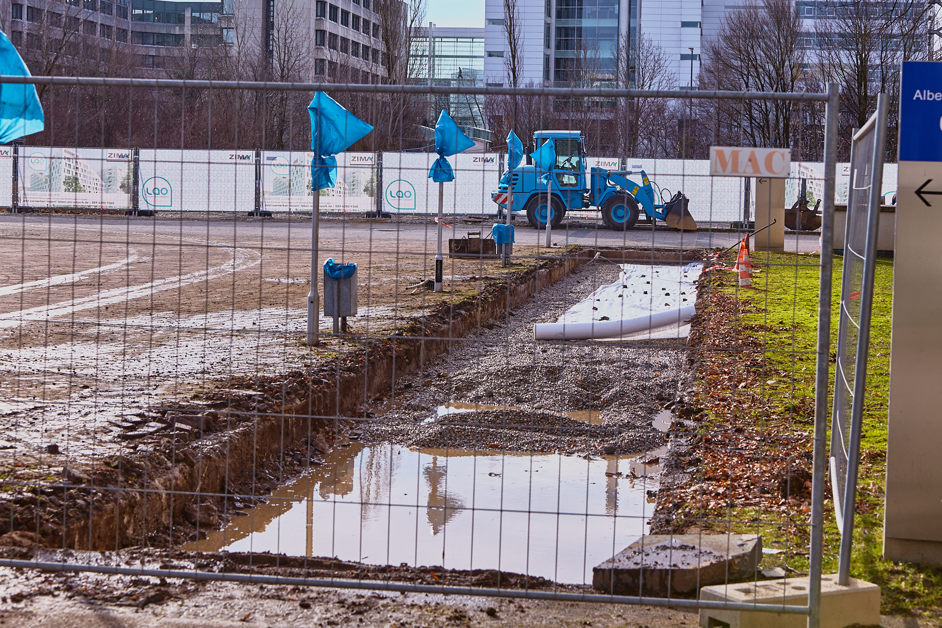 Winter im Plettzentrum. Die Bauarbeiten run um unsere Sonnenuhr haben begonnen. Pflastersteine werden aufgerissen und Markierungen in den Boden geschlagen. Eine Schotterweg führt über die Bausetelle zum LAO-Haus in unser schönes Plettzentrum. Eine riesige kahle Fläche zeigt die Größe des zukünftigen LAO-Hasuses. Der Weg über die Brücke an der Ständlerstraße ist seit einigen Tagen gesperrt. Der Platz vor der Baustelle ist noch im Originalzustand und die Sonnenuhr zeigt keine Zeit mehr an.