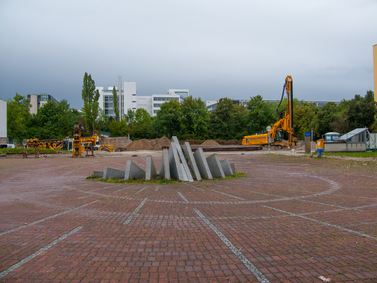 HIER AUF DEN FOTOS IST NOCH UNSERE SCHÖNE SONNENUHR ZUSEHEN, WELCHE KURZE ZEIT DANACH IN DER TIEFGARAGE DER FIRMA Z. VERSCHWANDT. KEINER WUSSTE ZU DIESEM ZEITPUNKT, DASS SIE, ENTGEGEN GEMACHTER ZU- UND AUSSAGEN, NICHT MEHR AUFGESTELLT WIRD. GUT EINGEPACKT KANN MAN DIE STEINE BEI Z. BESICHTIGEN. DIE VORBEREITUNGEN FÜR DEN AUSHUB DER BAUGRUBE BEGINNEN. MIT GROSSEN BOHRMASCHINEN WERDEN LÖCHER FÜR DIE SPUNDWÄNDE GEBOHRT.