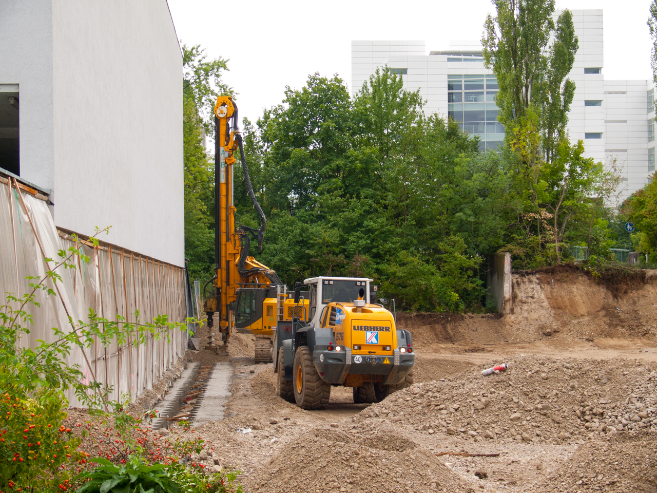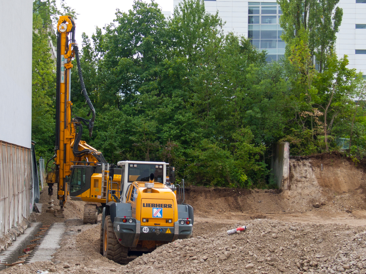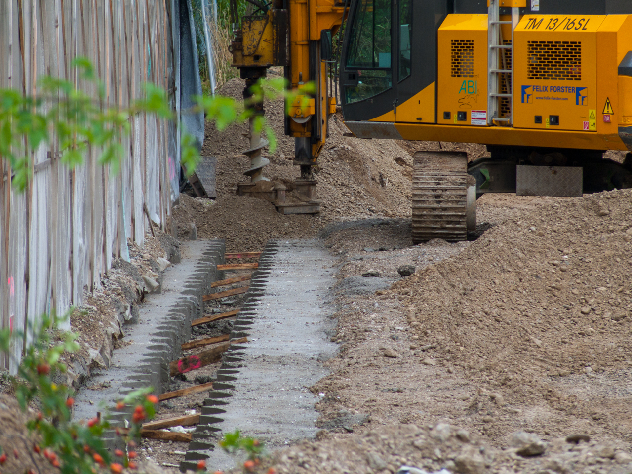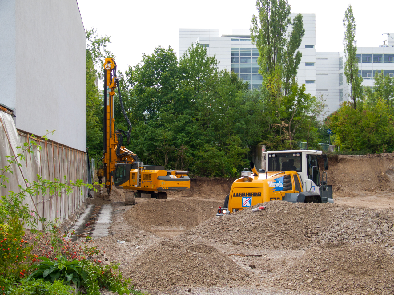 DIE VORBEREITUNGEN FÜR DEN AUSHUB DER BAUGRUBE BEGINNEN. MIT GROSSEN BOHRMASCHINEN WERDEN LÖCHER FÜR DIE SPUNDWÄNDE GEBOHRT.