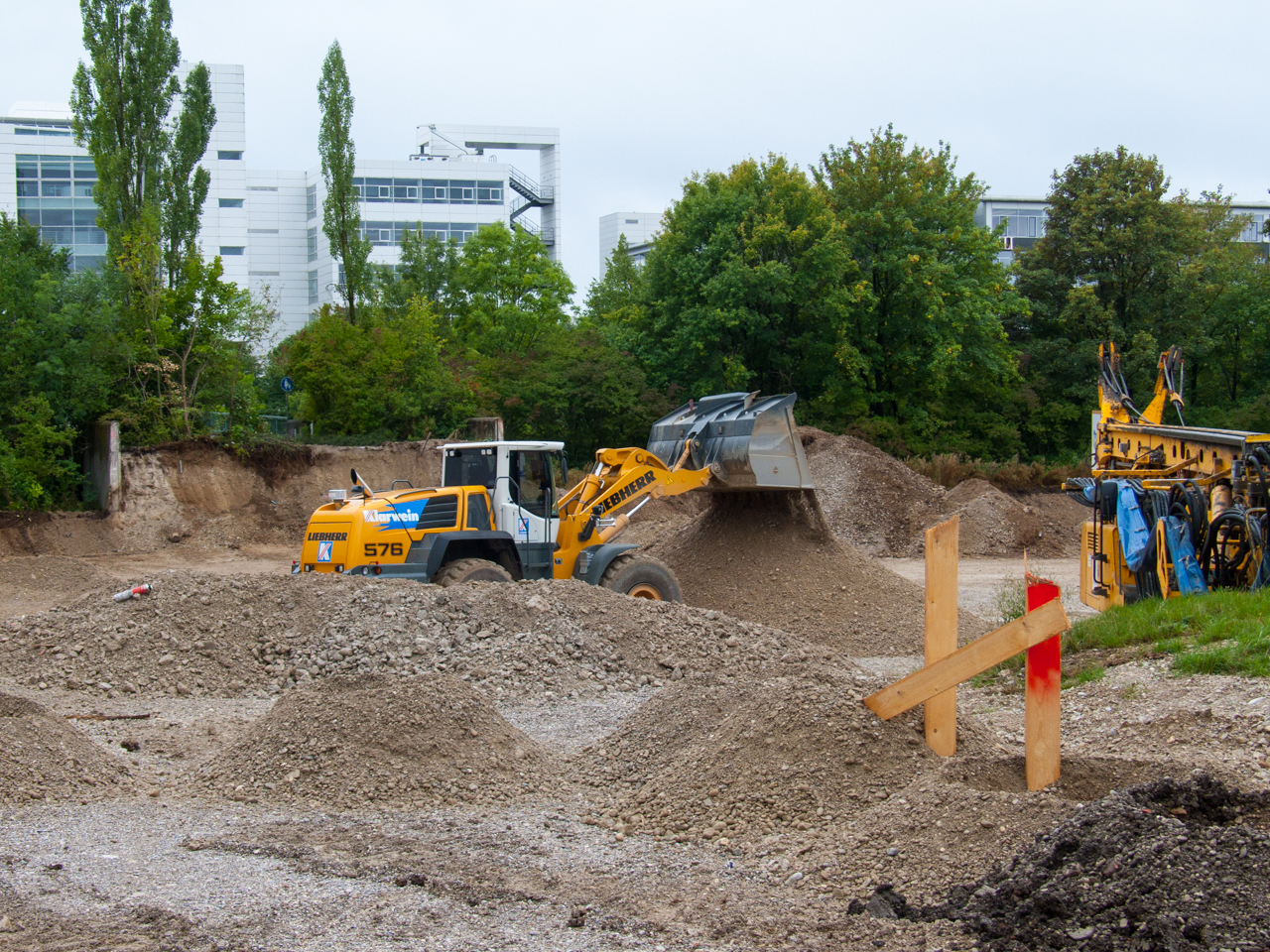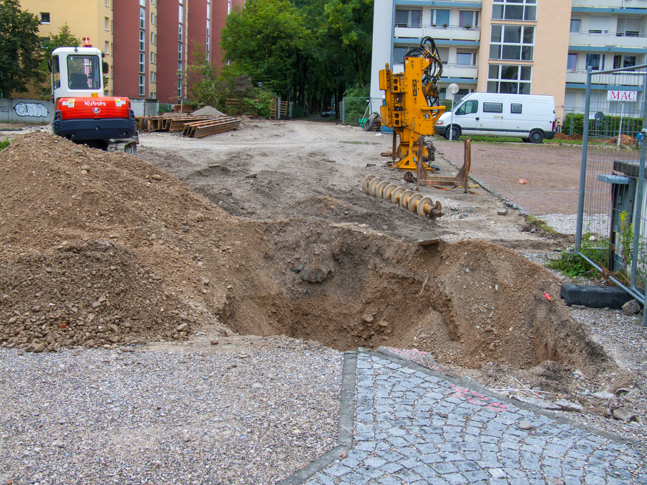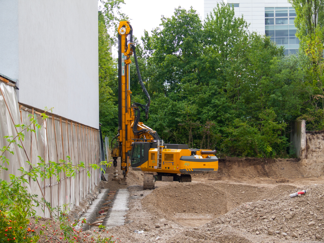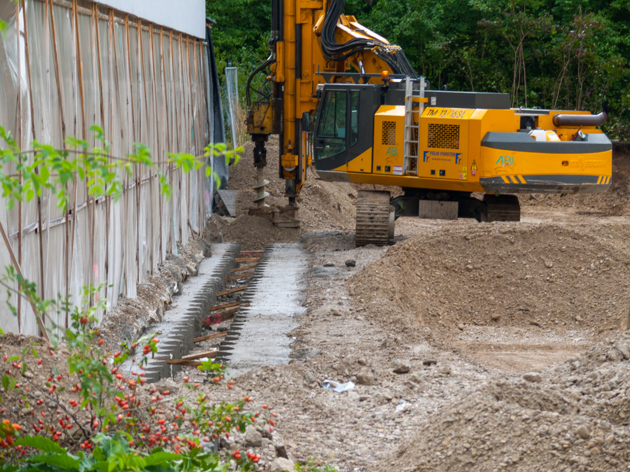 DIE VORBEREITUNGEN FÜR DEN AUSHUB DER BAUGRUBE BEGINNEN. MIT GROSSEN BOHRMASCHINEN WERDEN LÖCHER FÜR DIE SPUNDWÄNDE GEBOHRT.