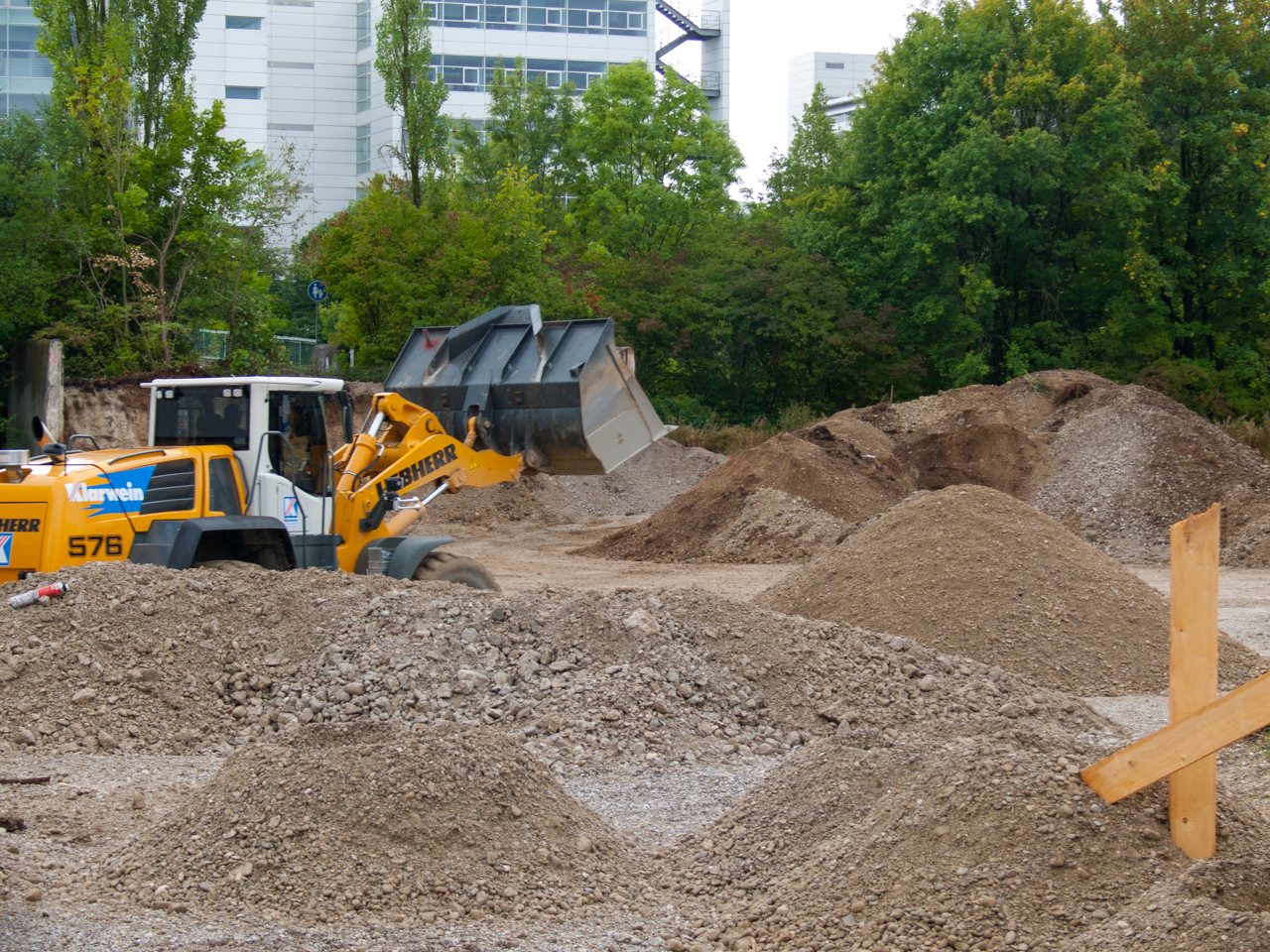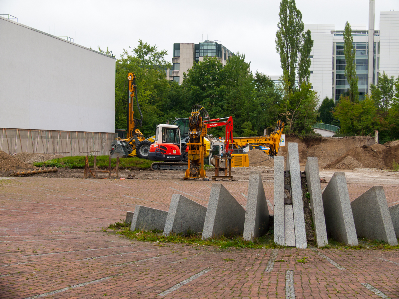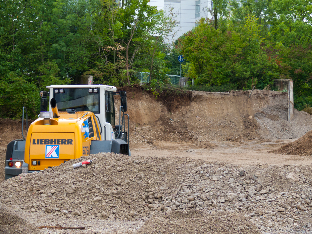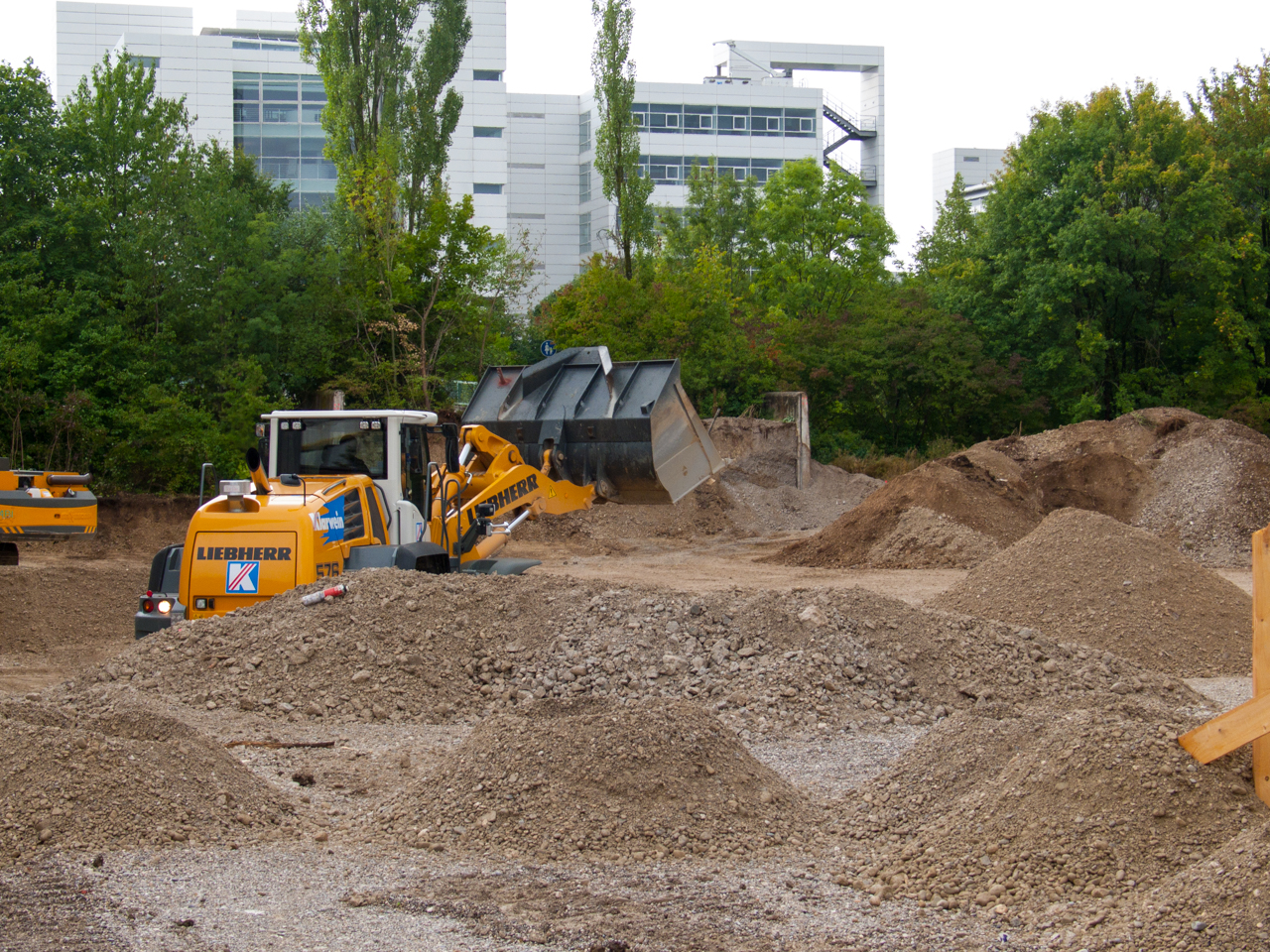 DIE VORBEREITUNGEN FÜR DEN AUSHUB DER BAUGRUBE BEGINNEN. MIT GROSSEN BOHRMASCHINEN WERDEN LÖCHER FÜR DIE SPUNDWÄNDE GEBOHRT.