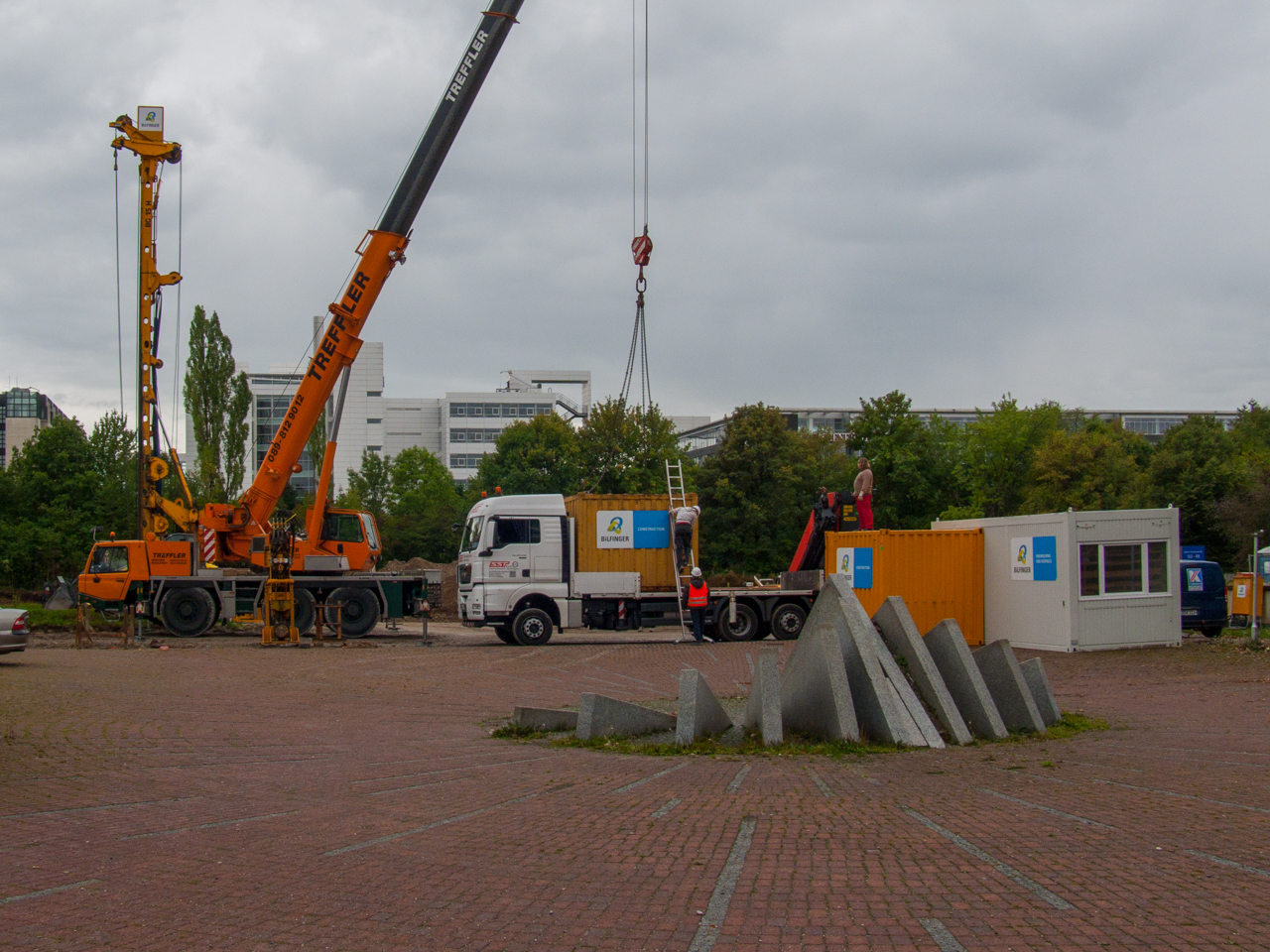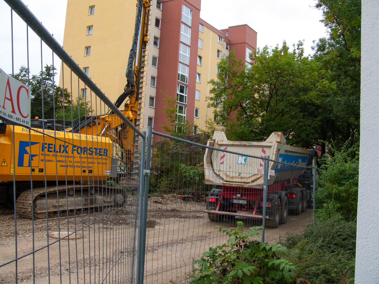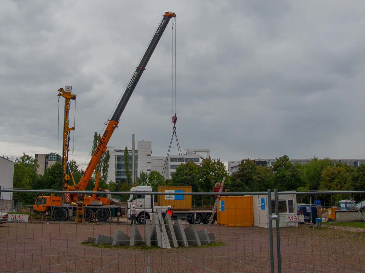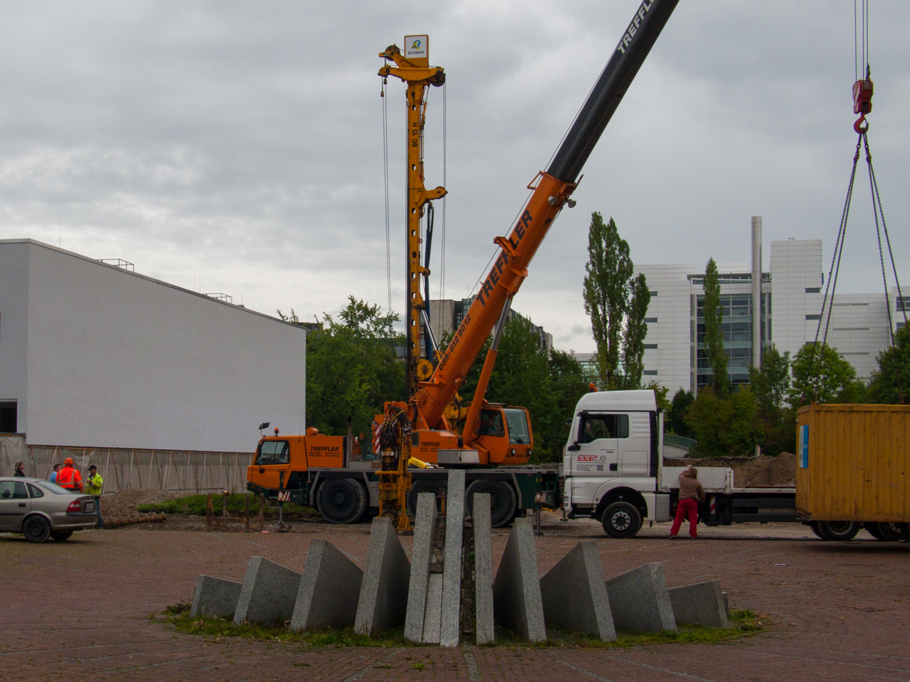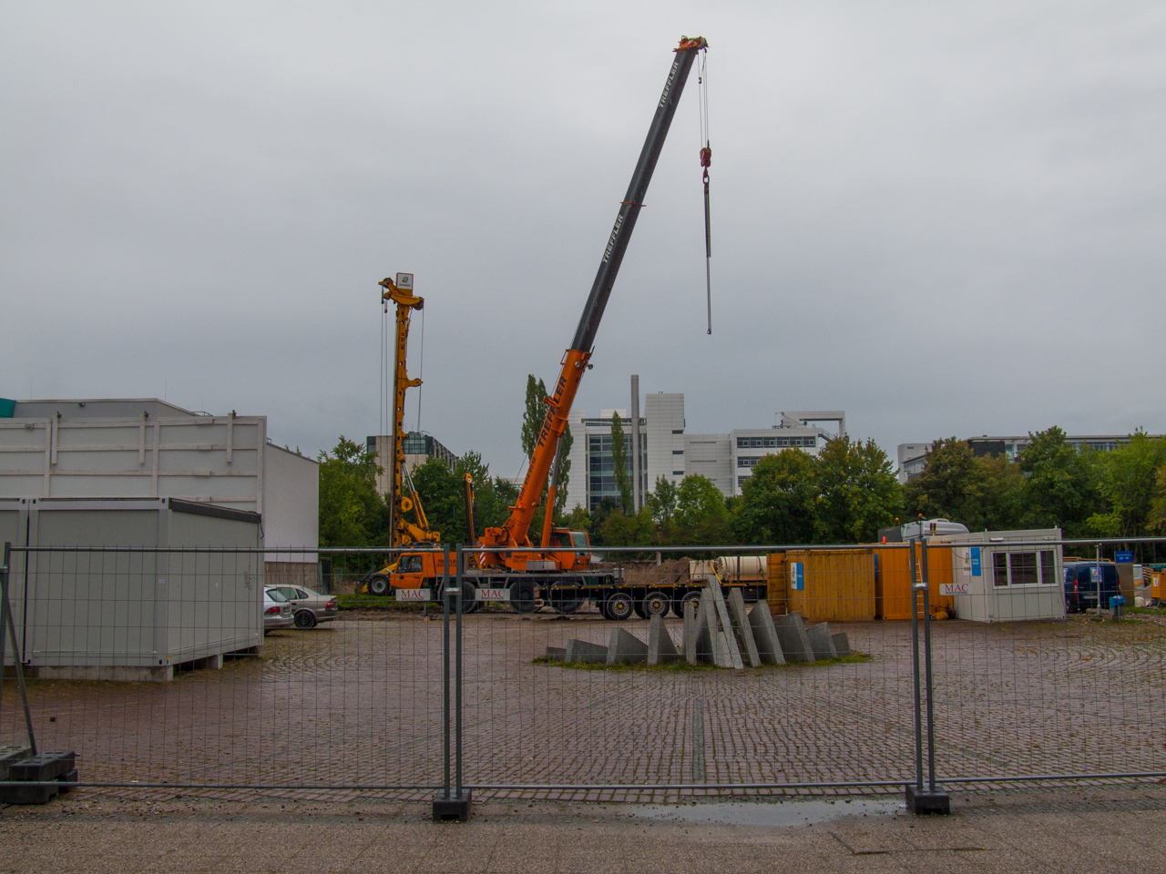 HIER AUF DEN FOTOS IST NOCH UNSERE SCHÖNE SONNENUHR ZUSEHEN, WELCHE KURZE ZEIT DANACH IN DER TIEFGARAGE DER FIRMA Z. VERSCHWANDT. KEINER WUSSTE ZU DIESEM ZEITPUNKT, DASS SIE, ENTGEGEN GEMACHTER ZU- UND AUSSAGEN, NICHT MEHR AUFGESTELLT WIRD. GUT EINGEPACKT KANN MAN DIE STEINE BEI Z. BESICHTIGEN. DIE VORBEREITUNGEN FÜR DEN AUSHUB DER BAUGRUBE BEGINNEN. MIT GROSSEN BOHRMASCHINEN WERDEN LÖCHER FÜR DIE SPUNDWÄNDE GEBOHRT.