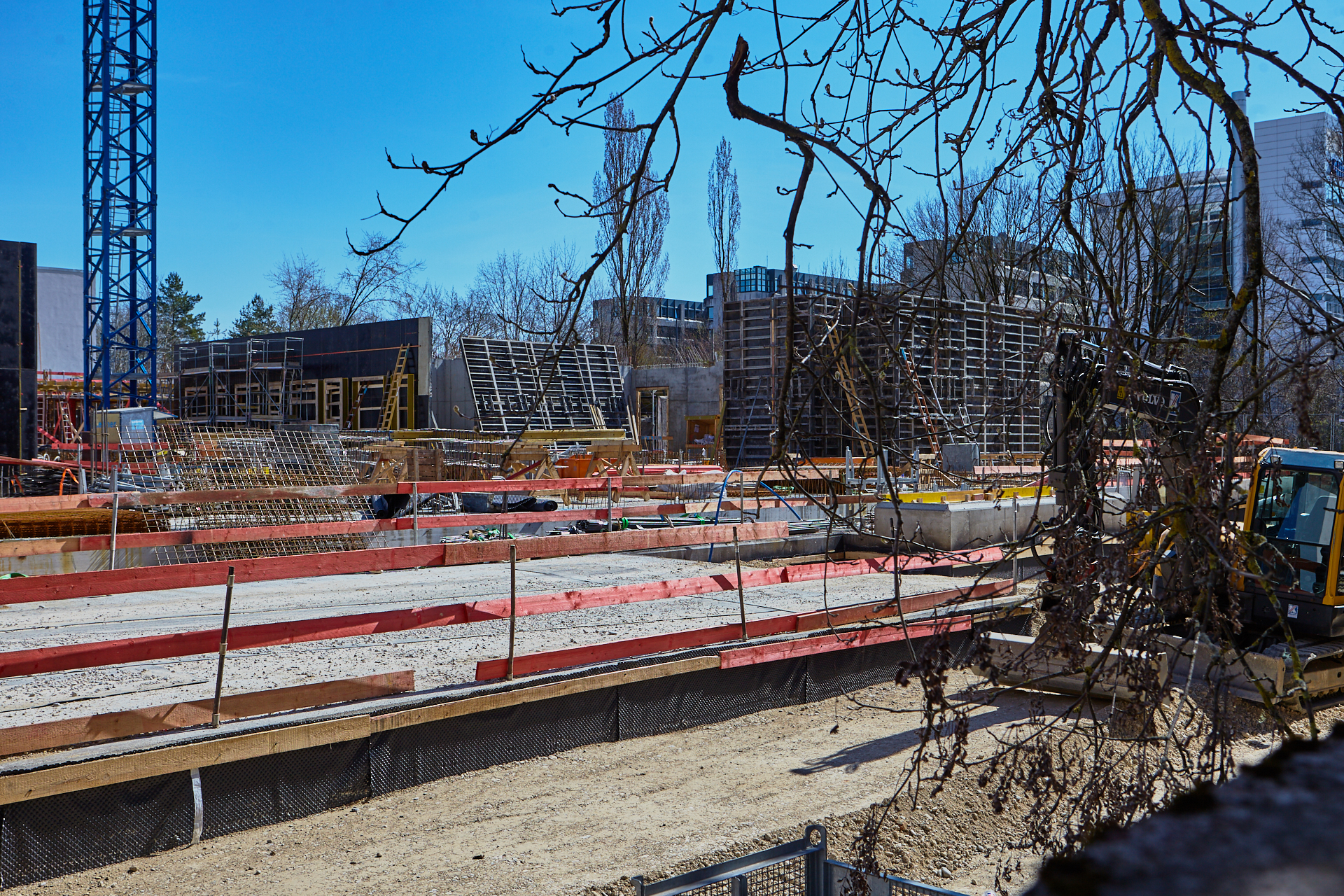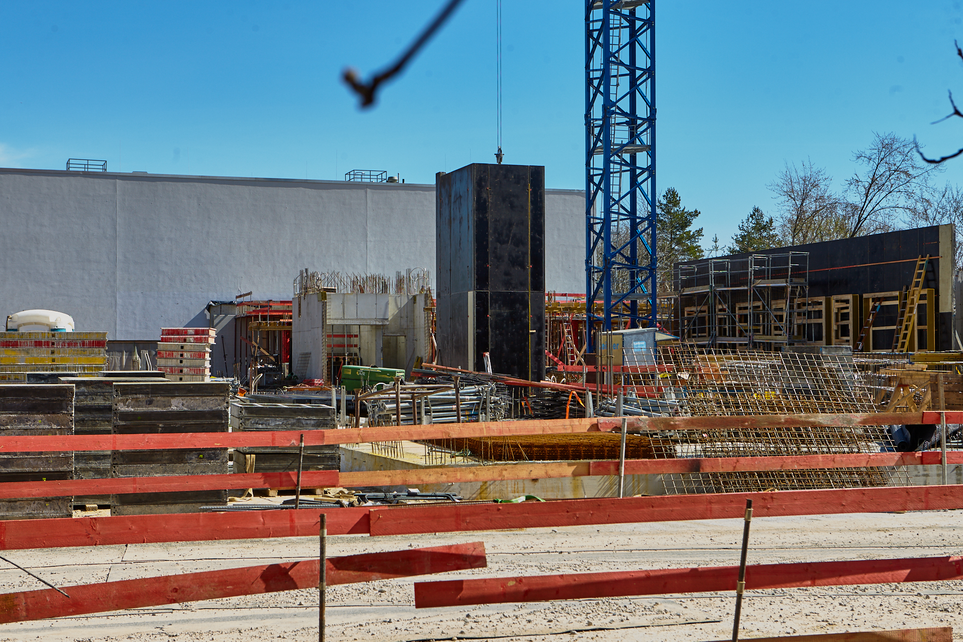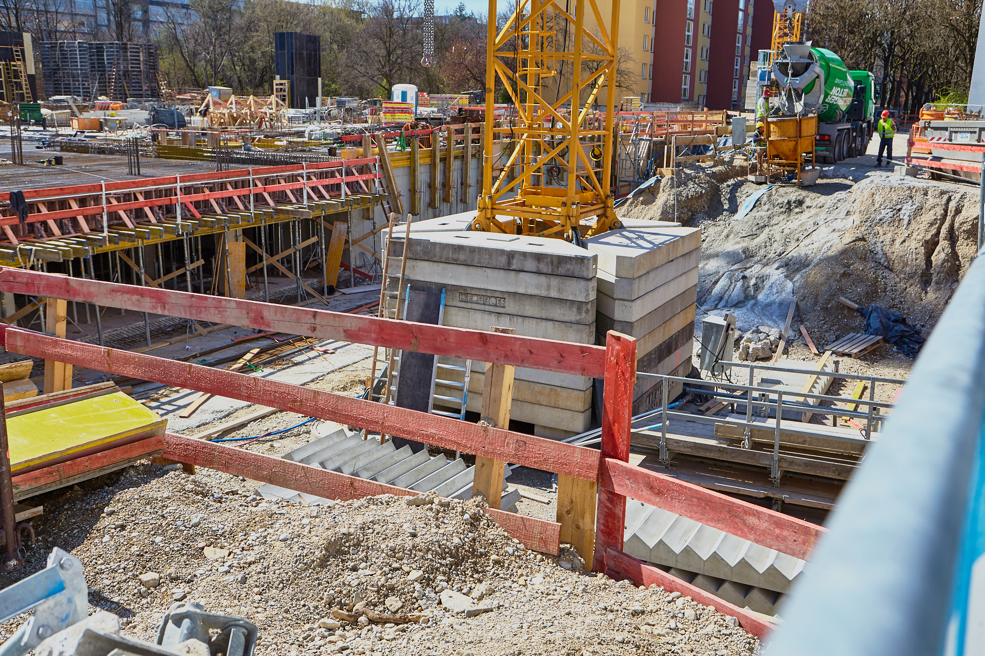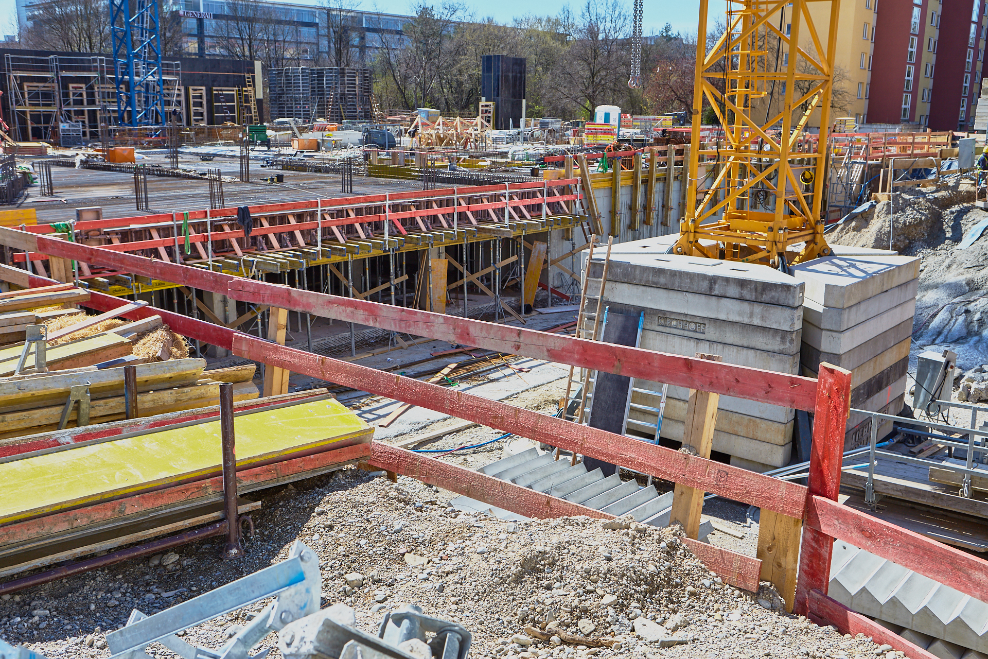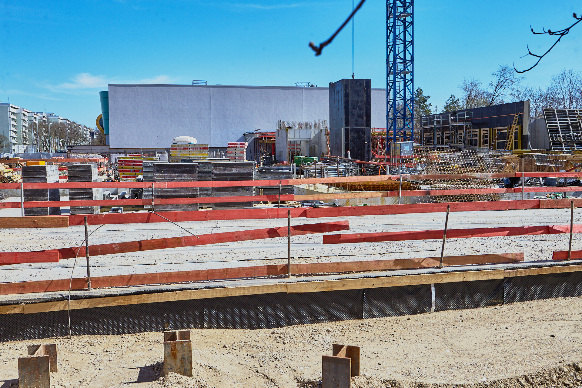 Der Keller und das Erdgeschoß des neuen LAO-Hauses werden gerade bearbeitet. Die Baustelle zum neuen LAO-HAUS, Leben am Ostpark, mit moderner Architektur und urbaner Gestaltung. Langsam wachsen die Wände am zukünftigen Wohn- und Geschäftsgebäude LAO-HAUS.