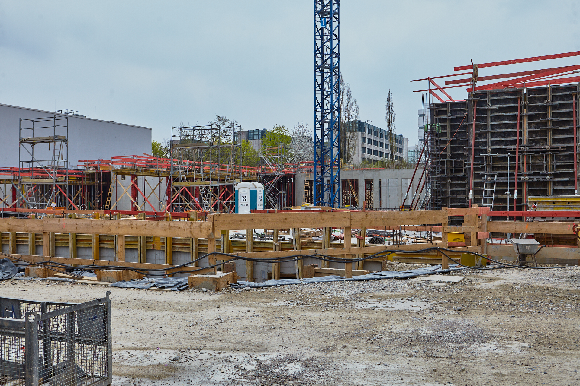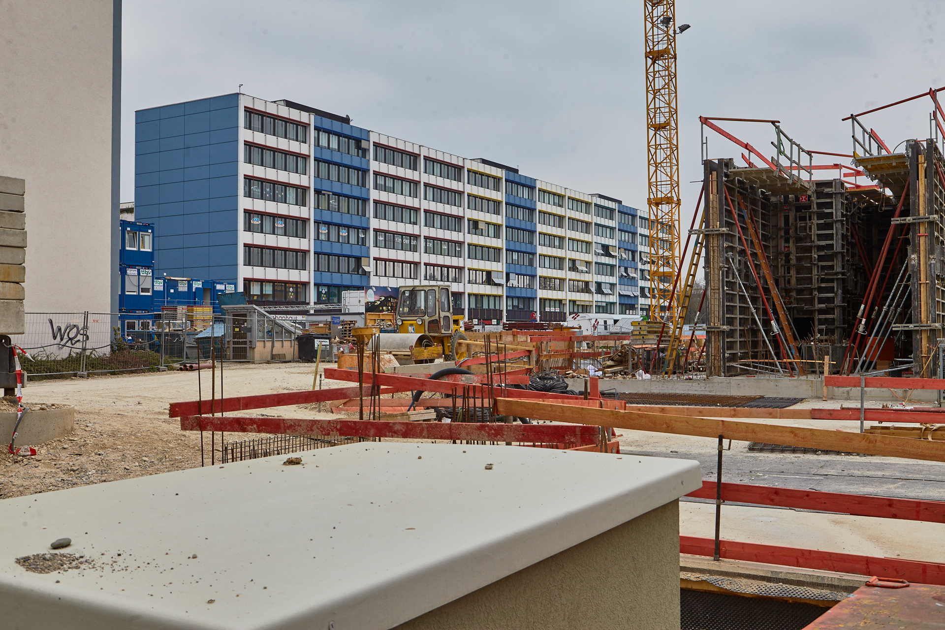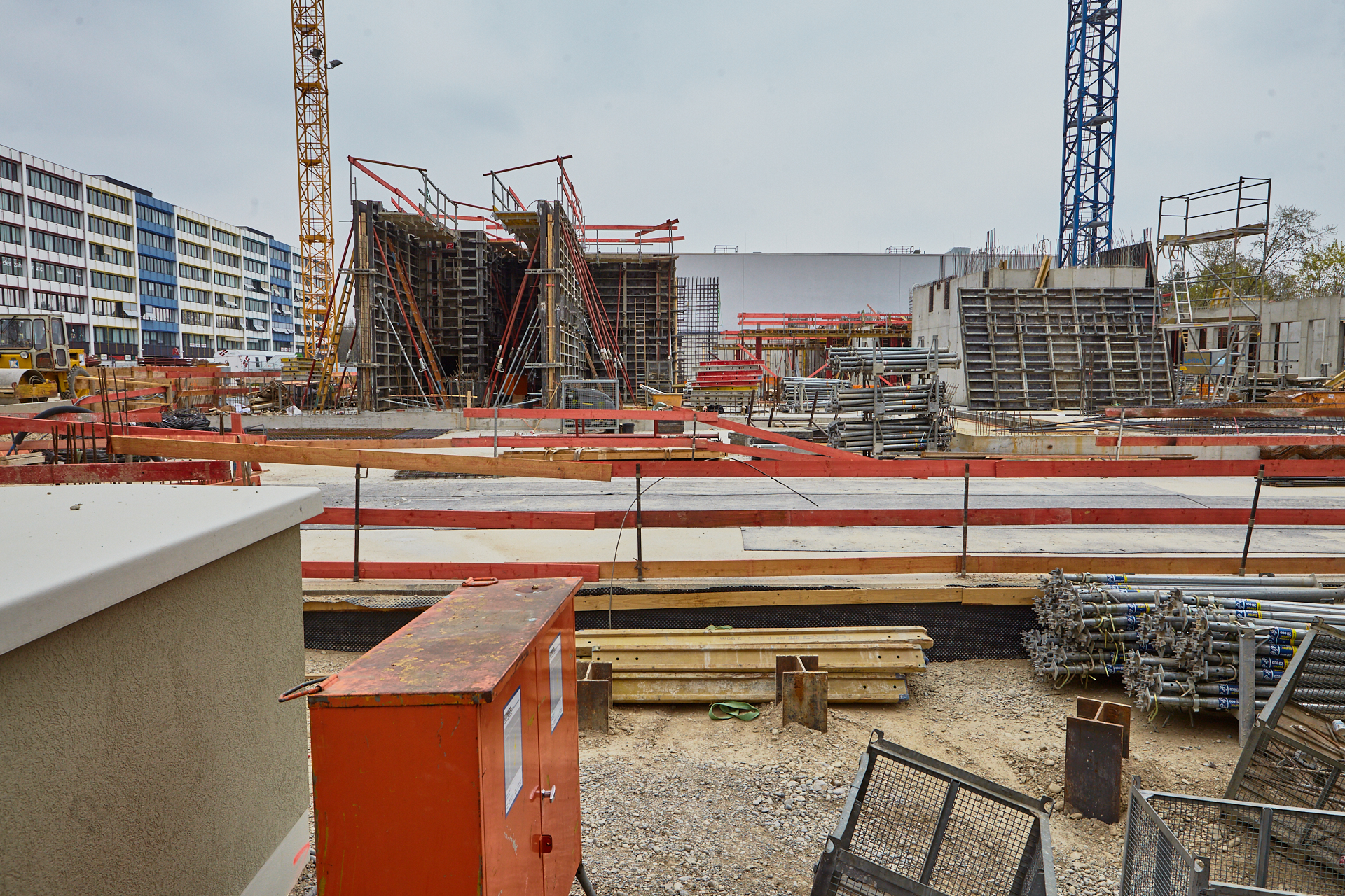Der Keller und das Erdgeschoß des neuen LAO-Hauses werden gerade bearbeitet. Die Baustelle zum neuen LAO-HAUS, Leben am Ostpark, mit moderner Architektur und urbaner Gestaltung. Langsam wachsen die Wände am zukünftigen Wohn- und Geschäftsgebäude LAO-HAUS.