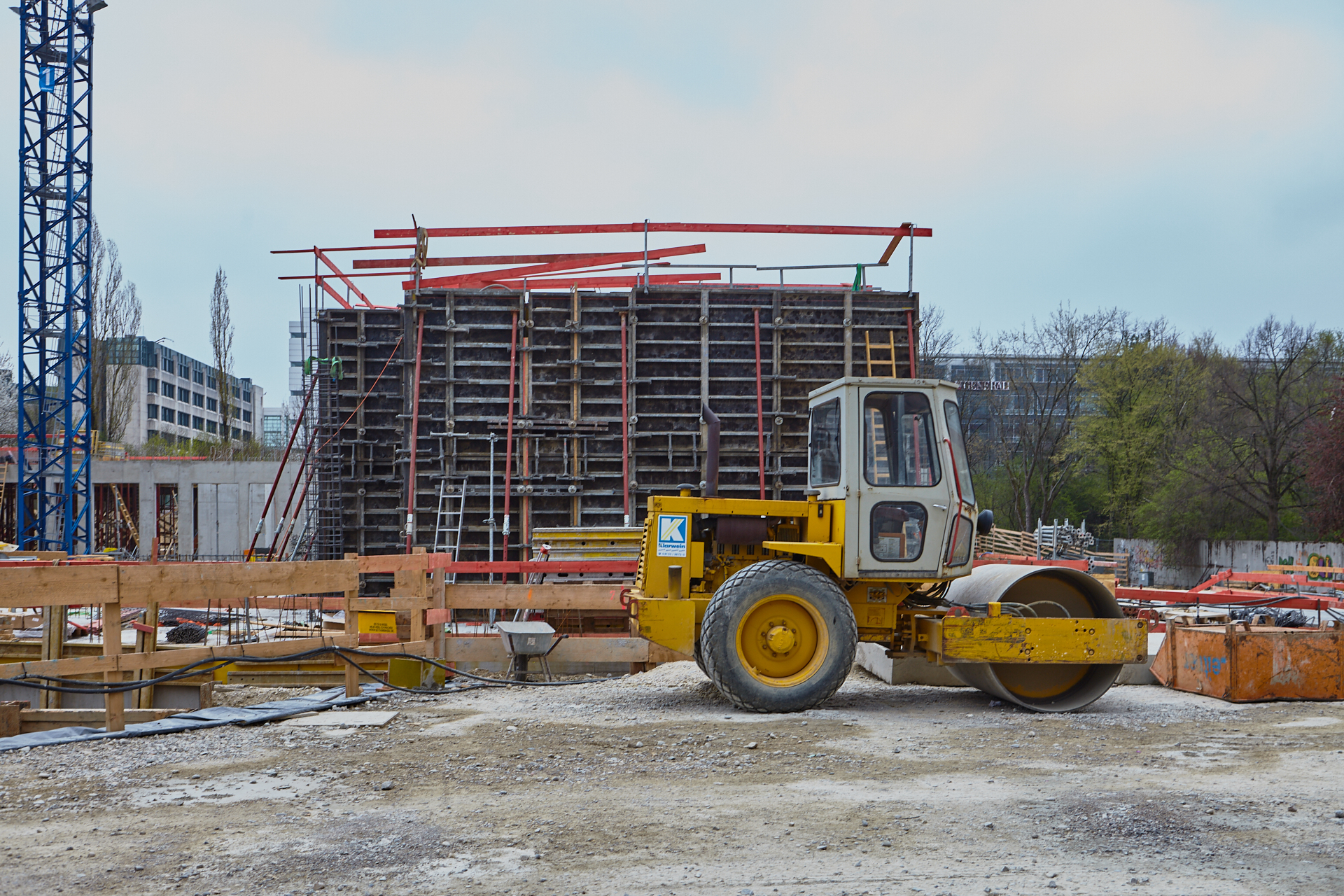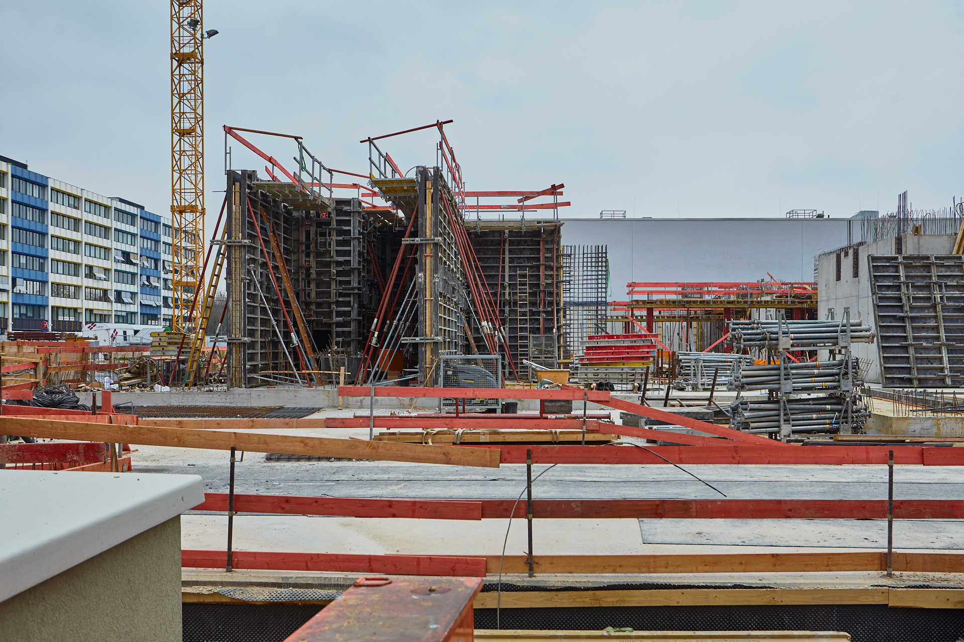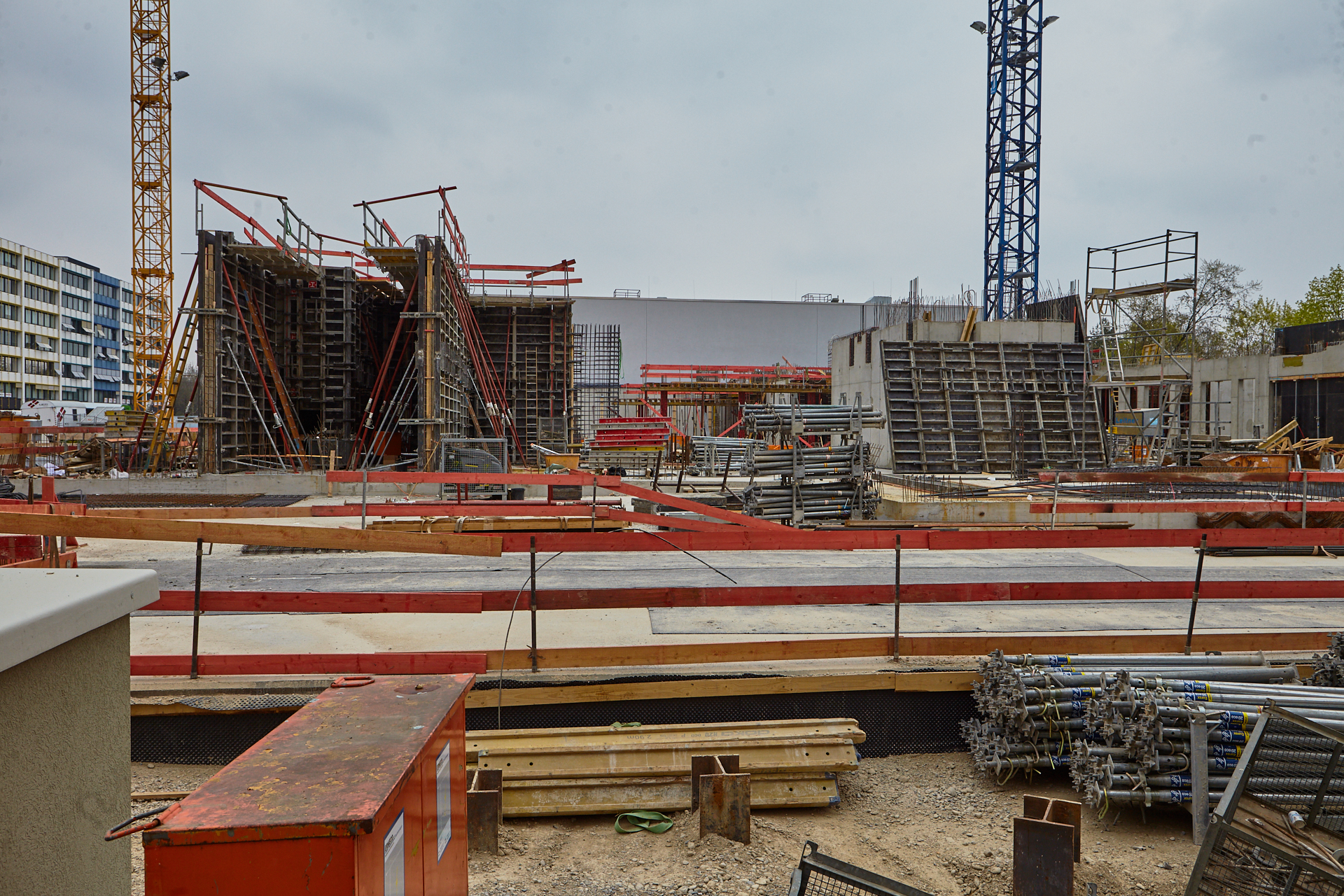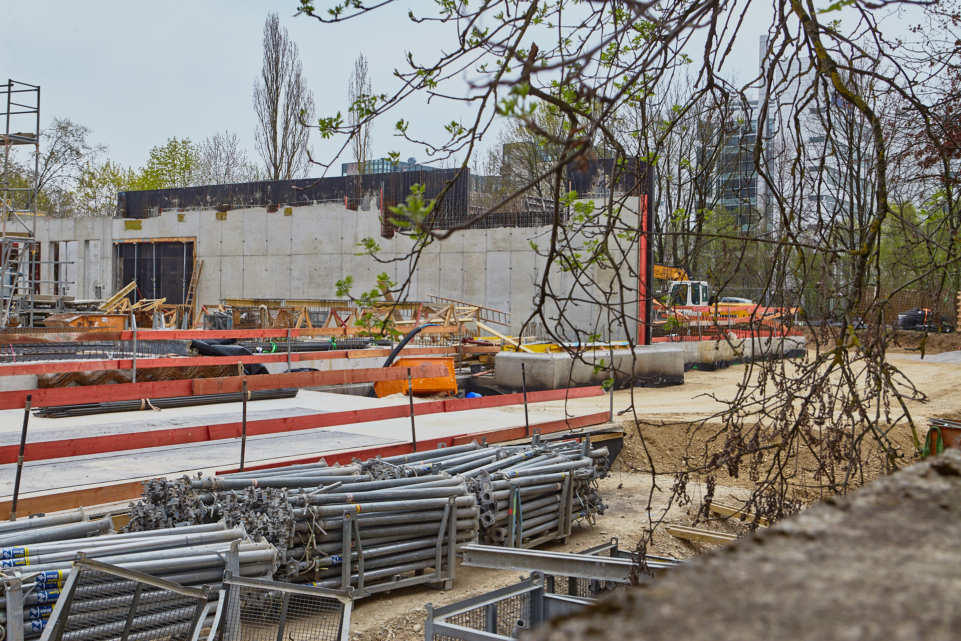 Der Keller und das Erdgeschoß des neuen LAO-Hauses werden gerade bearbeitet. Die Baustelle zum neuen LAO-HAUS, Leben am Ostpark, mit moderner Architektur und urbaner Gestaltung. Langsam wachsen die Wände am zukünftigen Wohn- und Geschäftsgebäude LAO-HAUS.