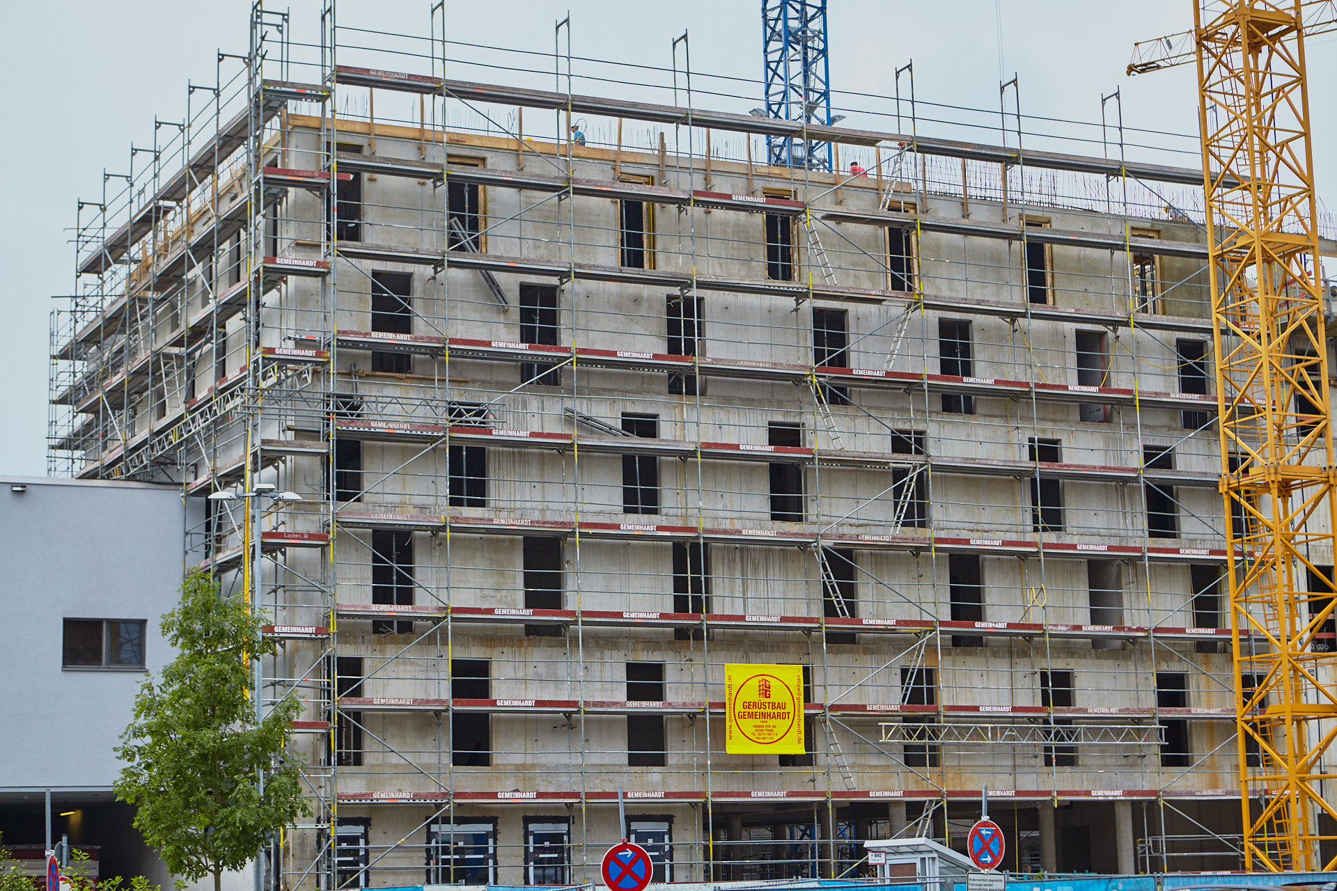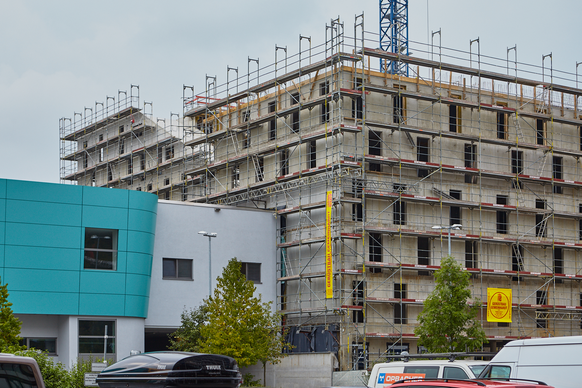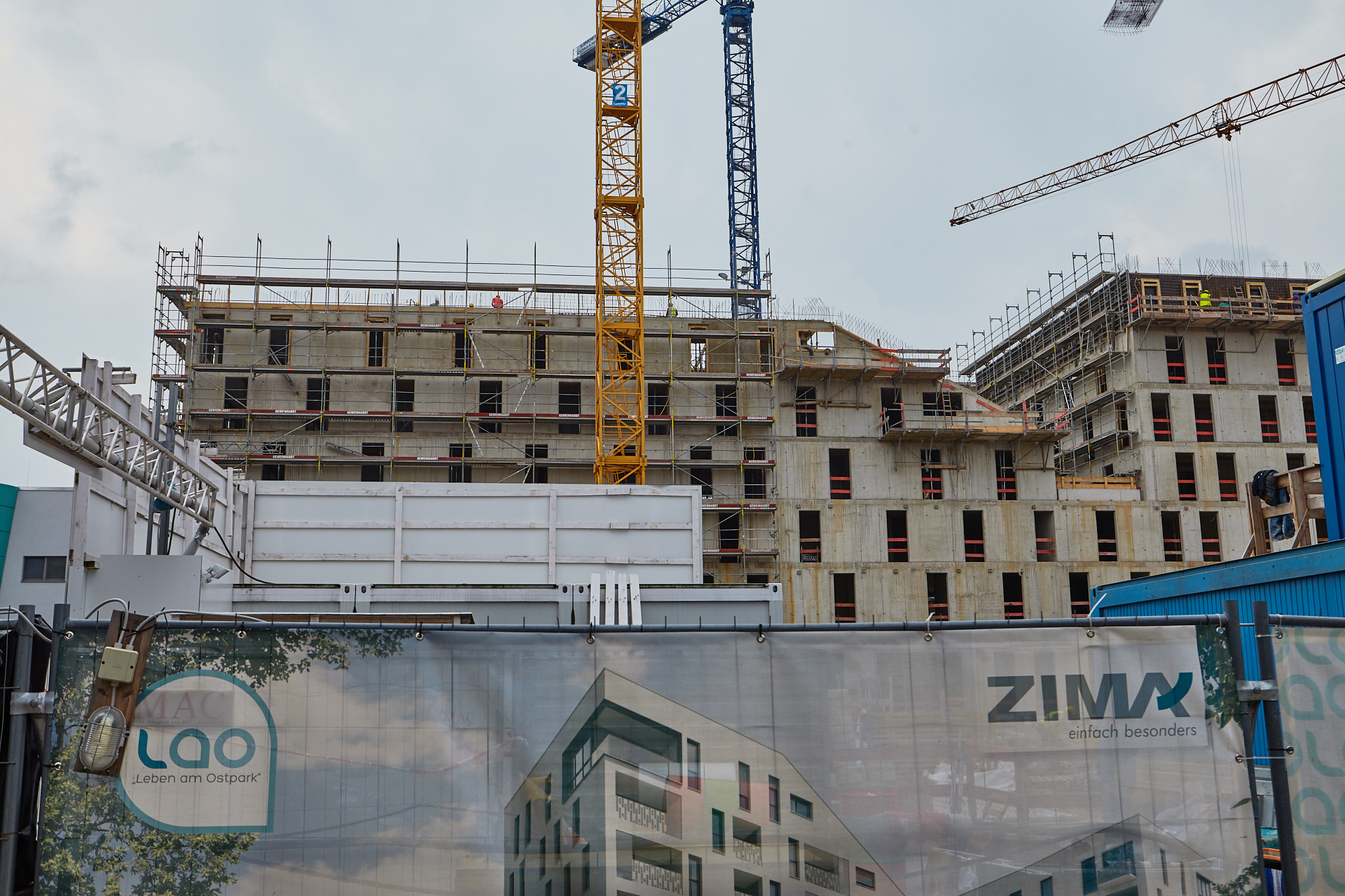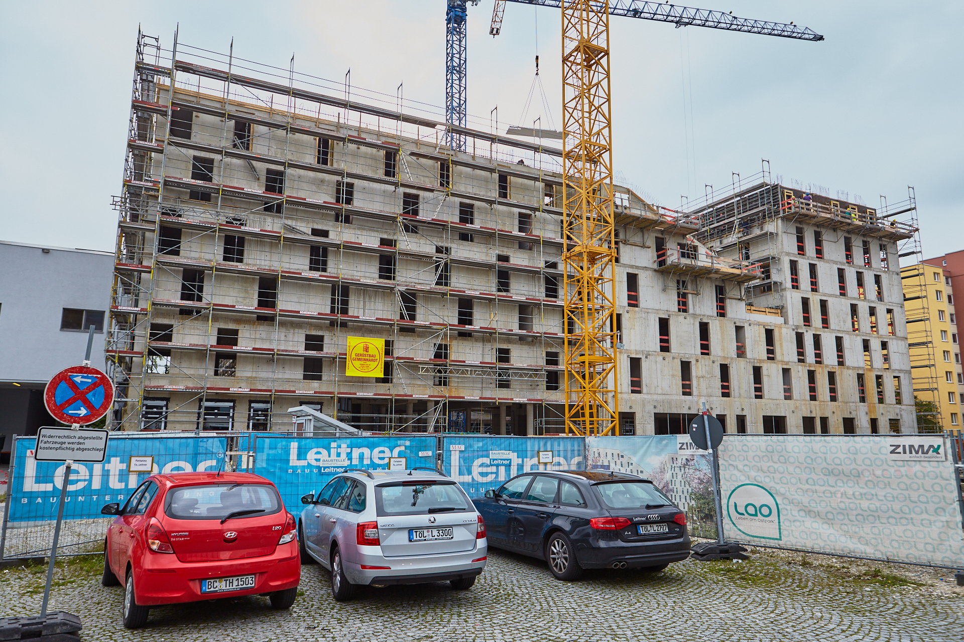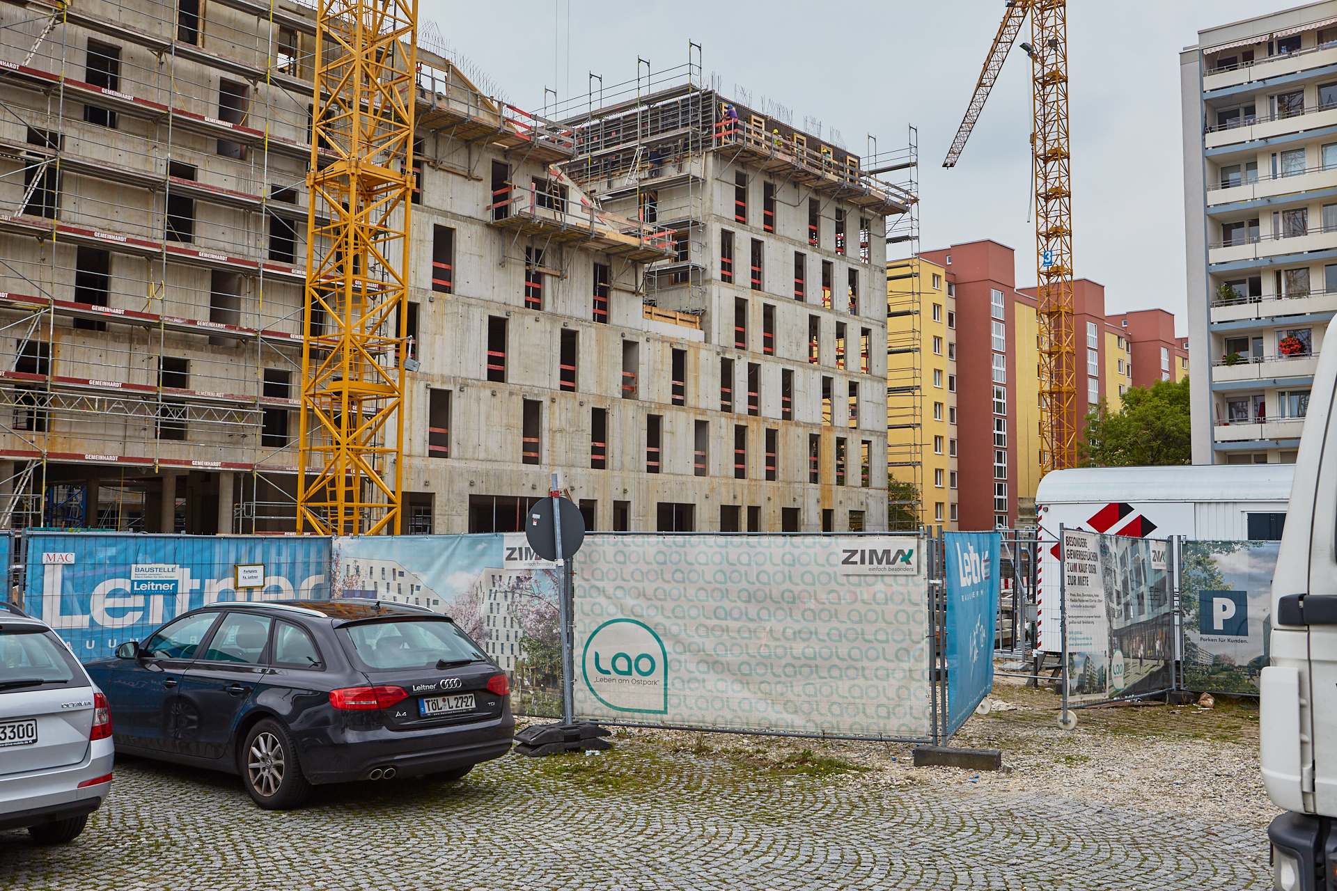Der Rohbau an einigen der vier "Türmen" ist noch nicht abgeschlossen. Hier gehen die BAuarbeiten weiter. Die Bausetelle LAO-HAUS zeigt immer mehr, wie das fertige Gebäude aussehen wird.