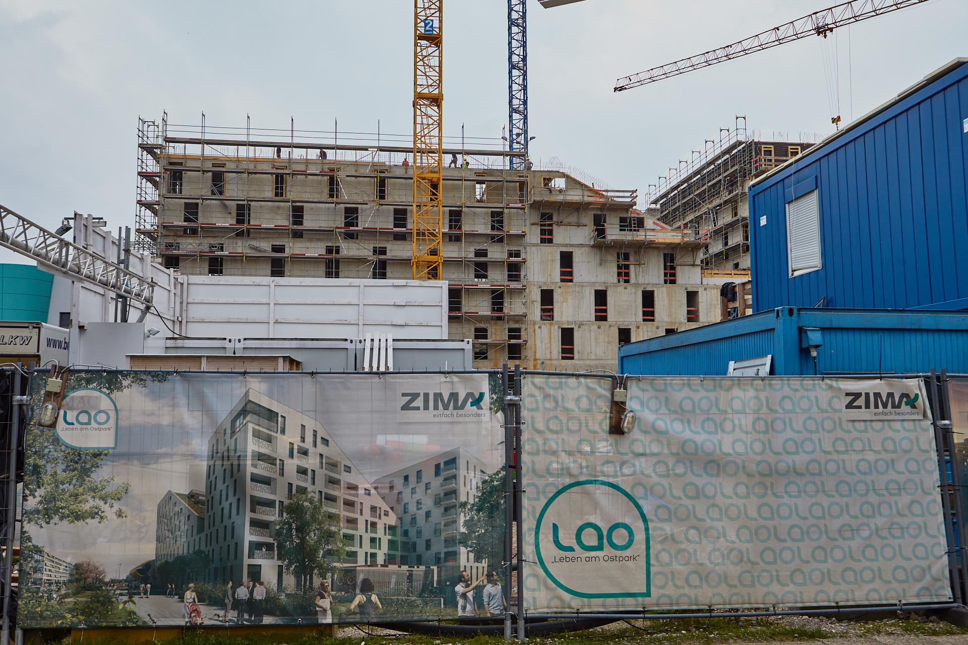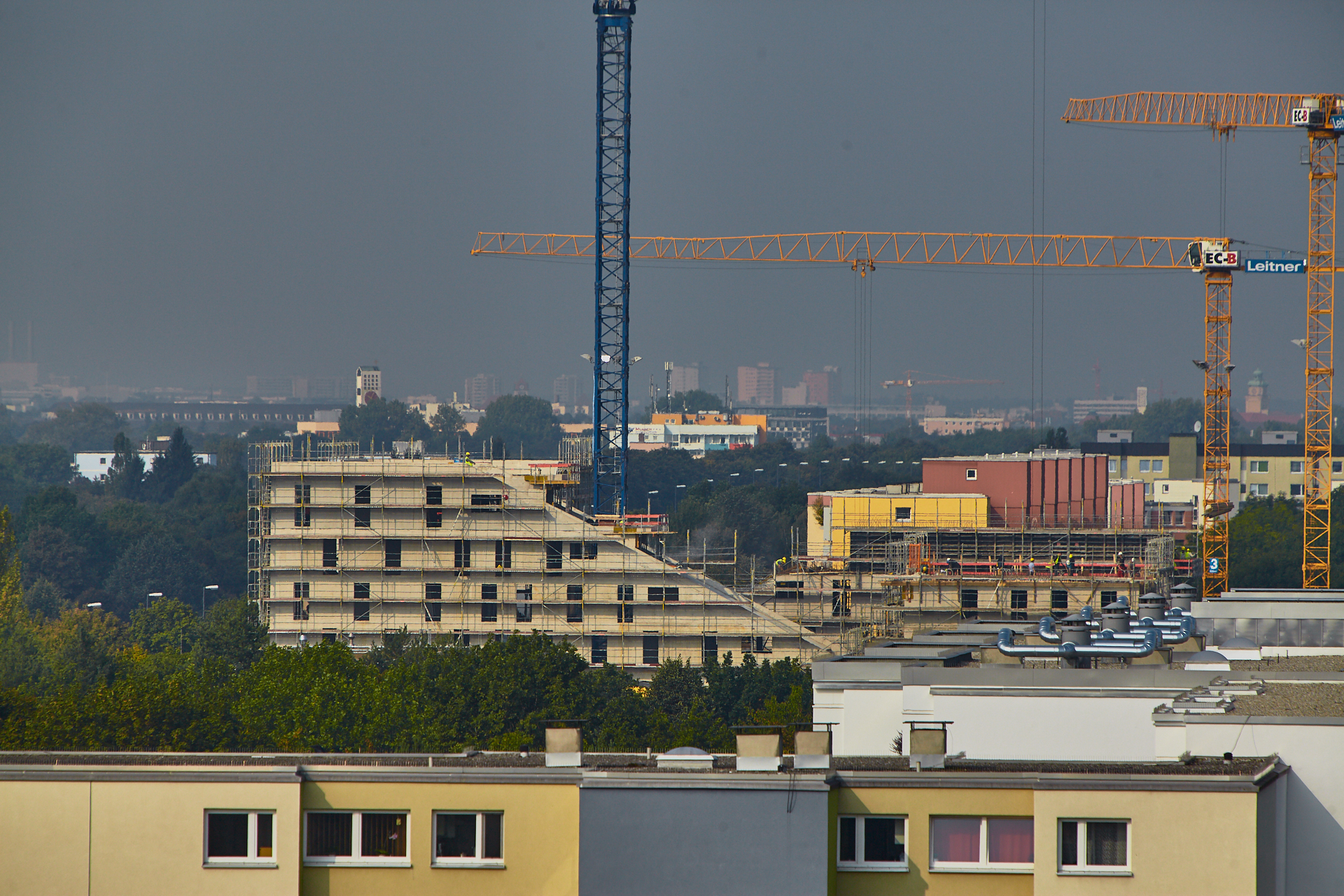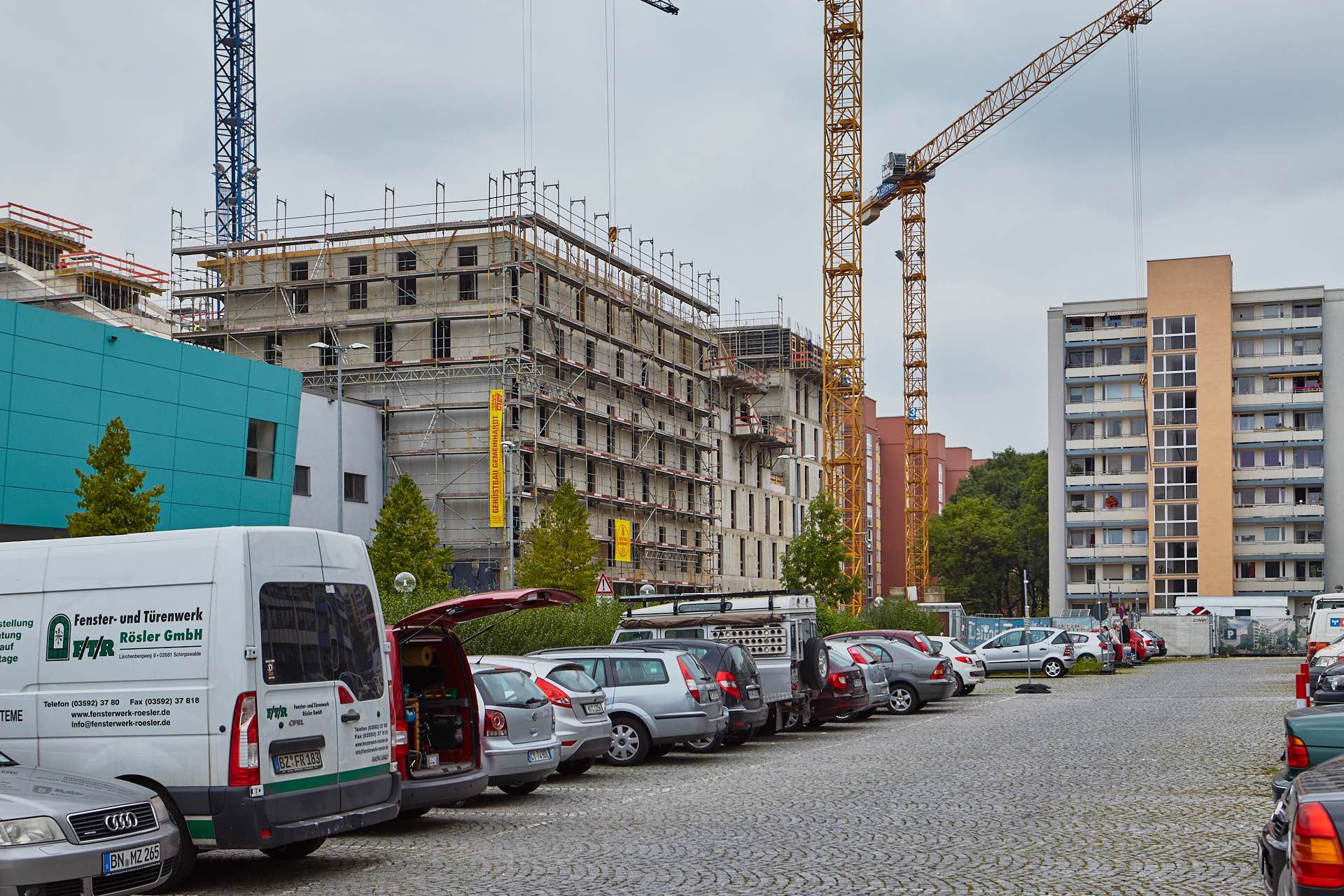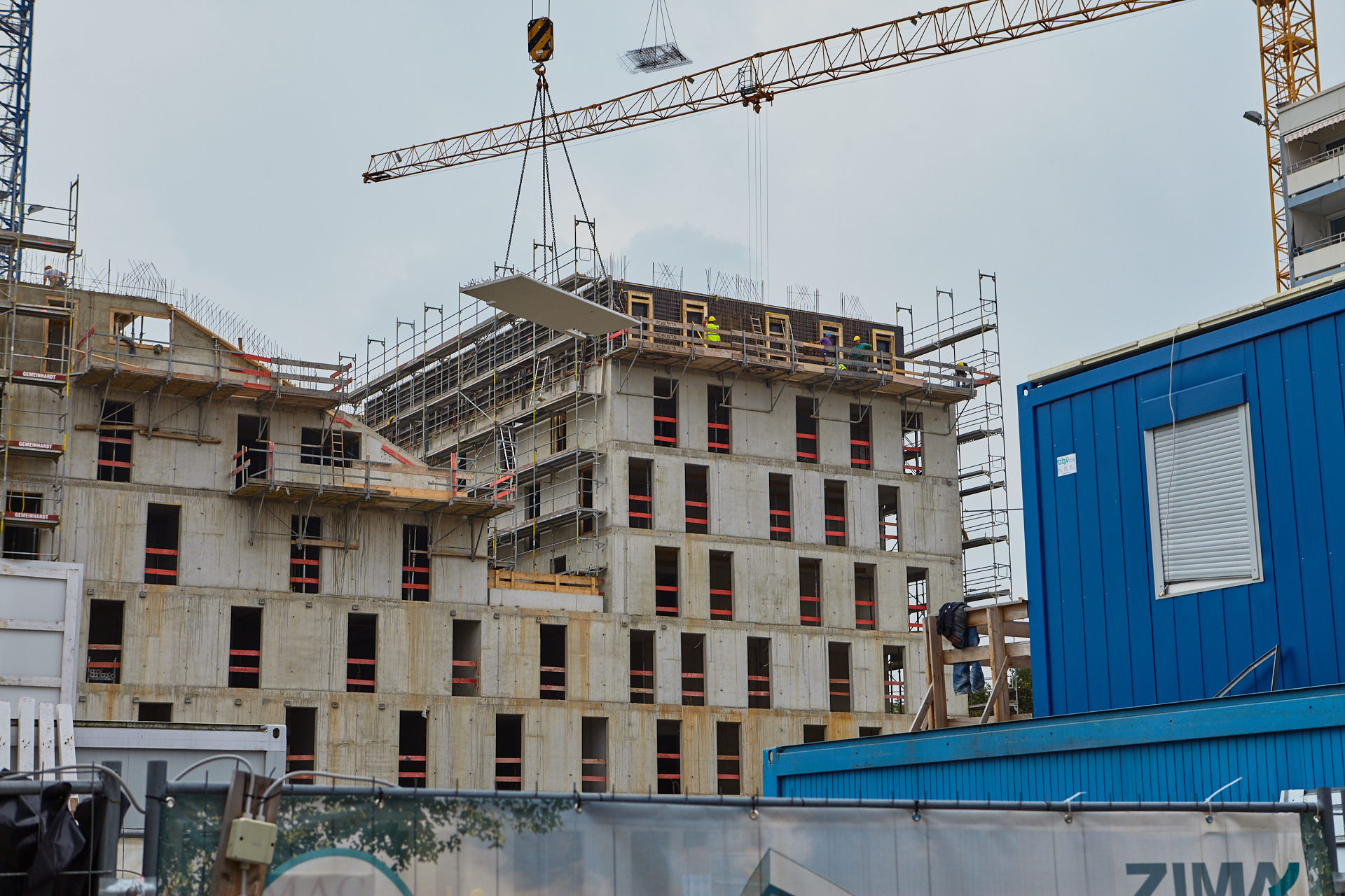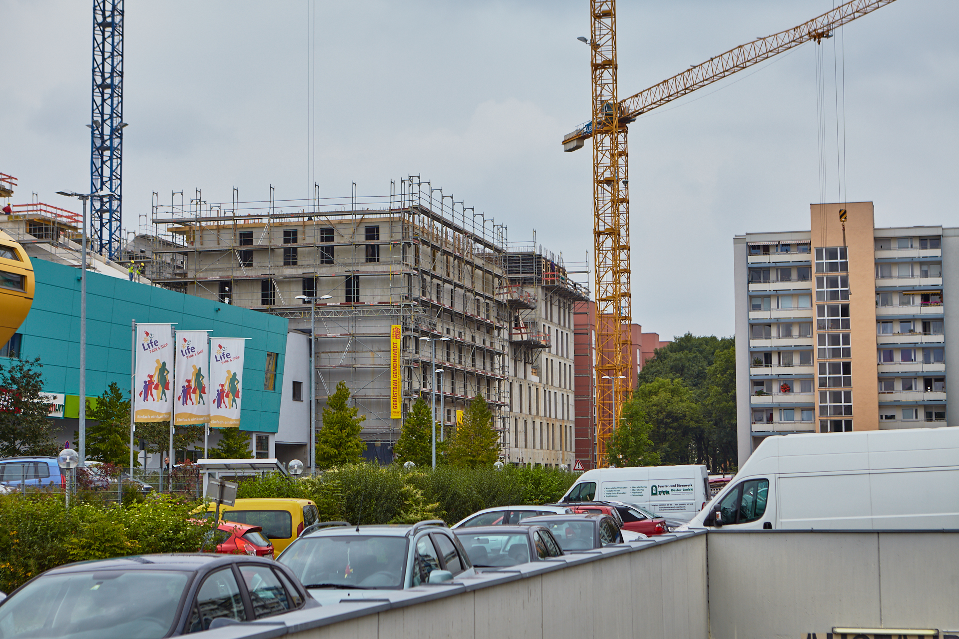 Der Rohbau an einigen der vier "Türmen" ist noch nicht abgeschlossen. Hier gehen die BAuarbeiten weiter. Die Bausetelle LAO-HAUS zeigt immer mehr, wie das fertige Gebäude aussehen wird.