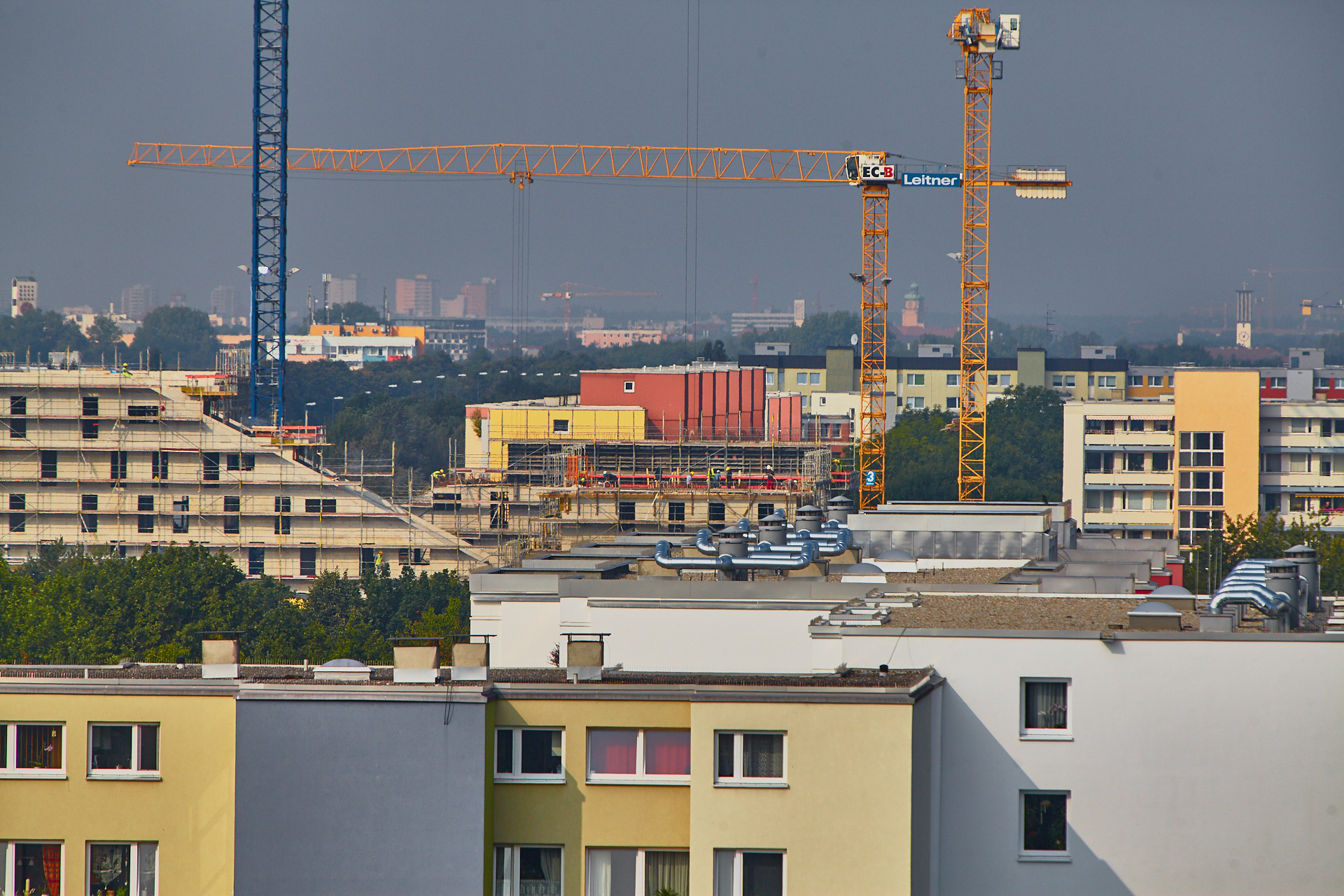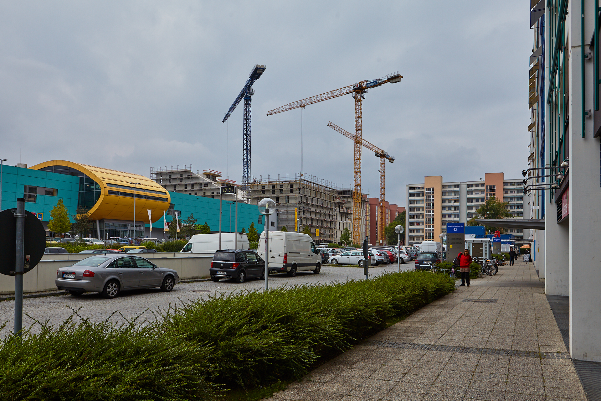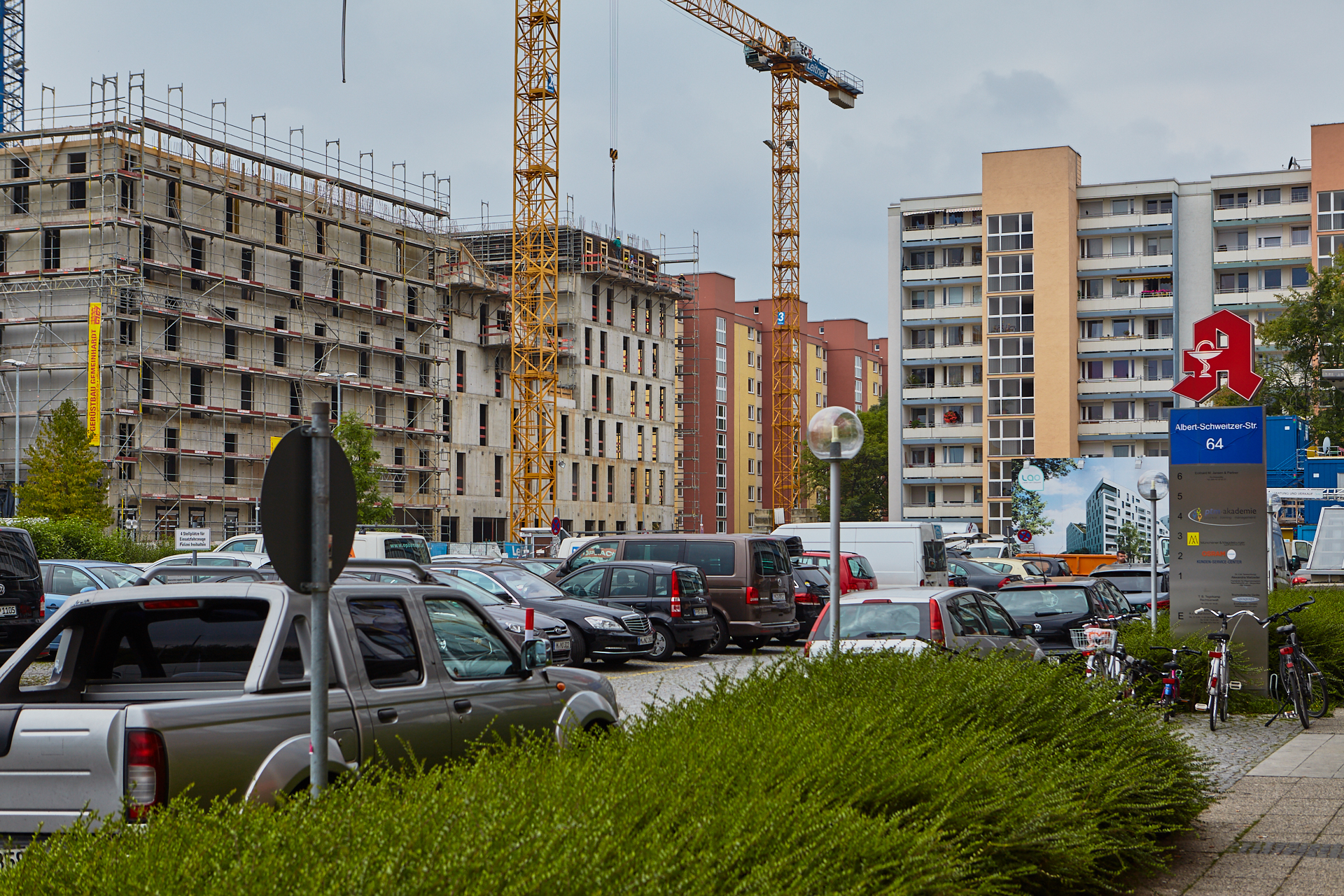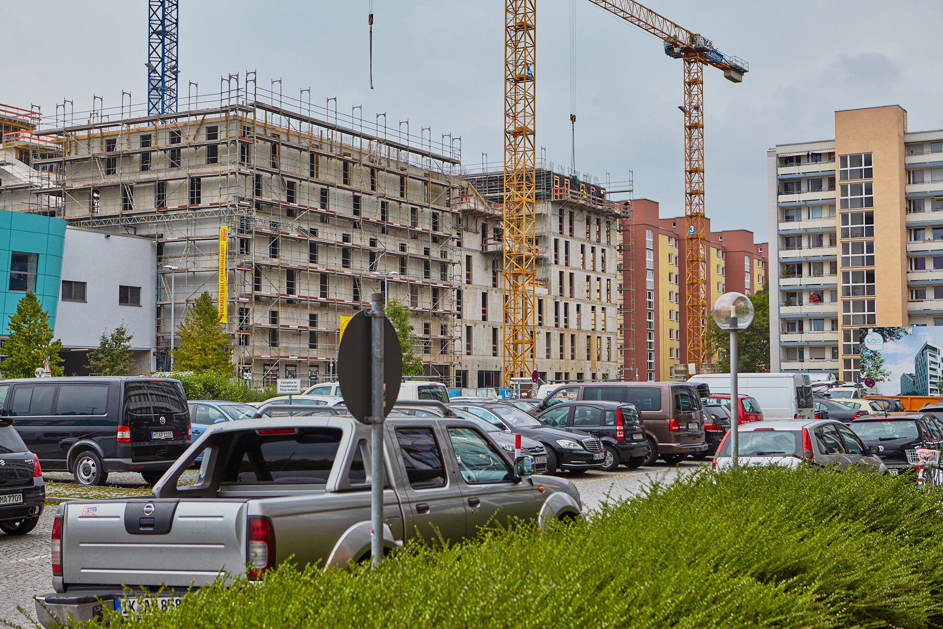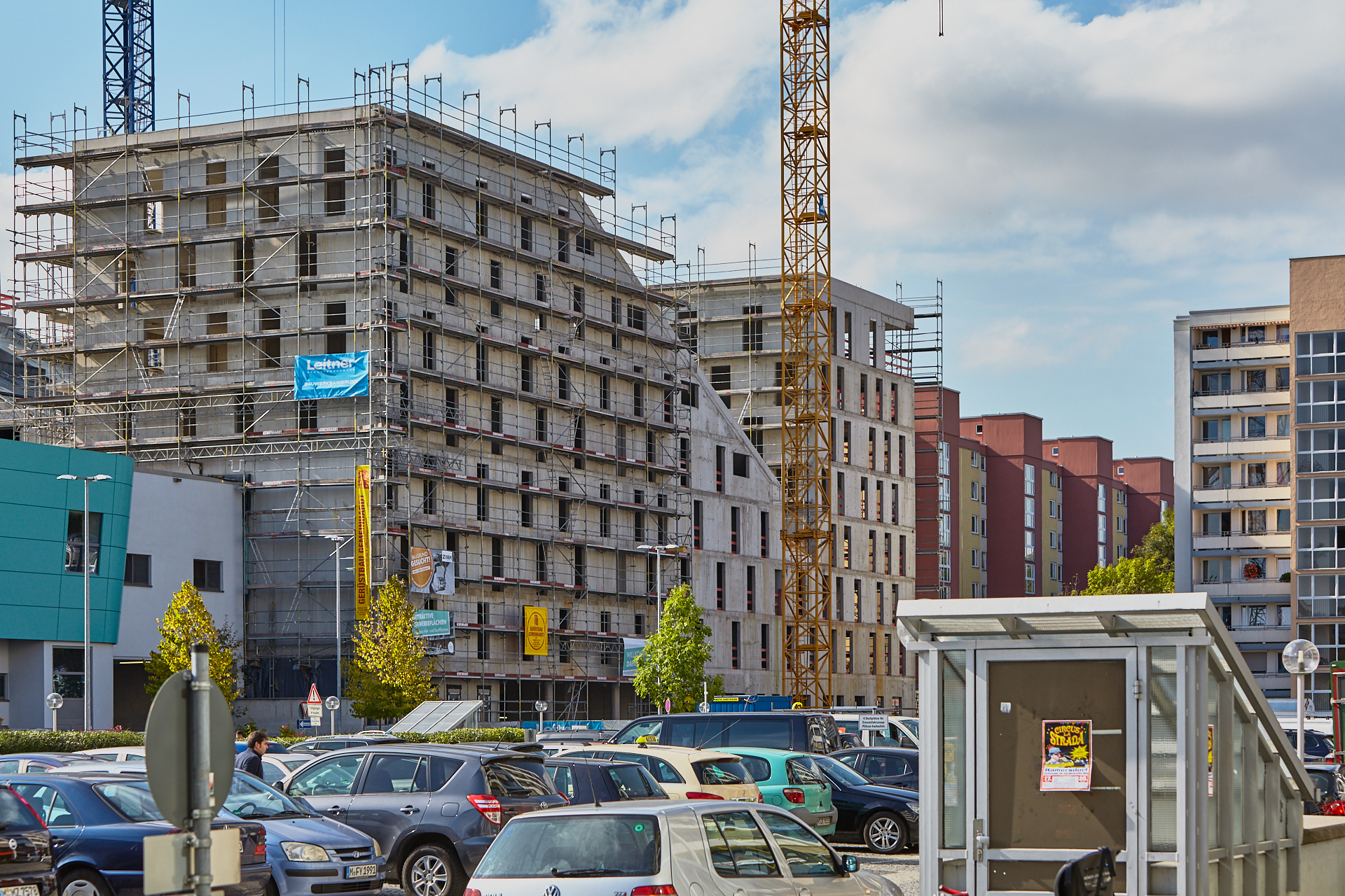 Der Rohbau an einigen der vier "Türmen" ist noch nicht abgeschlossen. Hier gehen die BAuarbeiten weiter. Die Bausetelle LAO-HAUS zeigt immer mehr, wie das fertige Gebäude aussehen wird.
