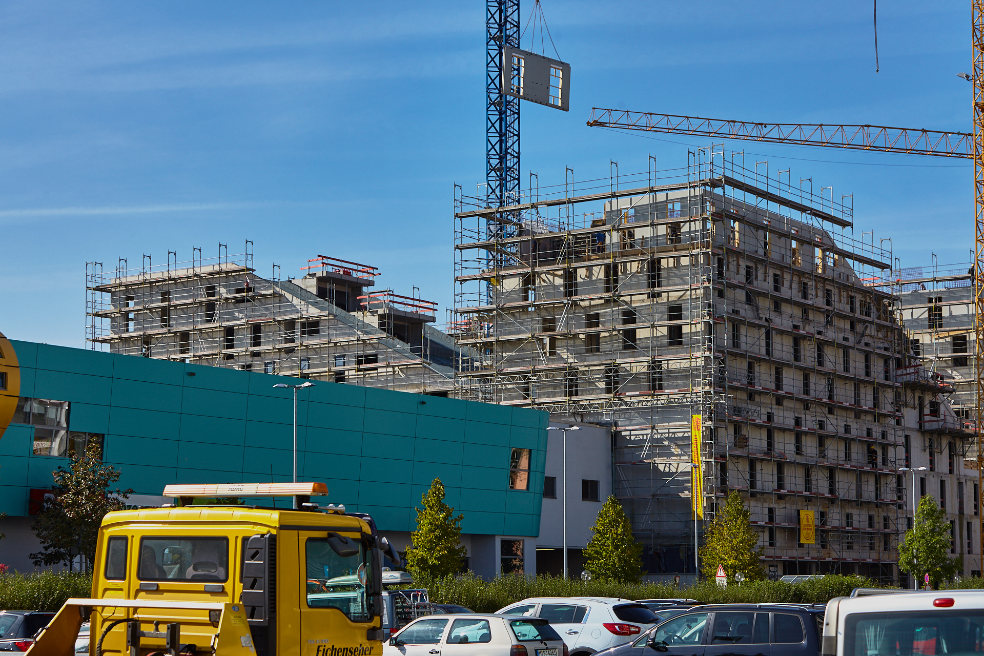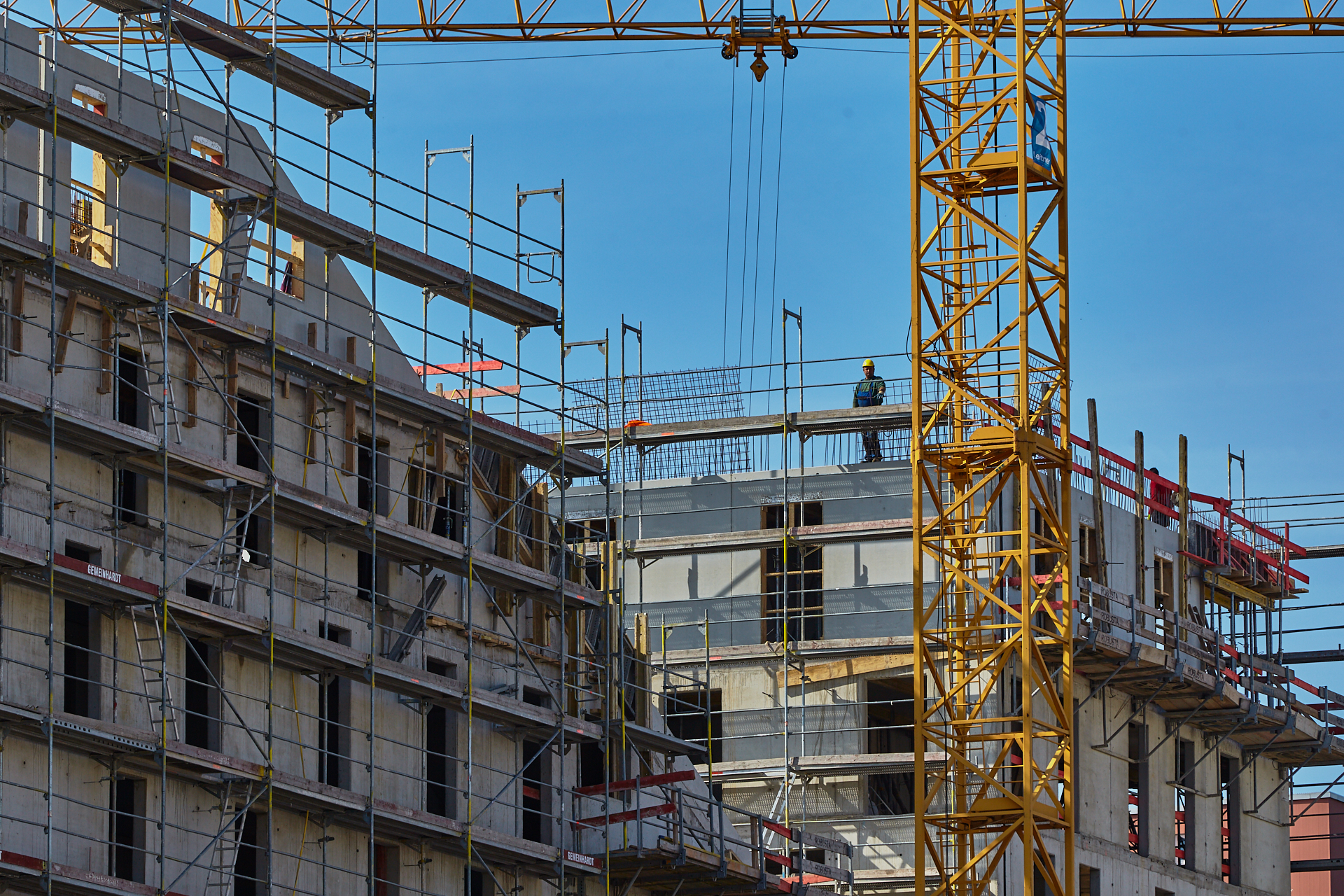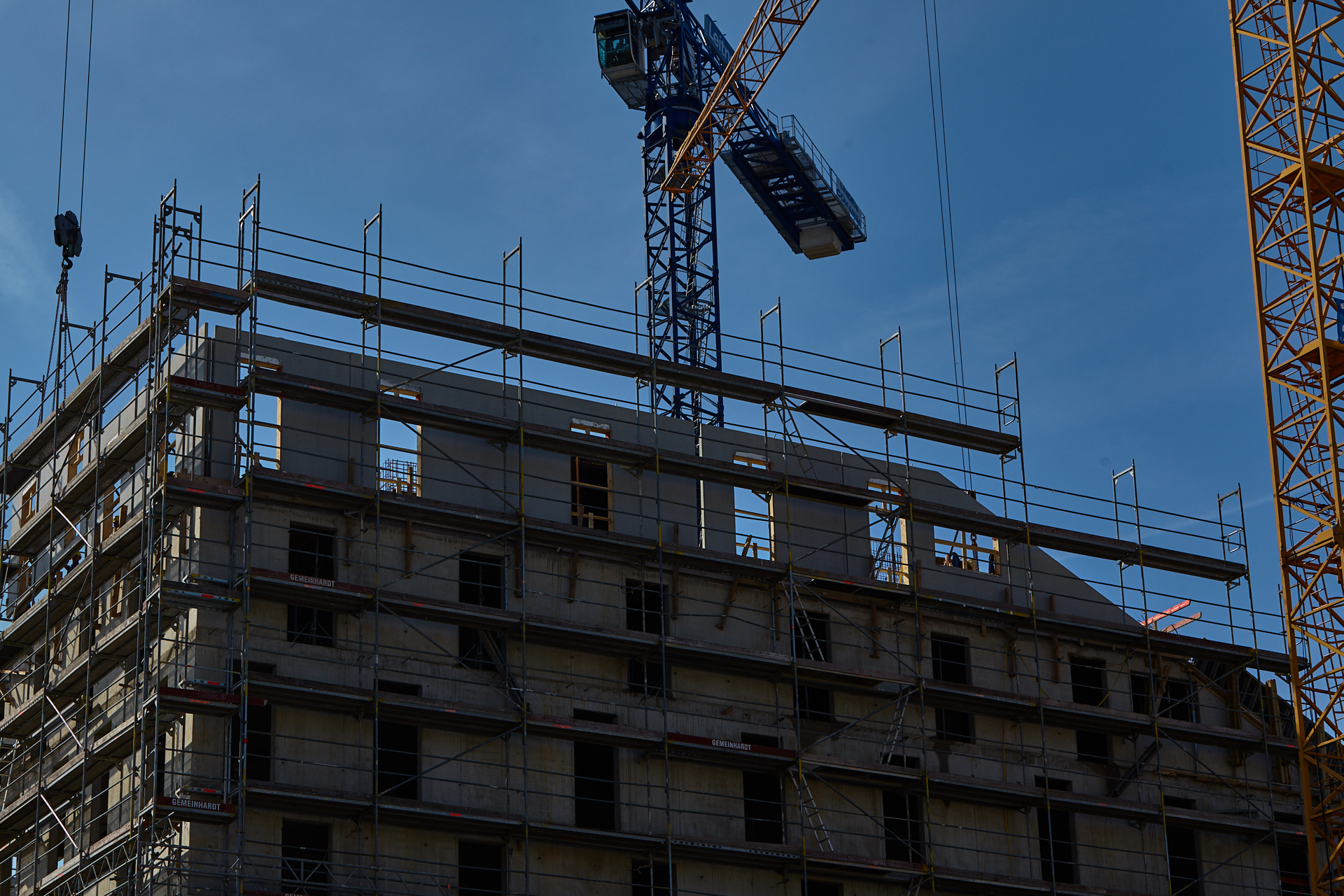 Der Rohbau an einigen der vier "Türmen" ist noch nicht abgeschlossen. Hier gehen die BAuarbeiten weiter. Die Bausetelle LAO-HAUS zeigt immer mehr, wie das fertige Gebäude aussehen wird.