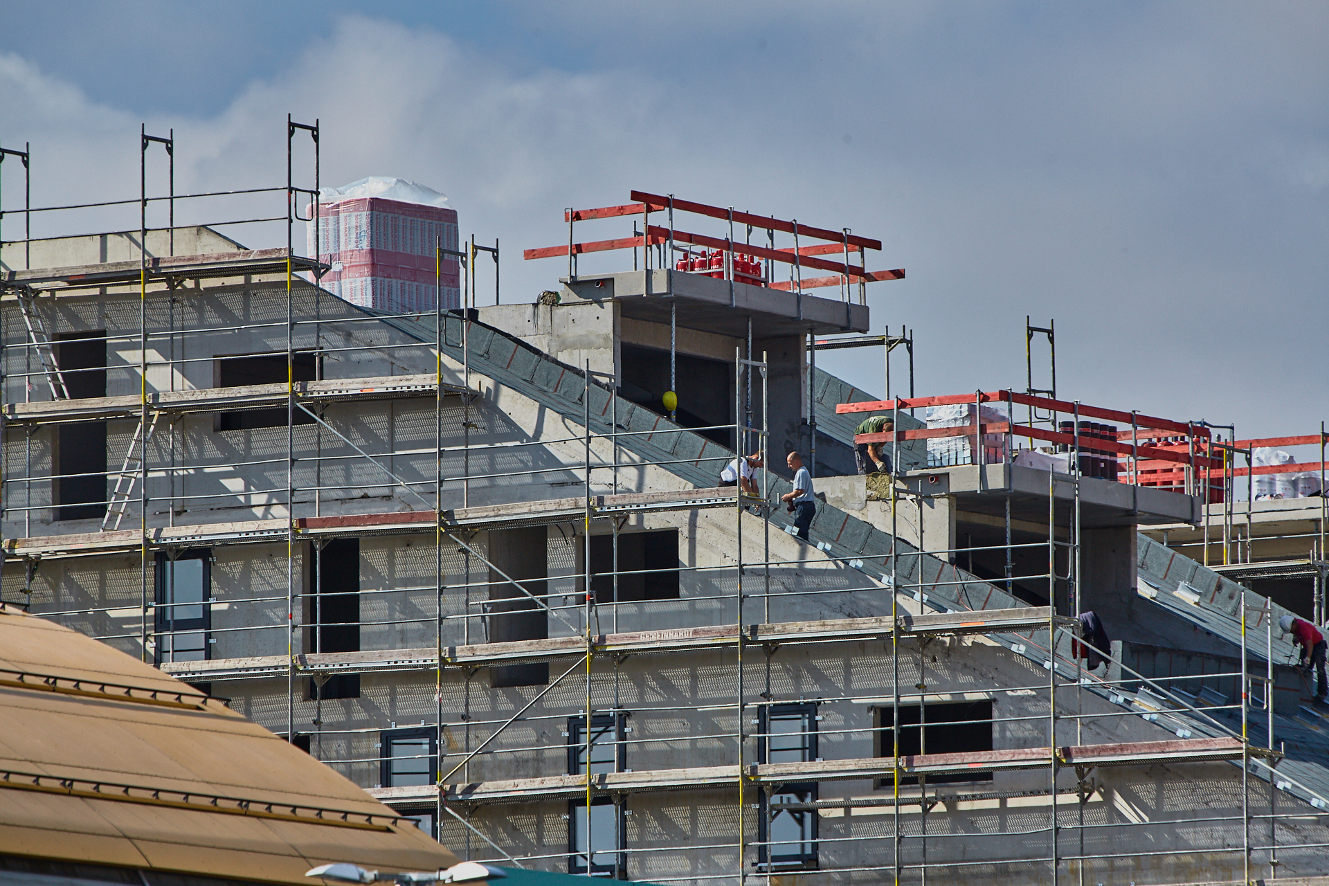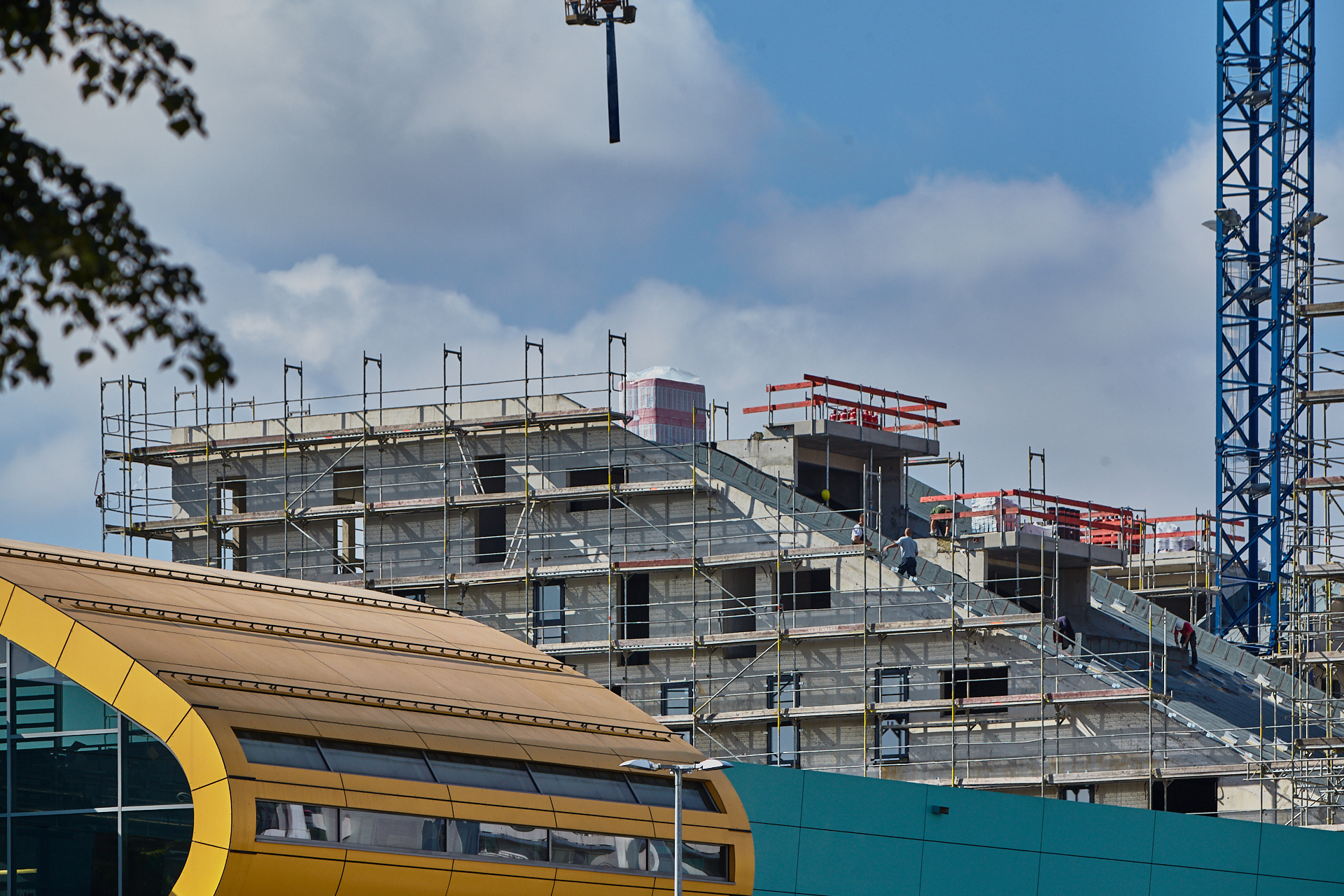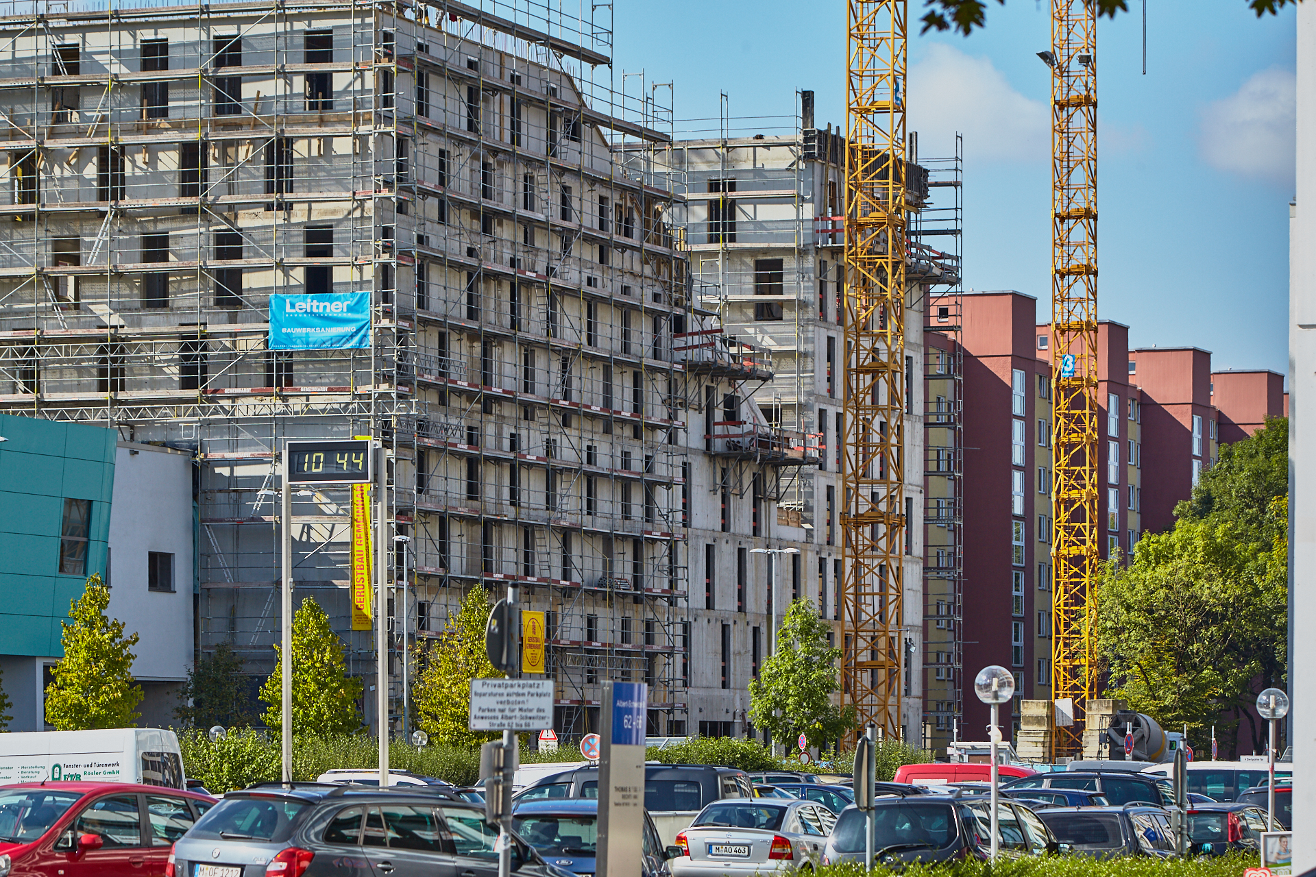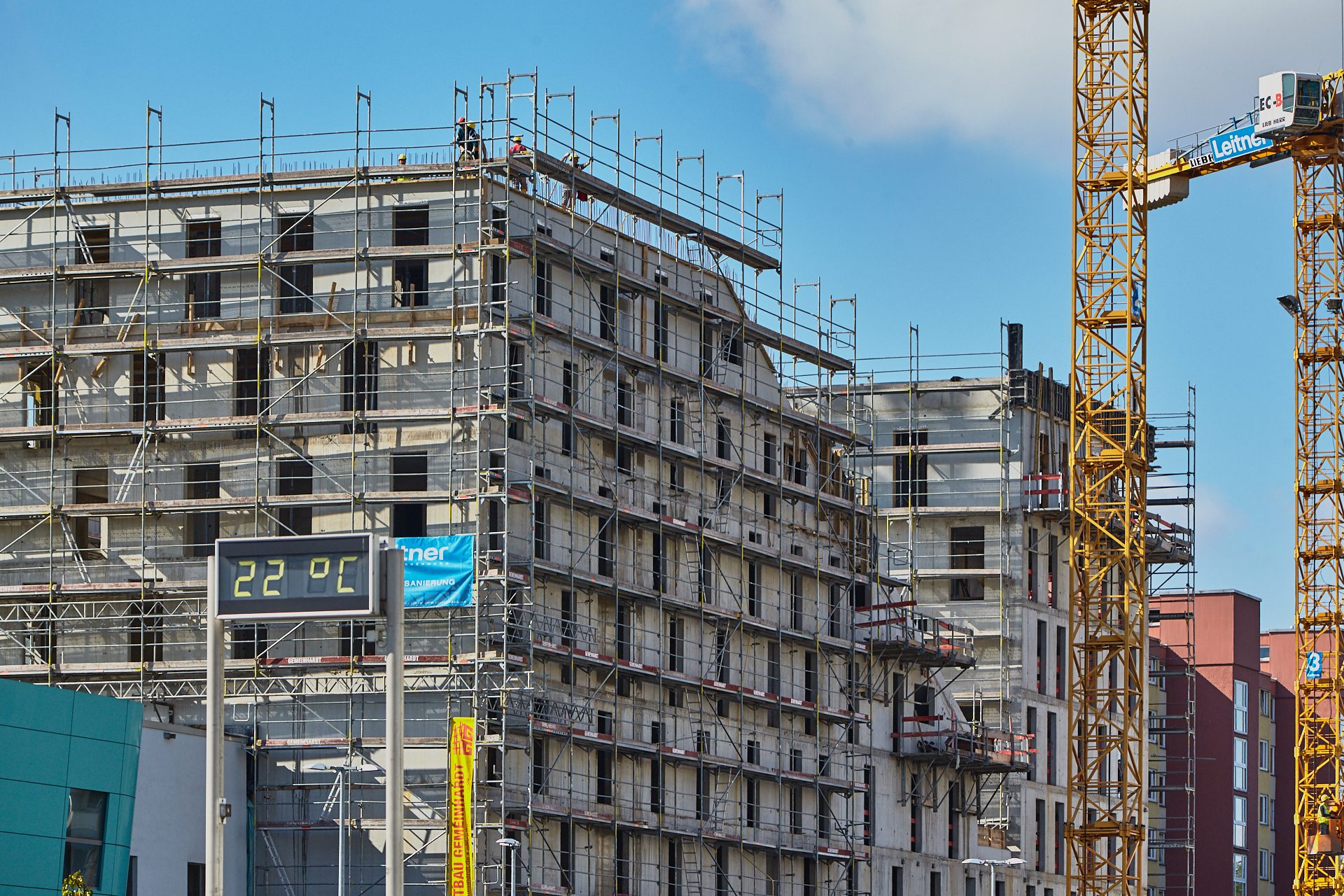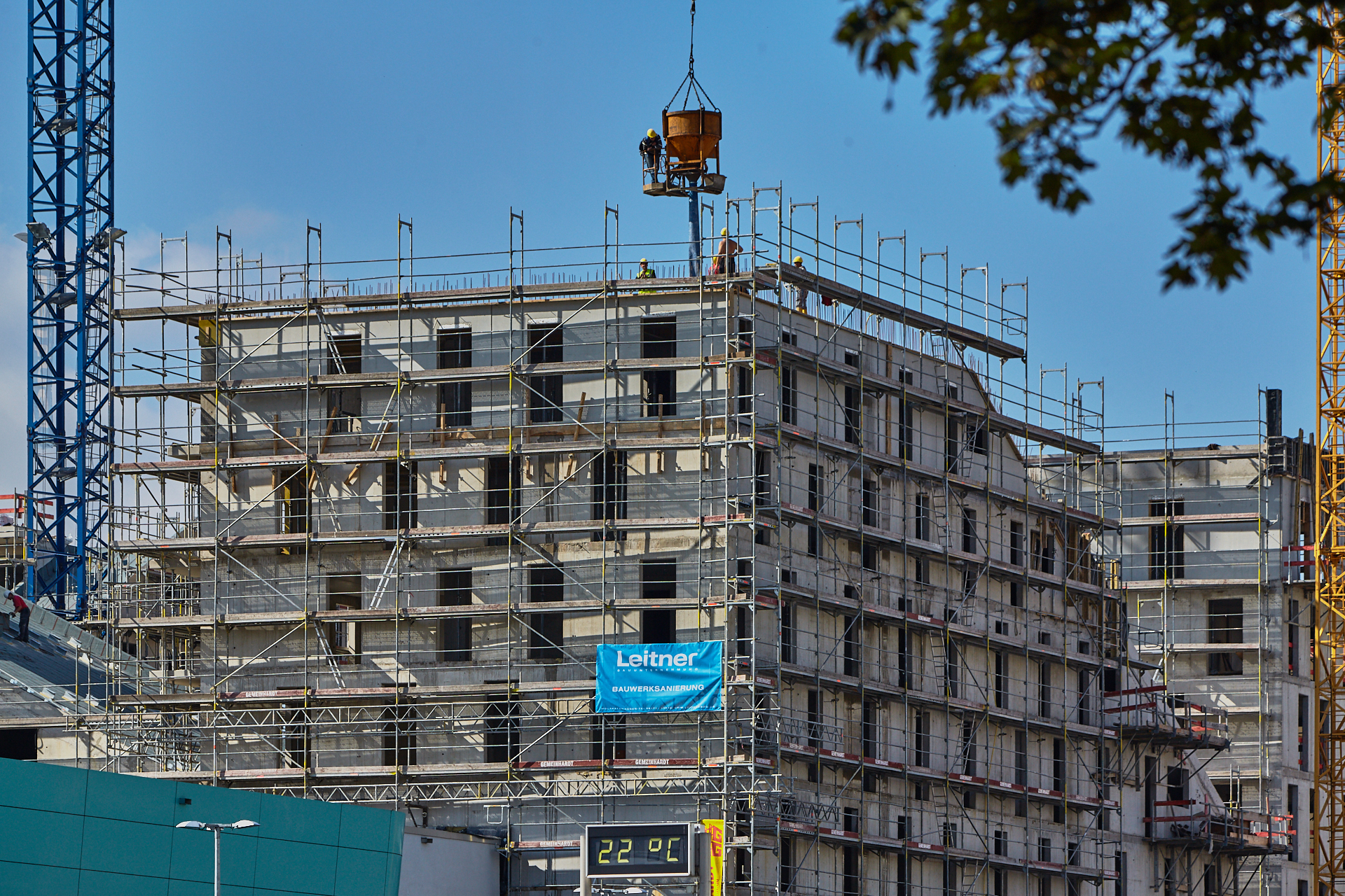 Teilweise ist die Baustelle am LAO-Haus mit einem Gerüst ummantelt. Die anderen Teile sind noch im Rohbau.