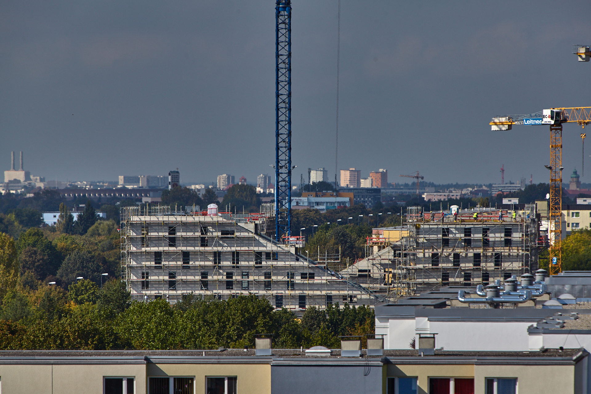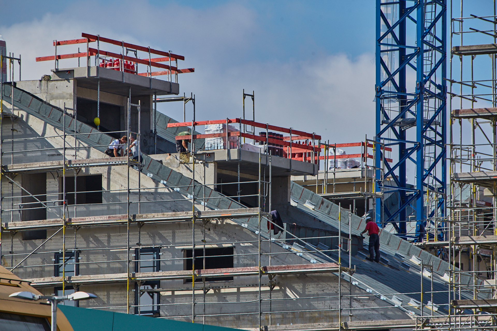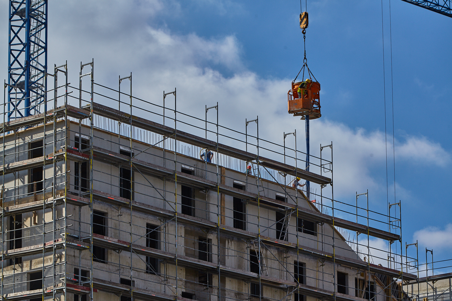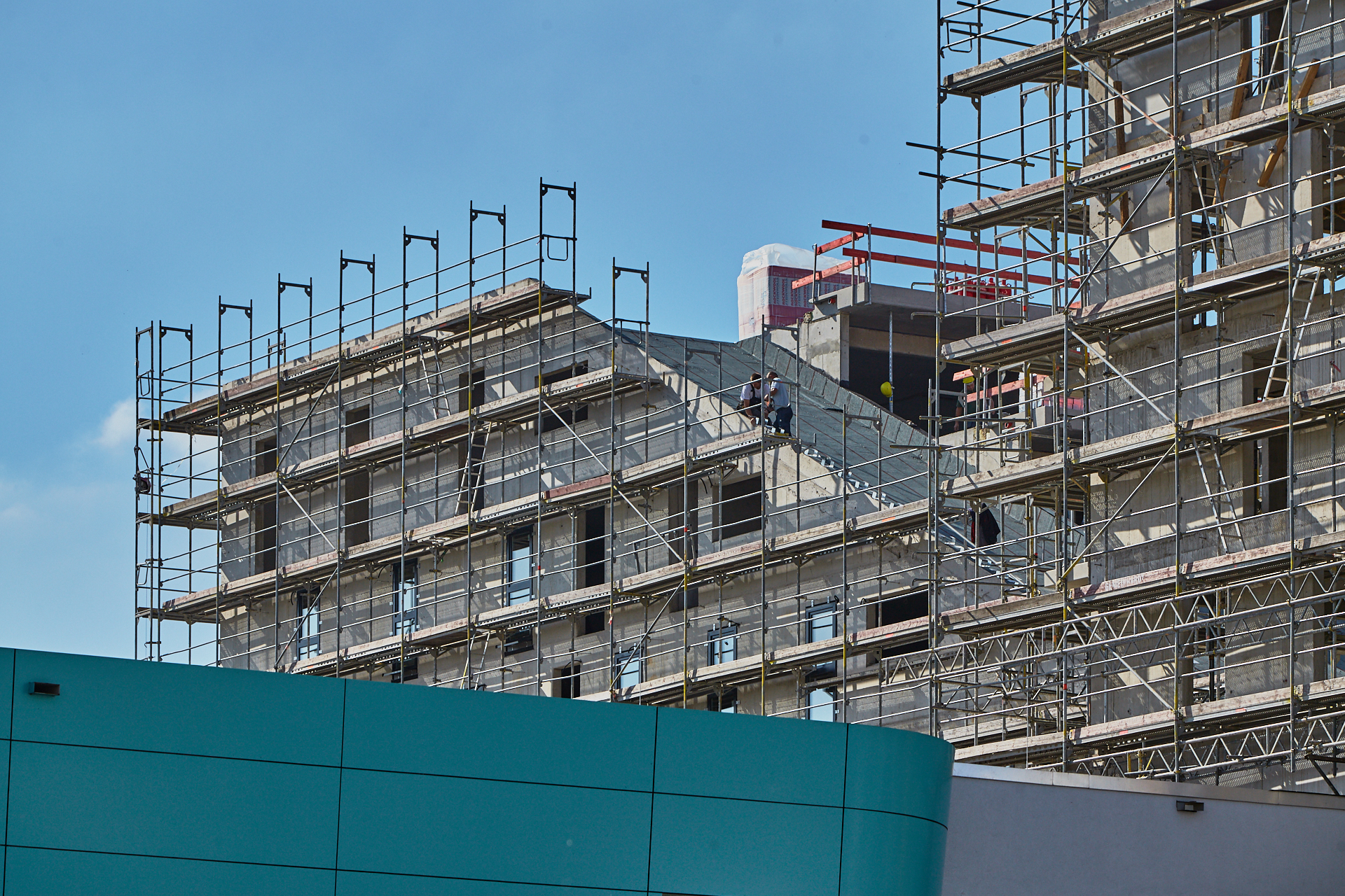Teilweise ist die Baustelle am LAO-Haus mit einem Gerüst ummantelt. Die anderen Teile sind noch im Rohbau.