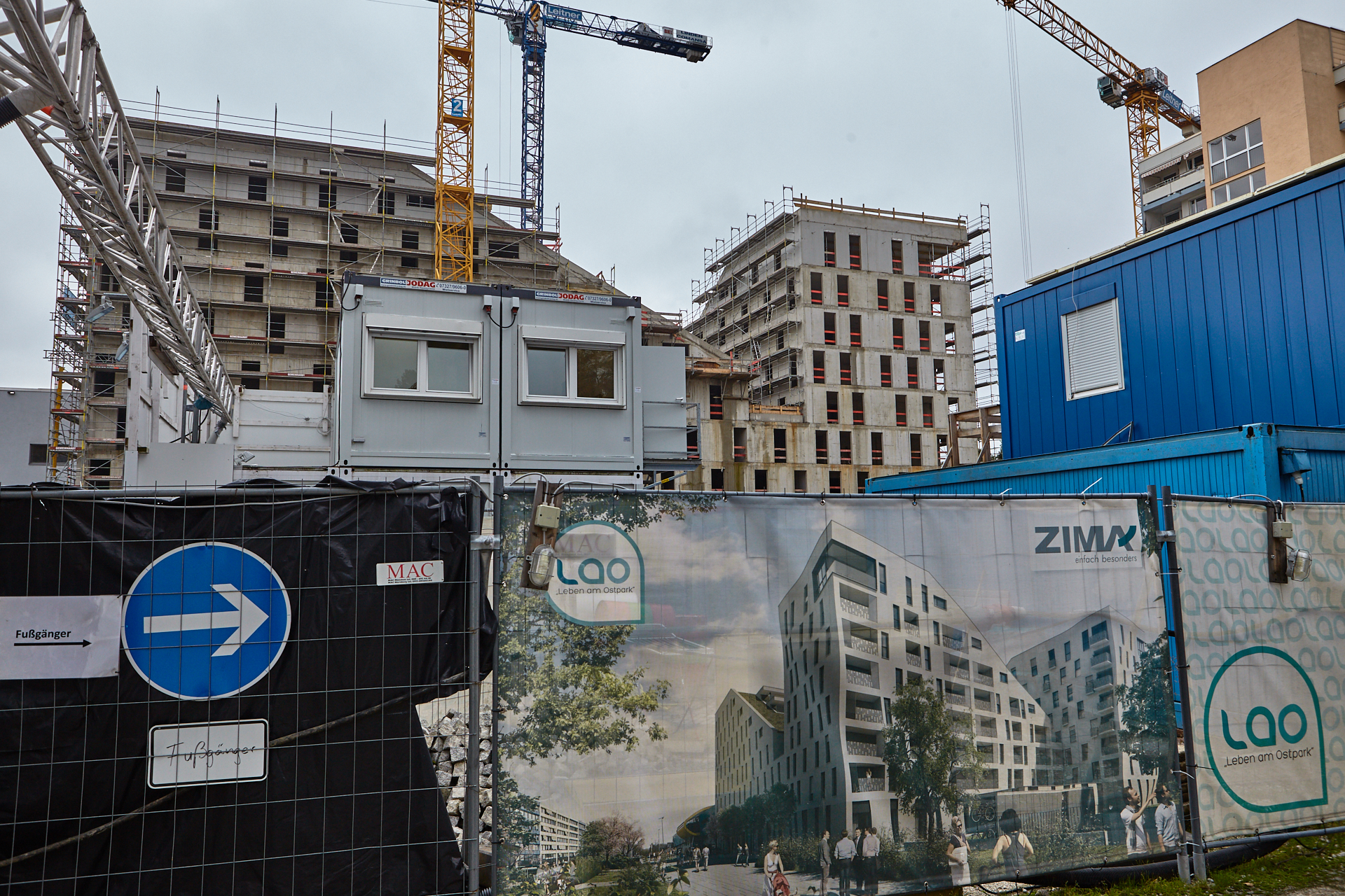 Teilweise ist die Baustelle am LAO-Haus mit einem Gerüst ummantelt. Die anderen Teile sind noch im Rohbau. Die Bauarbeiten gehen auf volle Touren weiter