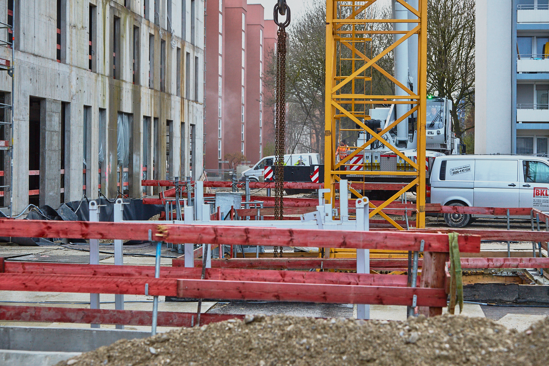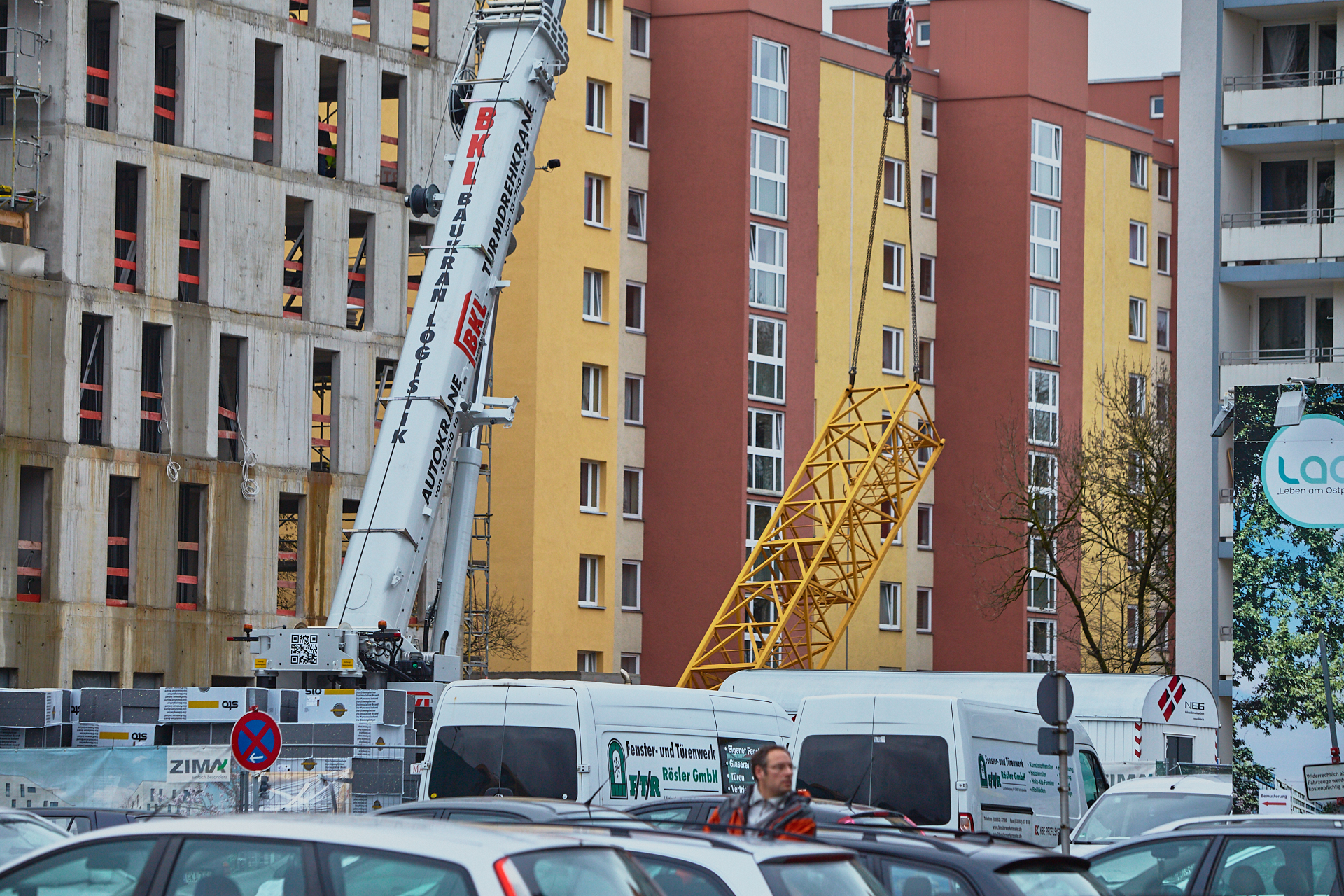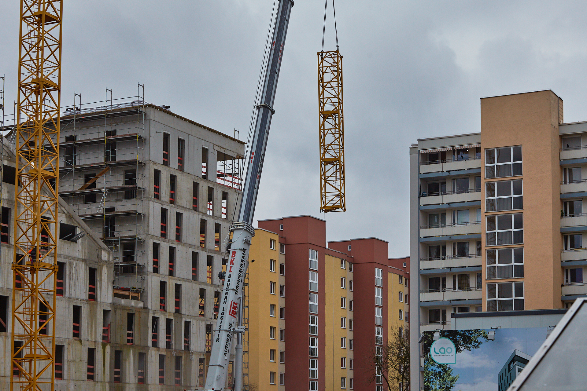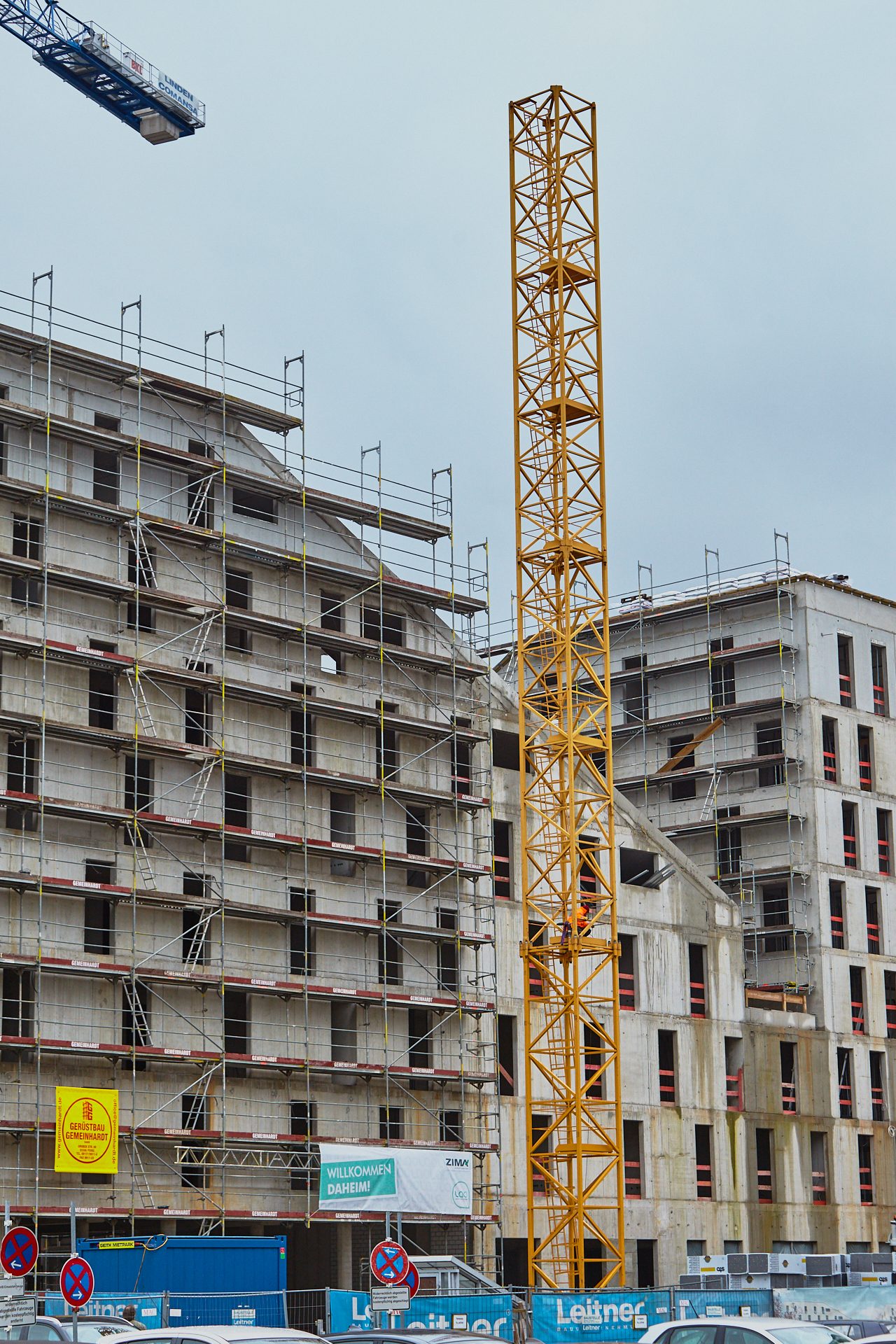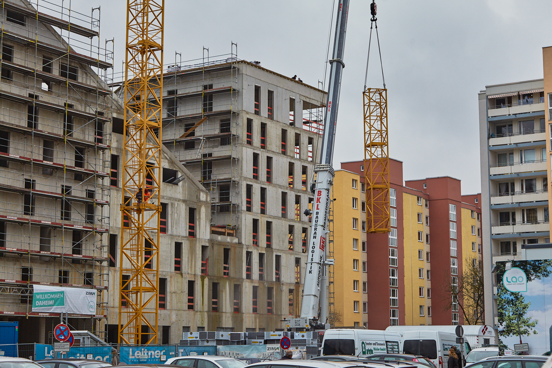 Heute wird der zweite Kran an der Baustelle LAO-HAUS abgebaut. Ein Zeichen, dass eine Bauphase zu Ende geht. Die Baustelle am LAO-Haus ist immer noch mit einem Gerüst ummantelt. Die Außenwände werden mit dicken Isoliermatten gegen Kälte gedämmt. Die Bauarbeiten gehen auf volle Touren weiter